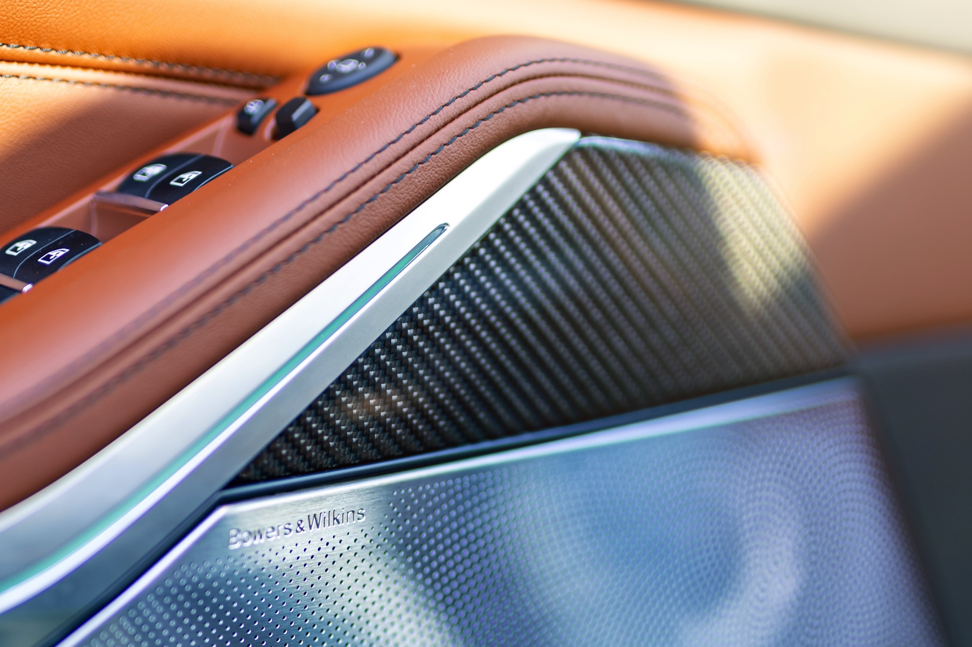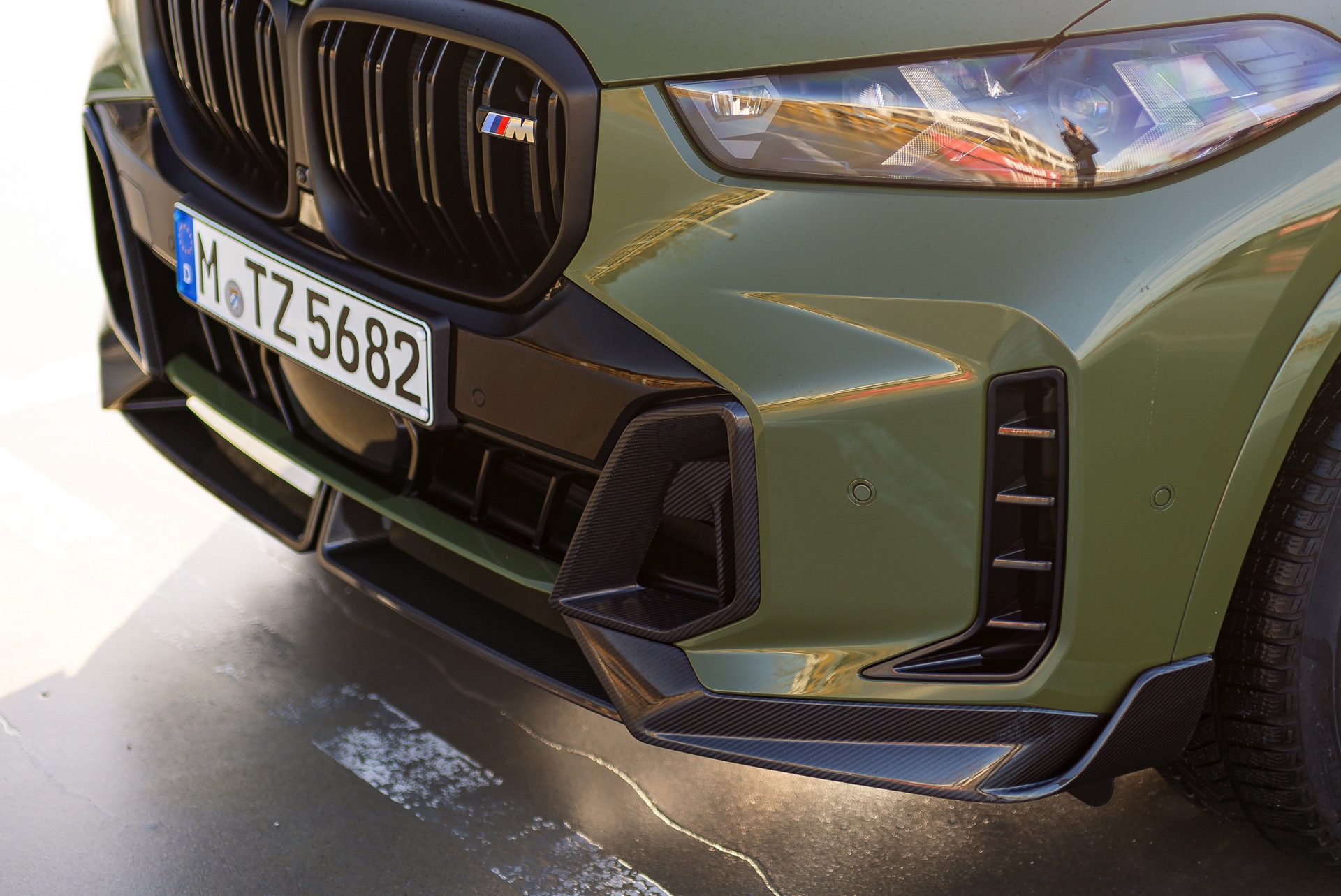 Im Innenraum des 530 PS starken M Performance-SUV in Urban Green geht es ausgesprochen edel zu: Die über 3.300 Euro teure BMW Individual Volllederausstattung ‘Merino’ Feinnarbe Tartufo wird mit den Interieurleisten ‘Carbon Fibre’ kombiniert. Außerdem sehen wir auf mehreren Fotos die Lautsprecher-Abdeckungen des Bowers & Wilkins Diamond Surround Sound System mit insgesamt 20 Lautsprechern und 1.475 Watt Systemleistung.