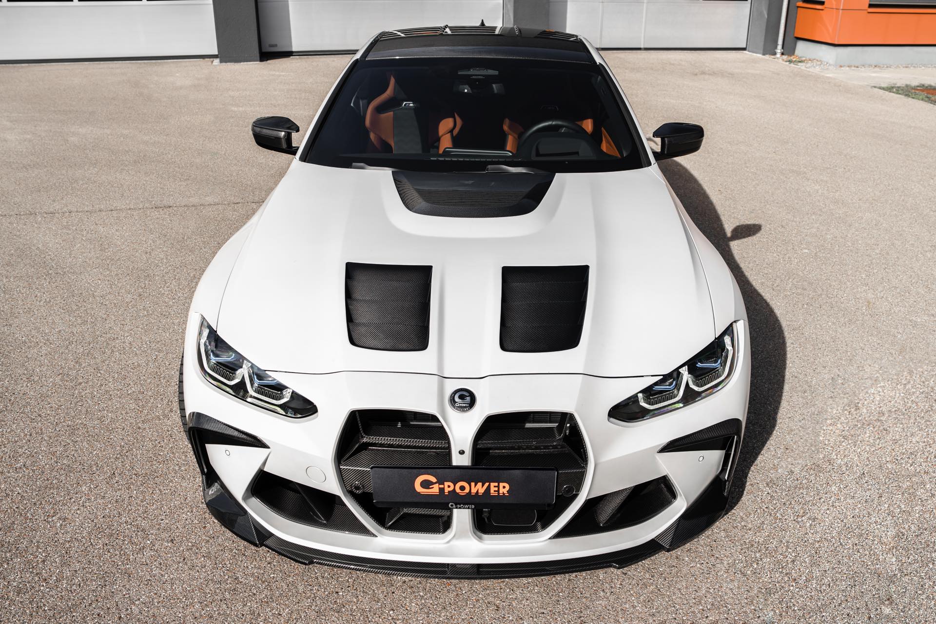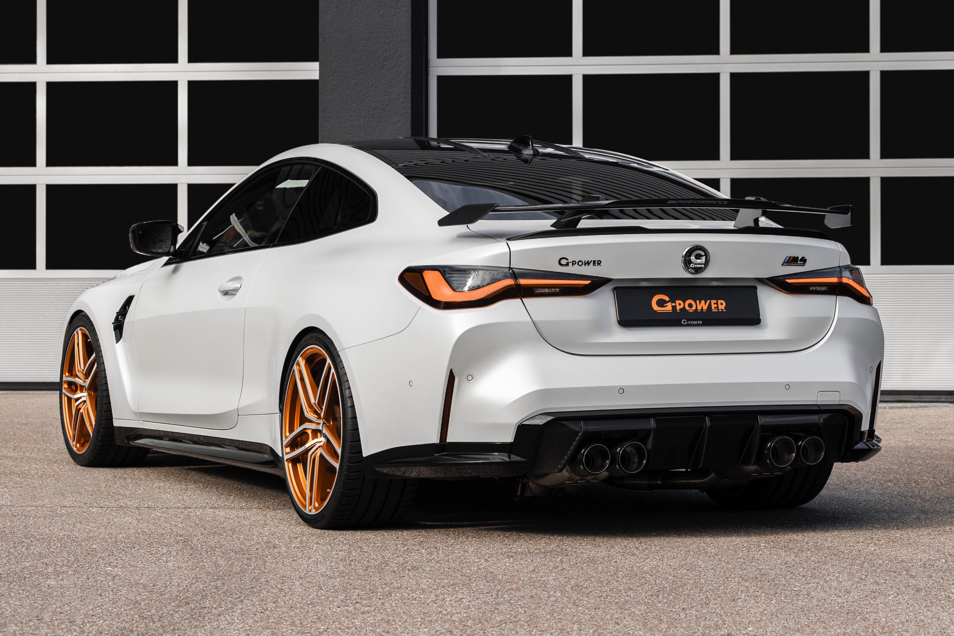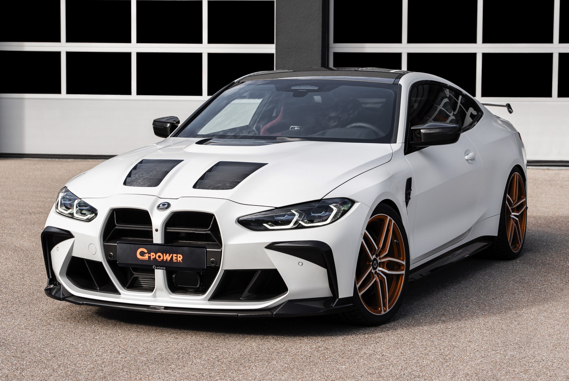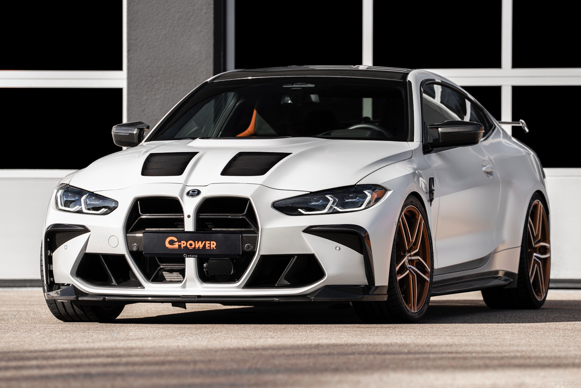 An der Front sehen wir außerdem eine Carbon-Niere im Stil des M4 CSL, einen Frontsplitter und Frontcorner-Aufsätze unterhalb der Scheinwerfer. Größter Hingucker am Heck ist der Carbon-Heckflügel, der den Motorsport-Look abrundet. Kombiniert werden die zahlreichen Carbon-Teile mit Felgen in G-Power-typischem Orange: Die vorne 20 und hinten 21 Zoll großen Schmiedefelgen im Hurricane RR-Stil tragen eine orange Lackierung und polierte Fronten, auf ihnen sind 285 und 295 Millimeter breite Reifen montiert. "