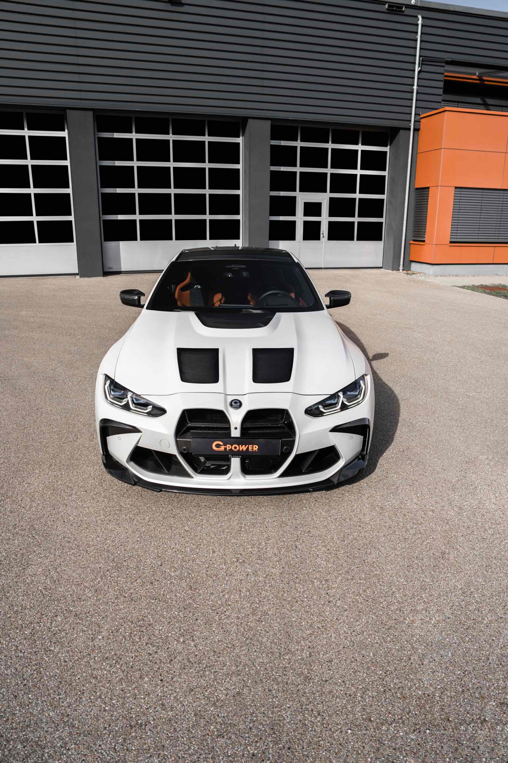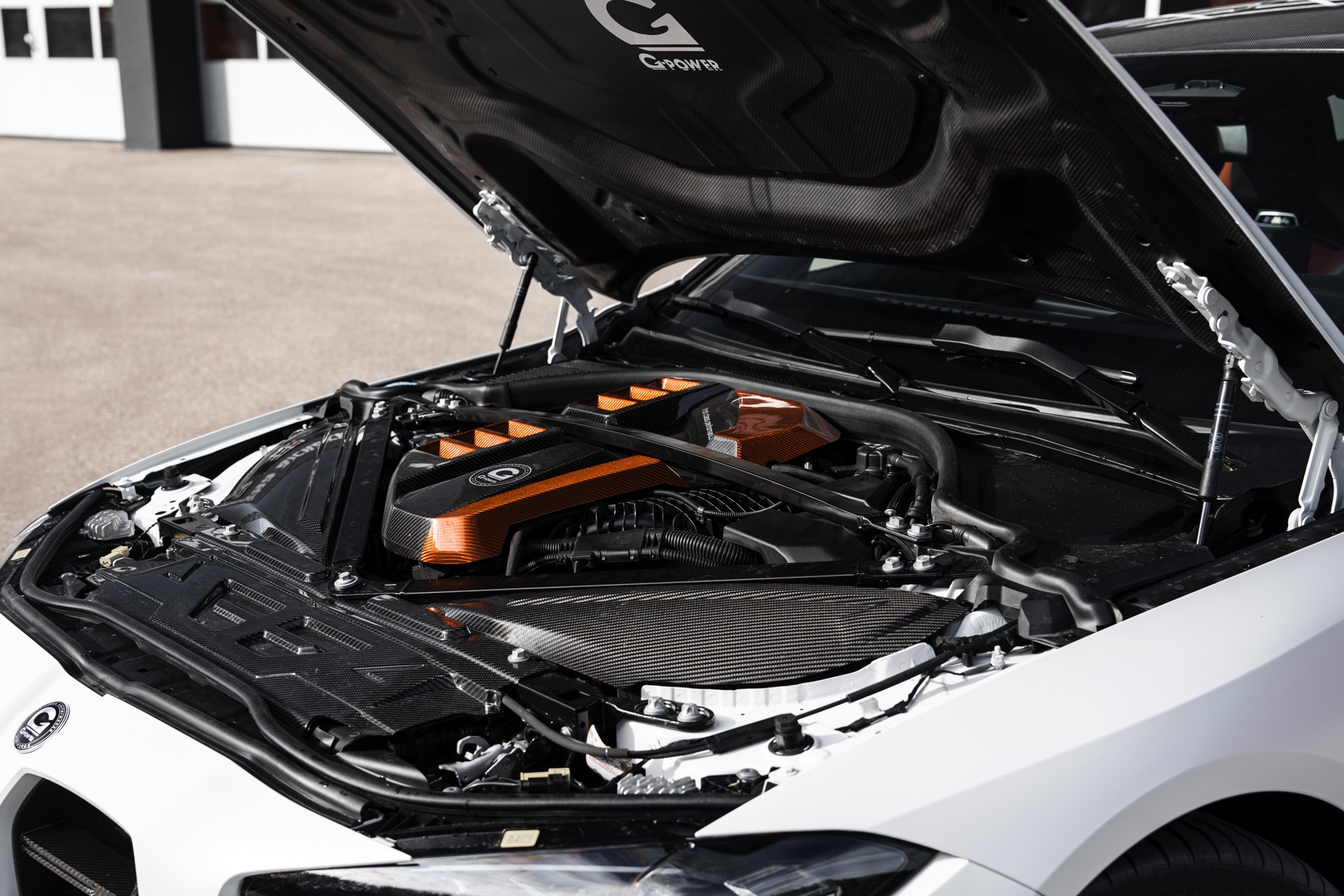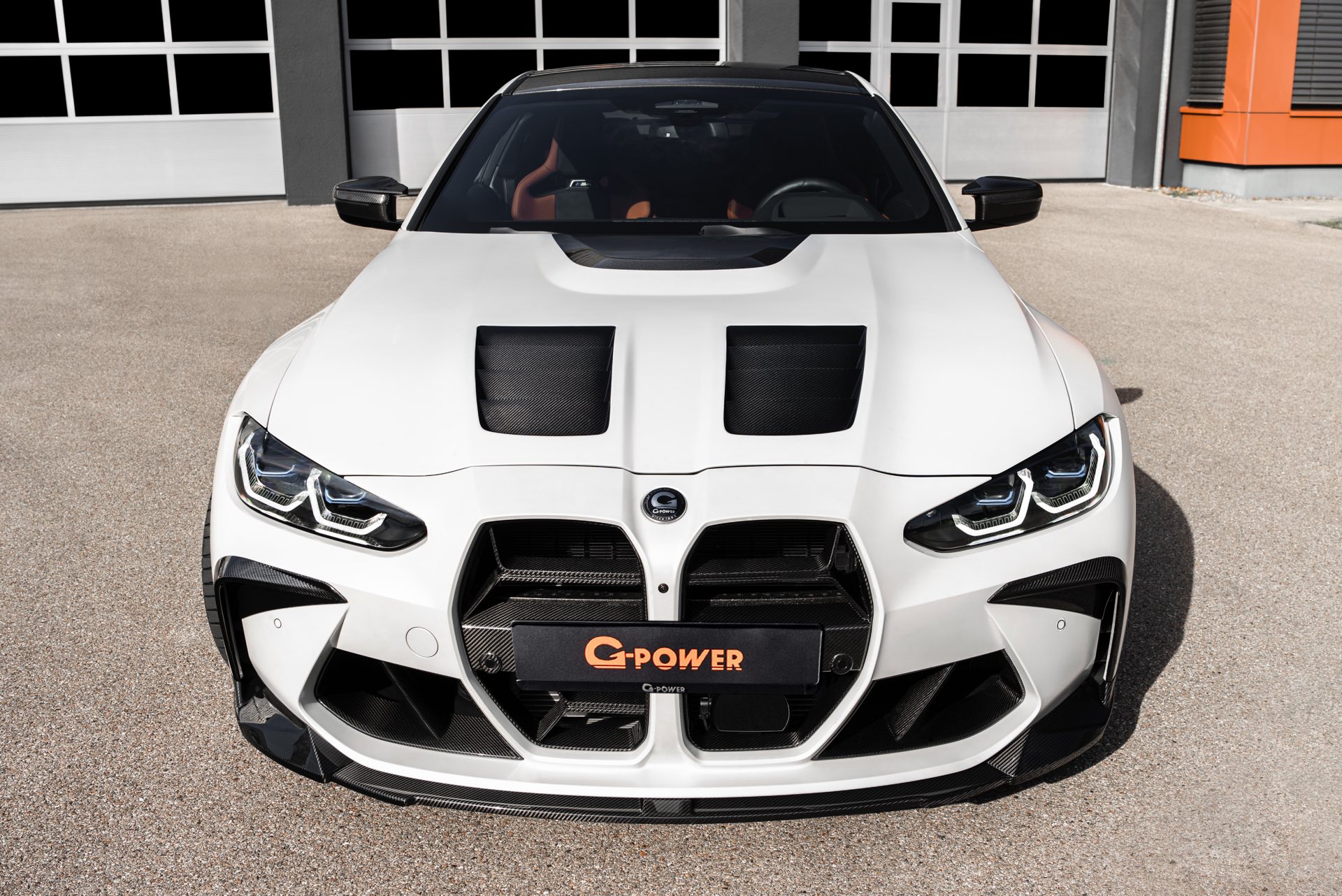 An der Front sehen wir außerdem eine Carbon-Niere im Stil des M4 CSL, einen Frontsplitter und Frontcorner-Aufsätze unterhalb der Scheinwerfer. Größter Hingucker am Heck ist der Carbon-Heckflügel, der den Motorsport-Look abrundet. Kombiniert werden die zahlreichen Carbon-Teile mit Felgen in G-Power-typischem Orange: Die vorne 20 und hinten 21 Zoll großen Schmiedefelgen im Hurricane RR-Stil tragen eine orange Lackierung und polierte Fronten, auf ihnen sind 285 und 295 Millimeter breite Reifen montiert. "