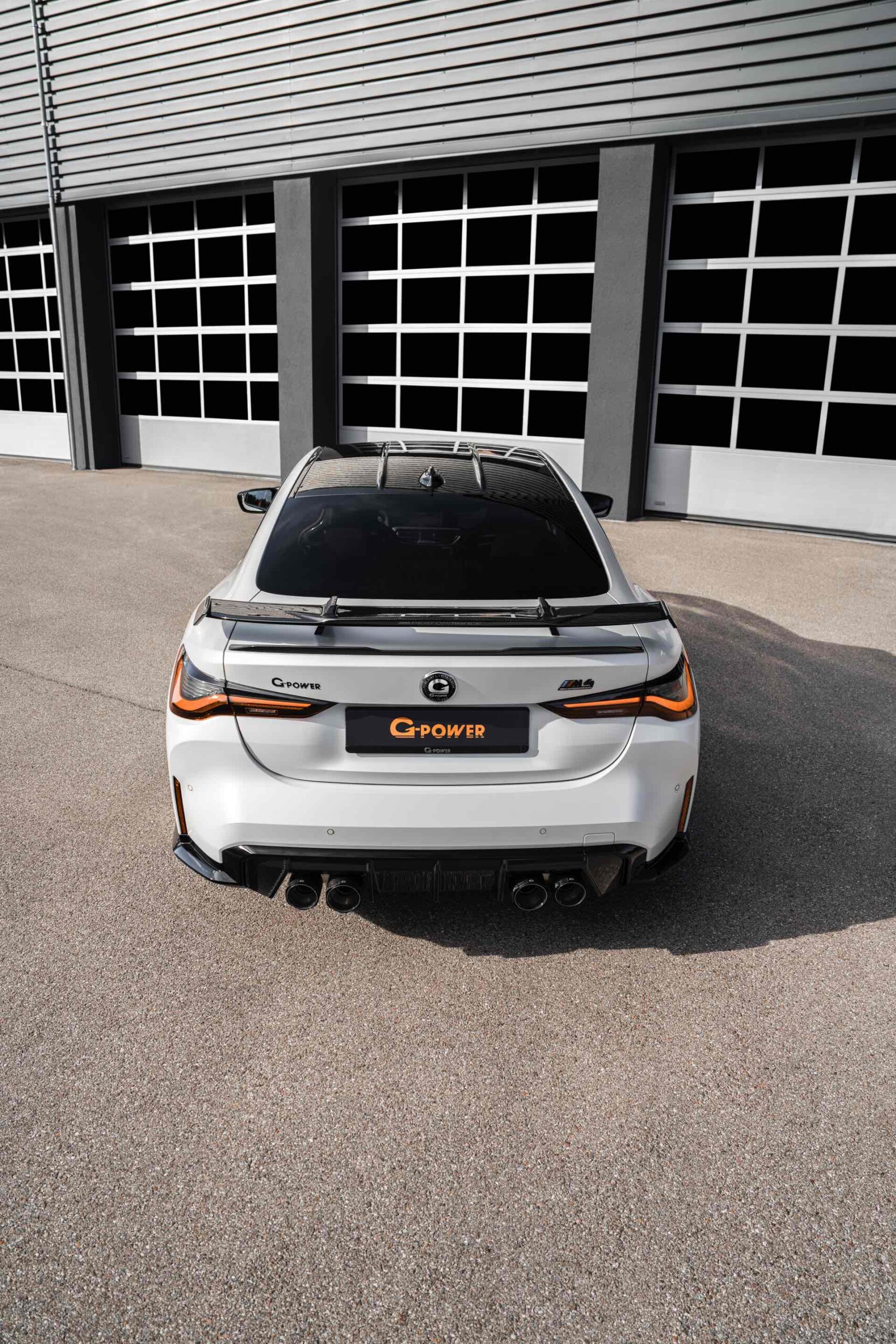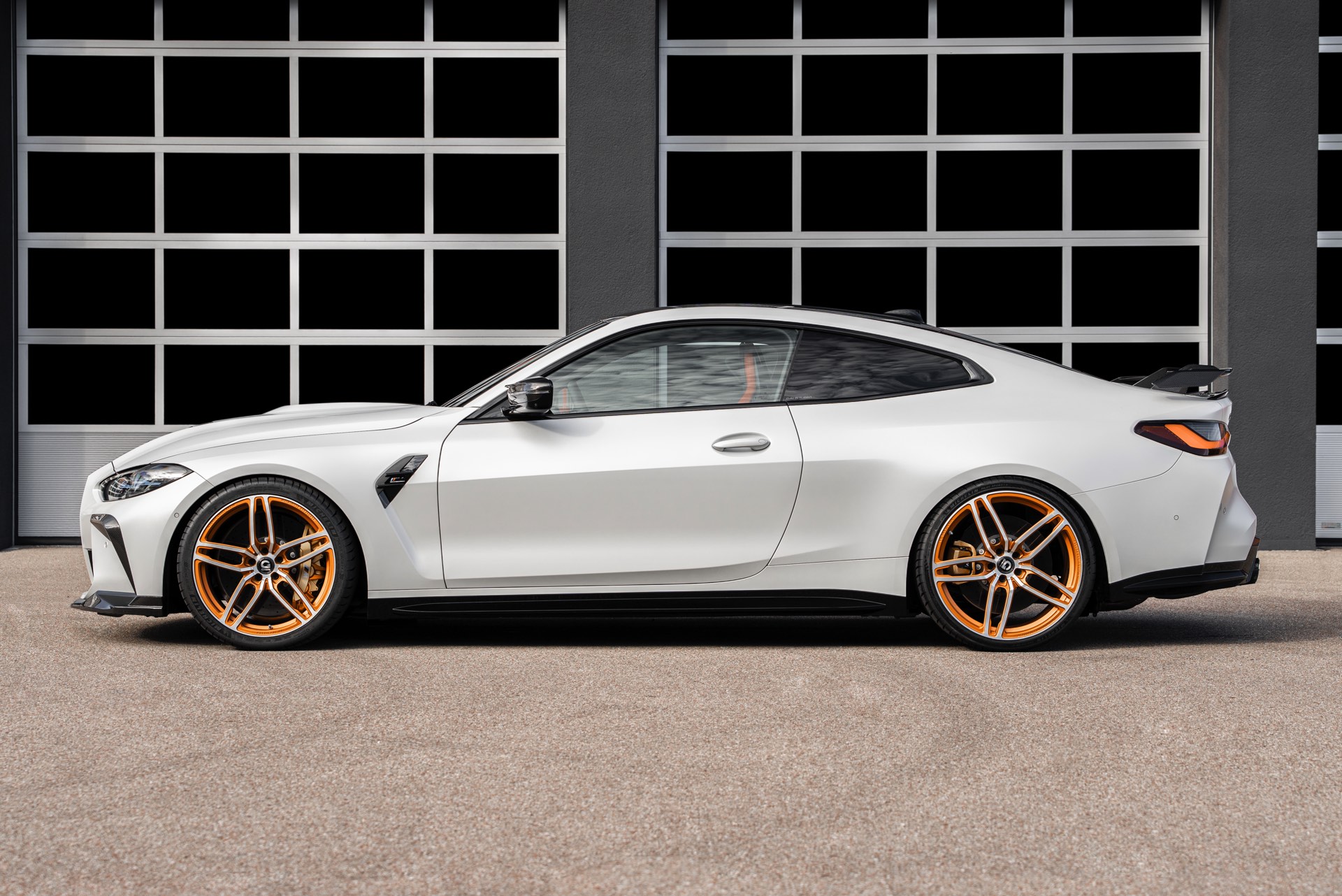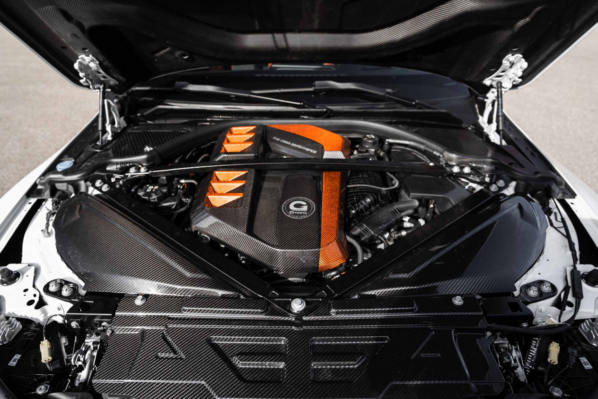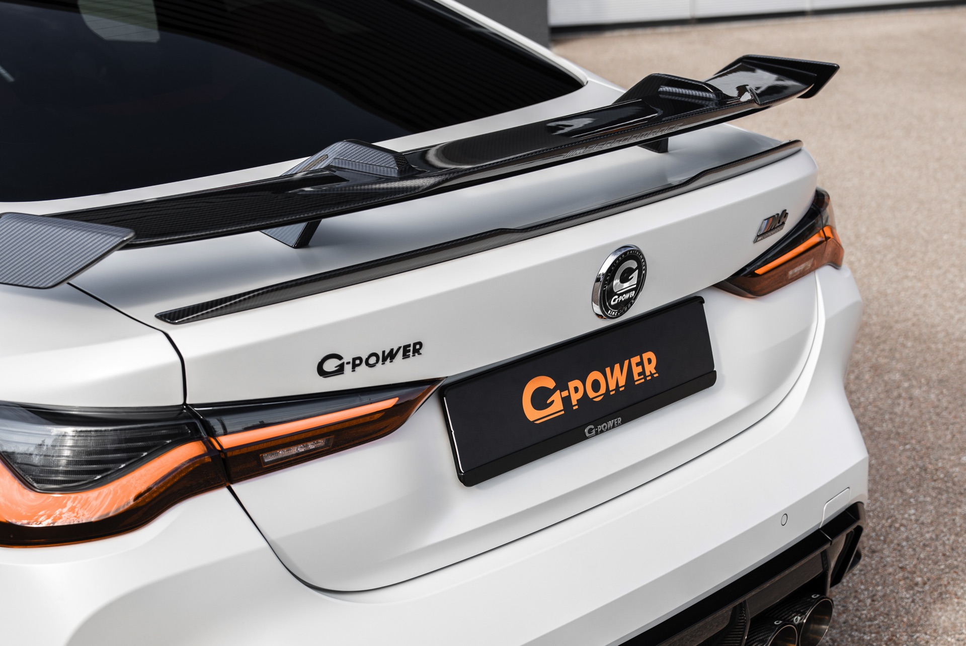 An der Front sehen wir außerdem eine Carbon-Niere im Stil des M4 CSL, einen Frontsplitter und Frontcorner-Aufsätze unterhalb der Scheinwerfer. Größter Hingucker am Heck ist der Carbon-Heckflügel, der den Motorsport-Look abrundet. Kombiniert werden die zahlreichen Carbon-Teile mit Felgen in G-Power-typischem Orange: Die vorne 20 und hinten 21 Zoll großen Schmiedefelgen im Hurricane RR-Stil tragen eine orange Lackierung und polierte Fronten, auf ihnen sind 285 und 295 Millimeter breite Reifen montiert. "