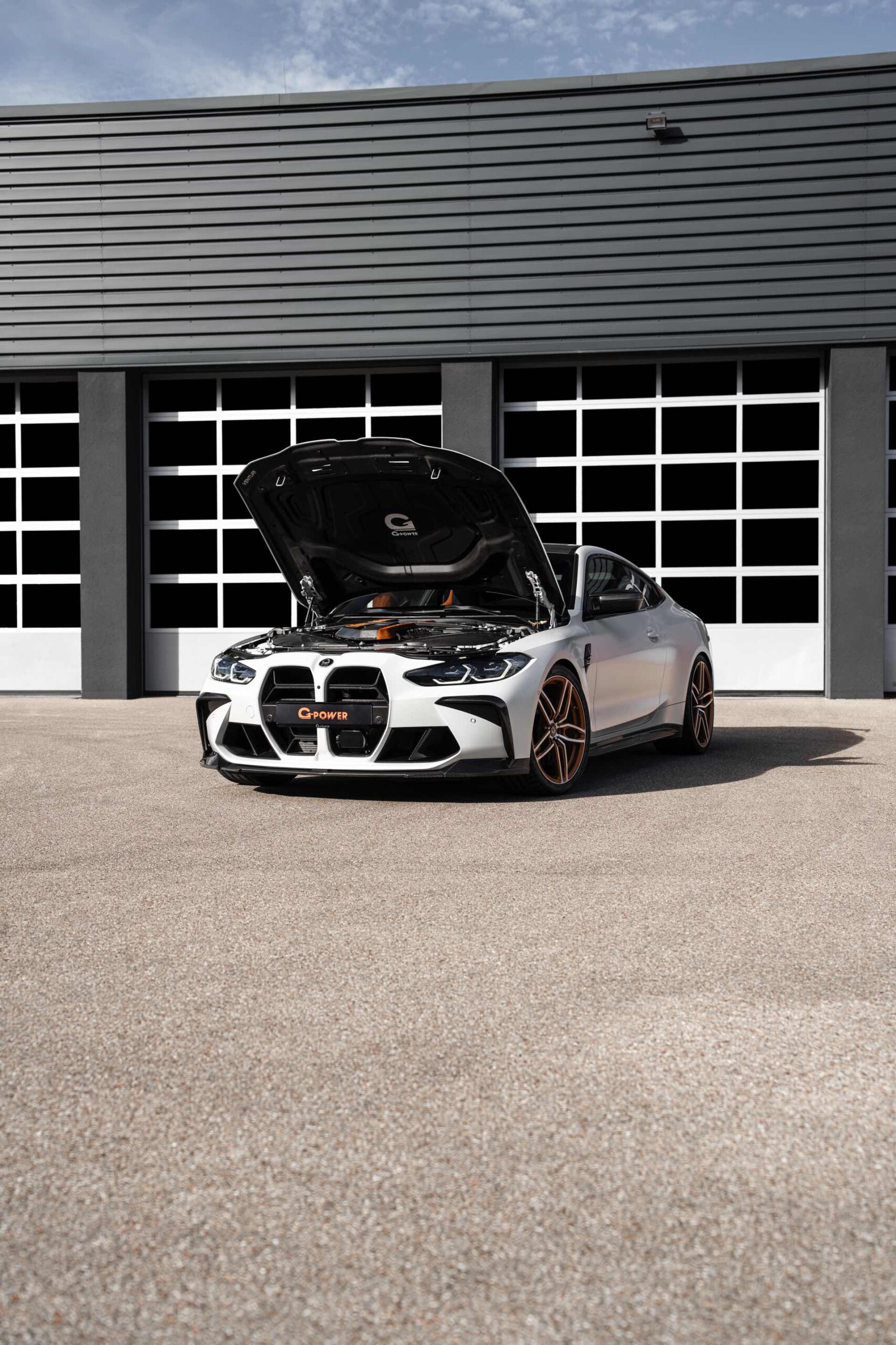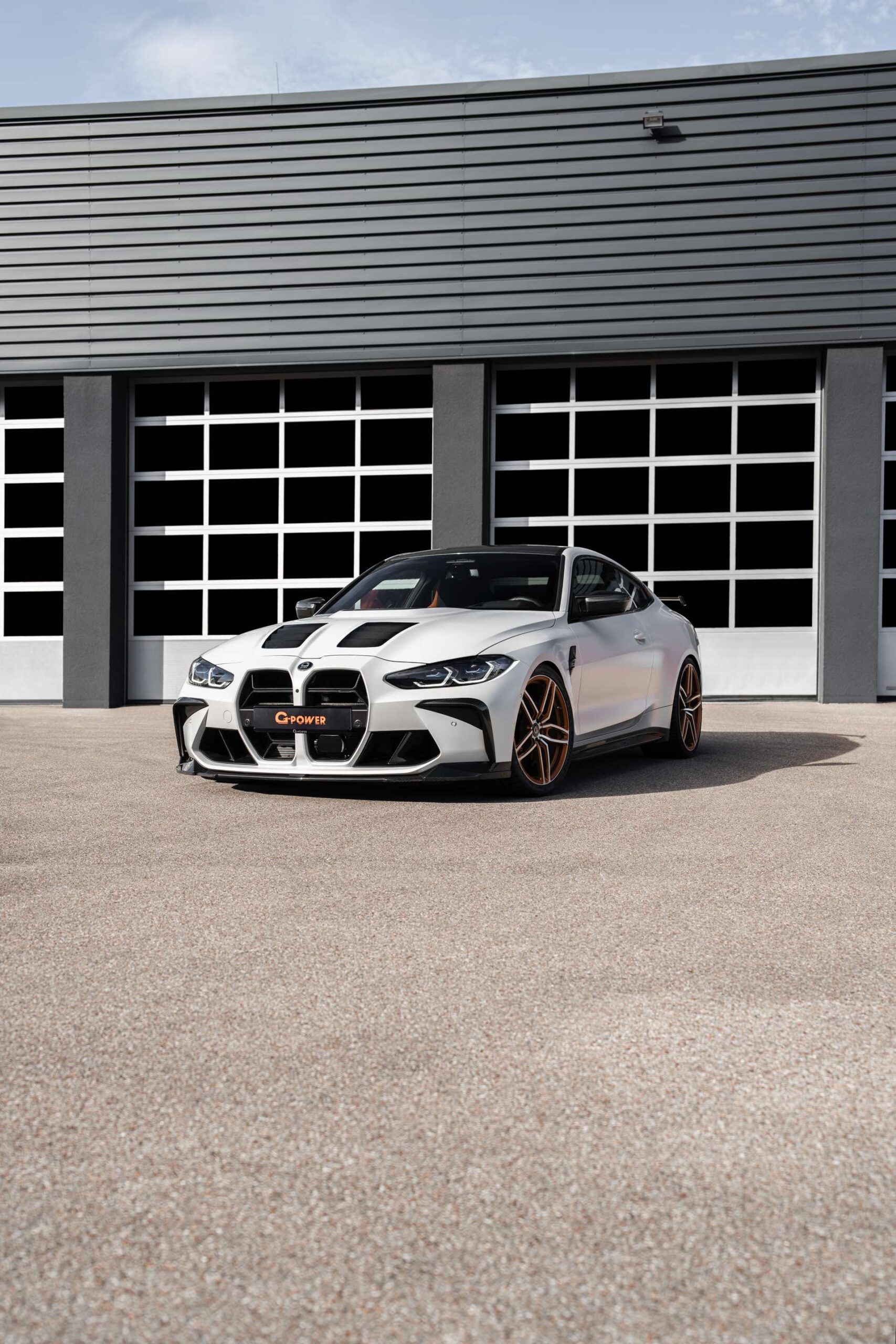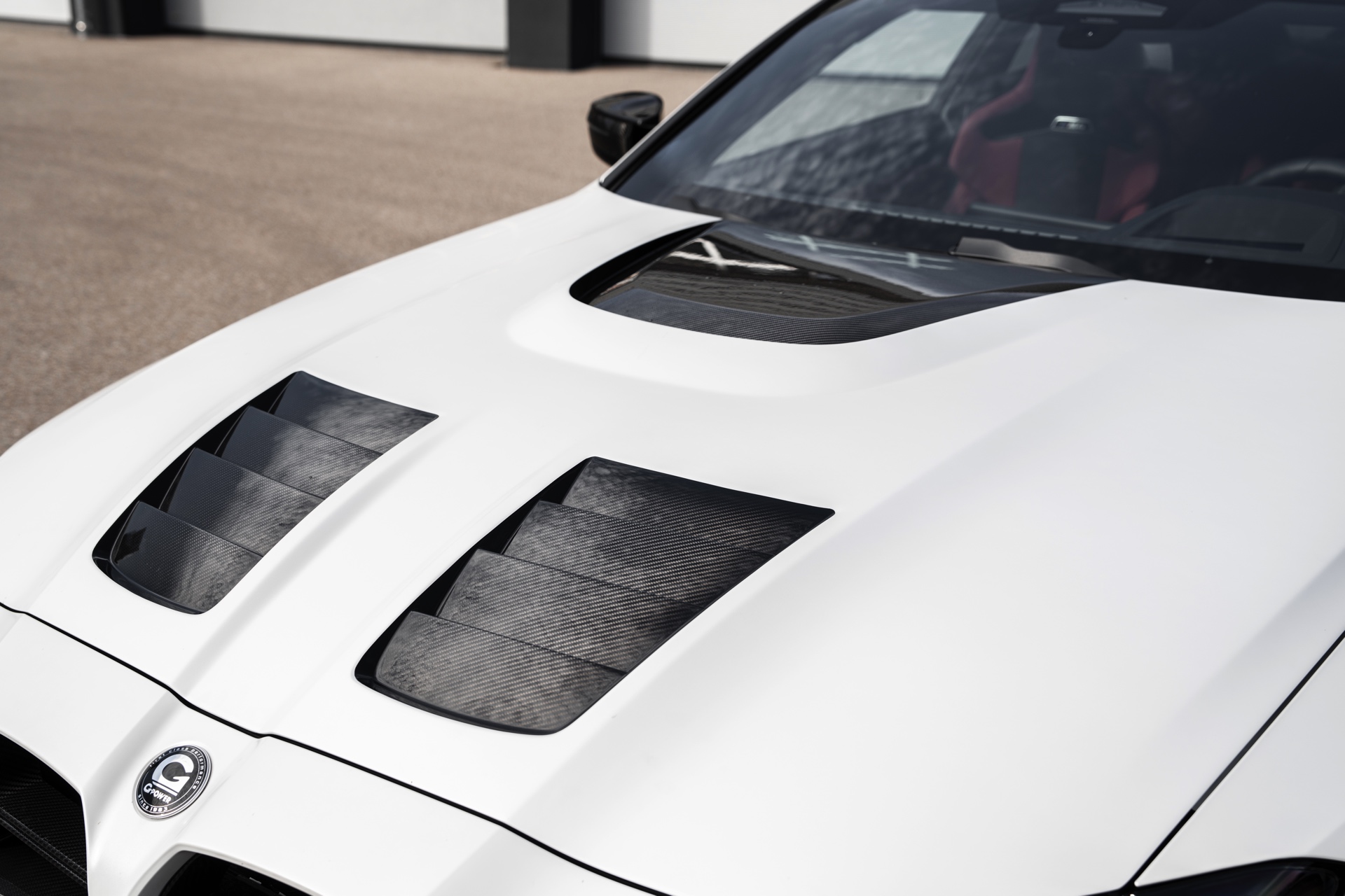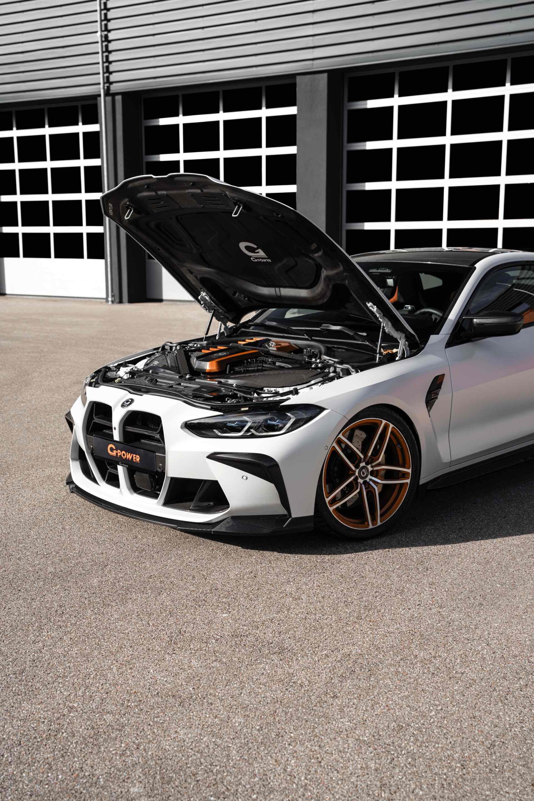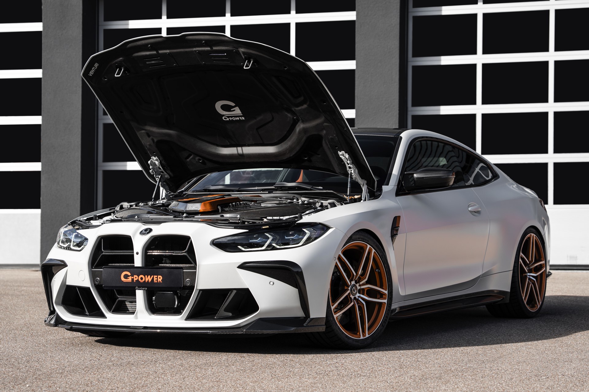 Nicht nur mit einem besonderen Technik-Paket, sondern auch mit einer außergewöhnlichen Farbe präsentiert sich der G-Power G4M Biturbo auf Basis des BMW M4 Competition (G82): Das Tuning-Coupé kommt mit einer matten Außenhaut in Frozen White, weshalb die zahlreichen Anbauteile aus Carbon noch besser zur Geltung kommen. Zu den optischen Highlights zählt neben dem ohnehin ab Werk im Hightech-Material ausgeführten Dach die nur zum Teil in Wagenfarbe lackierte Carbon-Motorhaube mit zusätzlichen Öffnungen, die für eine bessere Entlüftung des Motorraums sorgen.