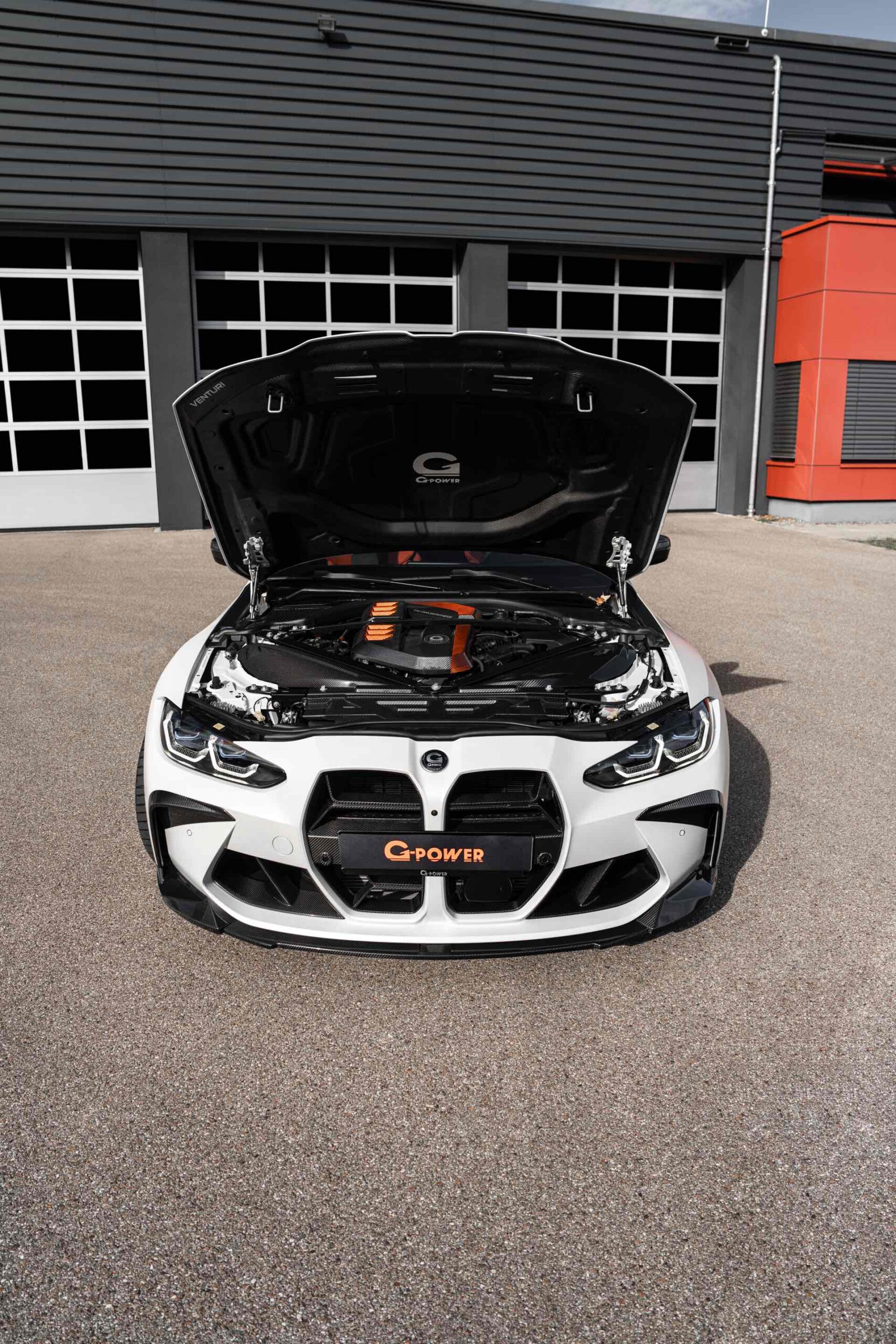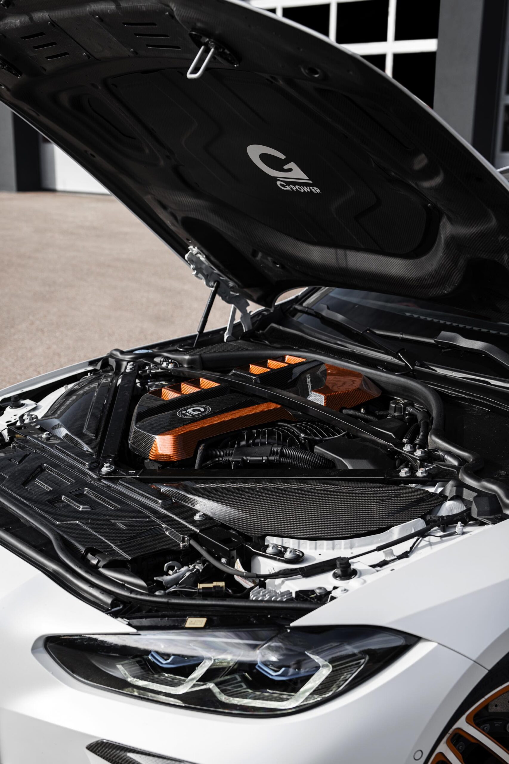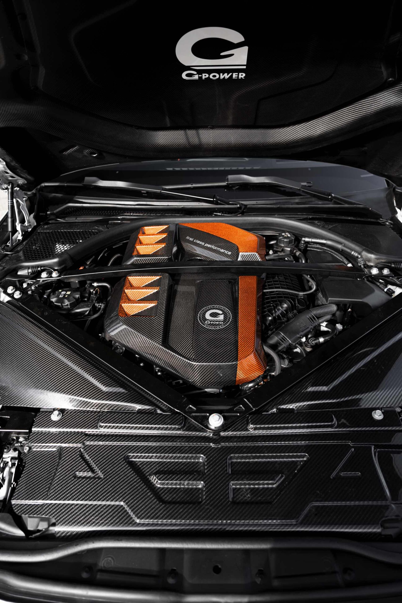Unter der Carbon-Motorhaube sehen wir nicht nur eine neue Motorabdeckung und einige weitere Akzente in Orange, vor allem anderen ist hier auch ein umfangreiches Tuning-Paket zur Leistungssteigerung verbaut. 700 PS heben den BMW M4 von G-Power über sämtliche Serien-BMW mit Ausnahme des XM Label Red und auch die 850 Newtonmeter Drehmoment werden von keinem BMW-Verbrenner ohne Elektro-Unterstützung übertroffen – nur die stärksten Hybride und Elektroautos wie der BMW i7 M70 können diesen Wert übertrumpfen.