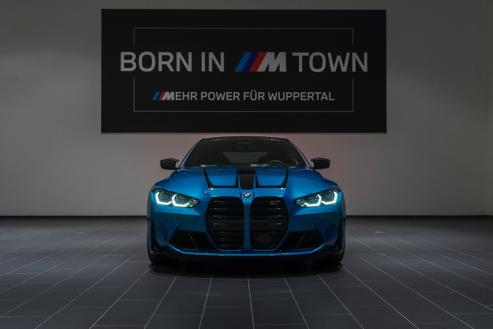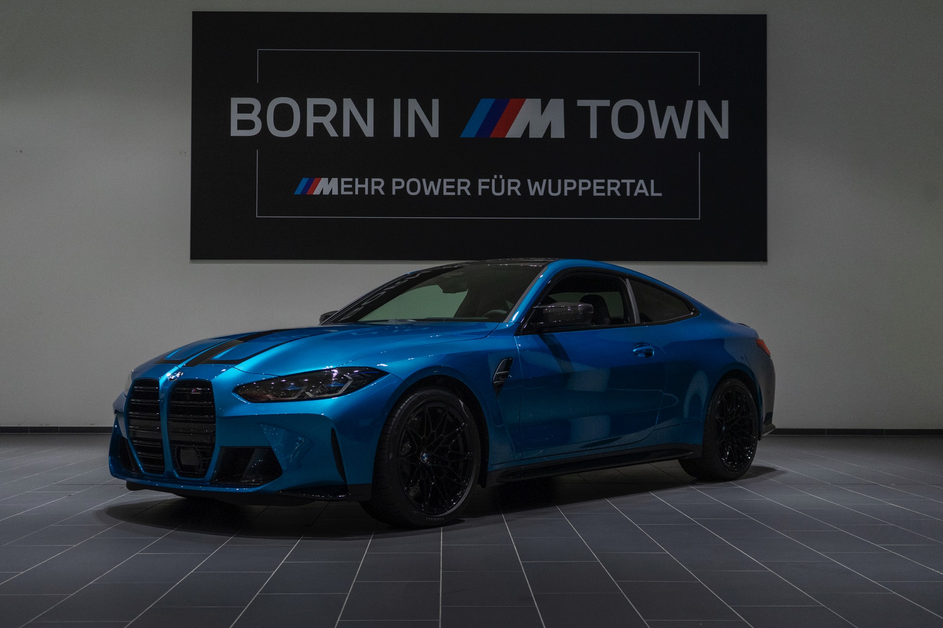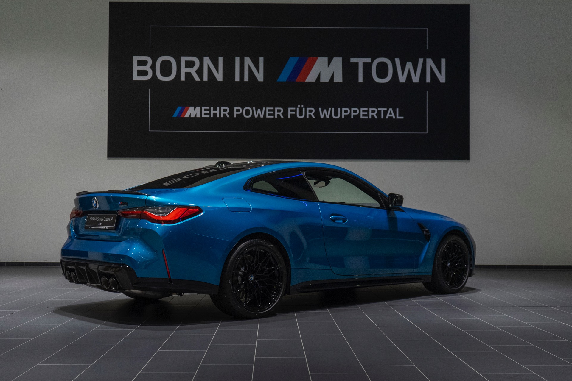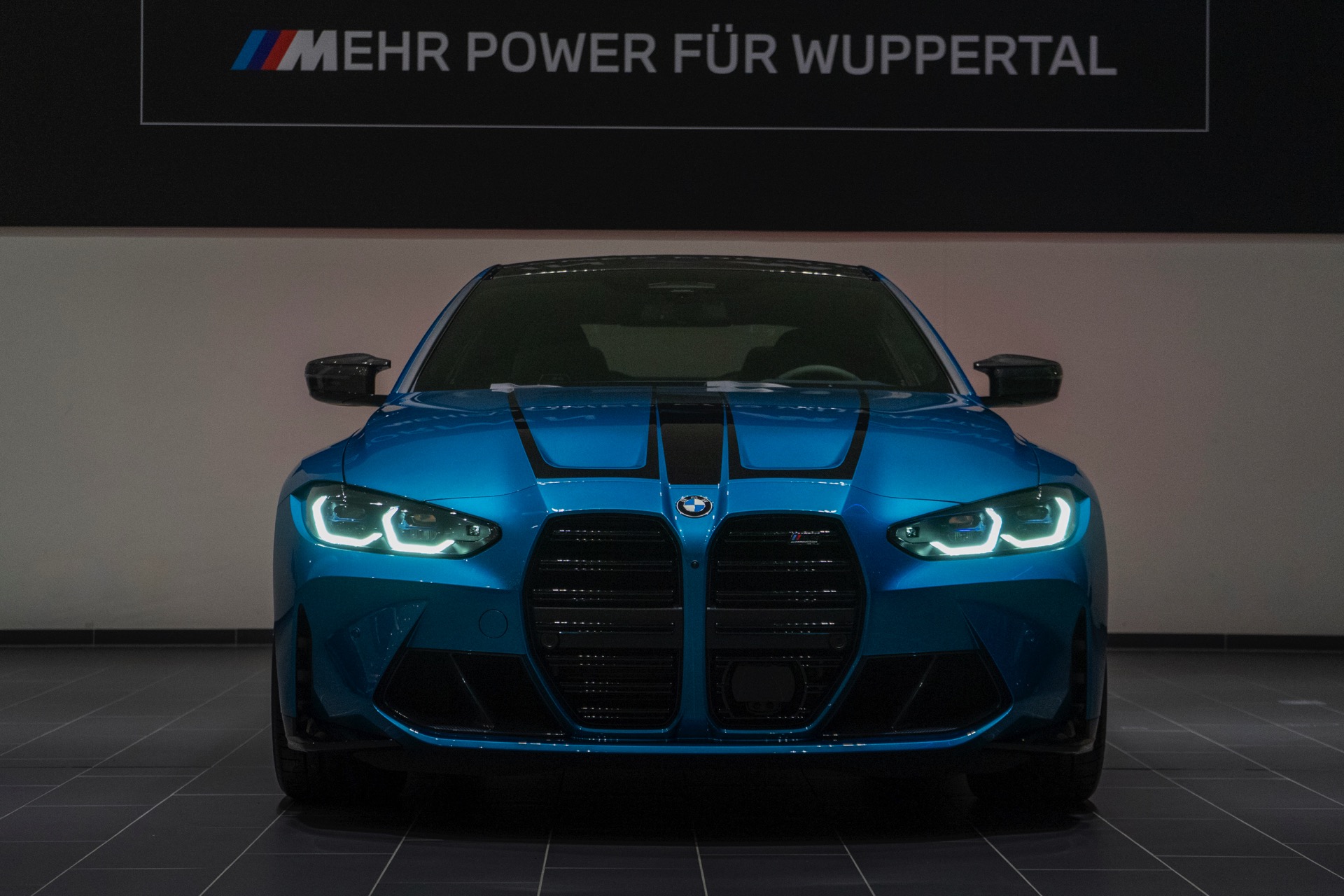 Da das 510 PS starke BMW M4 Coupé im Wuppertaler Showroom auf ein Kennzeichen an der Front verzichtet, kommt auch die mächtige M-Niere mit ihren horizontalen Streben und M4-Competition-Badge noch besser zur Geltung – doch was in vielen US-Bundesstaaten völlig normal wäre, ist im deutschen Straßenverkehr leider nicht möglich.