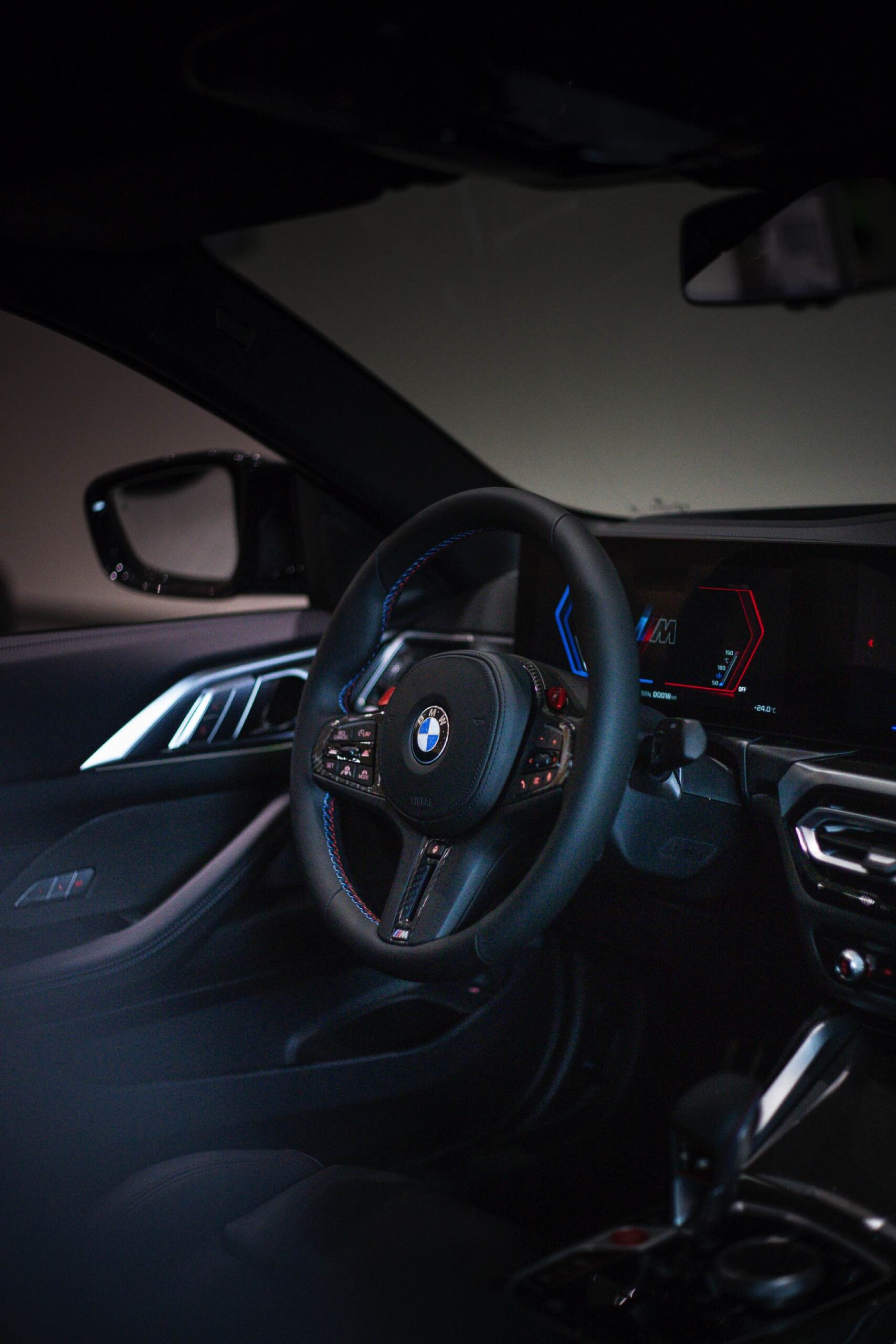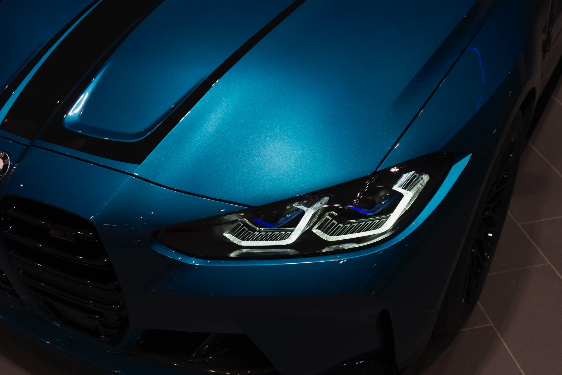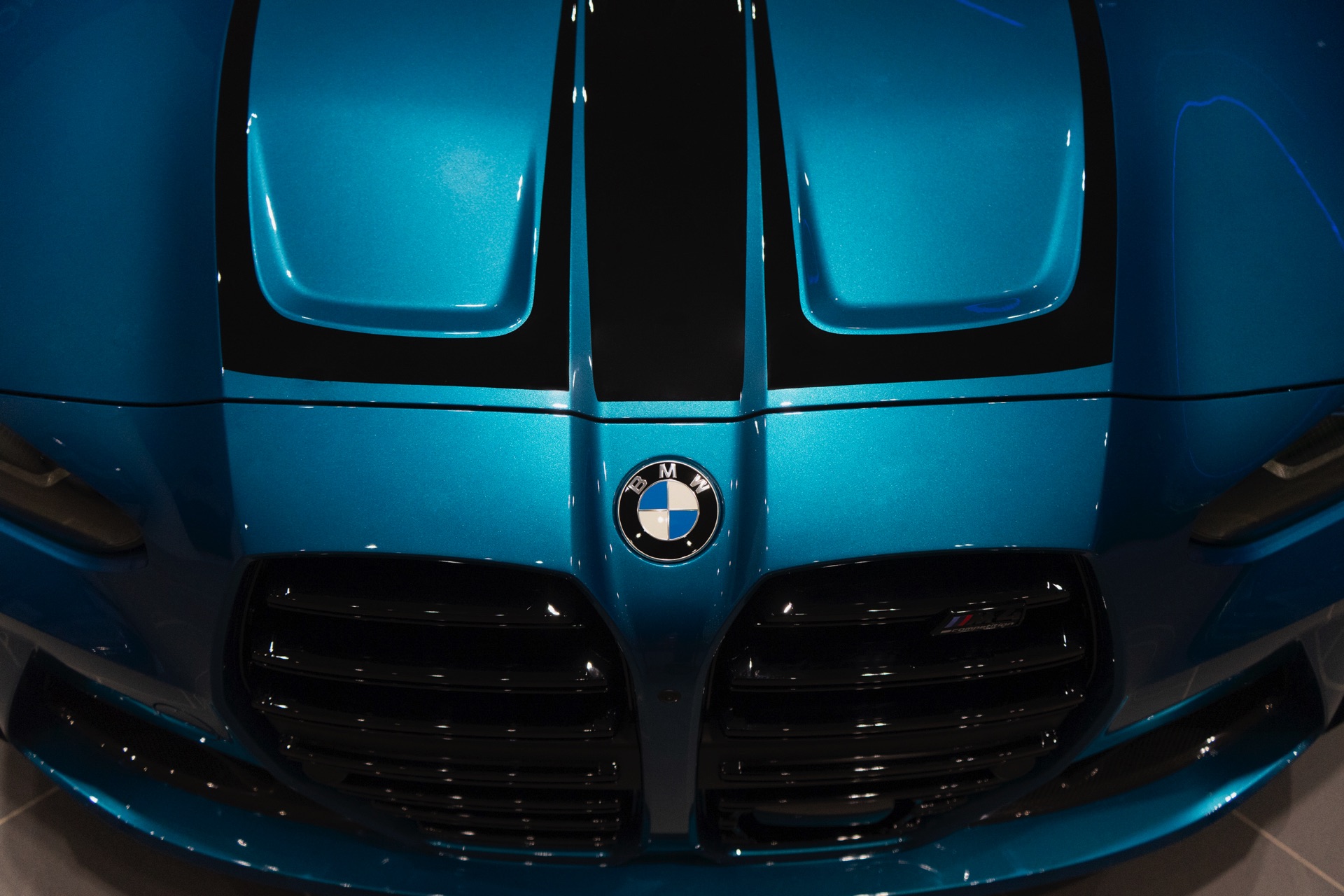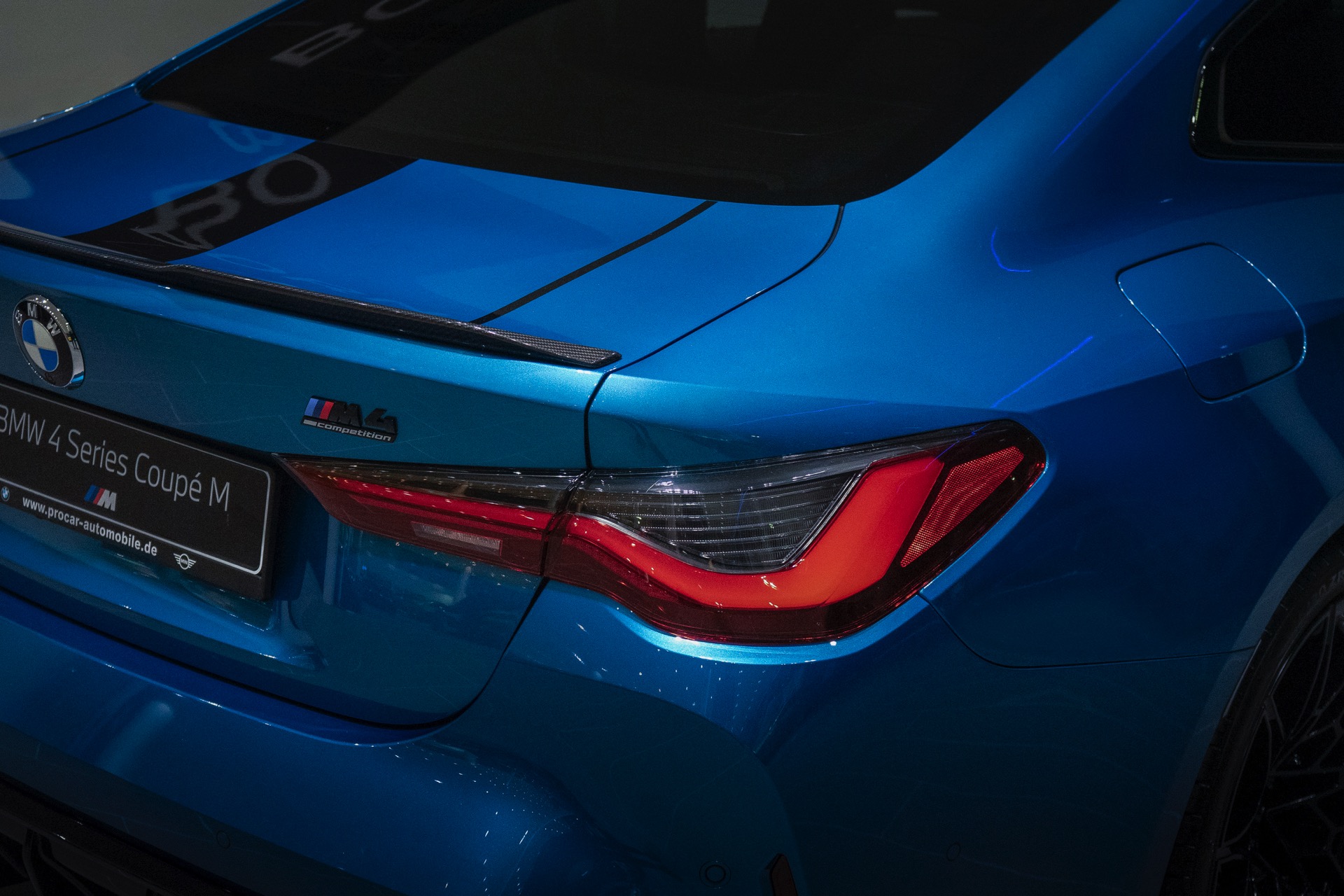 Da das 510 PS starke BMW M4 Coupé im Wuppertaler Showroom auf ein Kennzeichen an der Front verzichtet, kommt auch die mächtige M-Niere mit ihren horizontalen Streben und M4-Competition-Badge noch besser zur Geltung – doch was in vielen US-Bundesstaaten völlig normal wäre, ist im deutschen Straßenverkehr leider nicht möglich.