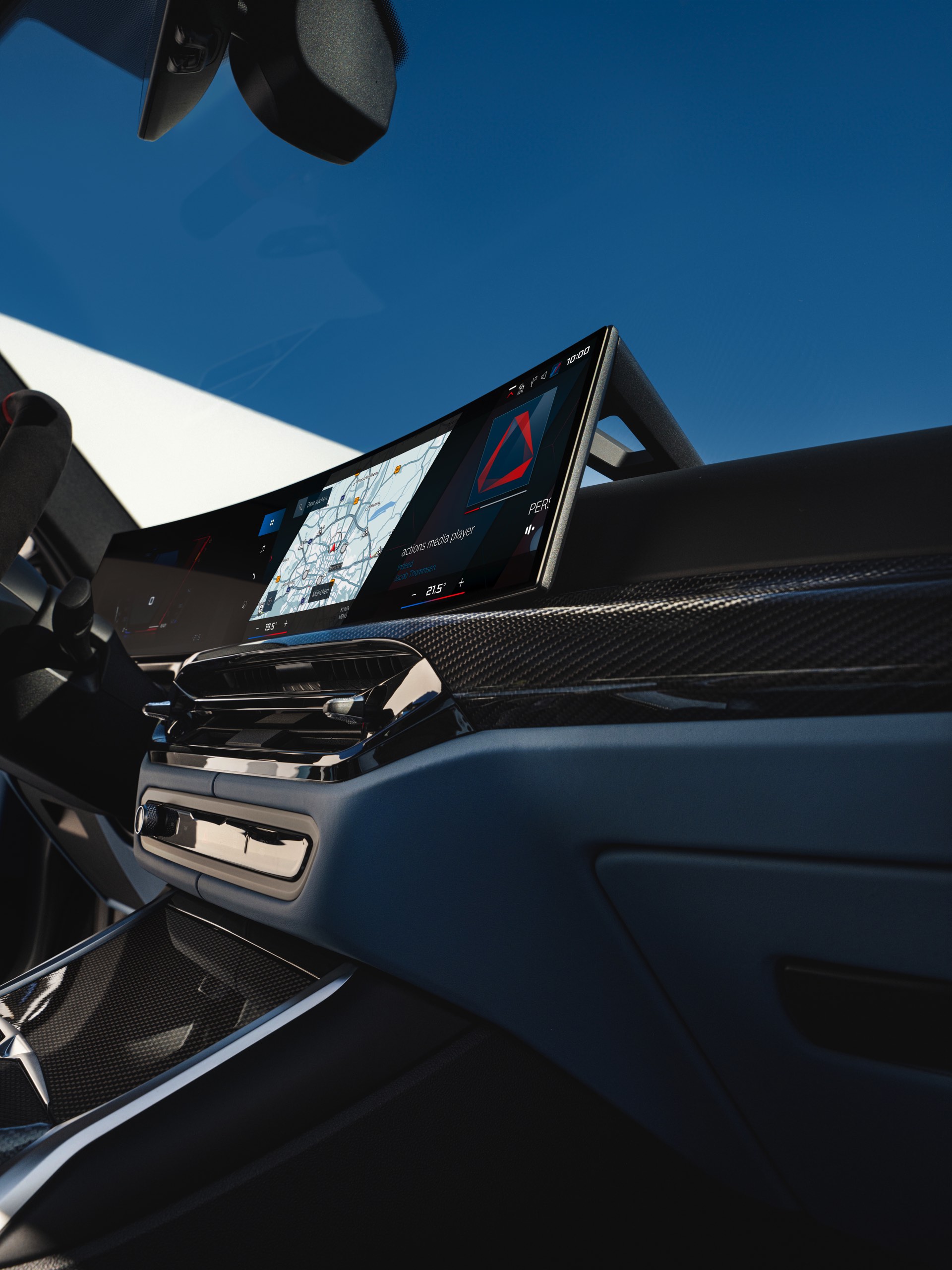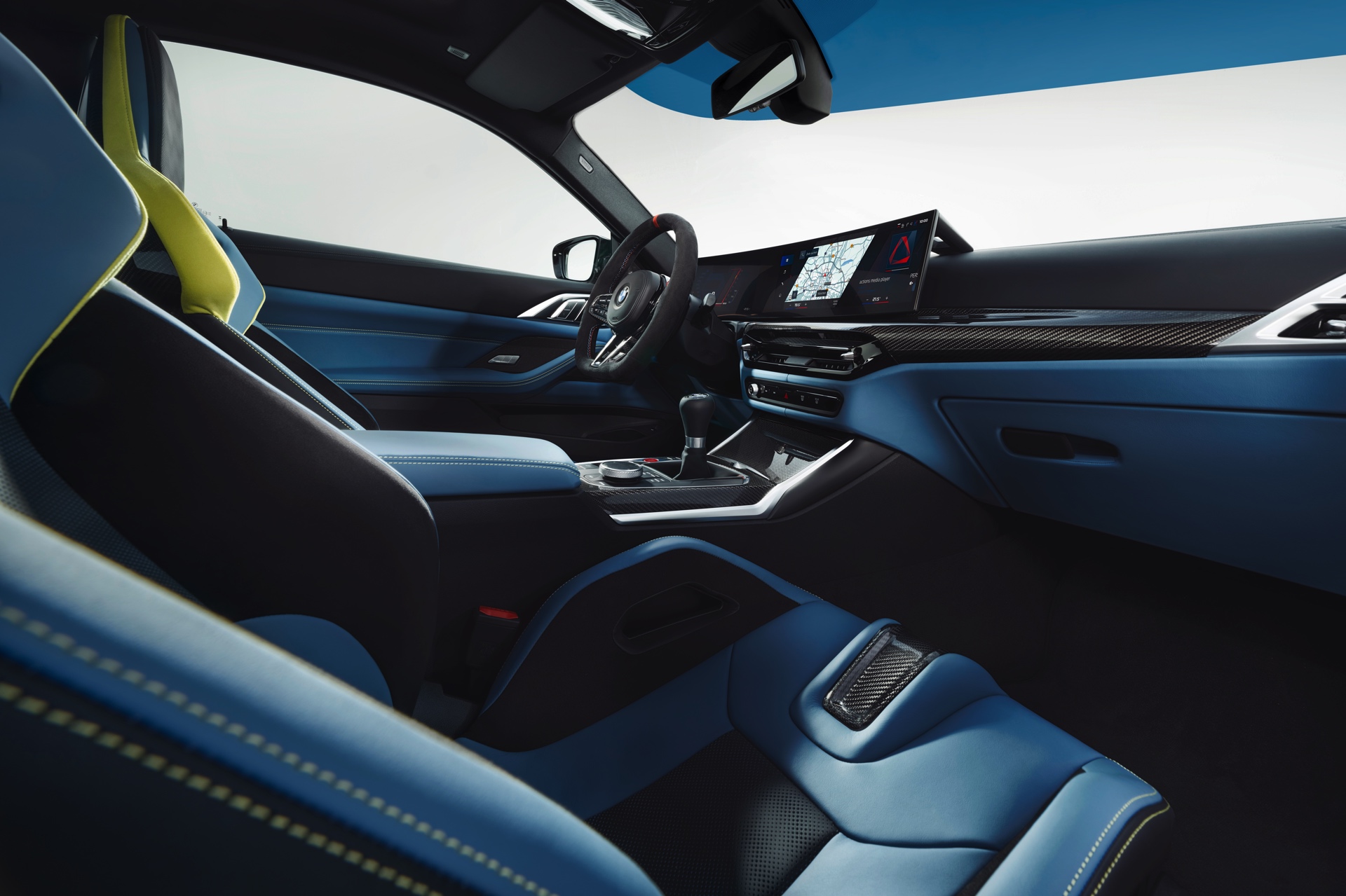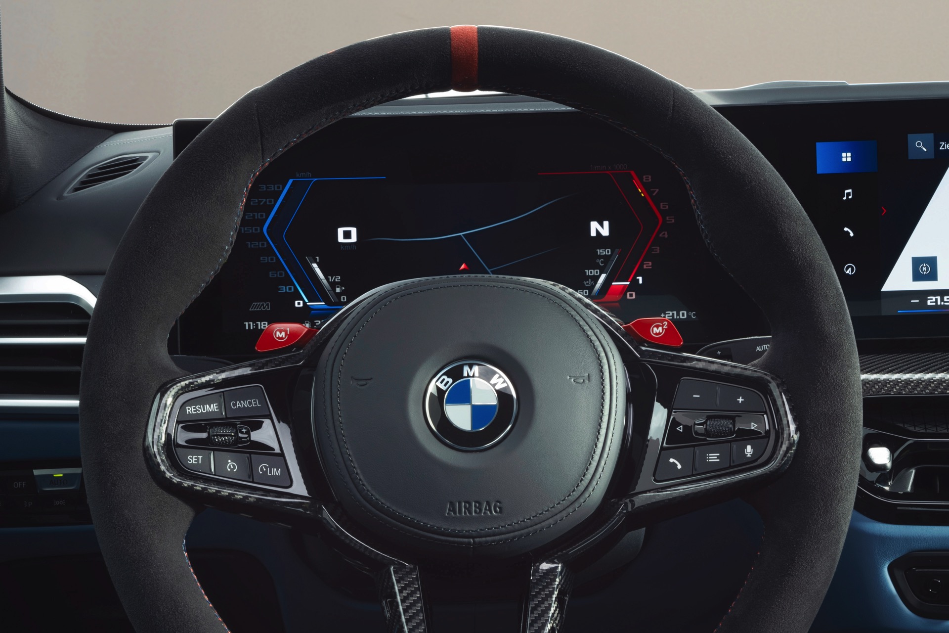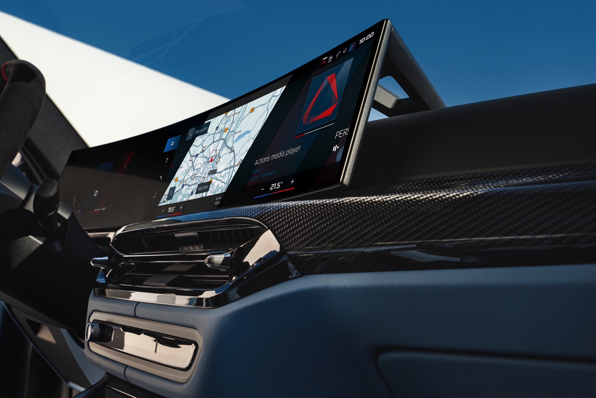 Im Cockpit des neuen BMW M4 sehen wir eine neue Lenkrad-Generation mit unten abgeflachtem Kranz, das auf Wunsch auch in einer Alcantara-Ausführung bestellbar ist. Auf dem Curved Display läuft künftig das Infotainment-System iDrive 8.5, darunter sorgt ein neues Lüftungsdüsen-Design mit integrierter Beleuchtung für eine frischere Optik.