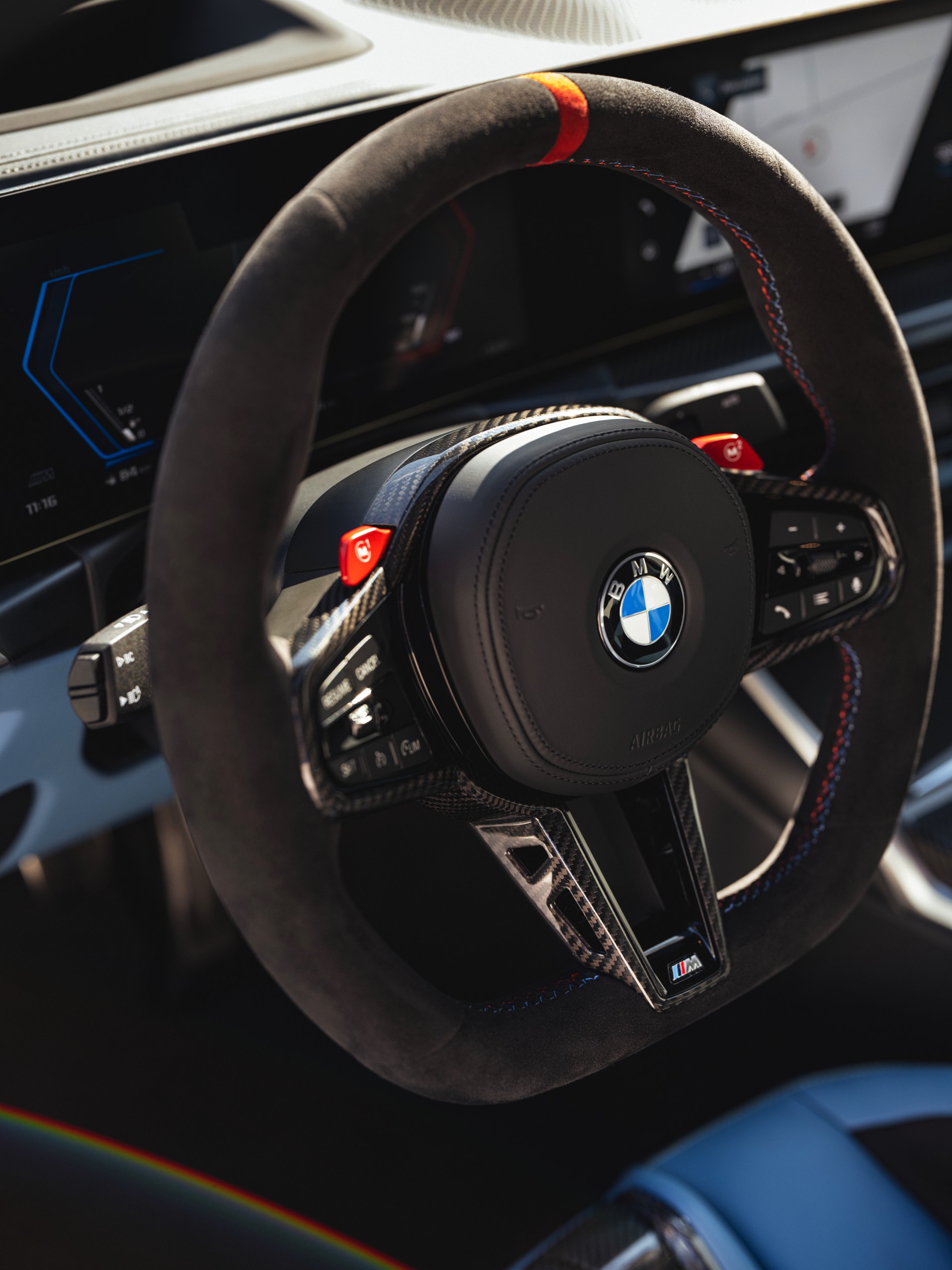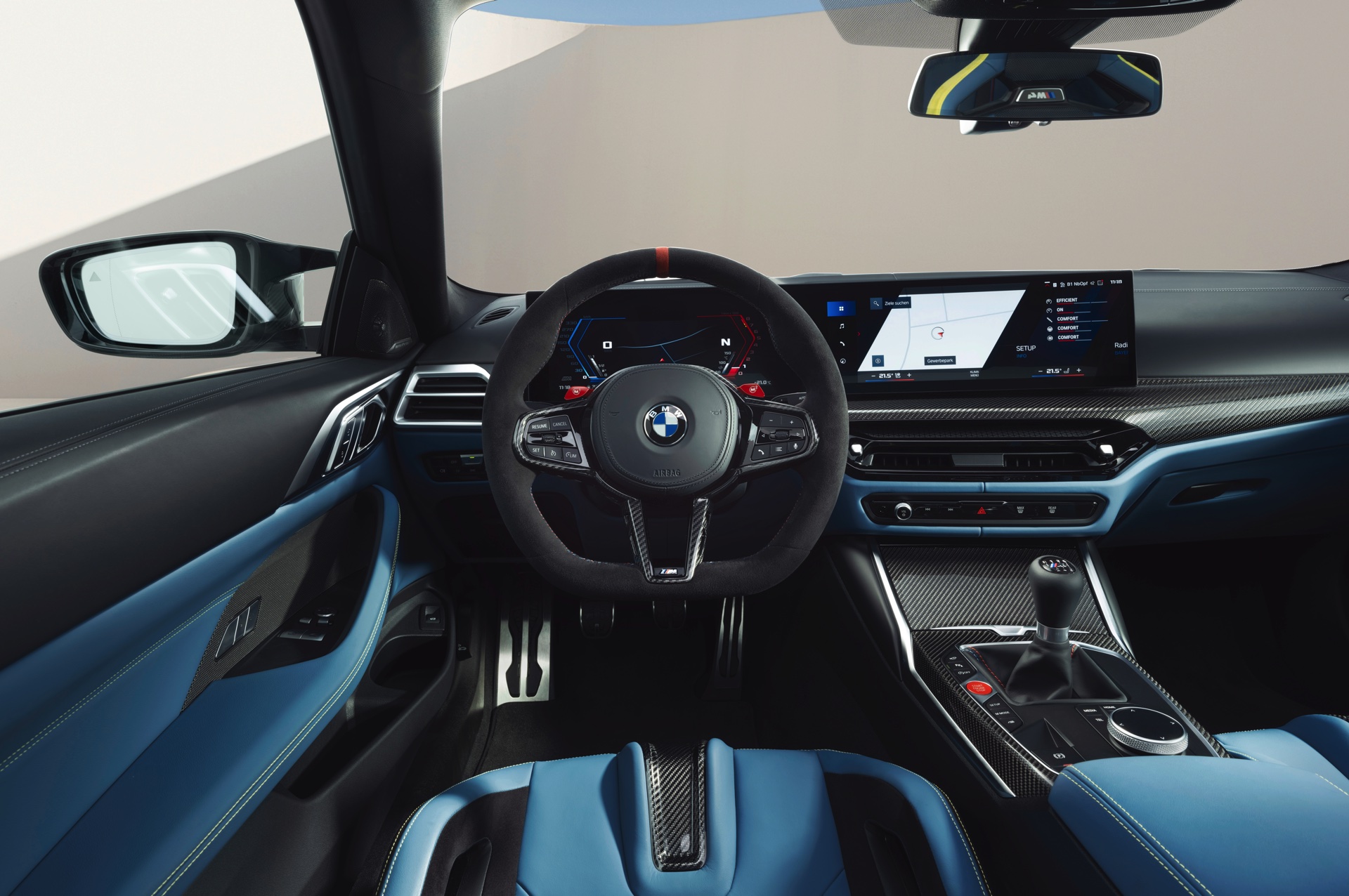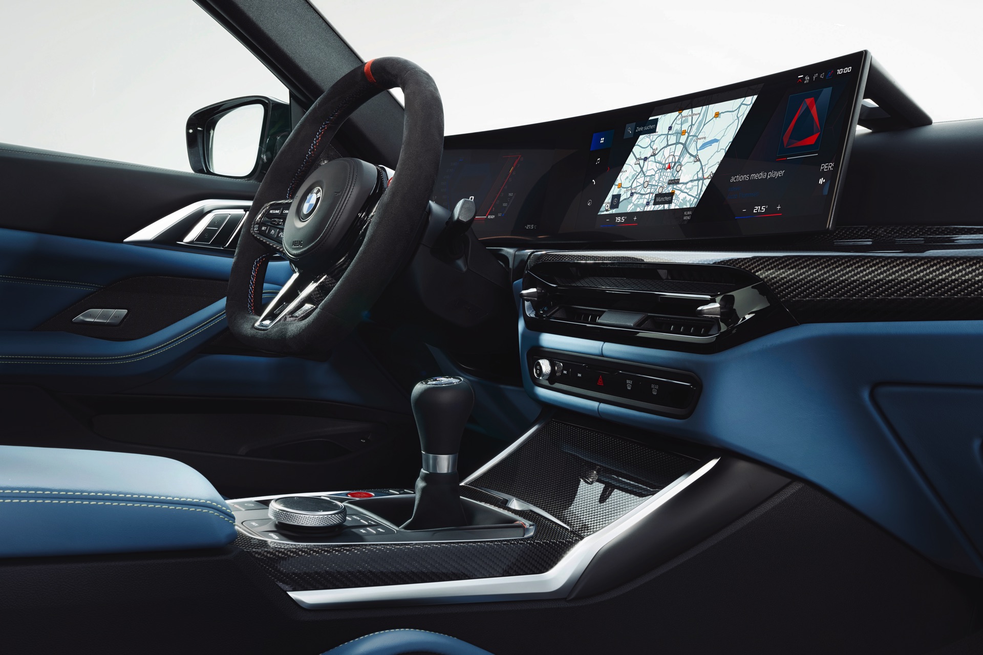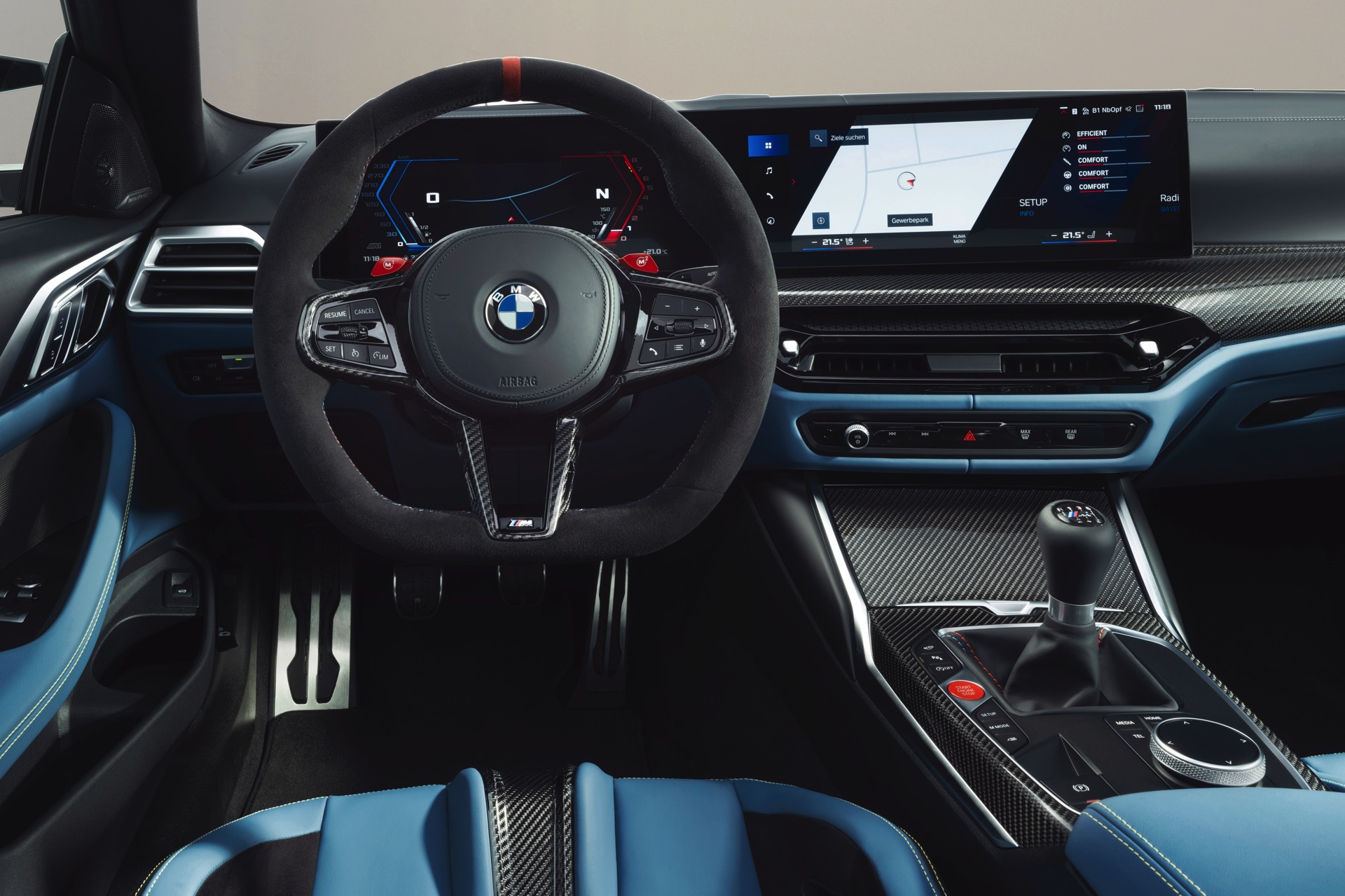 Im Cockpit des neuen BMW M4 sehen wir eine neue Lenkrad-Generation mit unten abgeflachtem Kranz, das auf Wunsch auch in einer Alcantara-Ausführung bestellbar ist. Auf dem Curved Display läuft künftig das Infotainment-System iDrive 8.5, darunter sorgt ein neues Lüftungsdüsen-Design mit integrierter Beleuchtung für eine frischere Optik.