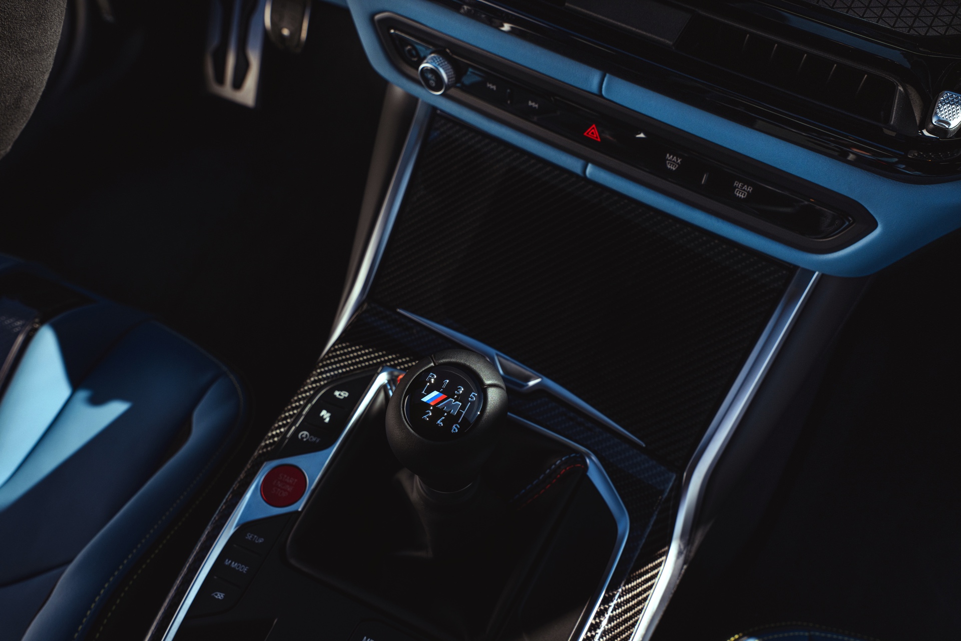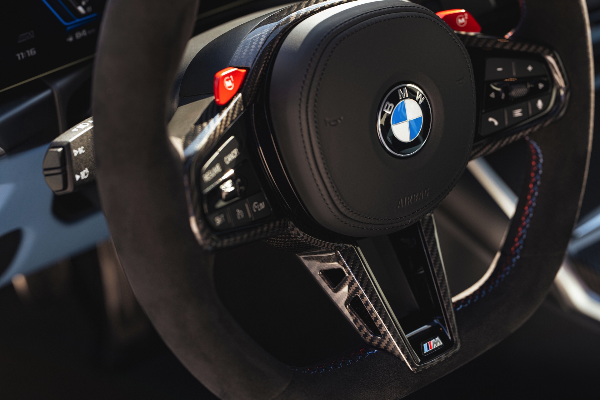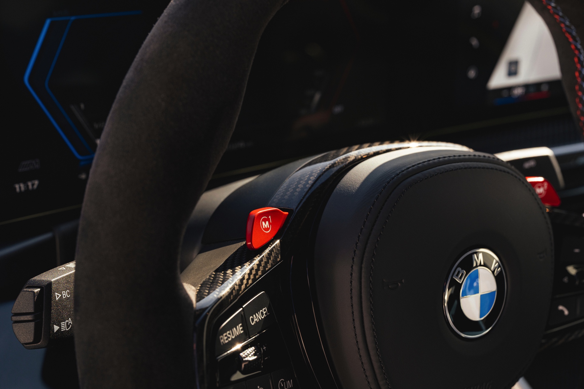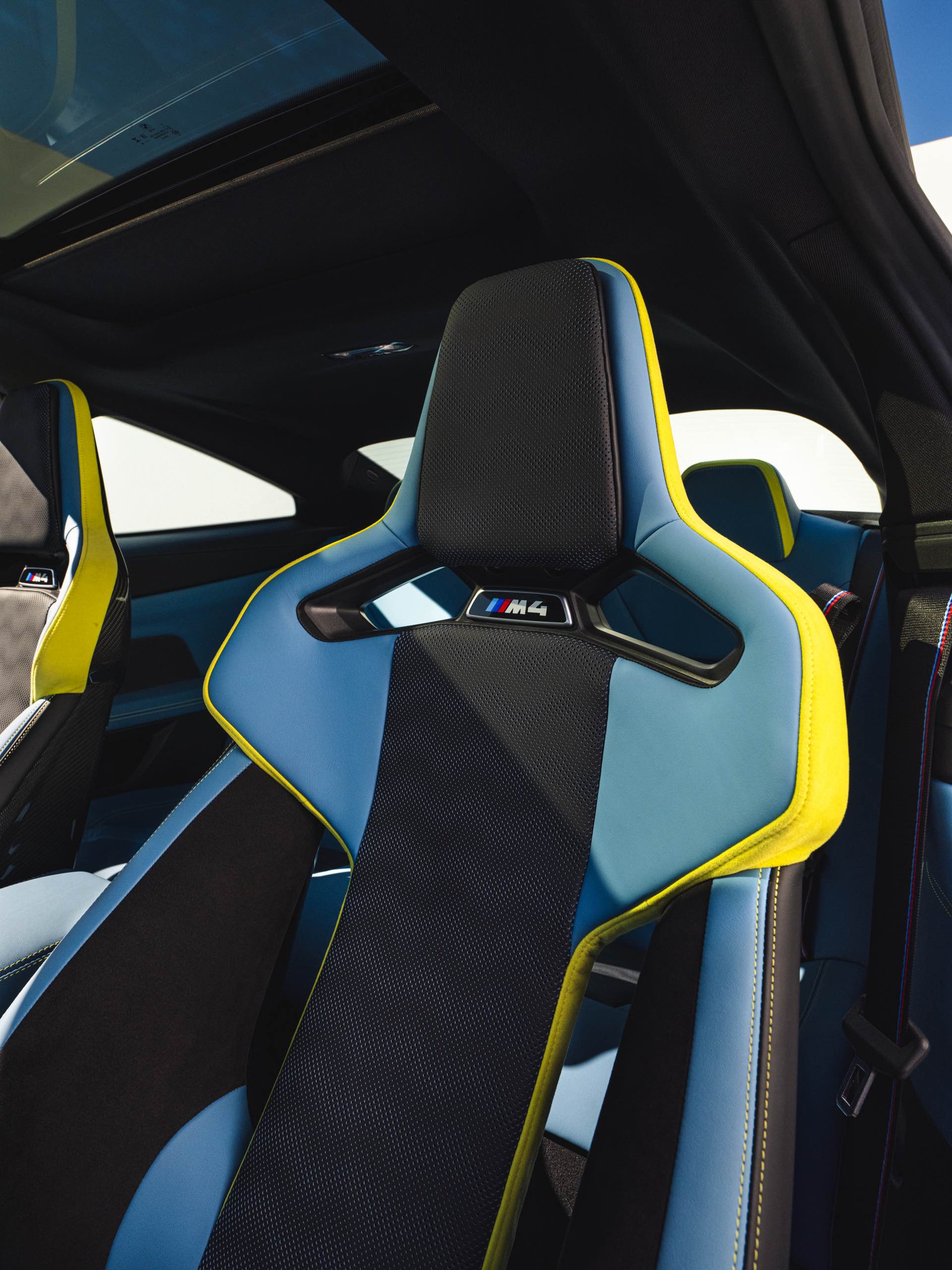 Im Cockpit des neuen BMW M4 sehen wir eine neue Lenkrad-Generation mit unten abgeflachtem Kranz, das auf Wunsch auch in einer Alcantara-Ausführung bestellbar ist. Auf dem Curved Display läuft künftig das Infotainment-System iDrive 8.5, darunter sorgt ein neues Lüftungsdüsen-Design mit integrierter Beleuchtung für eine frischere Optik.