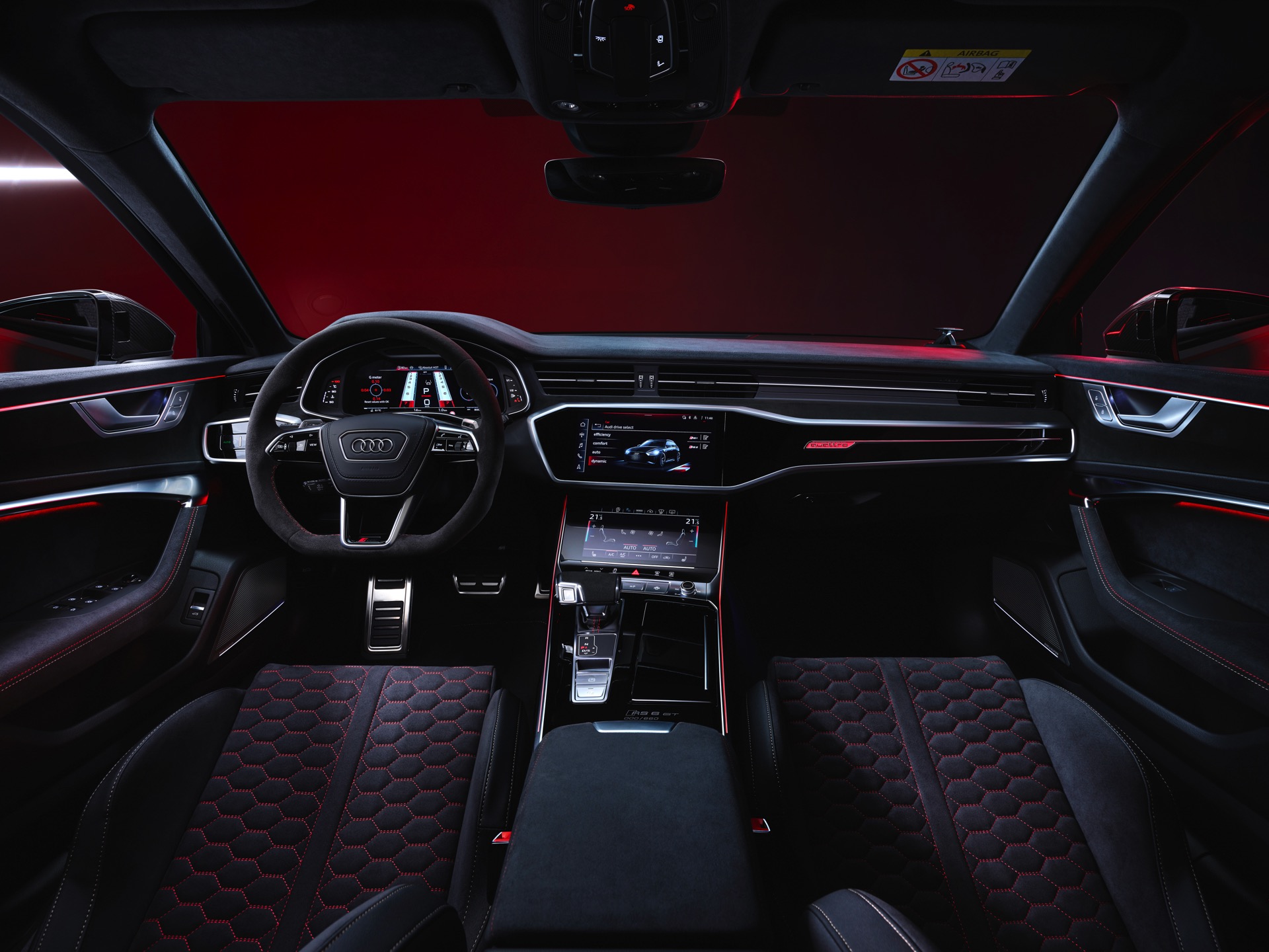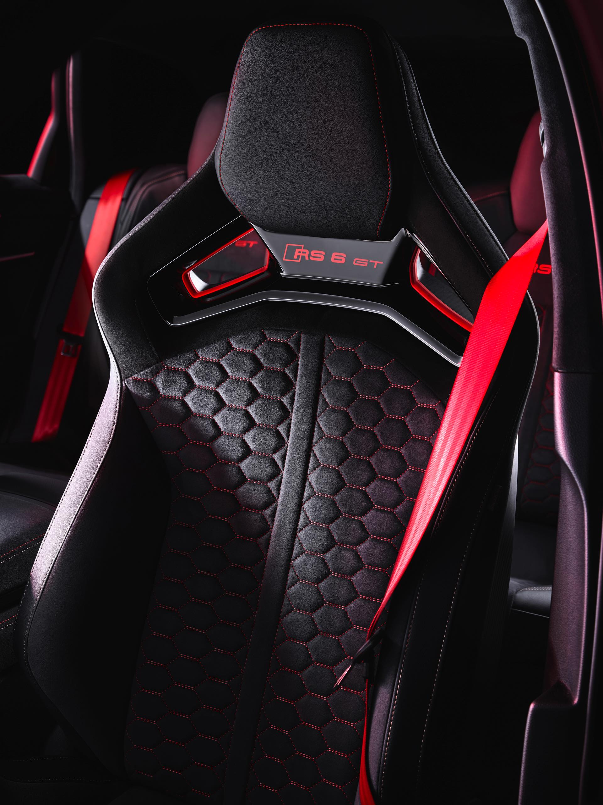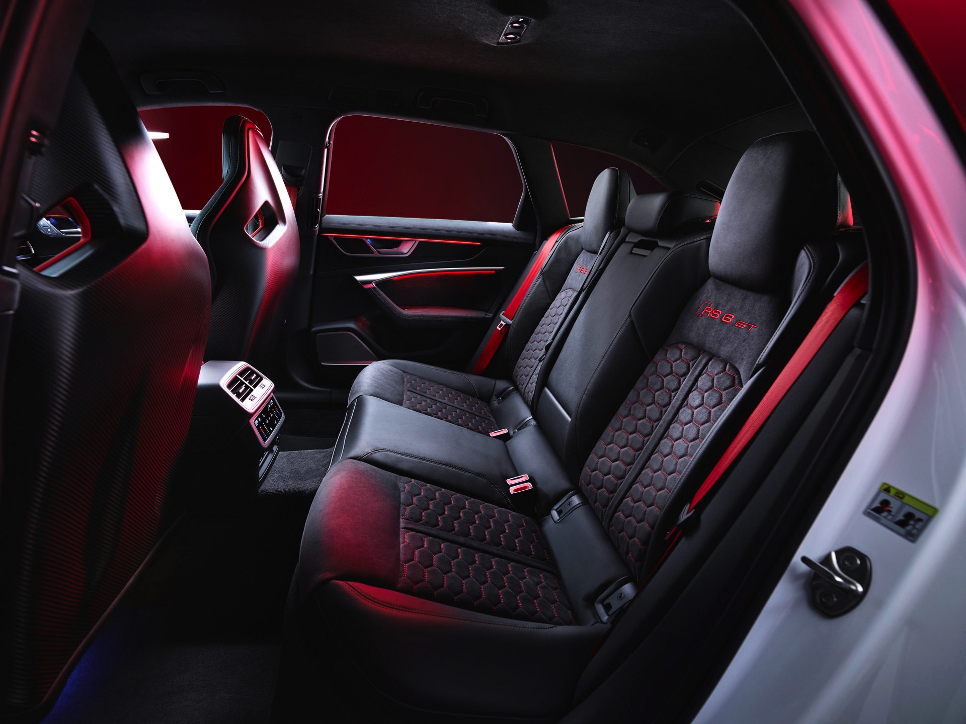 Dass sich auch der Innenraum des Audi RS 6 Avant GT auf höchstem Niveau bewegt, kann bei einem Preis von 219.355 Euro nicht überraschen. Wie im BMW M5 CS werden für Fahrer und Beifahrer Carbon-Schalensitze verbaut, die mit einer Wabensteppung samt roten Kontrastnähten ein echter Hingucker sind. Auch sonst sorgen zahlreiche rote Details und eine Nummerierung auf der Mittelkonsole dafür, dass sich der RS 6 GT denkbar weit vom üblichen Kombi-Standard entfernt.