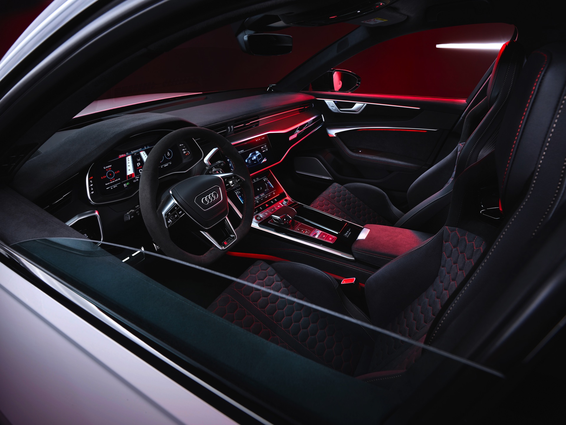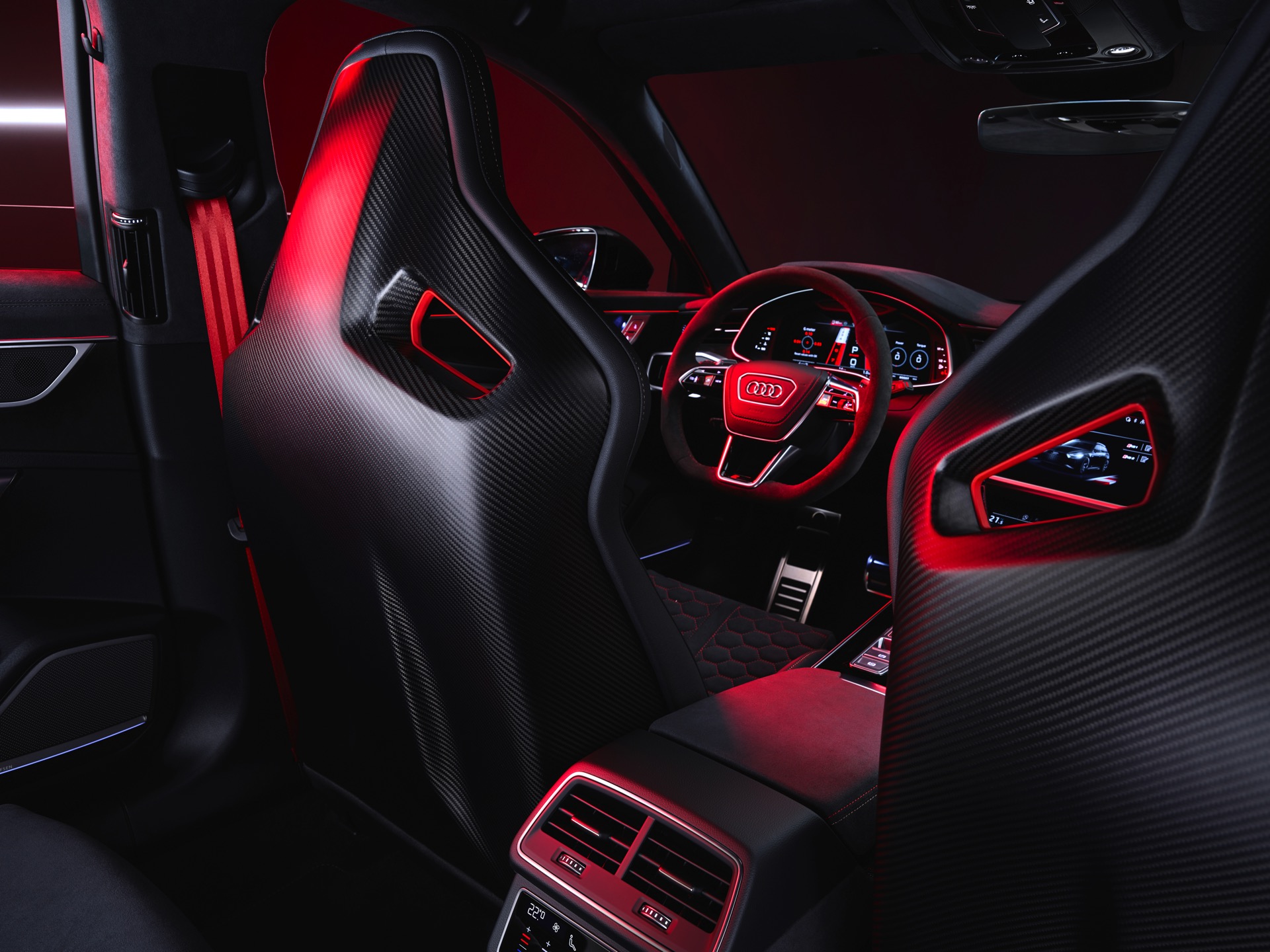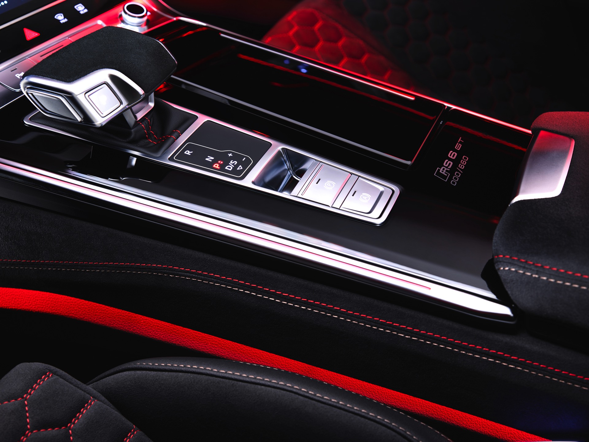 Dass sich auch der Innenraum des Audi RS 6 Avant GT auf höchstem Niveau bewegt, kann bei einem Preis von 219.355 Euro nicht überraschen. Wie im BMW M5 CS werden für Fahrer und Beifahrer Carbon-Schalensitze verbaut, die mit einer Wabensteppung samt roten Kontrastnähten ein echter Hingucker sind. Auch sonst sorgen zahlreiche rote Details und eine Nummerierung auf der Mittelkonsole dafür, dass sich der RS 6 GT denkbar weit vom üblichen Kombi-Standard entfernt.