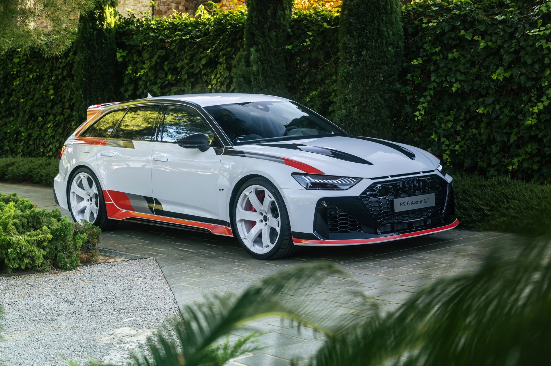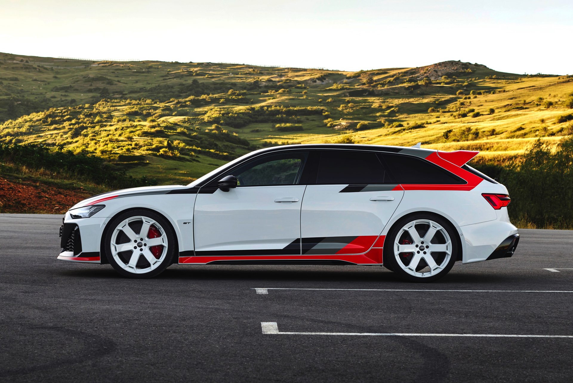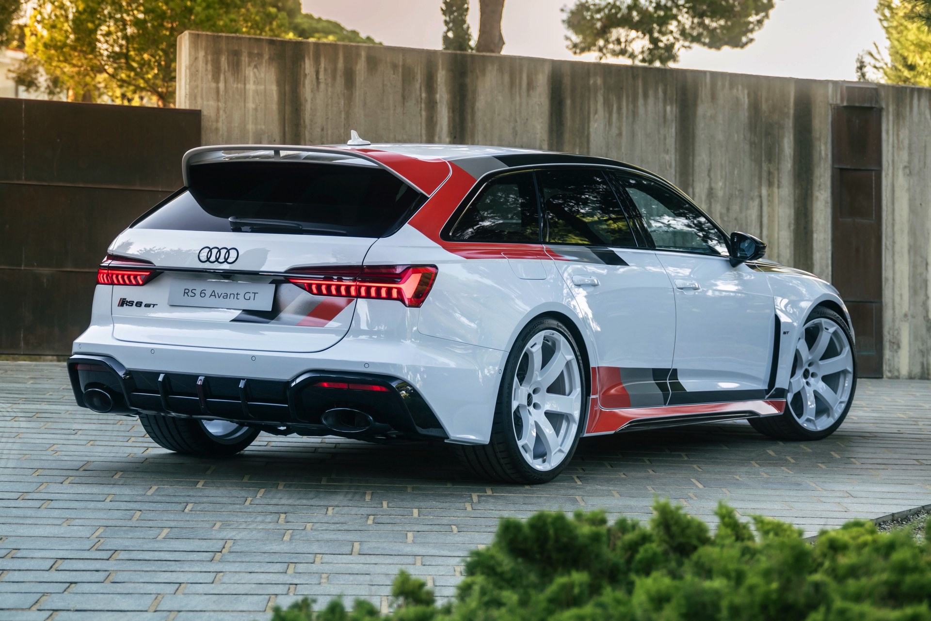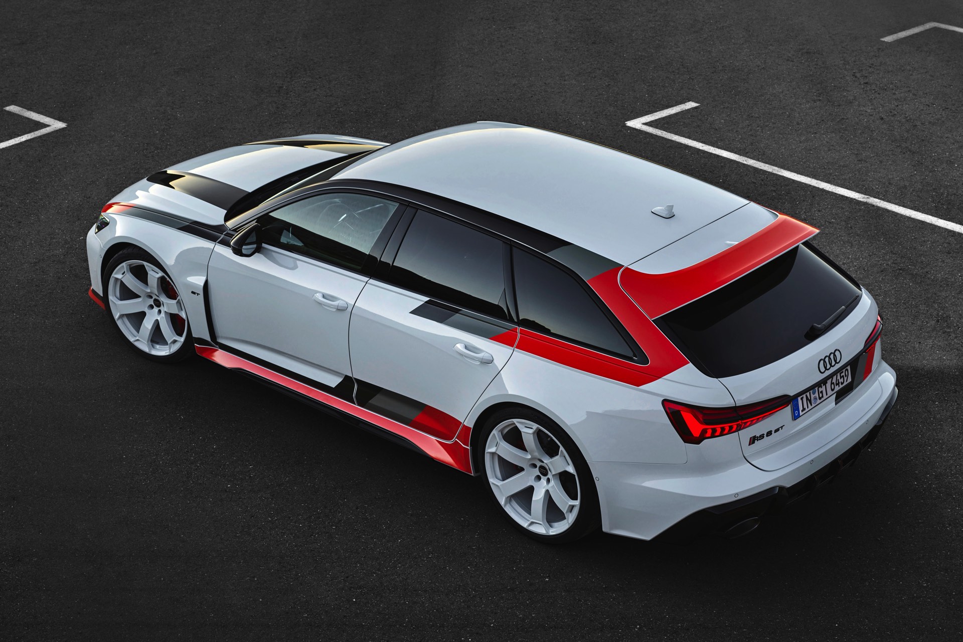 Voller Selbstbewusstsein trägt der Audi RS 6 Avant GT einen Look, der an die Rallye-Ikonen der Audi-Historie erinnert und das typische Design mit Streifen in Schwarz, Dunkelgrau und Rot modern interpretiert. Noch wichtiger: Eine Carbon-Motorhaube und breit ausgestellte Carbon-Kotflügel vorn sorgen für eine weniger frontlastige Gewichtsverteilung und gemeinsam mit dem wuchtigen Dachkanten-Spoiler und dem noch markanteren Diffusor für eine eine noch schärfere Optik. Dazu gibt es 22 Zoll-Felgen in einem exklusiven Design als Erkennungszeichen für Sammler und Sondermodell-Liebhaber.
