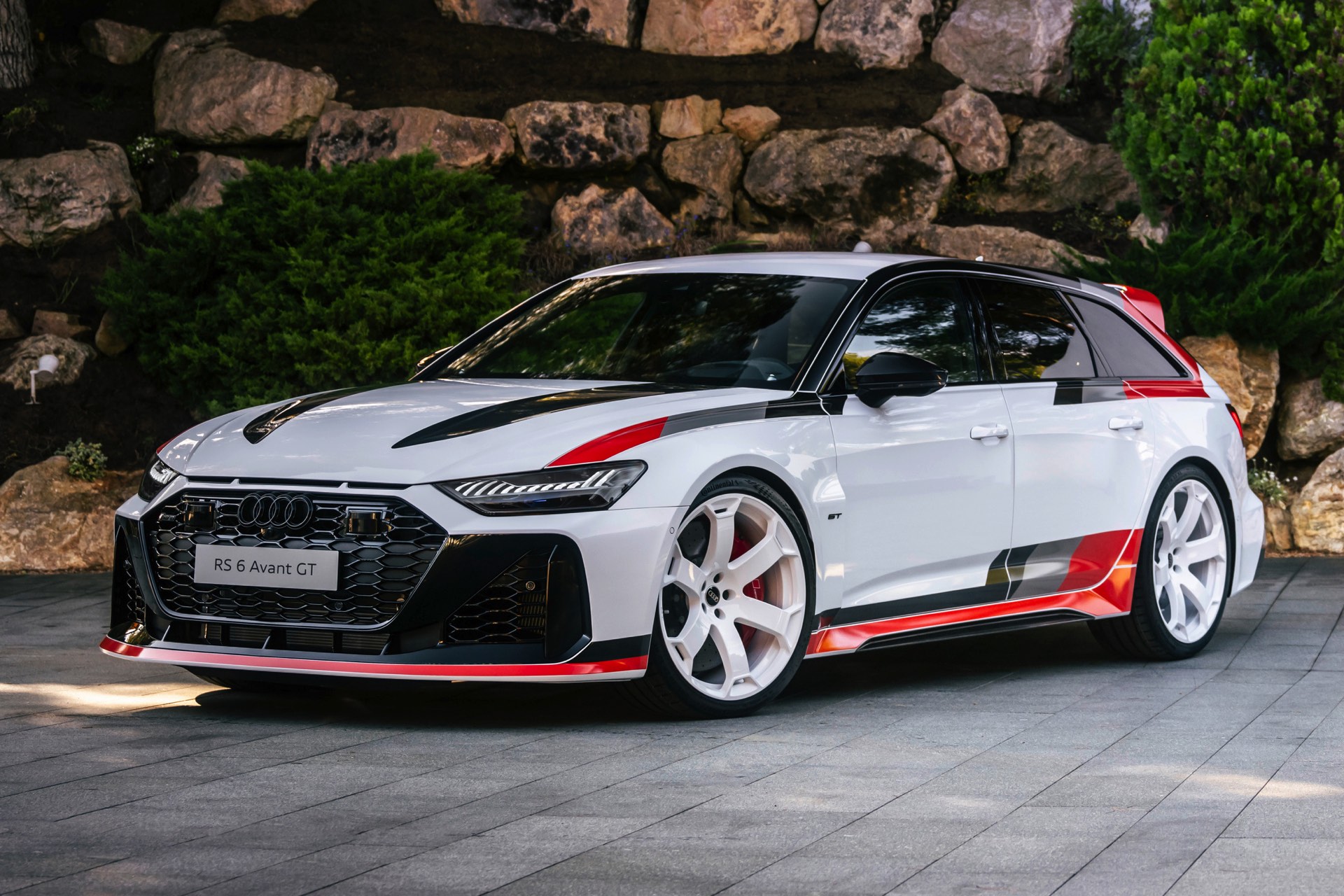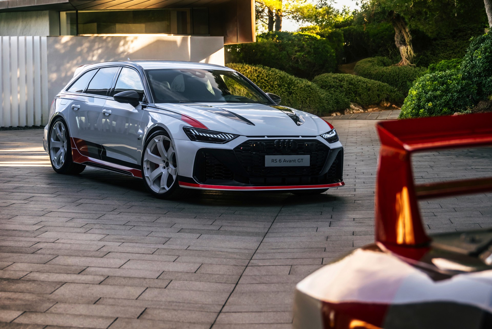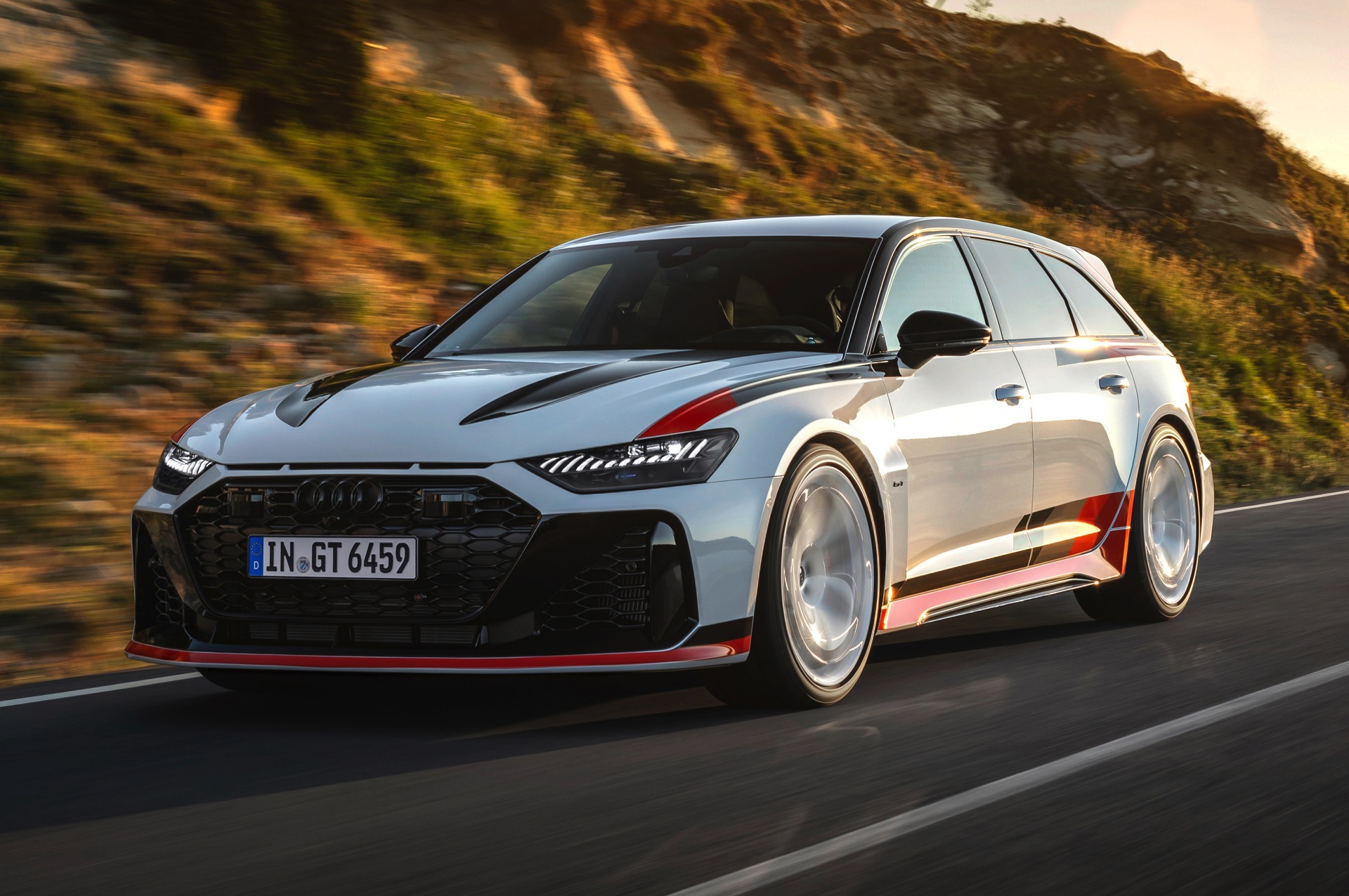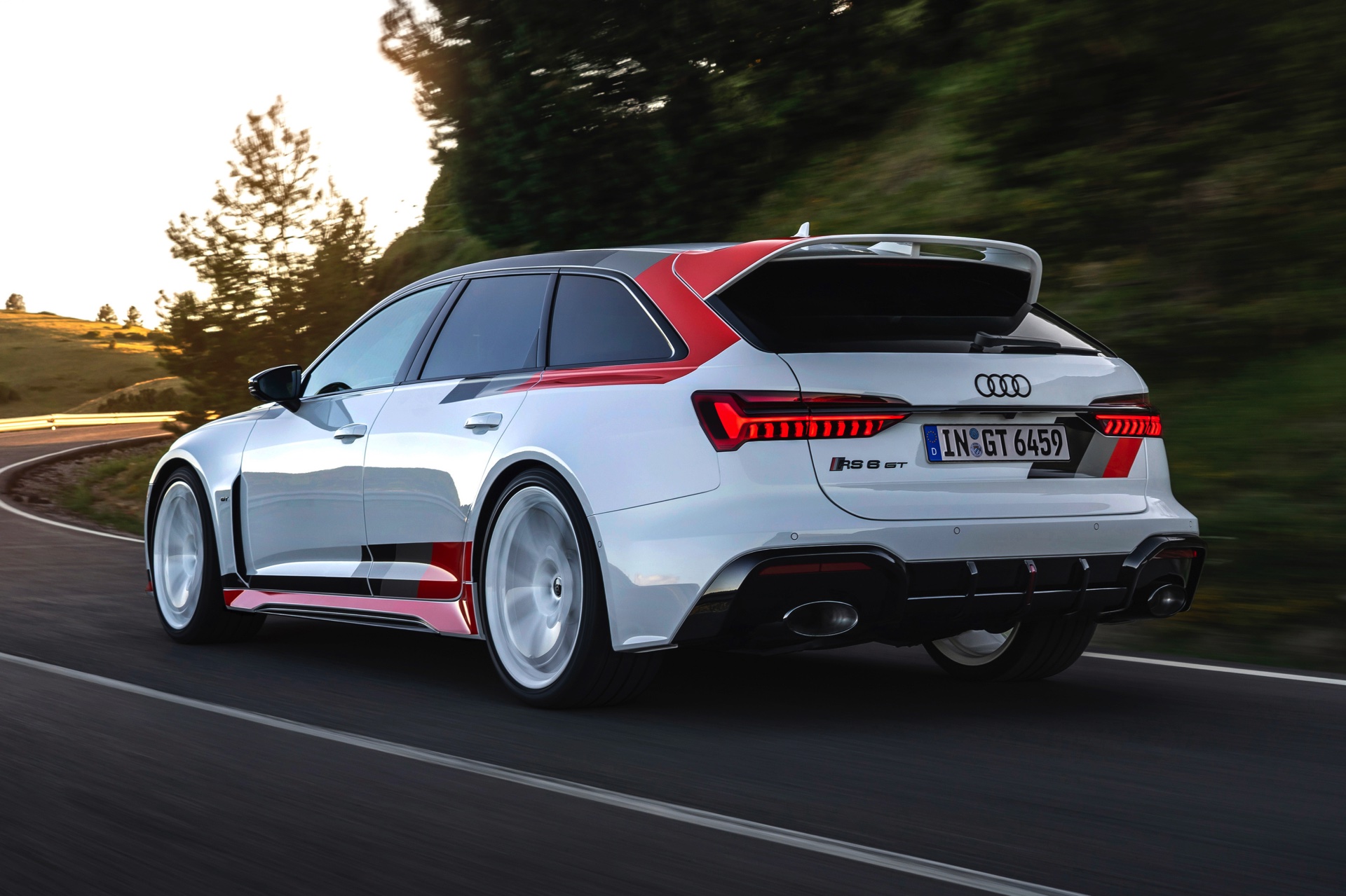 Voller Selbstbewusstsein trägt der Audi RS 6 Avant GT einen Look, der an die Rallye-Ikonen der Audi-Historie erinnert und das typische Design mit Streifen in Schwarz, Dunkelgrau und Rot modern interpretiert. Noch wichtiger: Eine Carbon-Motorhaube und breit ausgestellte Carbon-Kotflügel vorn sorgen für eine weniger frontlastige Gewichtsverteilung und gemeinsam mit dem wuchtigen Dachkanten-Spoiler und dem noch markanteren Diffusor für eine eine noch schärfere Optik. Dazu gibt es 22 Zoll-Felgen in einem exklusiven Design als Erkennungszeichen für Sammler und Sondermodell-Liebhaber.