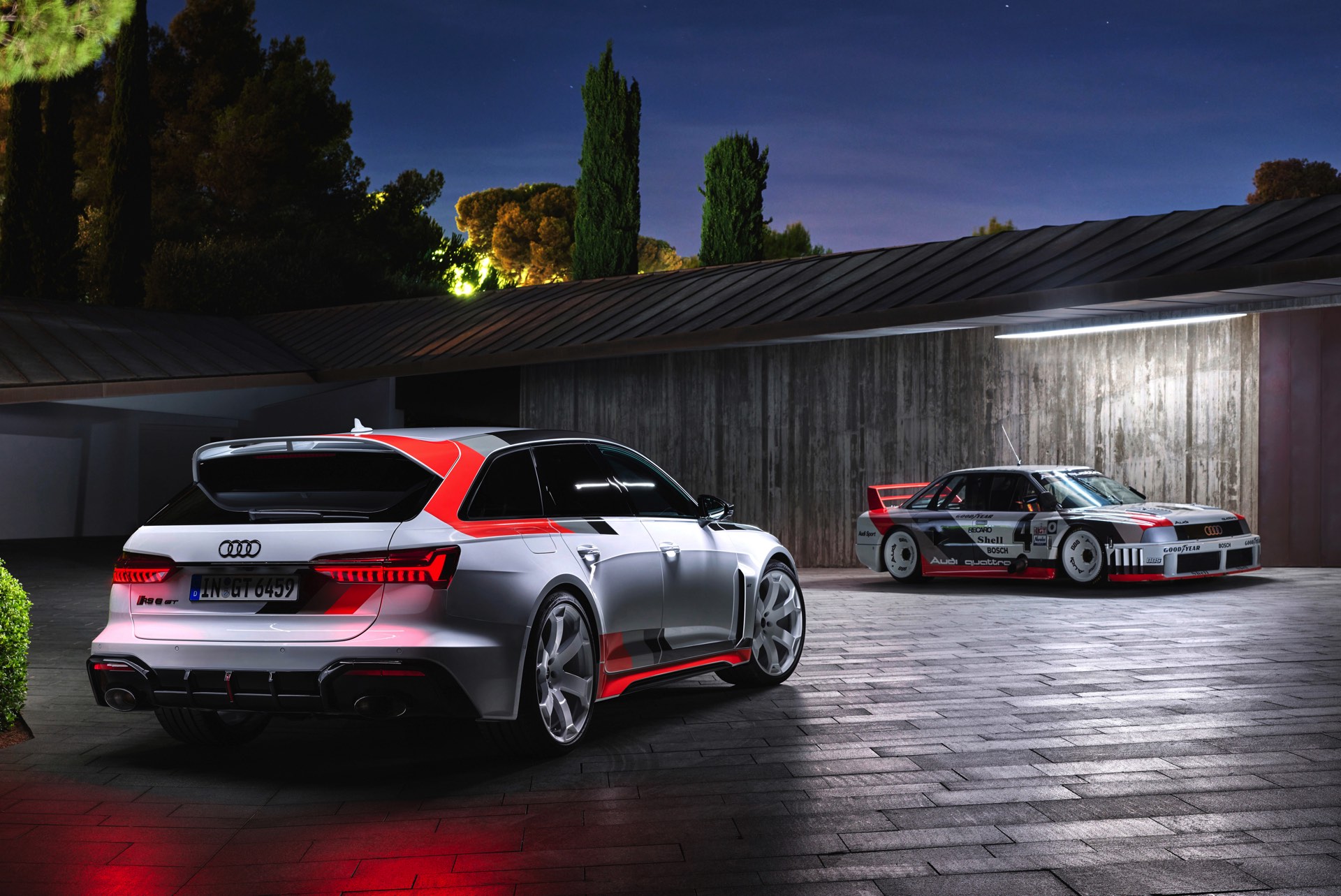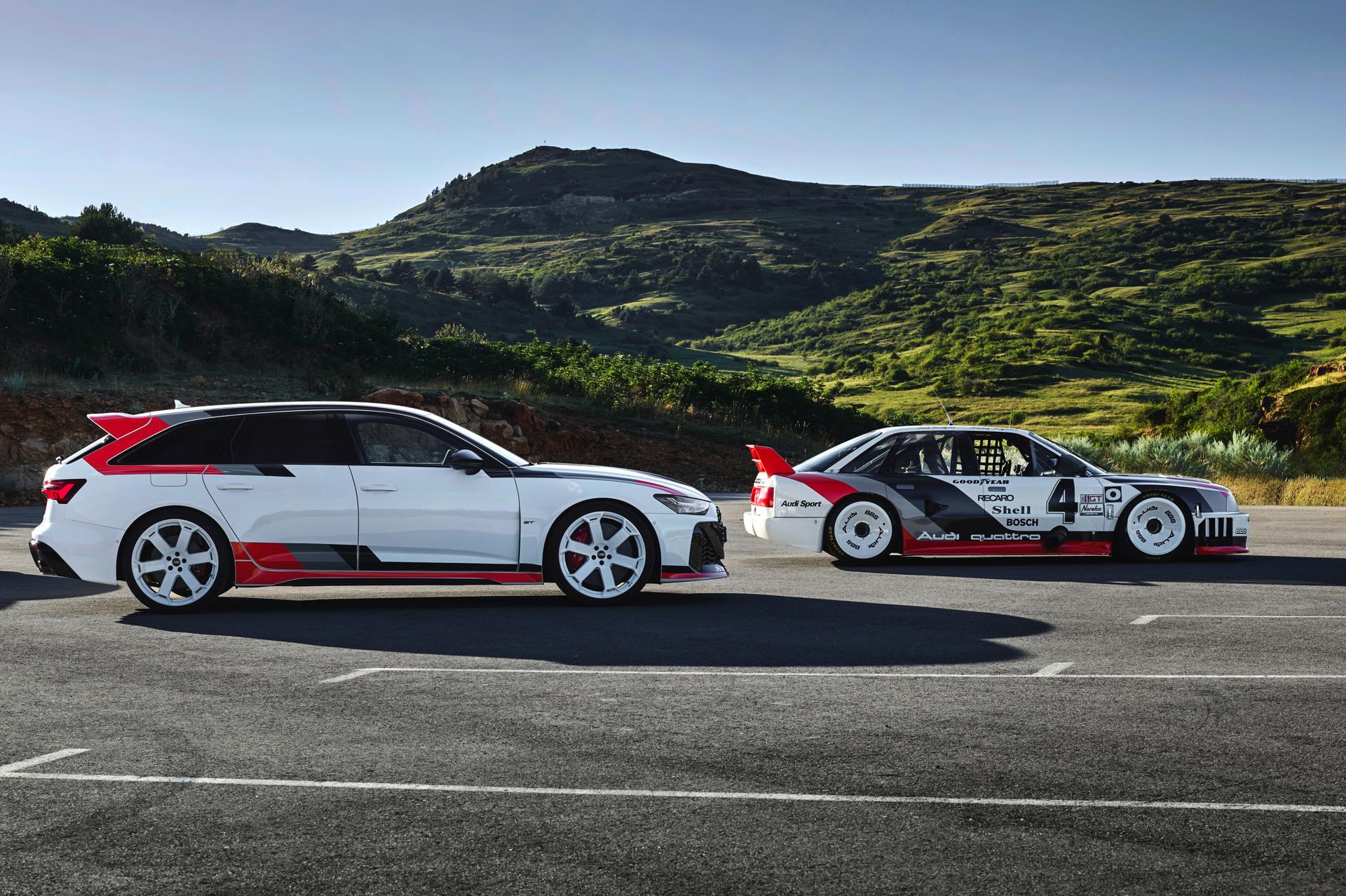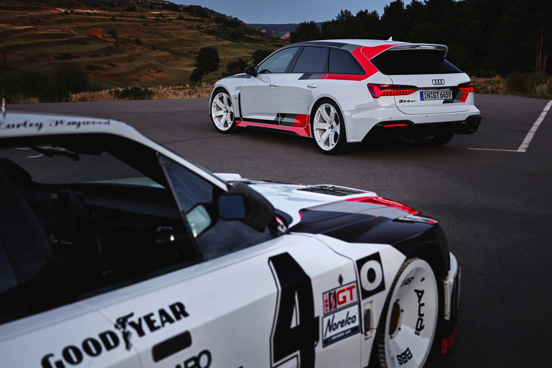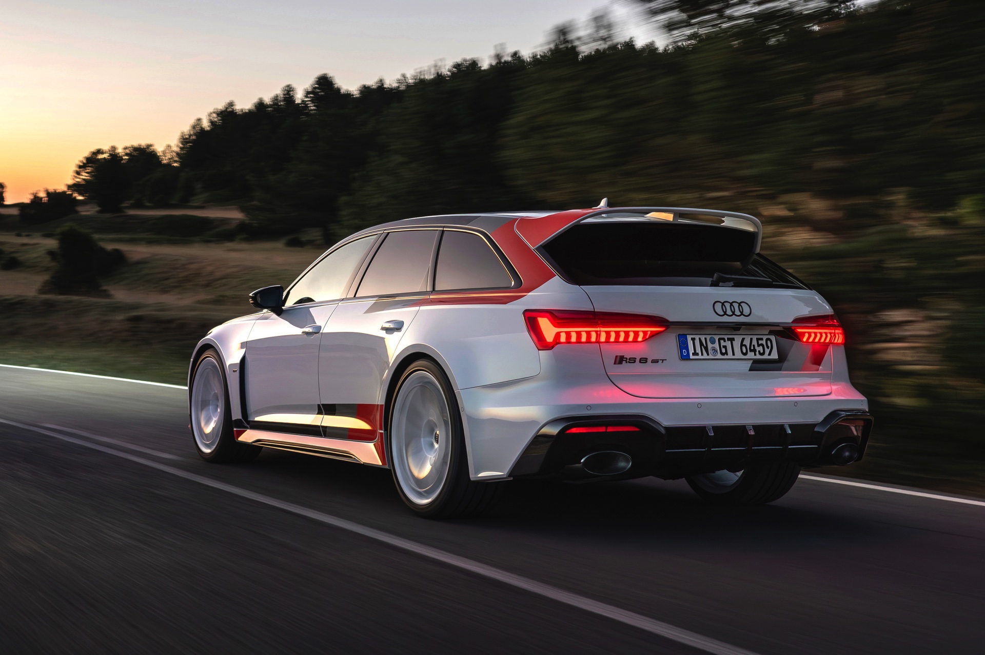 Voller Selbstbewusstsein trägt der Audi RS 6 Avant GT einen Look, der an die Rallye-Ikonen der Audi-Historie erinnert und das typische Design mit Streifen in Schwarz, Dunkelgrau und Rot modern interpretiert. Noch wichtiger: Eine Carbon-Motorhaube und breit ausgestellte Carbon-Kotflügel vorn sorgen für eine weniger frontlastige Gewichtsverteilung und gemeinsam mit dem wuchtigen Dachkanten-Spoiler und dem noch markanteren Diffusor für eine eine noch schärfere Optik. Dazu gibt es 22 Zoll-Felgen in einem exklusiven Design als Erkennungszeichen für Sammler und Sondermodell-Liebhaber.