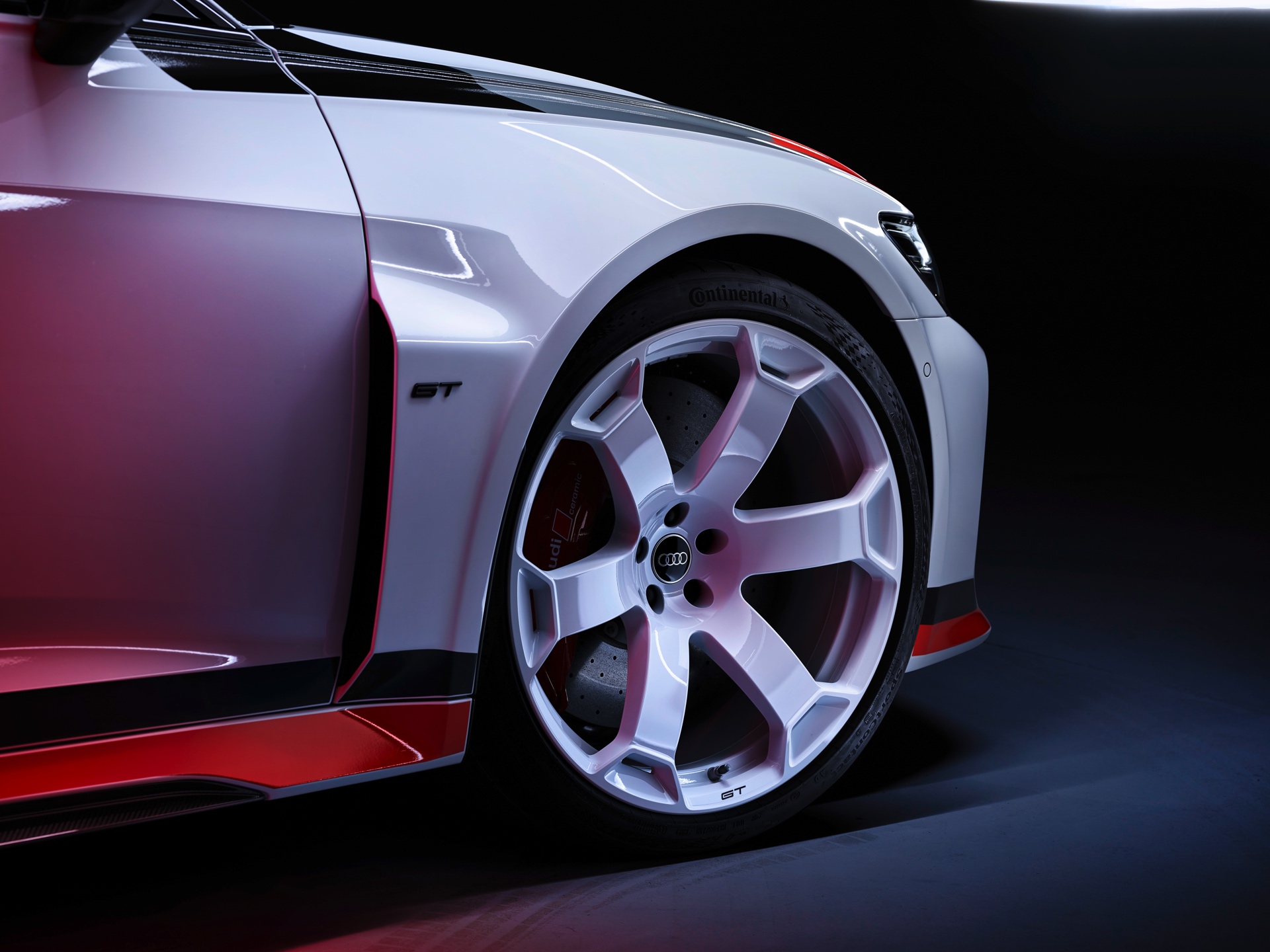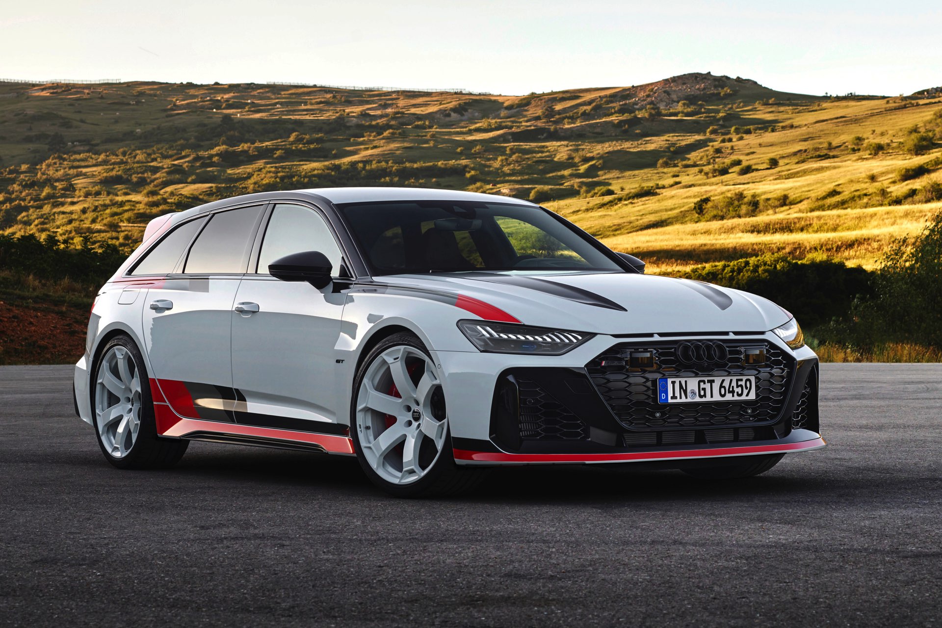 Für eine weiter gesteigerte Performance erhält der Audi RS 6 Avant GT außerdem ein speziell abgestimmtes Gewindefahrwerk, ein optimiertes Sportdifferenzial für den Allradantrieb quattro und einen Satz Hochleistungsreifen: Auf den weiß lackierten 22-Zöllern arbeiten rundum 285 Millimeter breite Continental Sport Contact 7 und sollen für optimalen Grip in jeder Lebenslage sorgen.