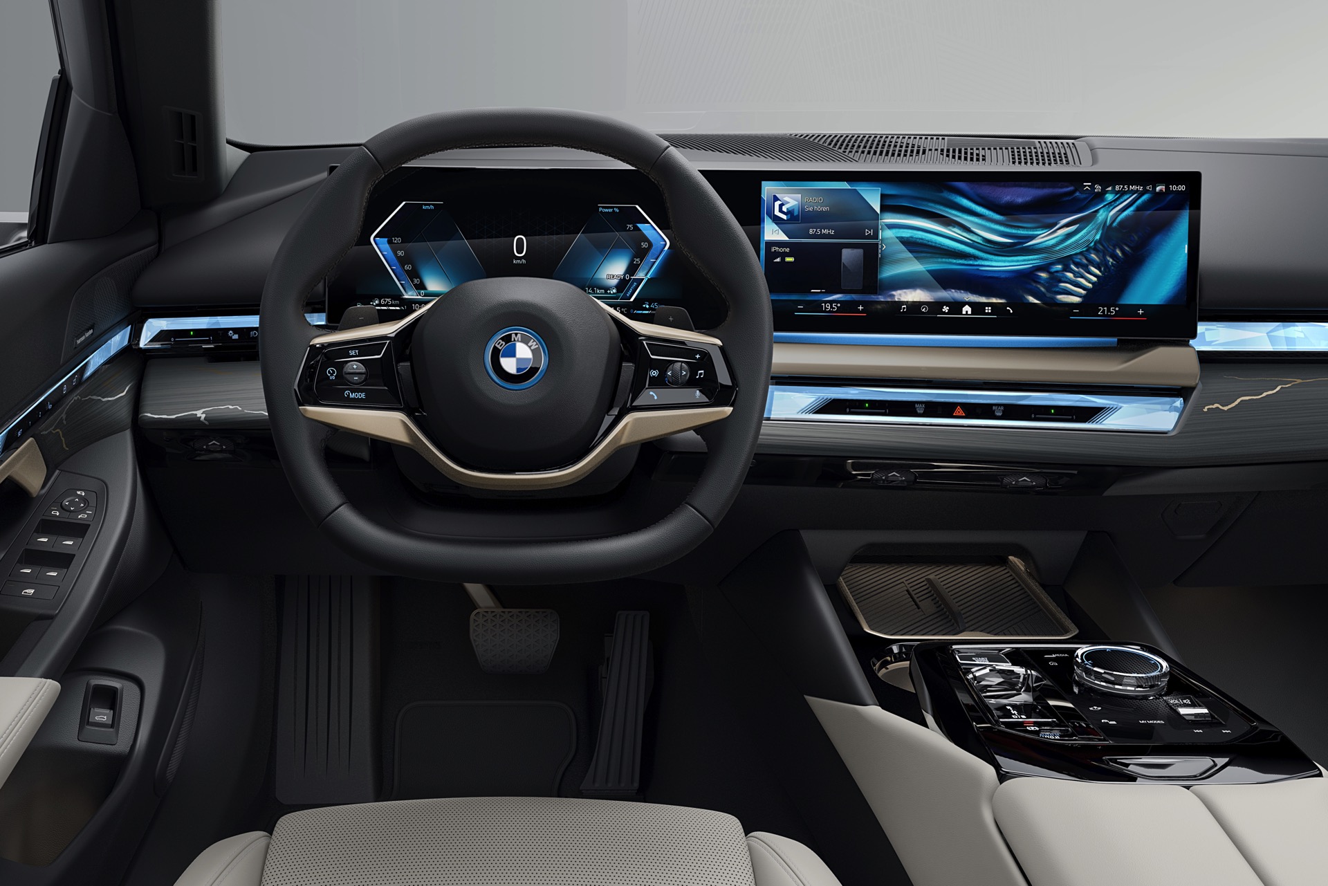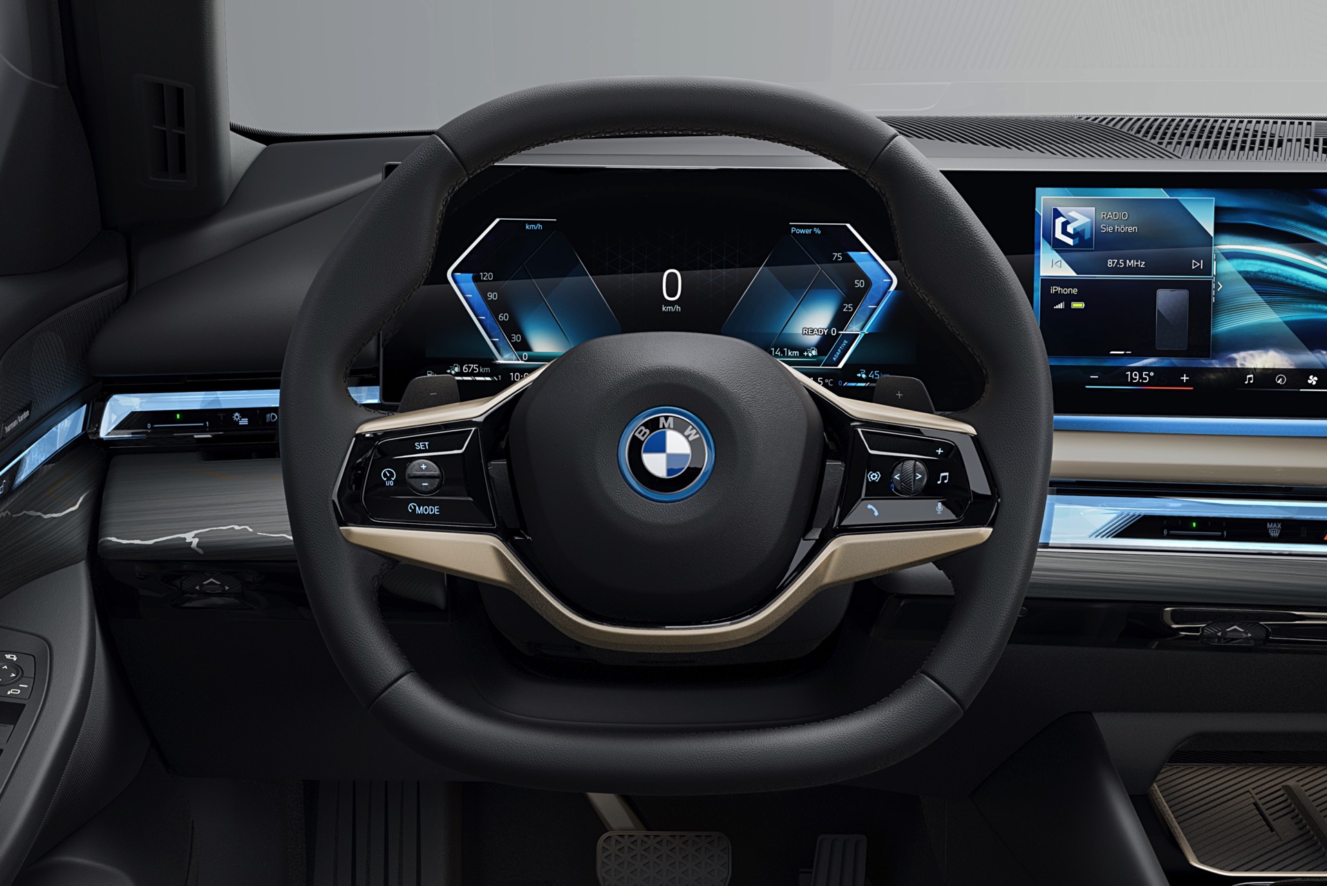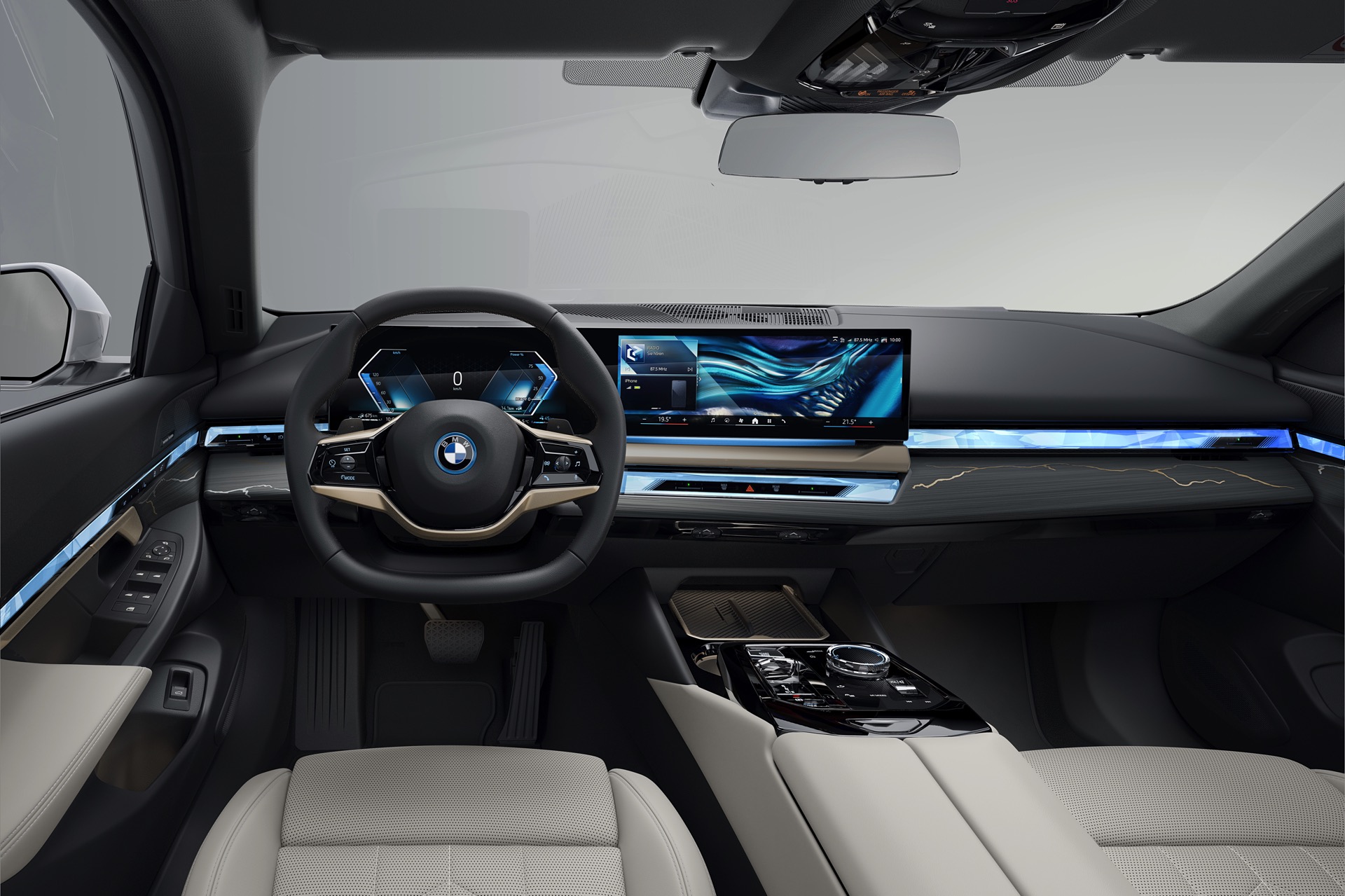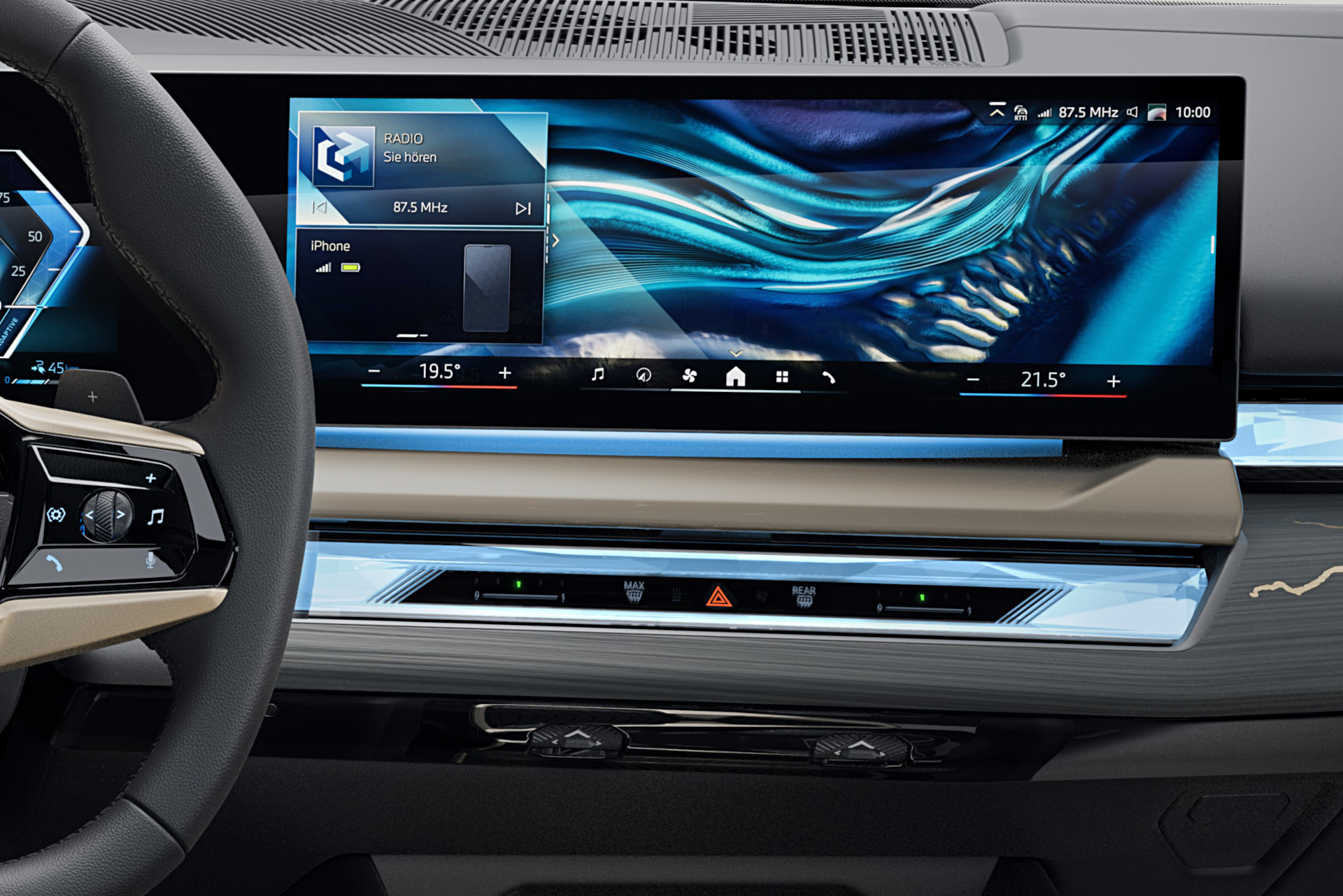 Spannend ist auch ein Blick in den Innenraum des Basis-5ers, denn hier sehen wir unter anderem das bereits beim 4er Facelift (G22 LCI) kontrovers diskutierte, unten abgeflachte Zwei-Speichen-Lenkrad. Hinter dem Lenkrad trägt auch die Serie ein großes Curved-Display, darunter verläuft auf voller Breite die farbig durchleuchtete Interaction Bar.