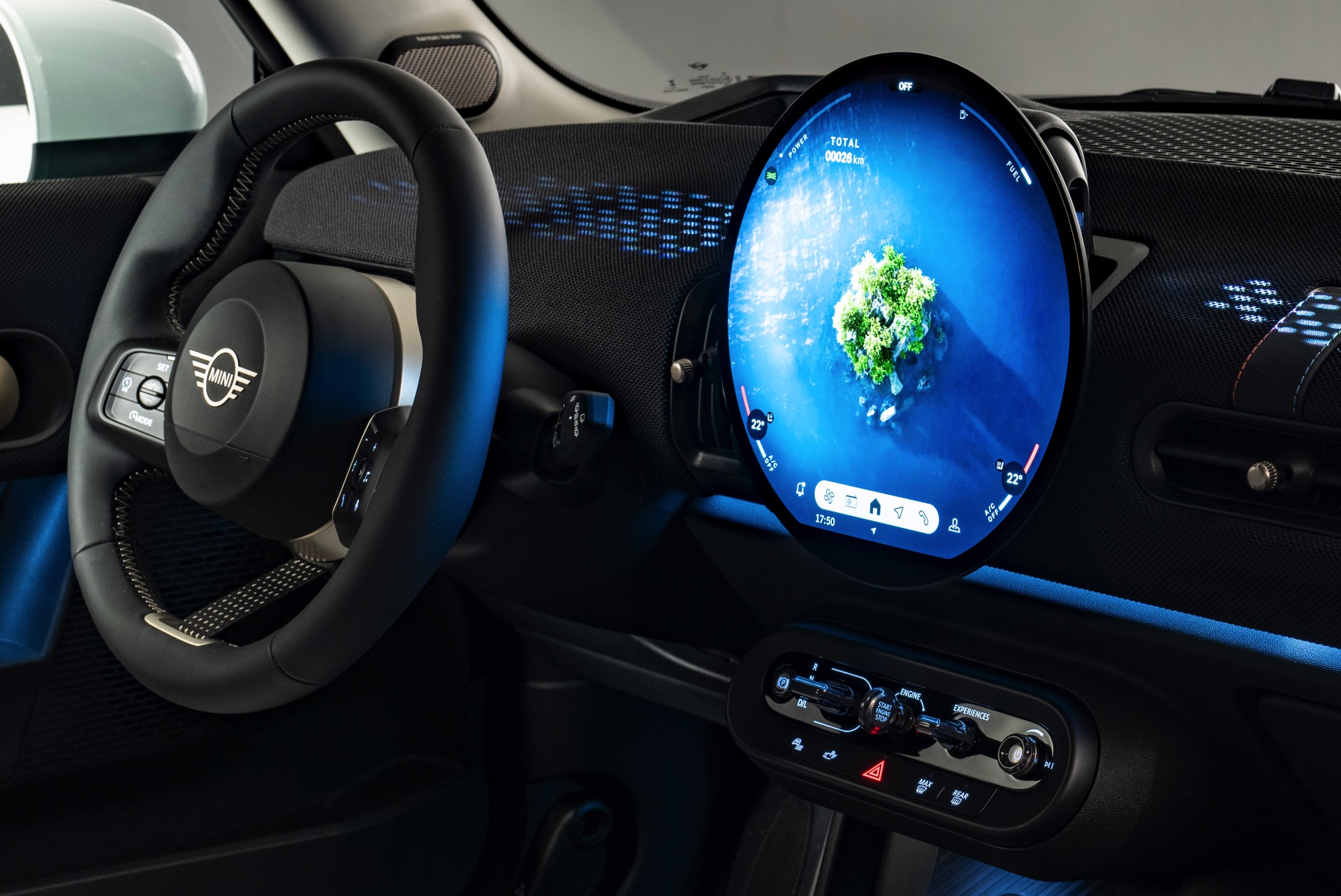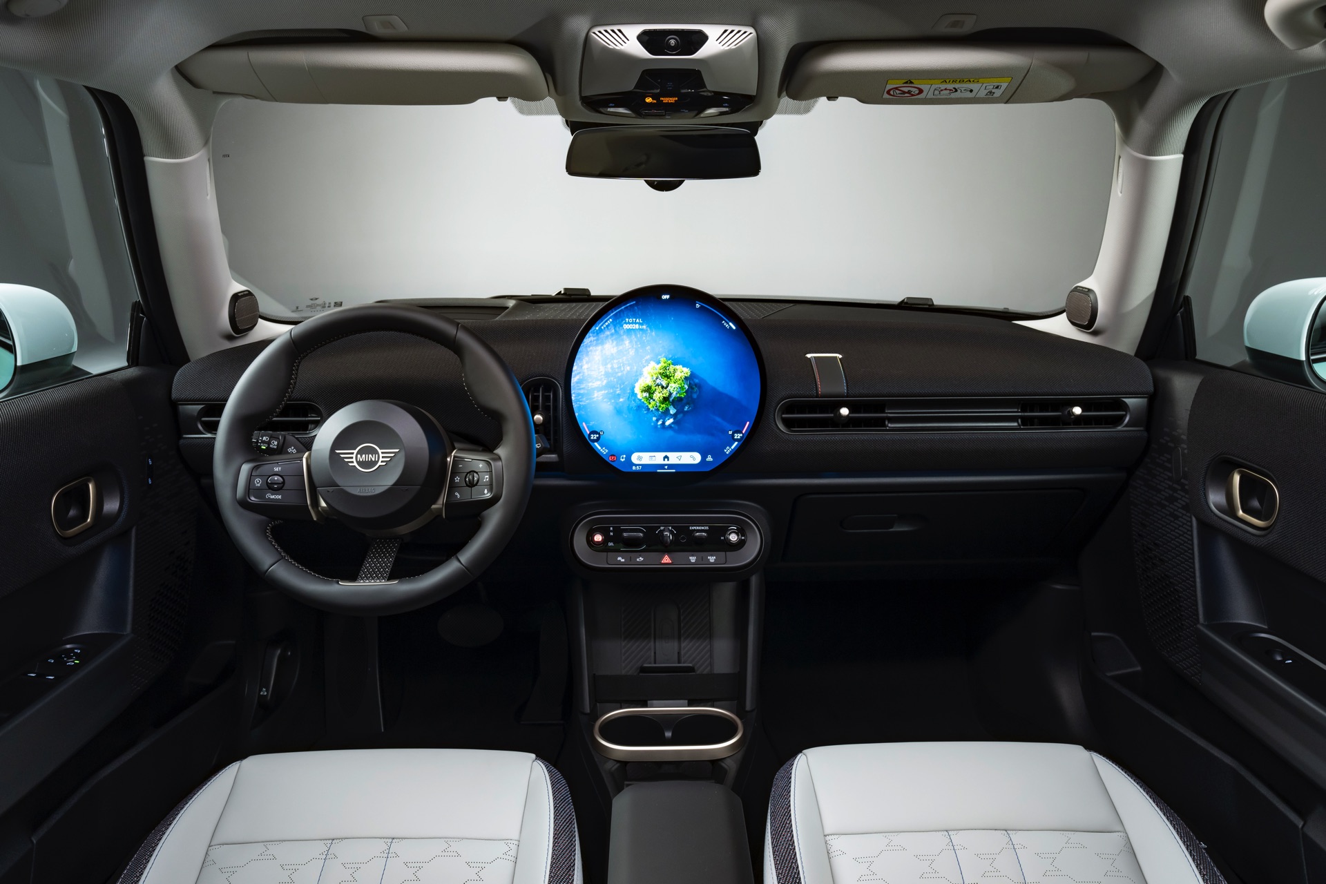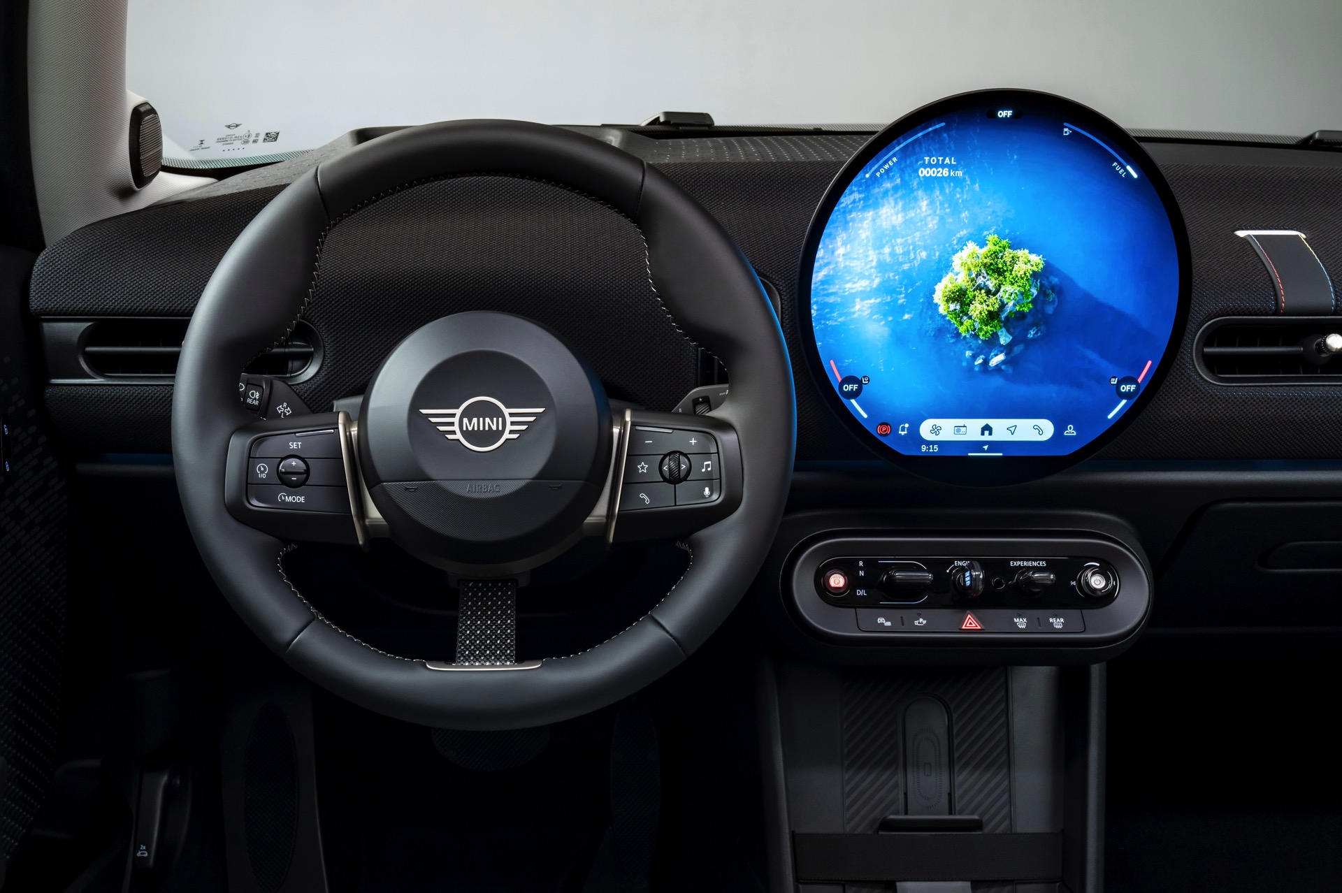 Auch innen orientiert sich der neue MINI 2024 eindeutig am elektrischen Zwilling, hier wie da dominiert das runde OLED-Display mit 24 Zentimetern Durchmesser das Cockpit. Platziert ist es auf einer sehr aufgeräumten Instrumenten-Tafel, die mit partiell durchleuchteten Stoff-Oberflächen punktet. Dank dem eng mit BMW iDrive 9 verwandten MINI Operating System 9 auf Android-Basis stehen modernste Features wie die Augmented View mit 3D-Objekten als Navigations-Unterstützung zur Wahl, andere kamera- und radarbasierte Assistenten überwachen die Umgebung und warnen bei Gefahr.