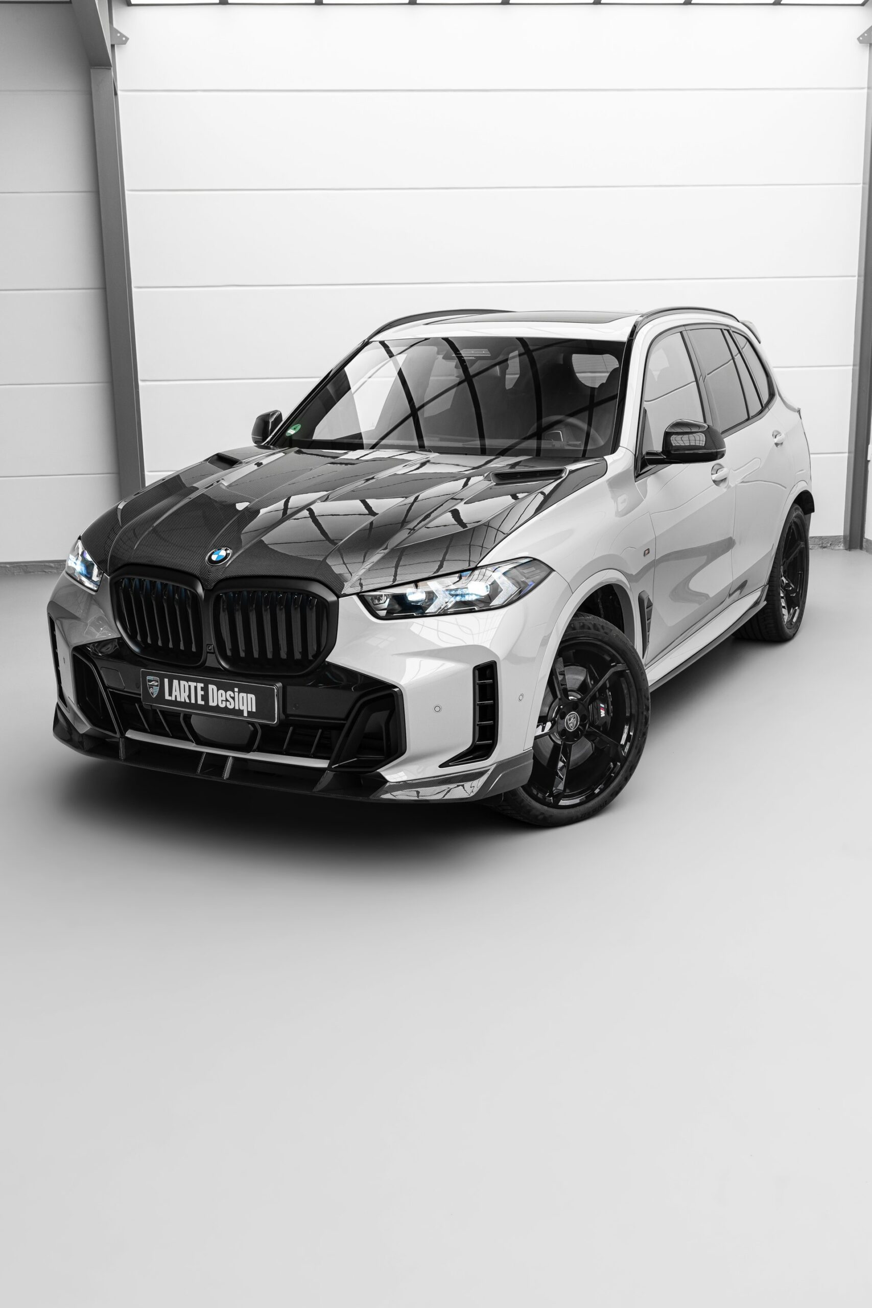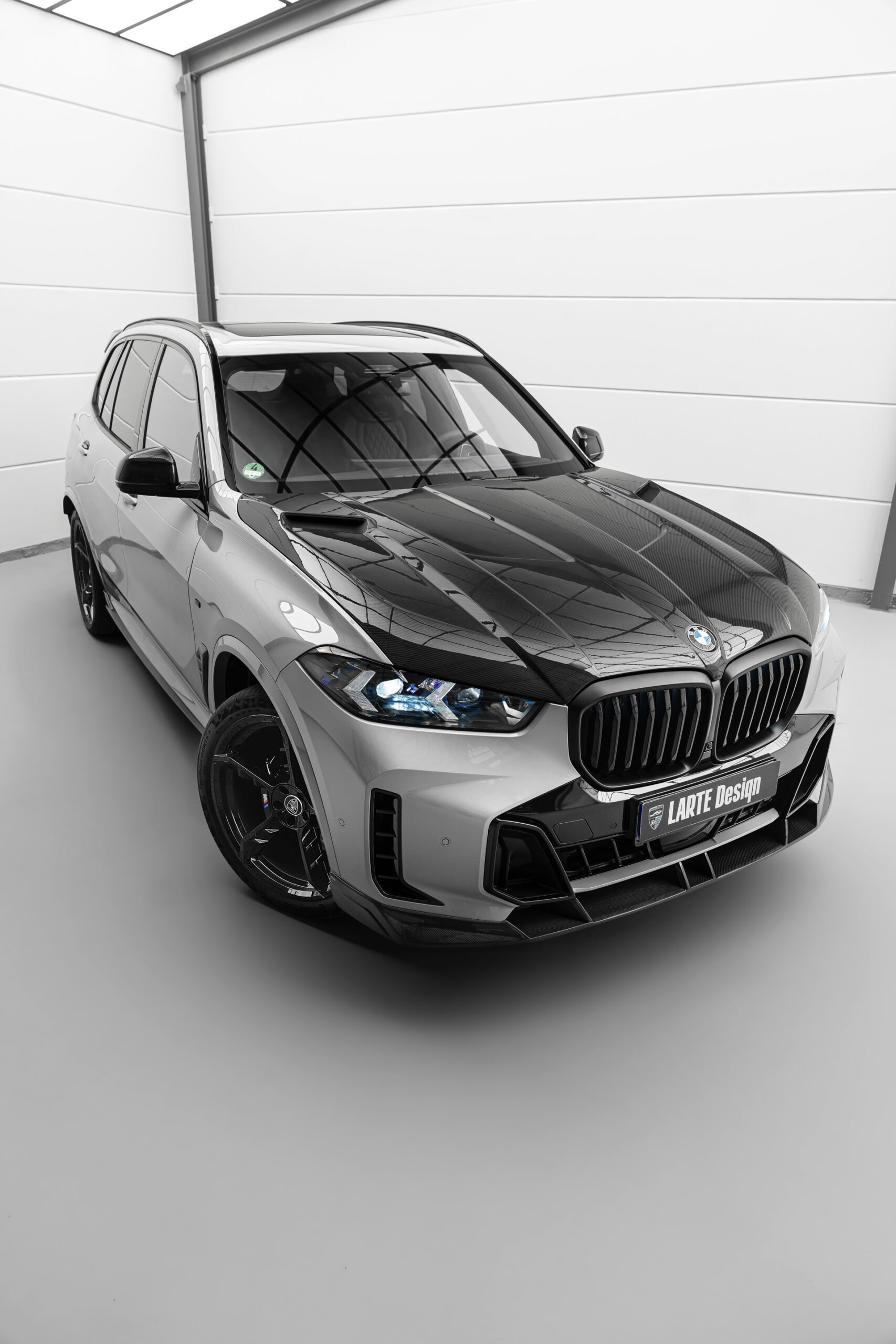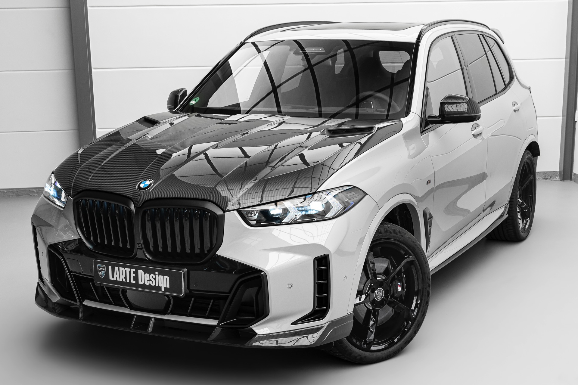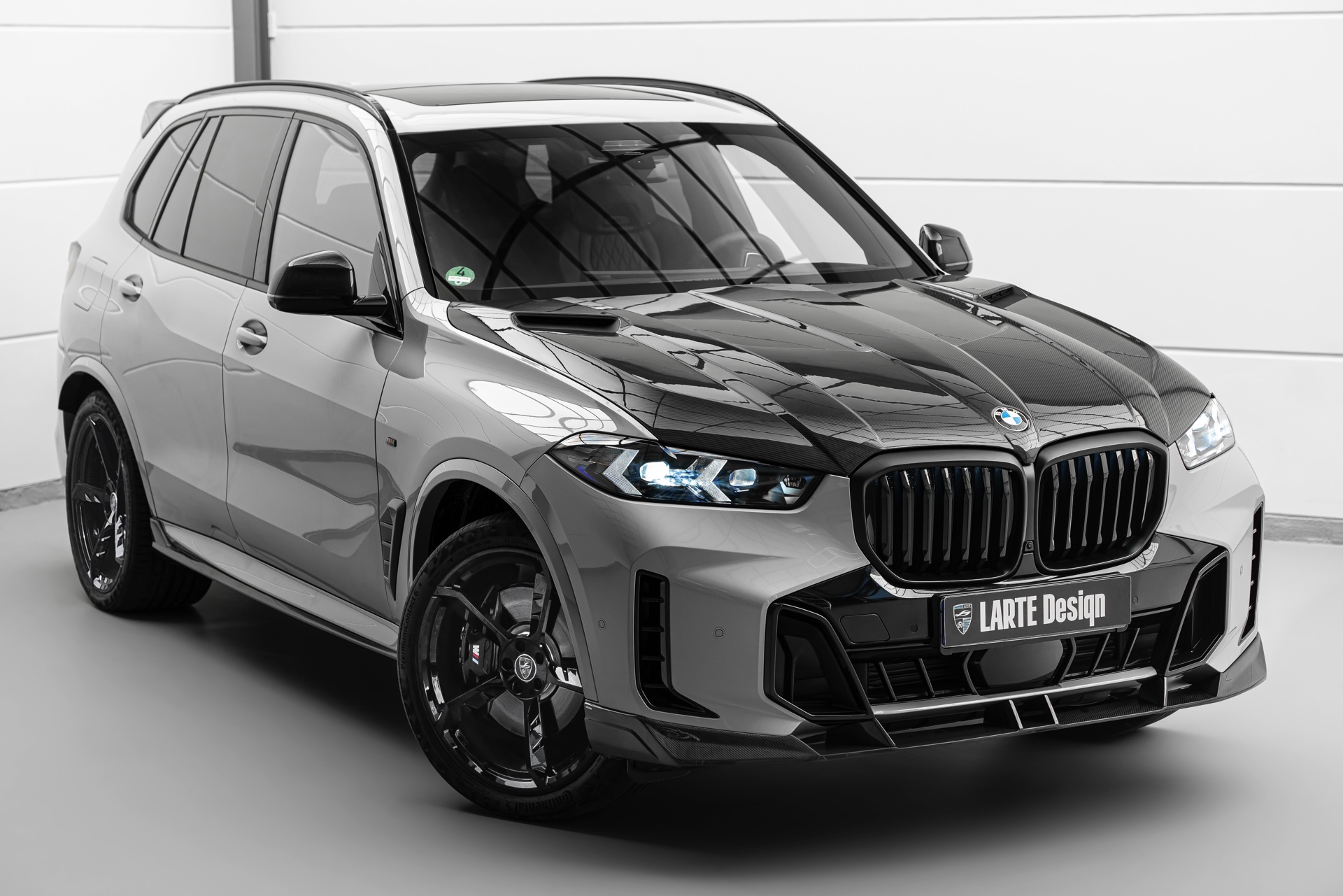 Der im vergangenen Jahr per Facelift aufgefrischte BMW X5 (G05 LCI) erhält nun auch das volle Tuning-Programm von Larte Performance. Dem Auftritt des Edel-SUV wird dabei mit einem zehnteiligen Tuning-Kit unter die Arme gegriffen, sodass von dezentem Understatement wahrlich keine Rede mehr sein kann – und das ganz unabhängig von der Motorisierung. Die ohnehin markante Front mit ihrem neuen Tagfahrlicht erhält per Carbon-Motorhaube und Frontsplitter-Aufsatz einen deutlich sportlicheren Touch, außerdem bietet Larte auf Wunsch auch Carbon-Nieren an.