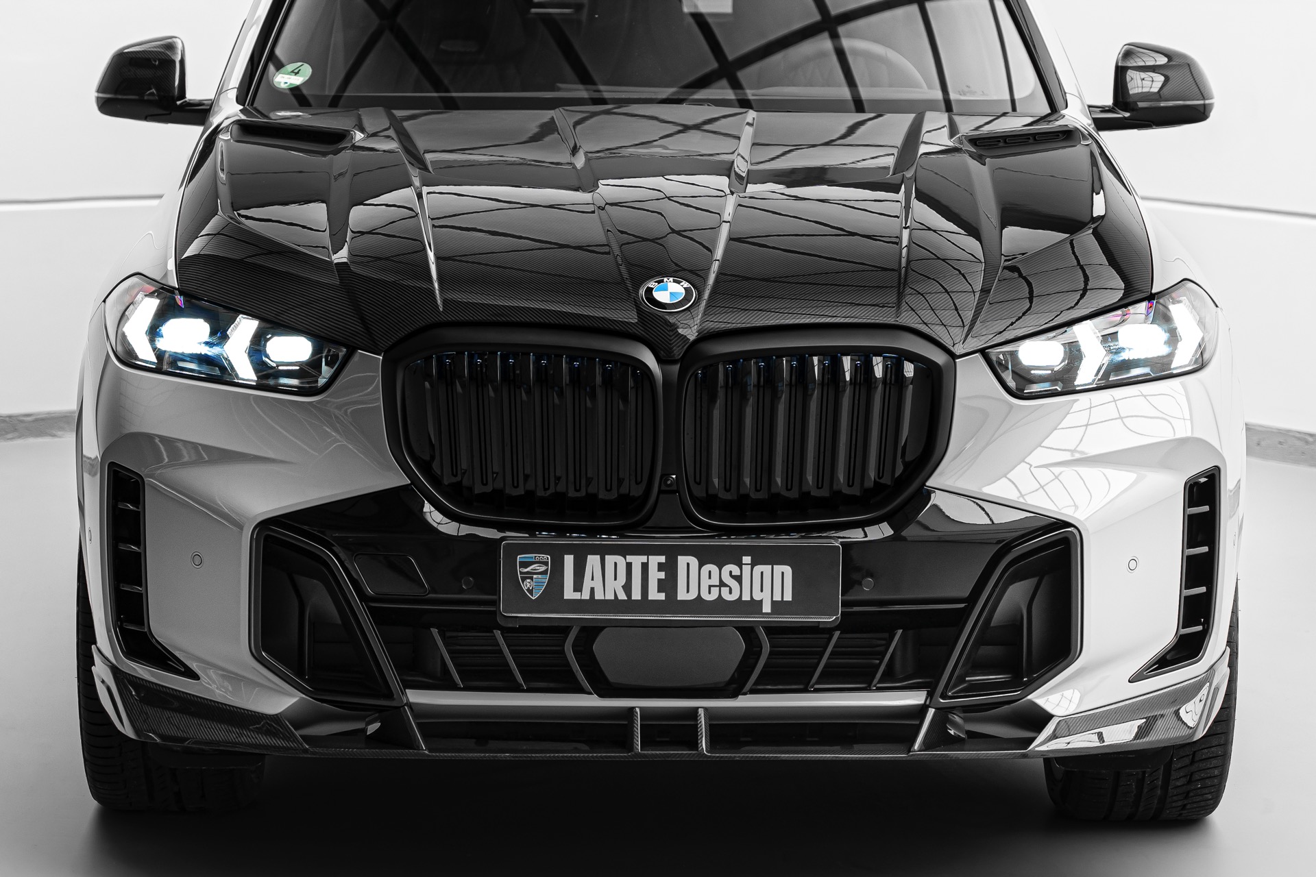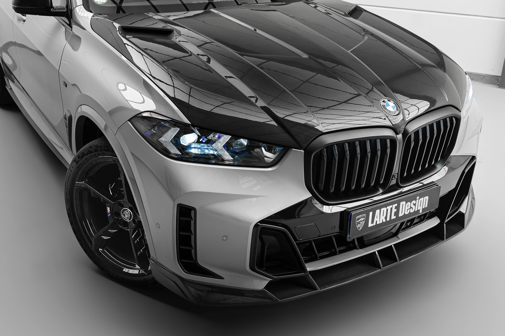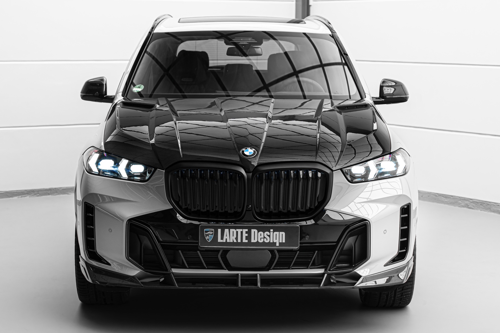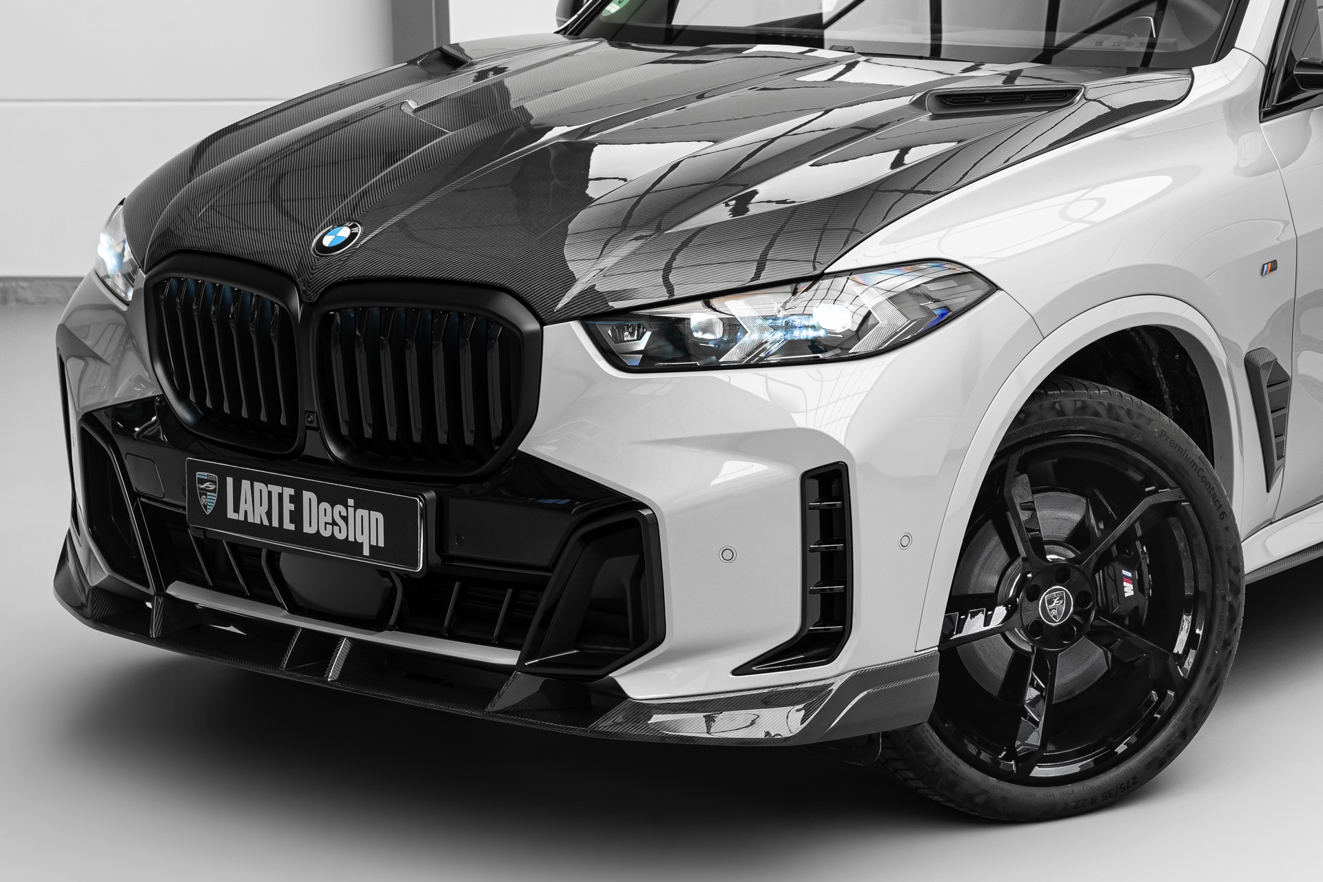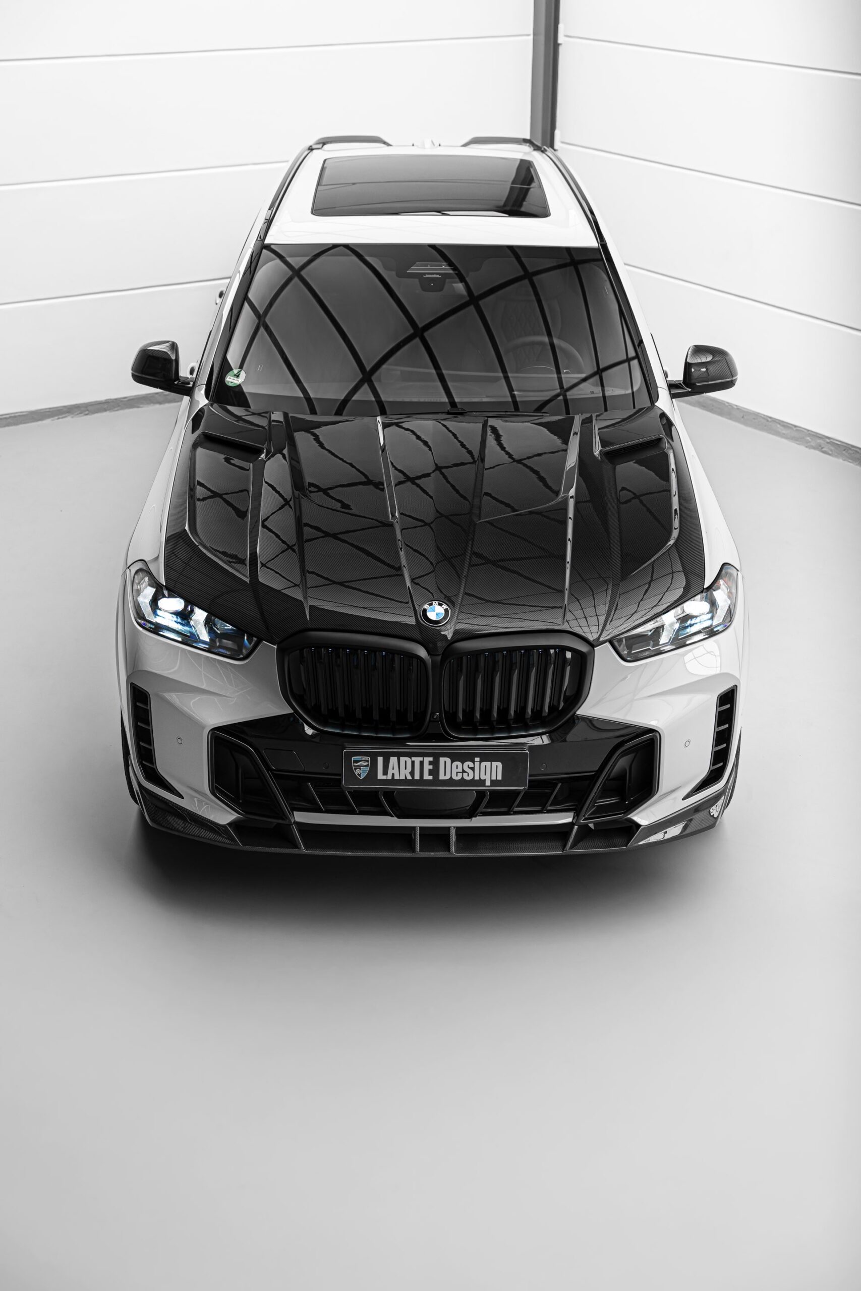 Der im vergangenen Jahr per Facelift aufgefrischte BMW X5 (G05 LCI) erhält nun auch das volle Tuning-Programm von Larte Performance. Dem Auftritt des Edel-SUV wird dabei mit einem zehnteiligen Tuning-Kit unter die Arme gegriffen, sodass von dezentem Understatement wahrlich keine Rede mehr sein kann – und das ganz unabhängig von der Motorisierung. Die ohnehin markante Front mit ihrem neuen Tagfahrlicht erhält per Carbon-Motorhaube und Frontsplitter-Aufsatz einen deutlich sportlicheren Touch, außerdem bietet Larte auf Wunsch auch Carbon-Nieren an.