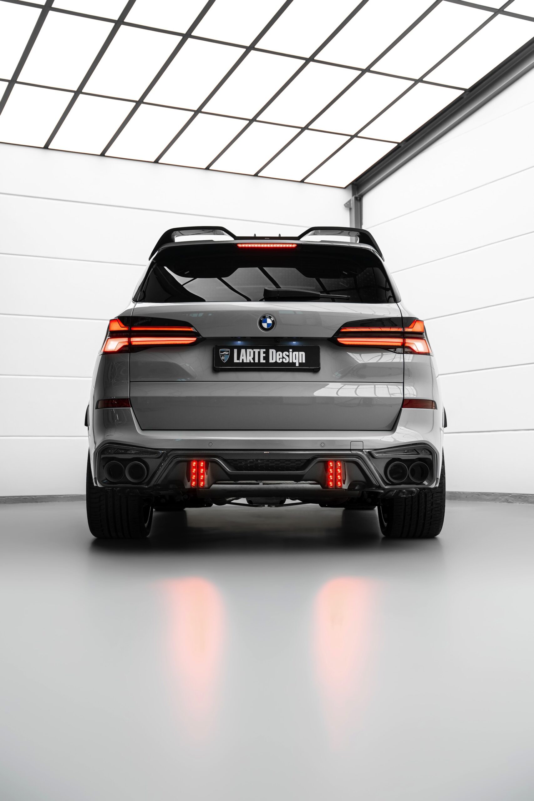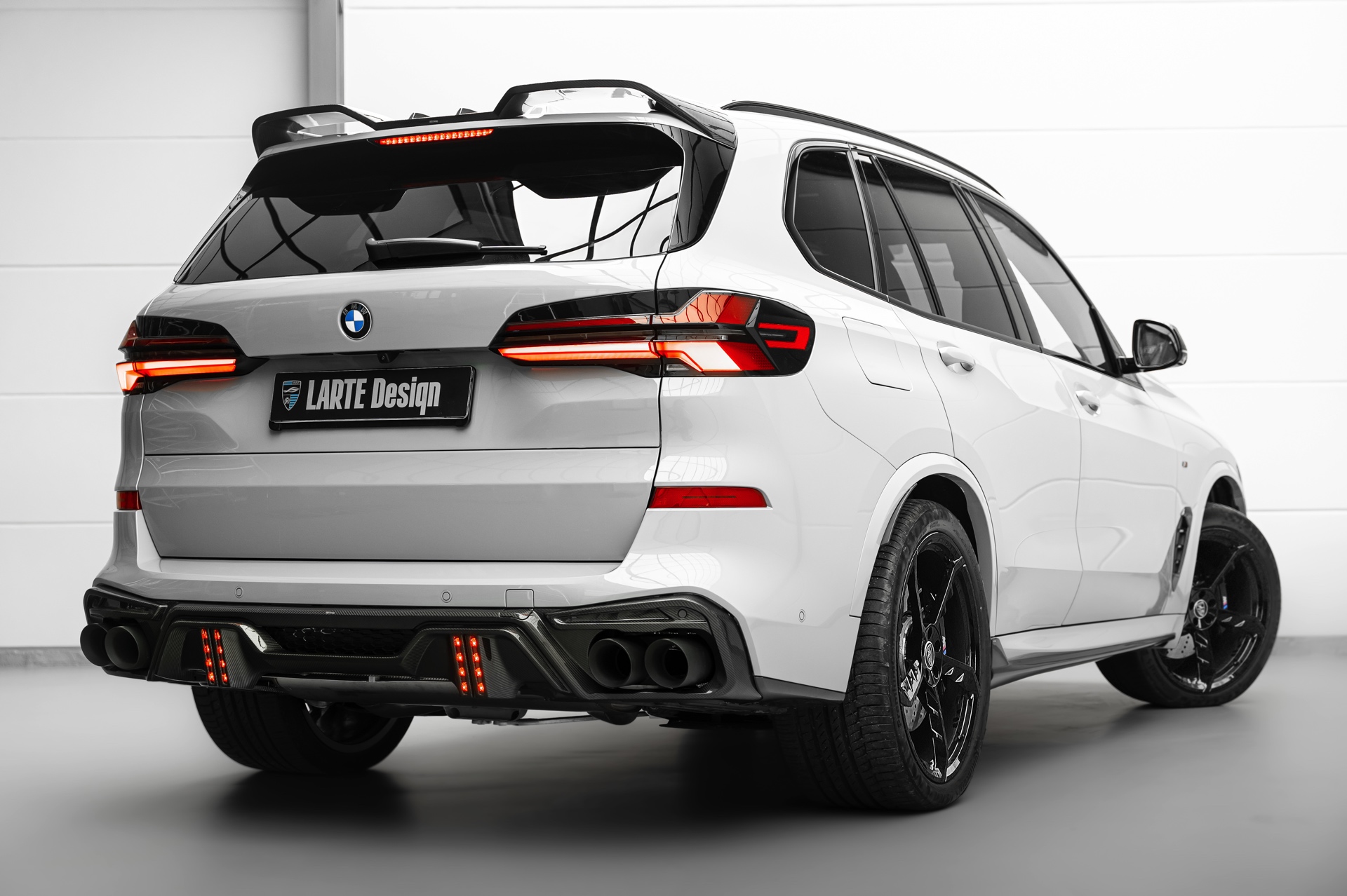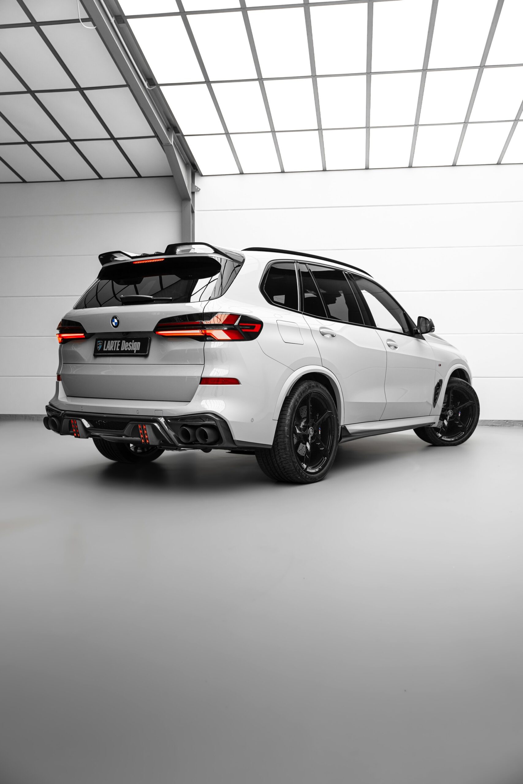 Highlight am Heck ist der große Diffusor-Einsatz, in den wie im Motorsport zusätzliche Bremslichter integriert sind. Larte verspricht, dass sämtliche Sensoren weiter wie gewohnt funktionieren und auch die Anhängerkupplung weiter genutzt werden kann. Ergänzend dazu gibt es eine modifizierte Abgasanlage mit vier runden Endrohr-Blenden und einen großen, mittig abgesenkten Dachkanten-Spoiler, der das BMW X5 Facelift mit Larte-Bodykit auch aus größerer Entfernung deutlich von der Serie abhebt. Eine zweite, deutlich dezentere Spoilerlippe kann direkt unterhalb der Heckscheibe montiert werden.