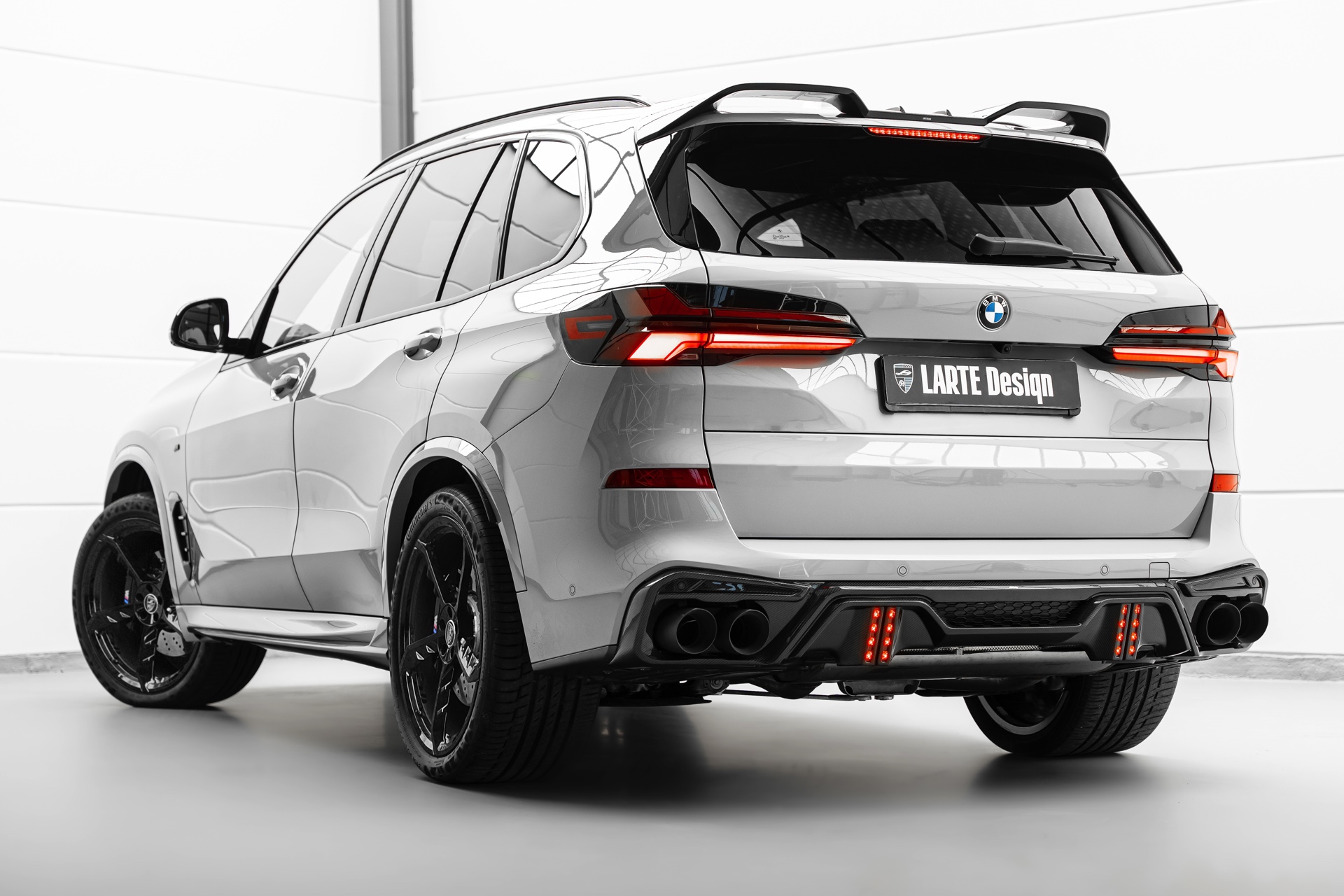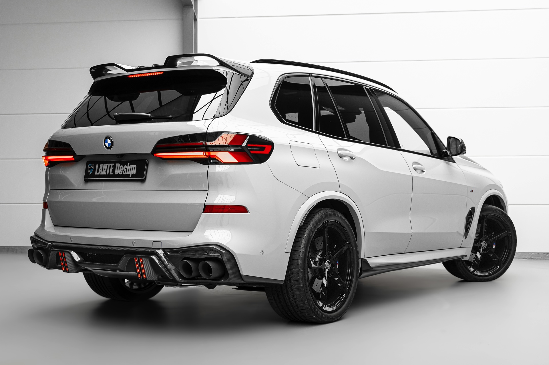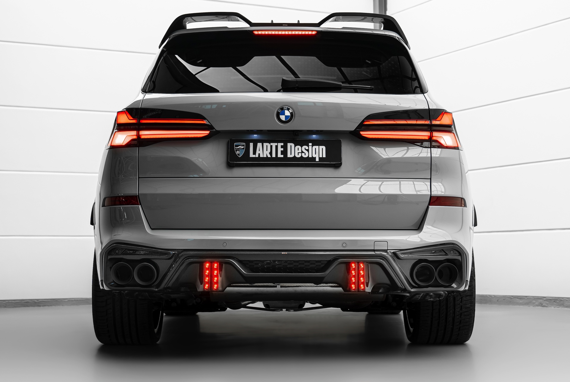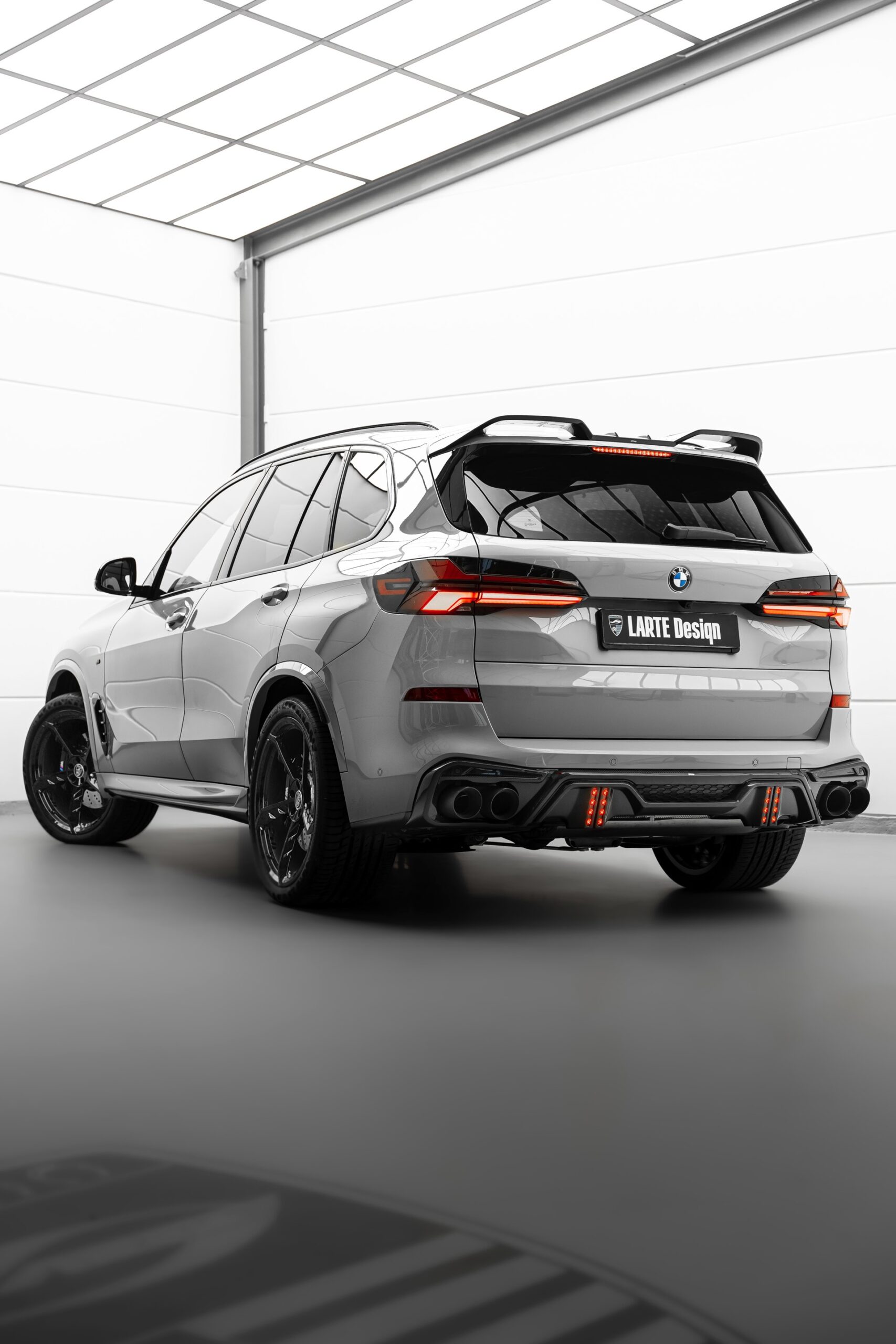 Highlight am Heck ist der große Diffusor-Einsatz, in den wie im Motorsport zusätzliche Bremslichter integriert sind. Larte verspricht, dass sämtliche Sensoren weiter wie gewohnt funktionieren und auch die Anhängerkupplung weiter genutzt werden kann. Ergänzend dazu gibt es eine modifizierte Abgasanlage mit vier runden Endrohr-Blenden und einen großen, mittig abgesenkten Dachkanten-Spoiler, der das BMW X5 Facelift mit Larte-Bodykit auch aus größerer Entfernung deutlich von der Serie abhebt. Eine zweite, deutlich dezentere Spoilerlippe kann direkt unterhalb der Heckscheibe montiert werden.