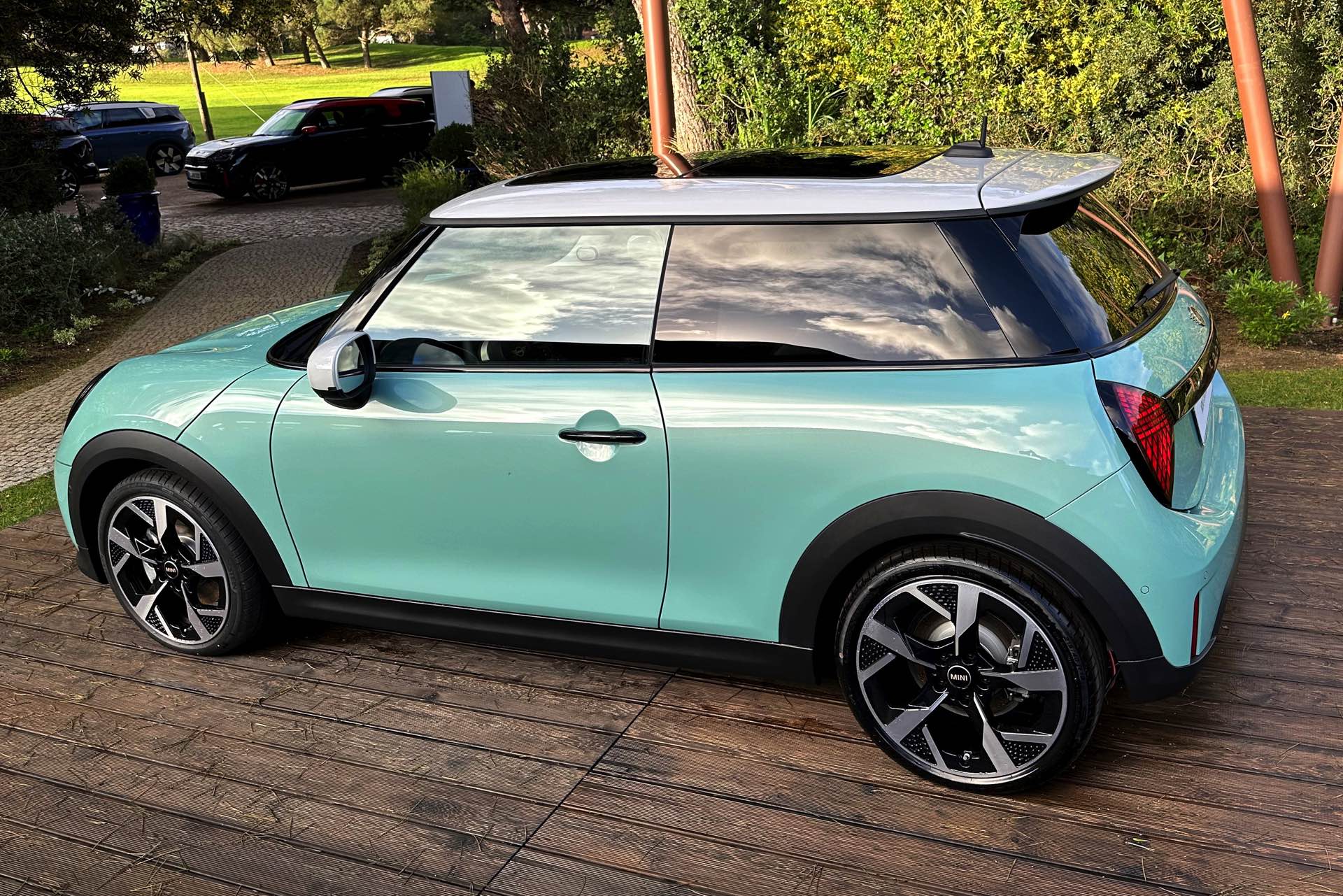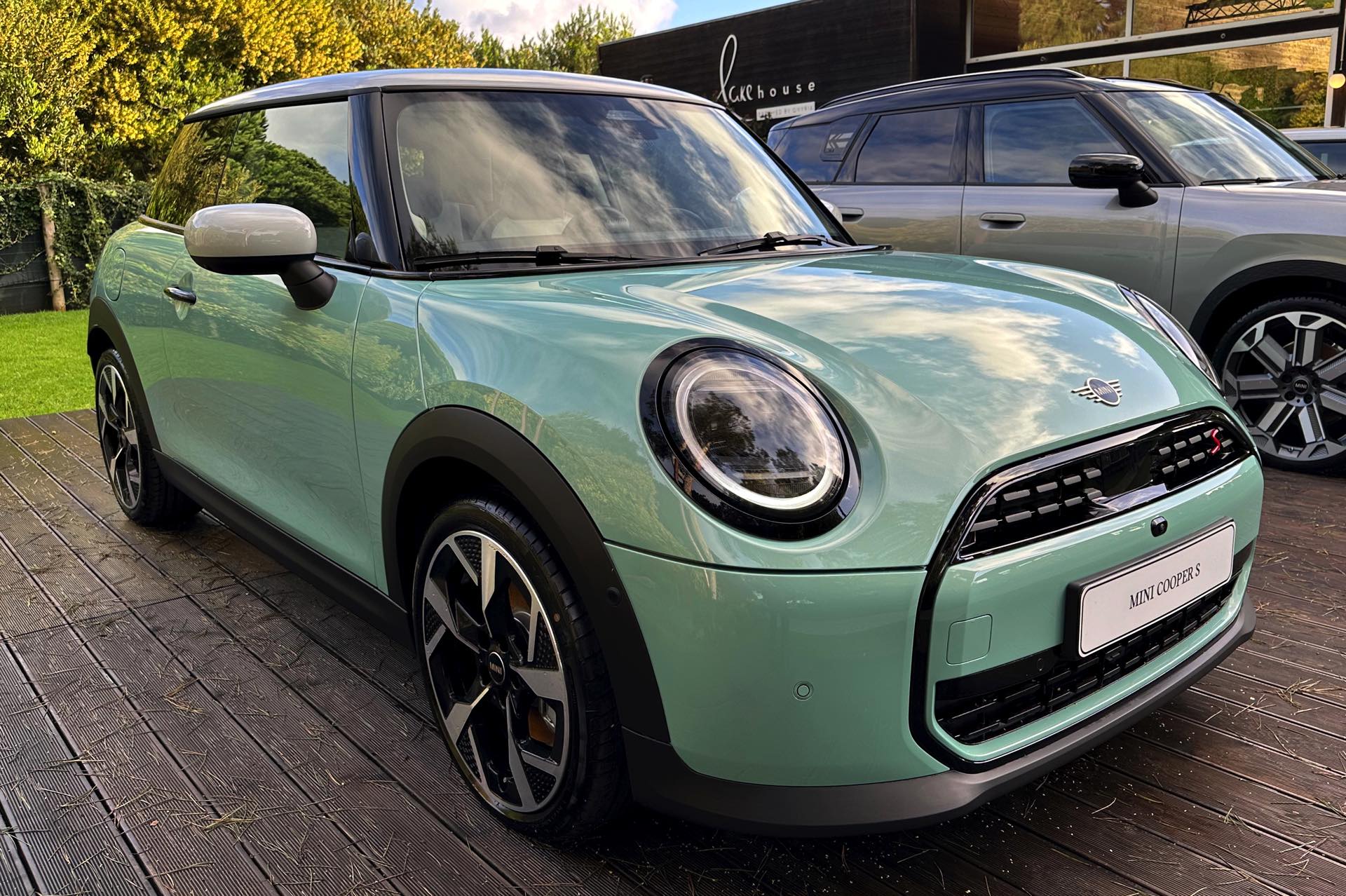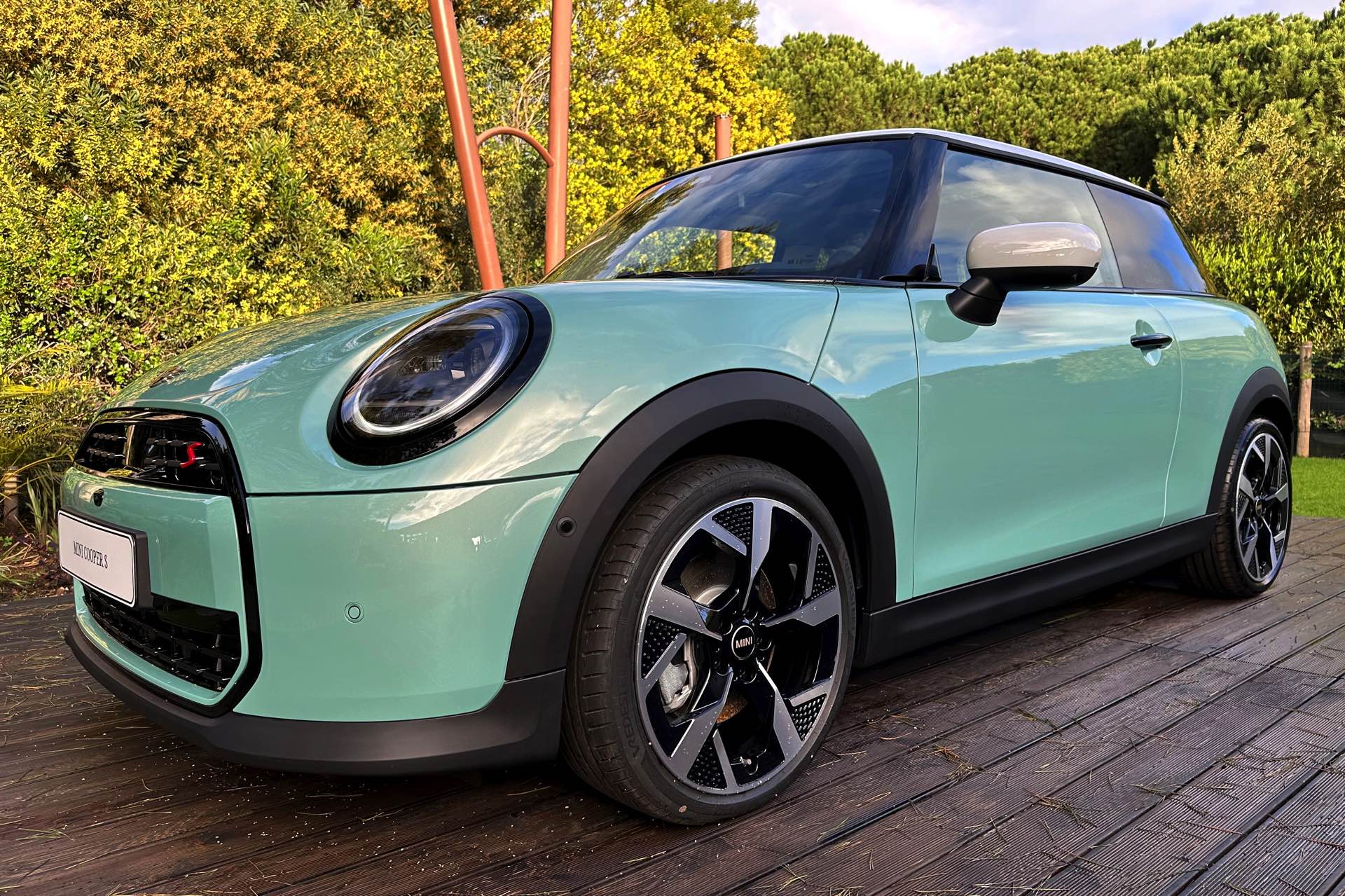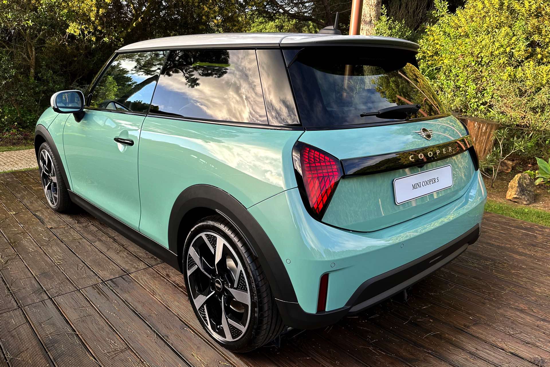 Die Lackierung in Ocean Wave Green ist derzeit nur in Kombination mit dem Favoured Trim erhältlich und kostet 600 Euro Aufpreis, den gleichen Zuschlag nimmt MINI auch für die gezeigten 18 Zoll-Felgen. Auch dank der weißen Kontrastlackierung für Dach und Spiegelkappen ergibt sich ein frischer Look, der sehr gut zu einem jungen Auftritt im urbanen Umfeld passt.