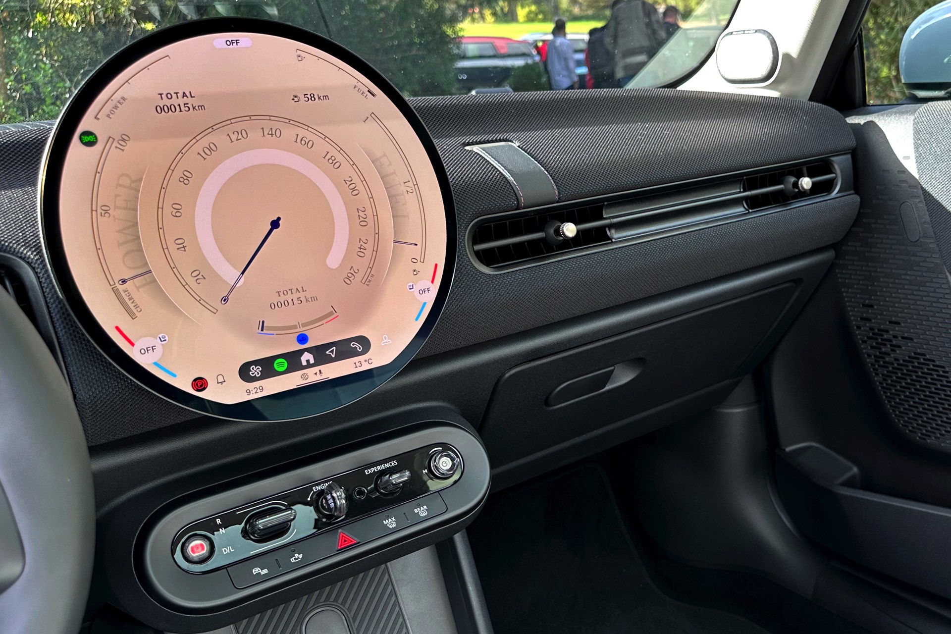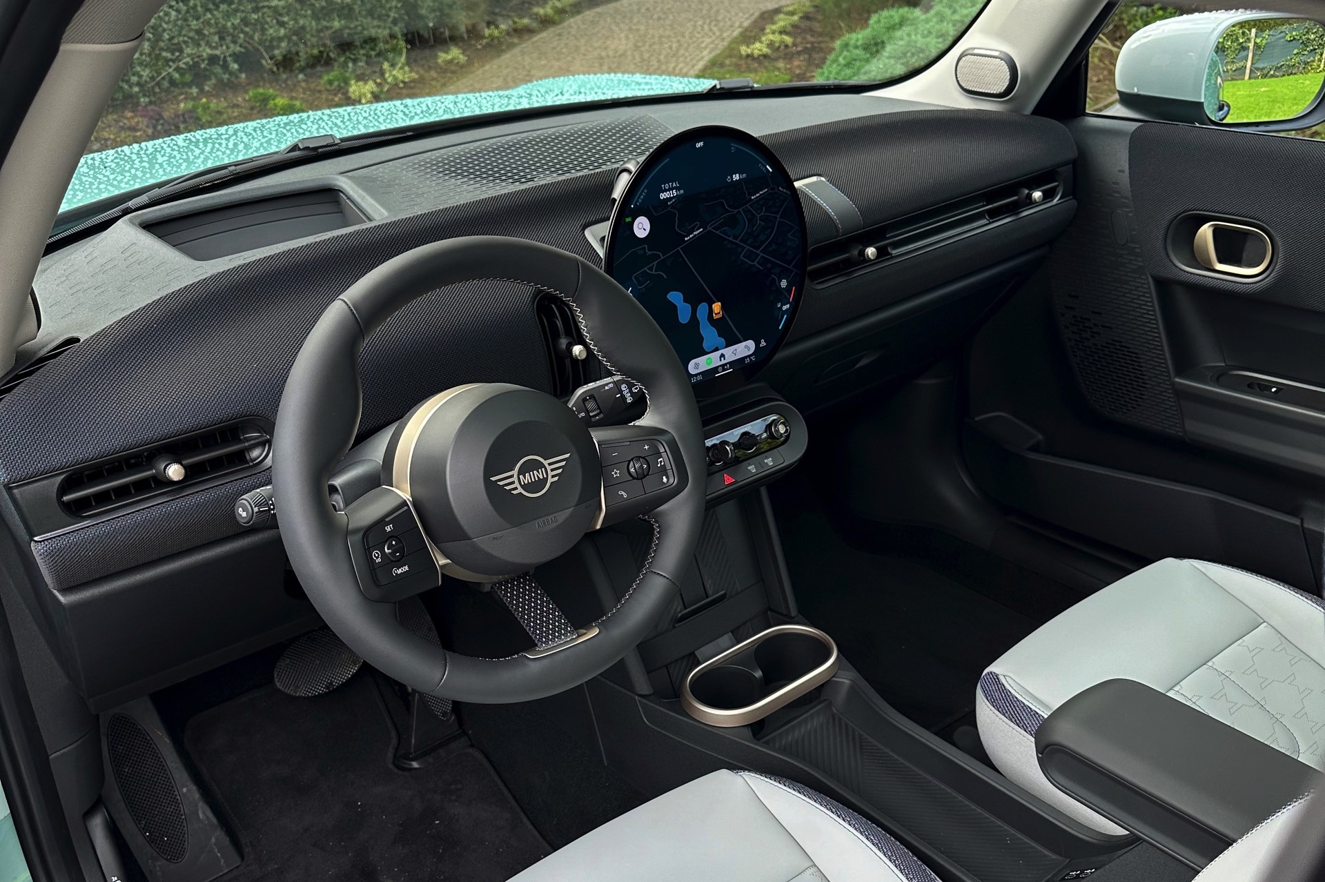 Gründlich umgestaltet wurde auch der Innenraum des neuen MINI Cooper (F66): Genau wie im J01 oder auch im neuen Countryman (U25) dominiert ein kreisrundes OLED-Display die mit Textilien bespannte Instrumententafel, darauf arbeitet das neue Operating System 9 auf Android-Basis. Die Sitze mit Bezug in Vescin Beige verzichten auf tierisches Leder.