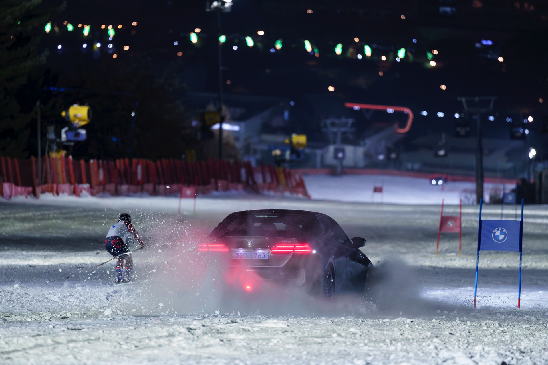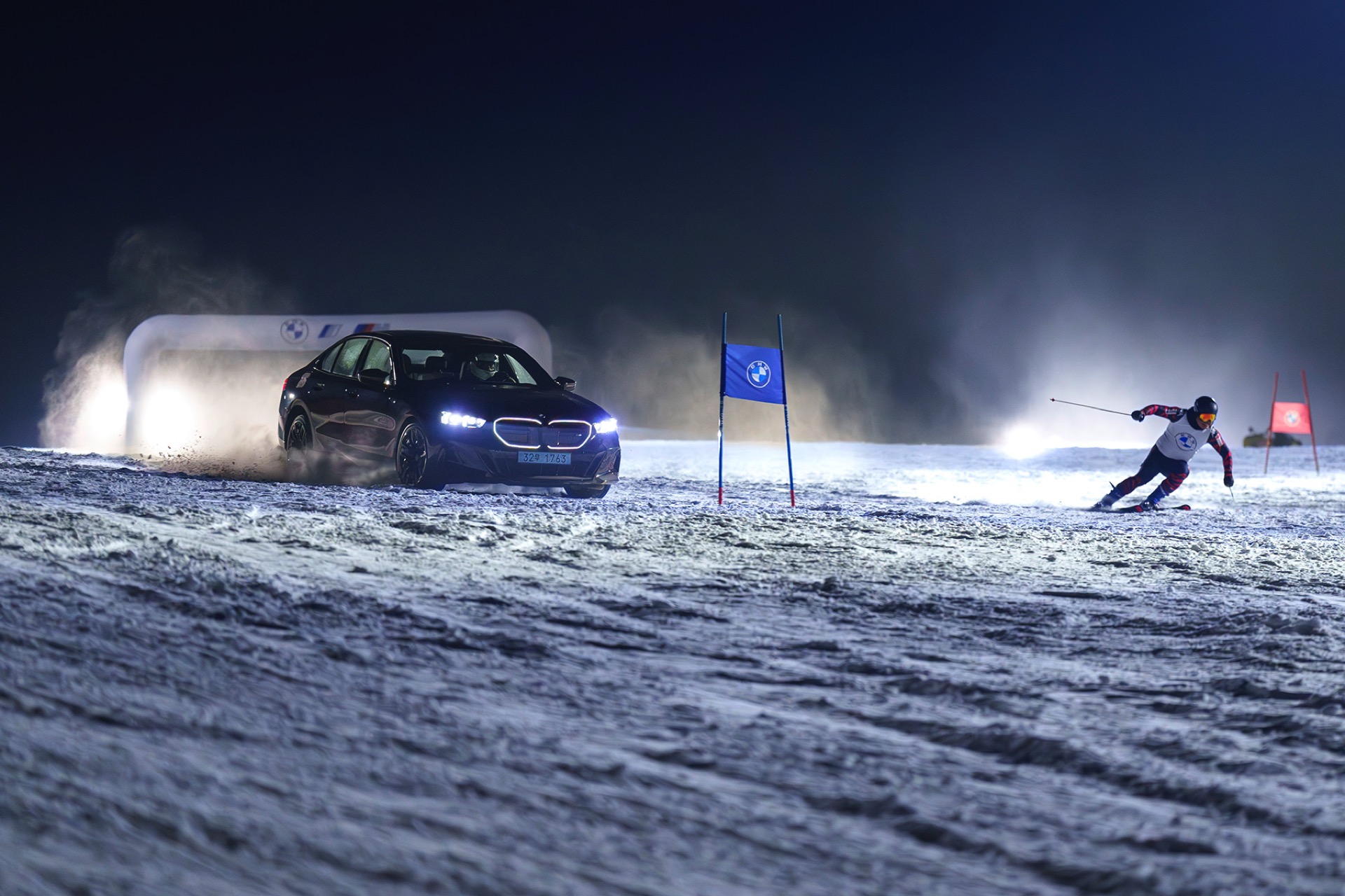 Auf der 900 Meter langen und als mittelschwer eingestuften Strecke ‘Jazz’ starteten die beiden Koreaner Seite an Seite und nahmen bei einem Gefälle von meist deutlich über 20 Grad rasend schnell Fahrt auf. Während der über 2,3 Tonnen schwere BMW i5 M60 dabei auf die Kraft von 601 PS und 820 Newtonmeter Drehmoment setzen konnte, musste der auch mit voller Ausrüstung über zwei Tonnen leichtere Beom-Hee Cho allein auf Muskelkraft setzen. "