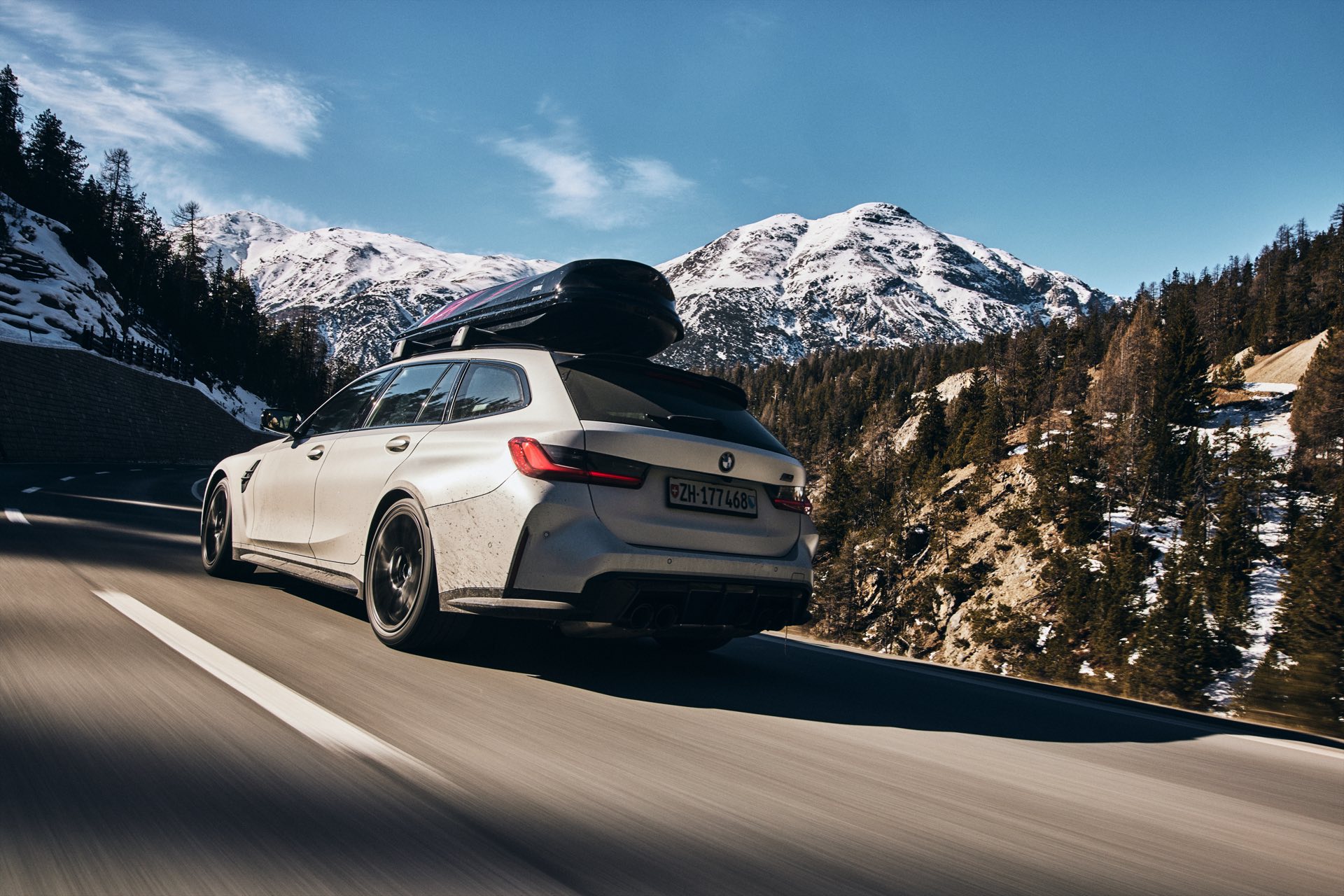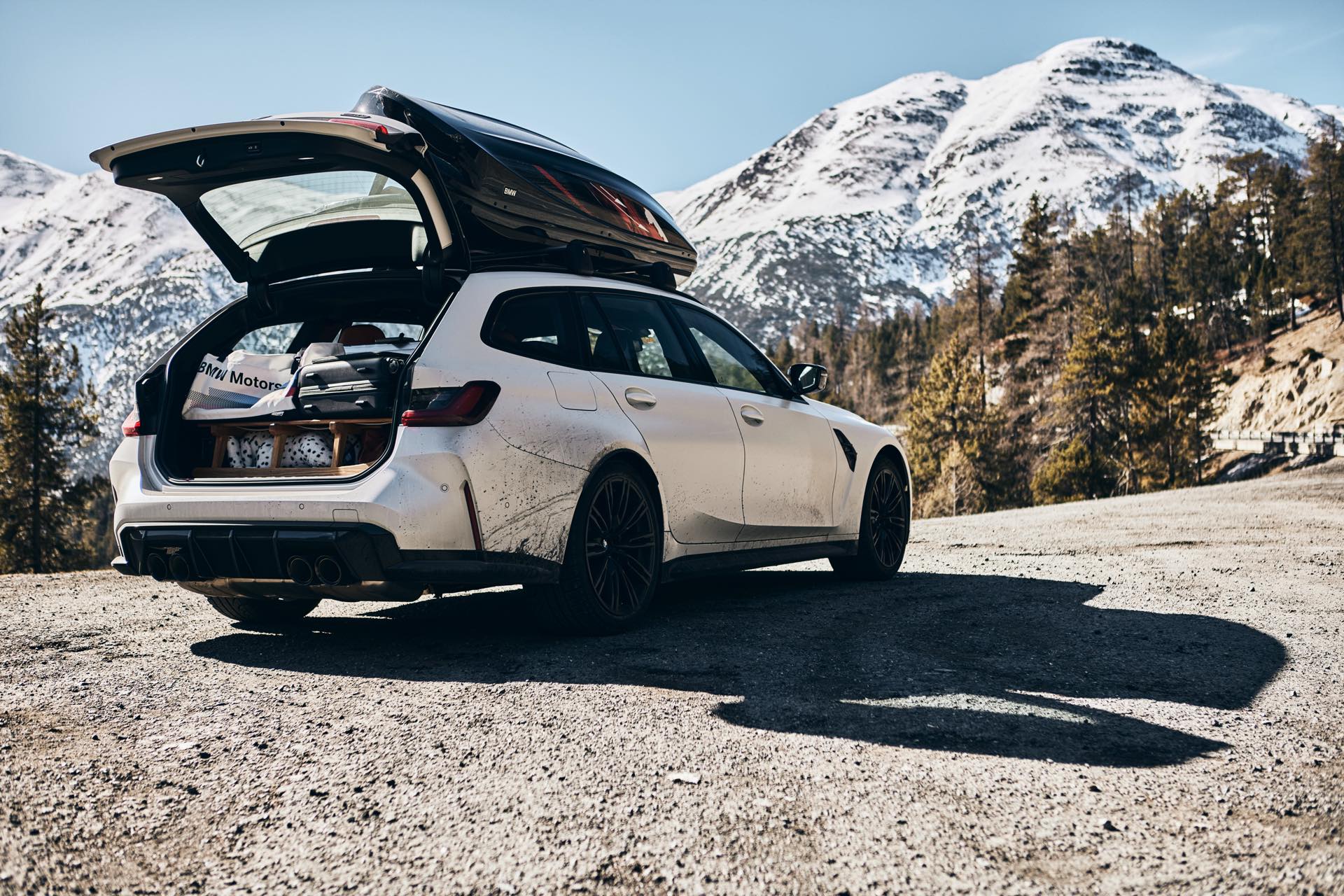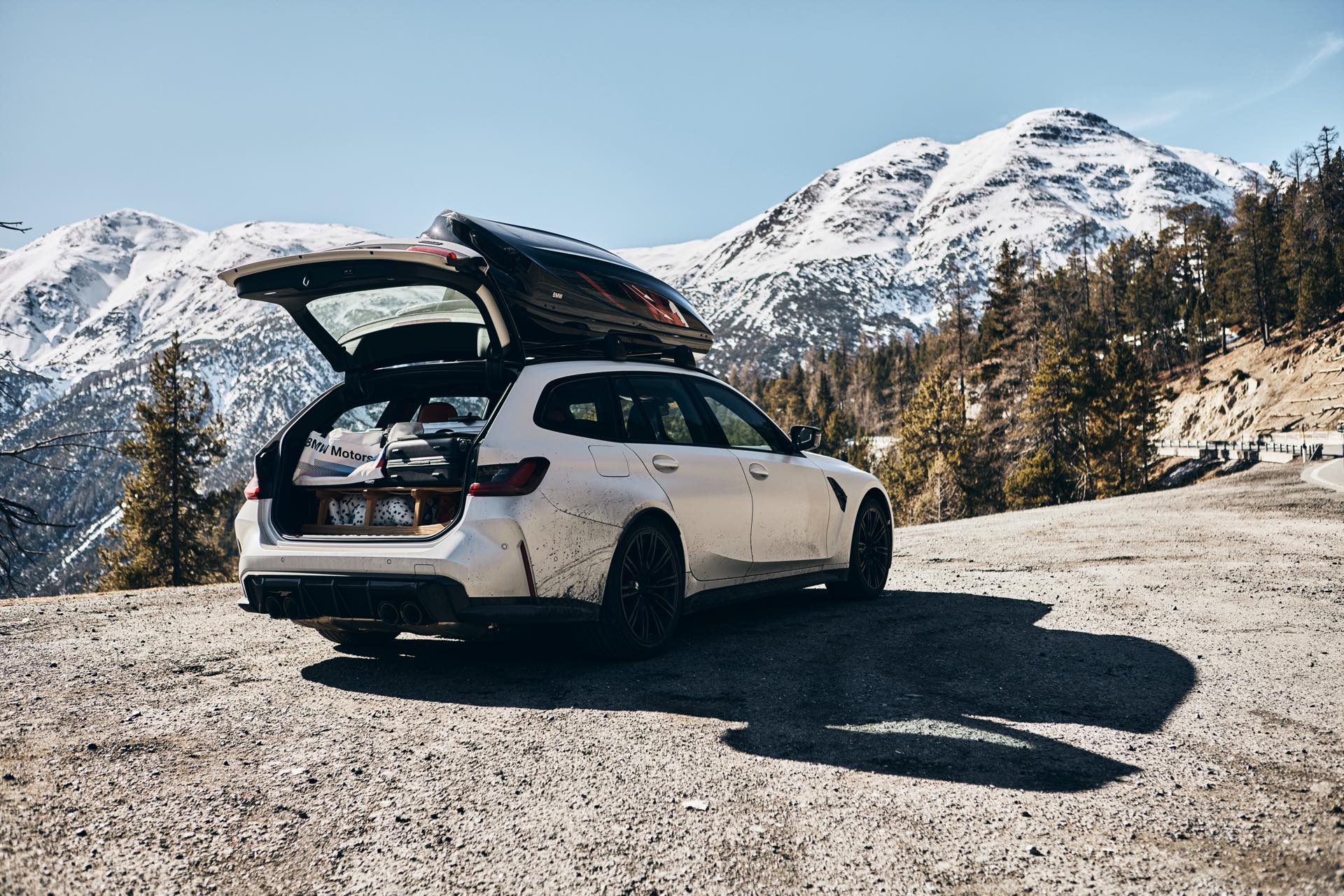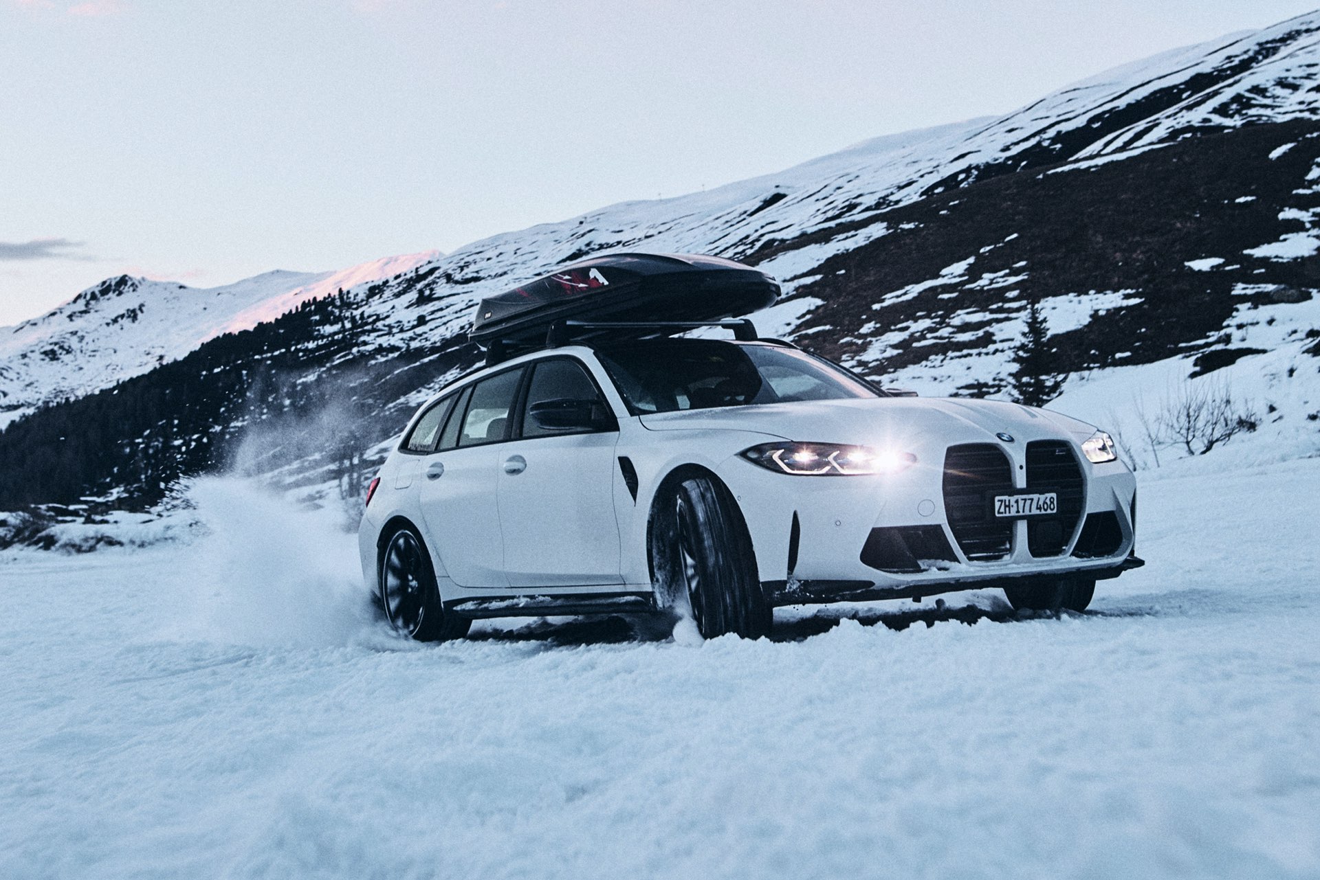 Auch BMW Schweiz präsentierte den BMW M3 Touring bereits mit Dachbox im tiefen Schnee, doch mit einer Lackierung in Weiß ist der Kontrast zur Landschaft naturgemäß überschaubar und die Bilder wirken nicht ganz so farbenfroh: