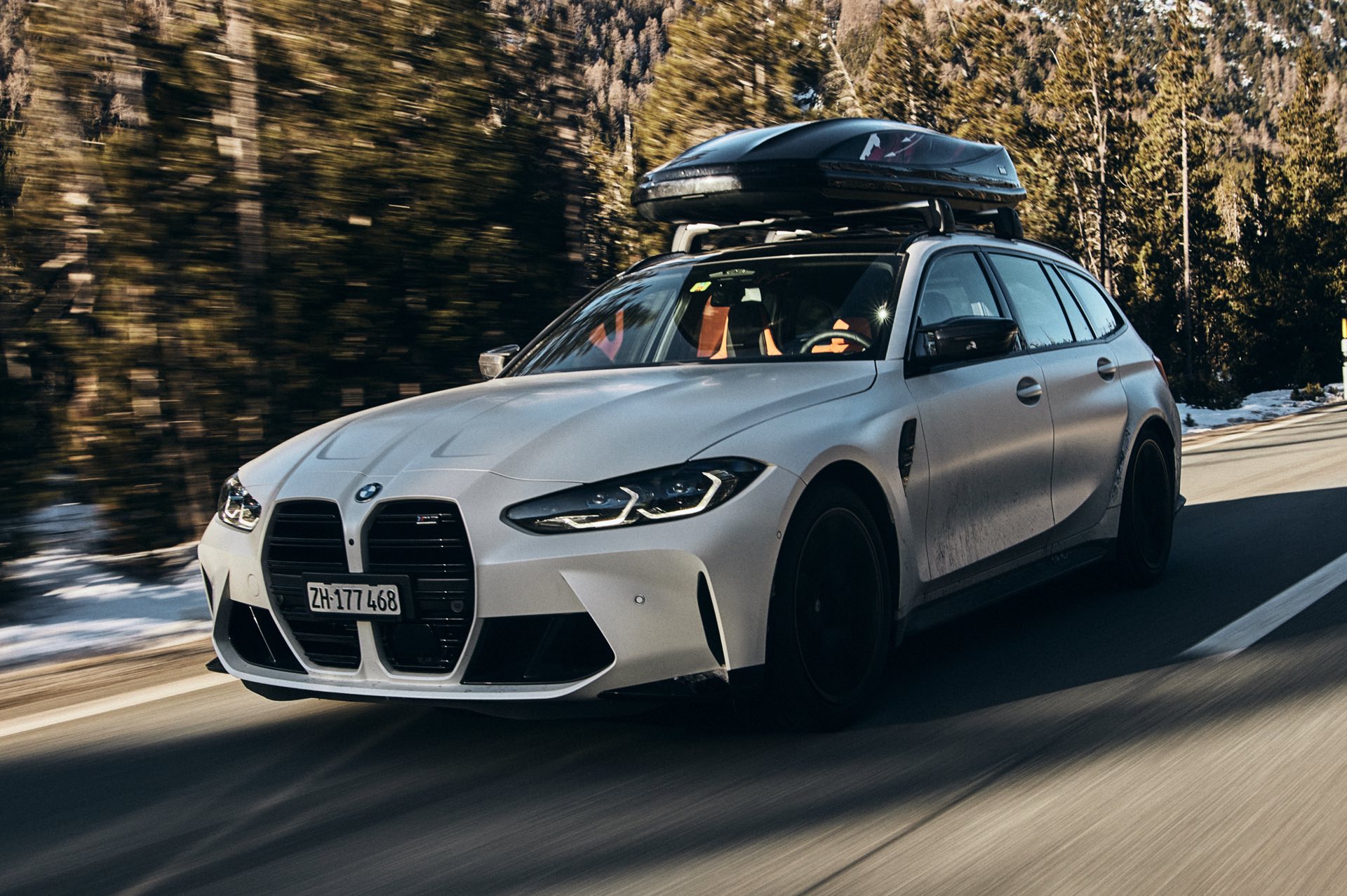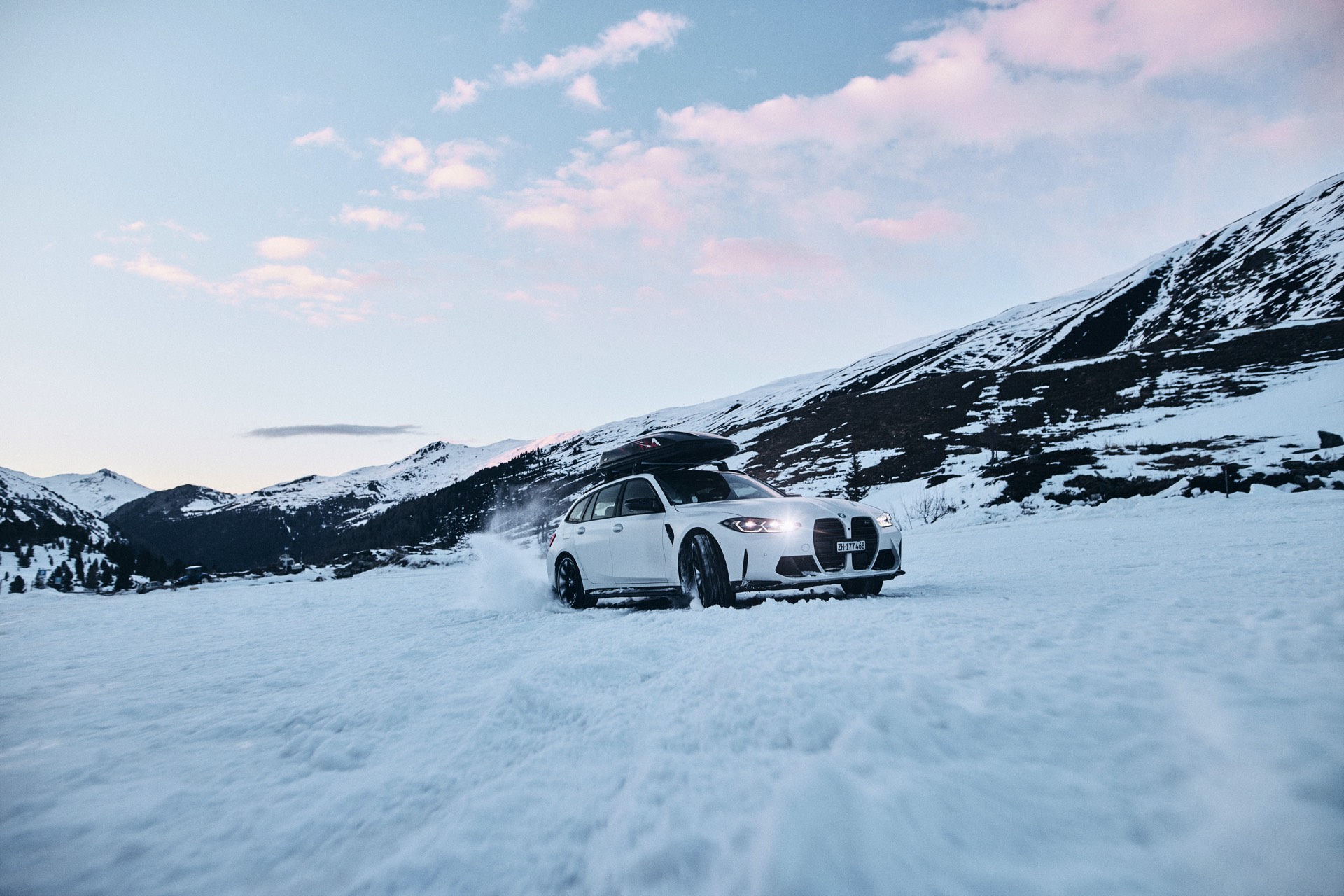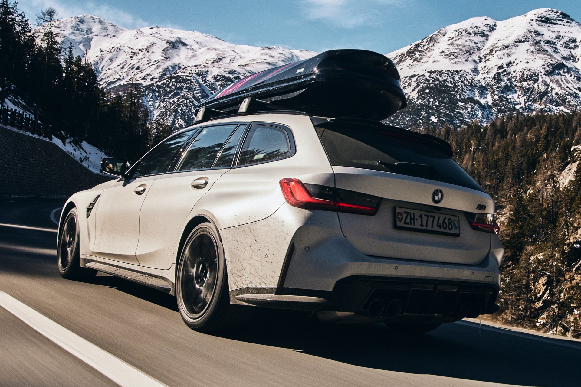 Auch BMW Schweiz präsentierte den BMW M3 Touring bereits mit Dachbox im tiefen Schnee, doch mit einer Lackierung in Weiß ist der Kontrast zur Landschaft naturgemäß überschaubar und die Bilder wirken nicht ganz so farbenfroh: