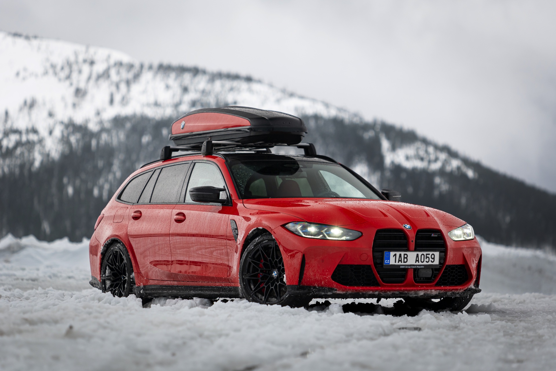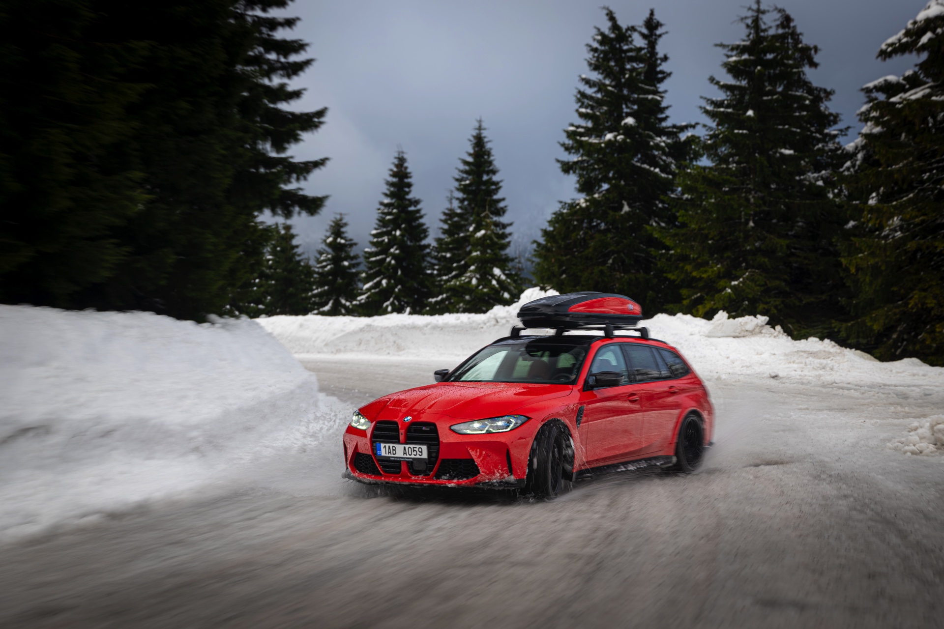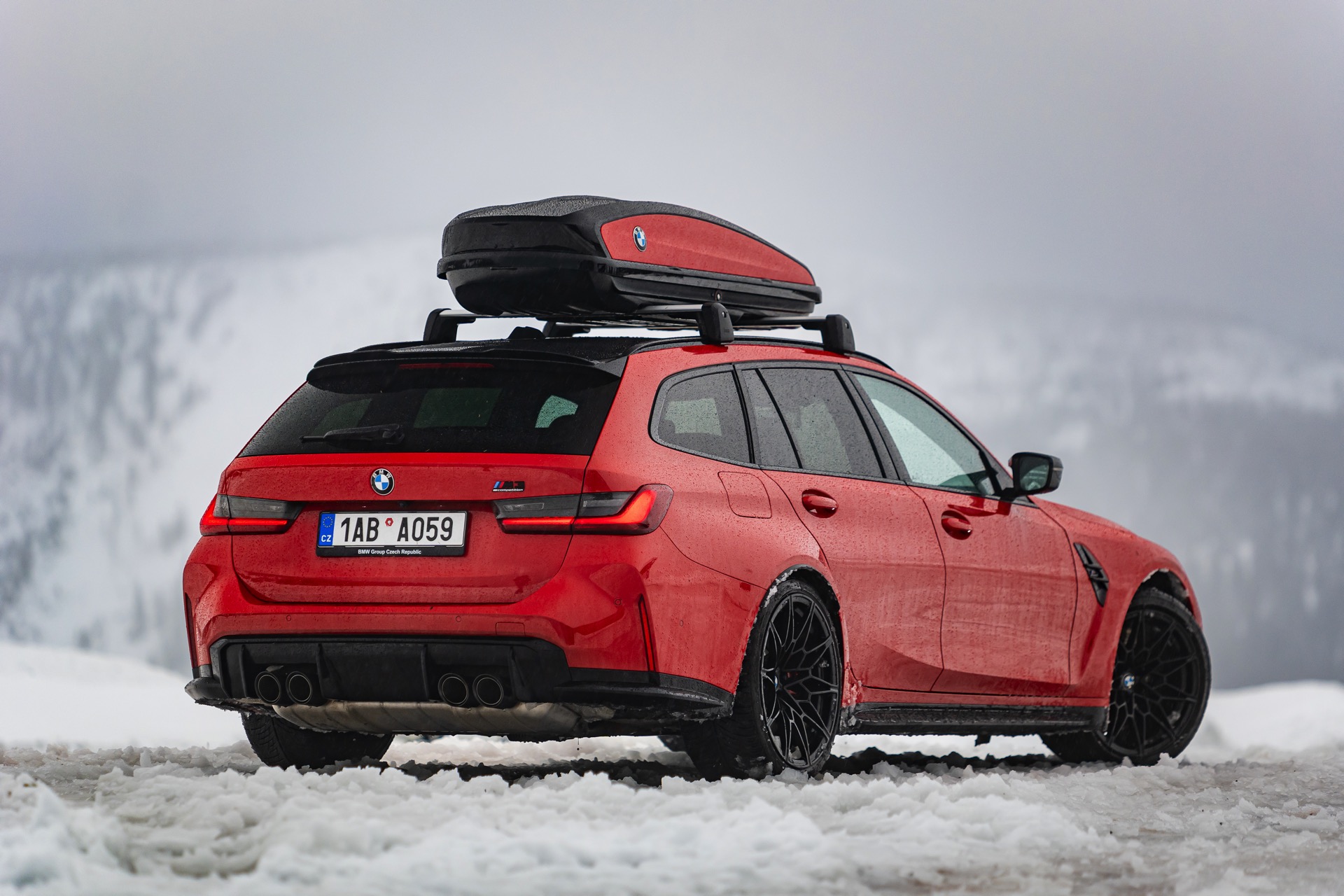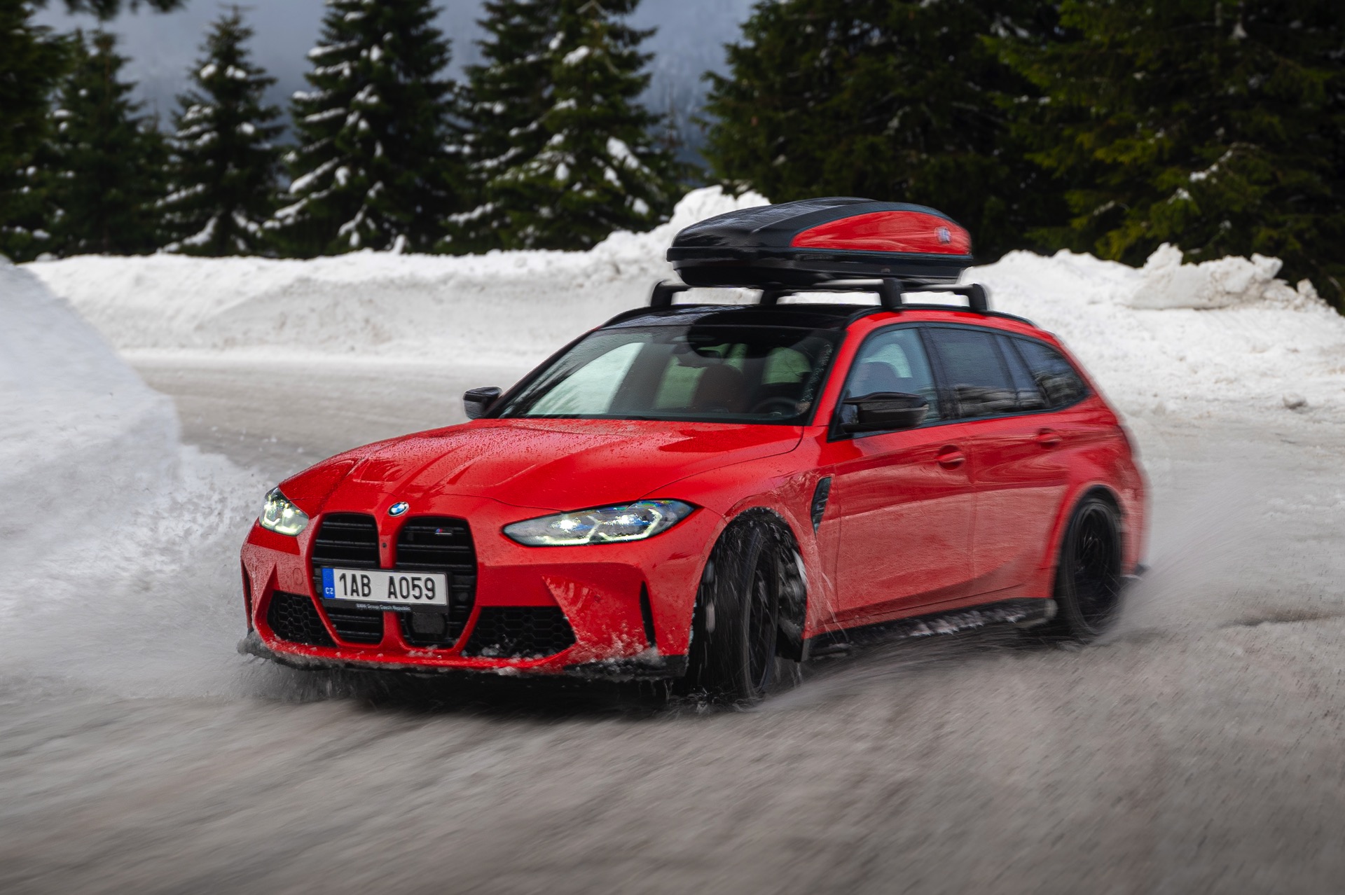 Wer auch nach dem langen Winter-Drift-Video von Matthias Malmedie noch nicht genug vom BMW M3 Touring (G81) im Schnee hat oder auf den bisherigen Aufnahmen eine praktische Dachbox vermisst hat, erhält nun Foto-Nachschub aus der Tschechischen Republik. Eine neue Foto-Serie zeigt uns den M3 Touring in Toronto Rot Metallic inmitten einer verschneiten Landschaft – und das bei durchaus engagierter Gangart mit ansehnlichem Driftwinkel. Ein besonderer Hingucker findet sich auf dem Dach des Power-Kombis, denn der gezeigte M3 trägt eine Dachbox aus dem BMW Zubehör-Programm.