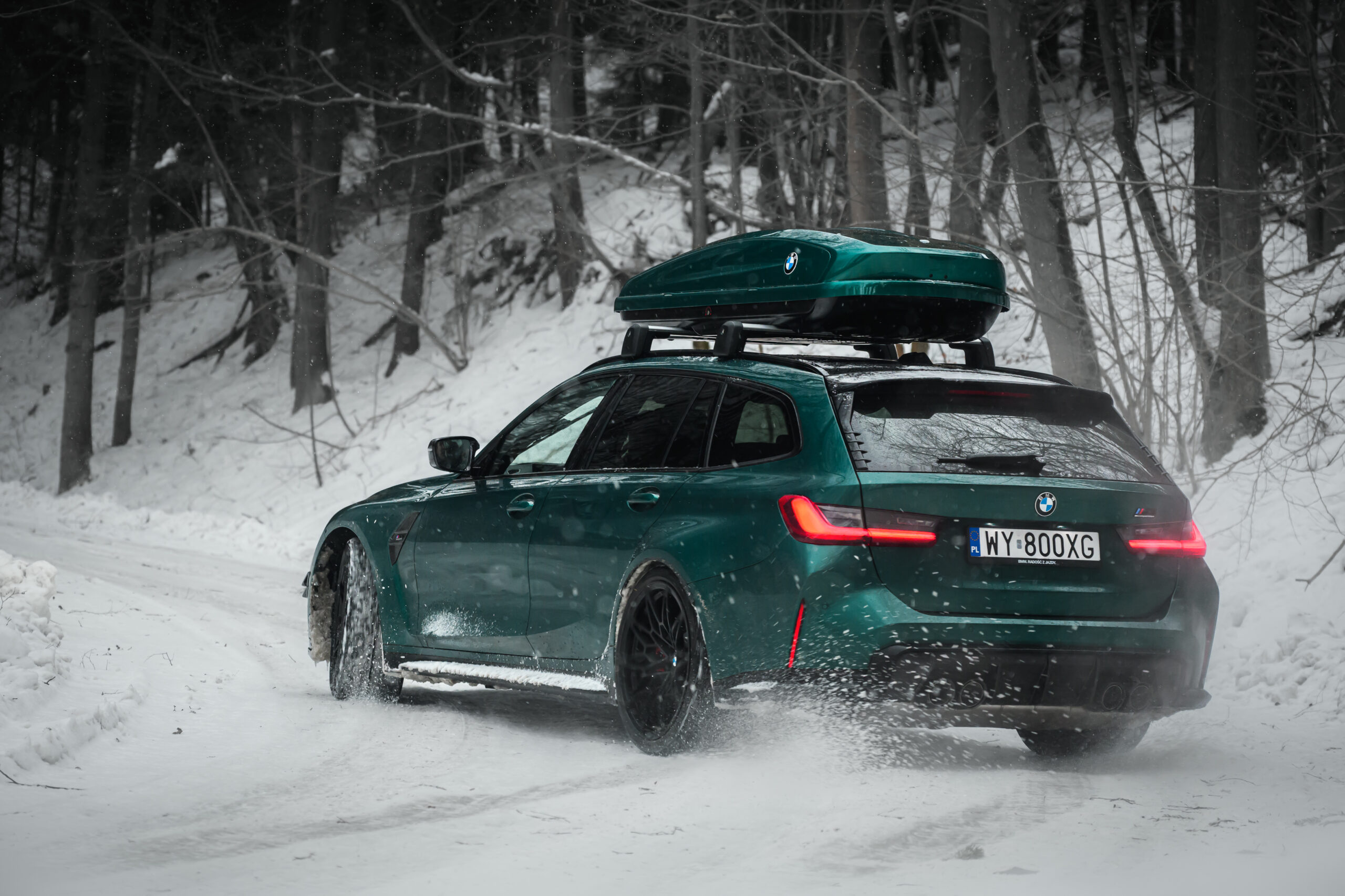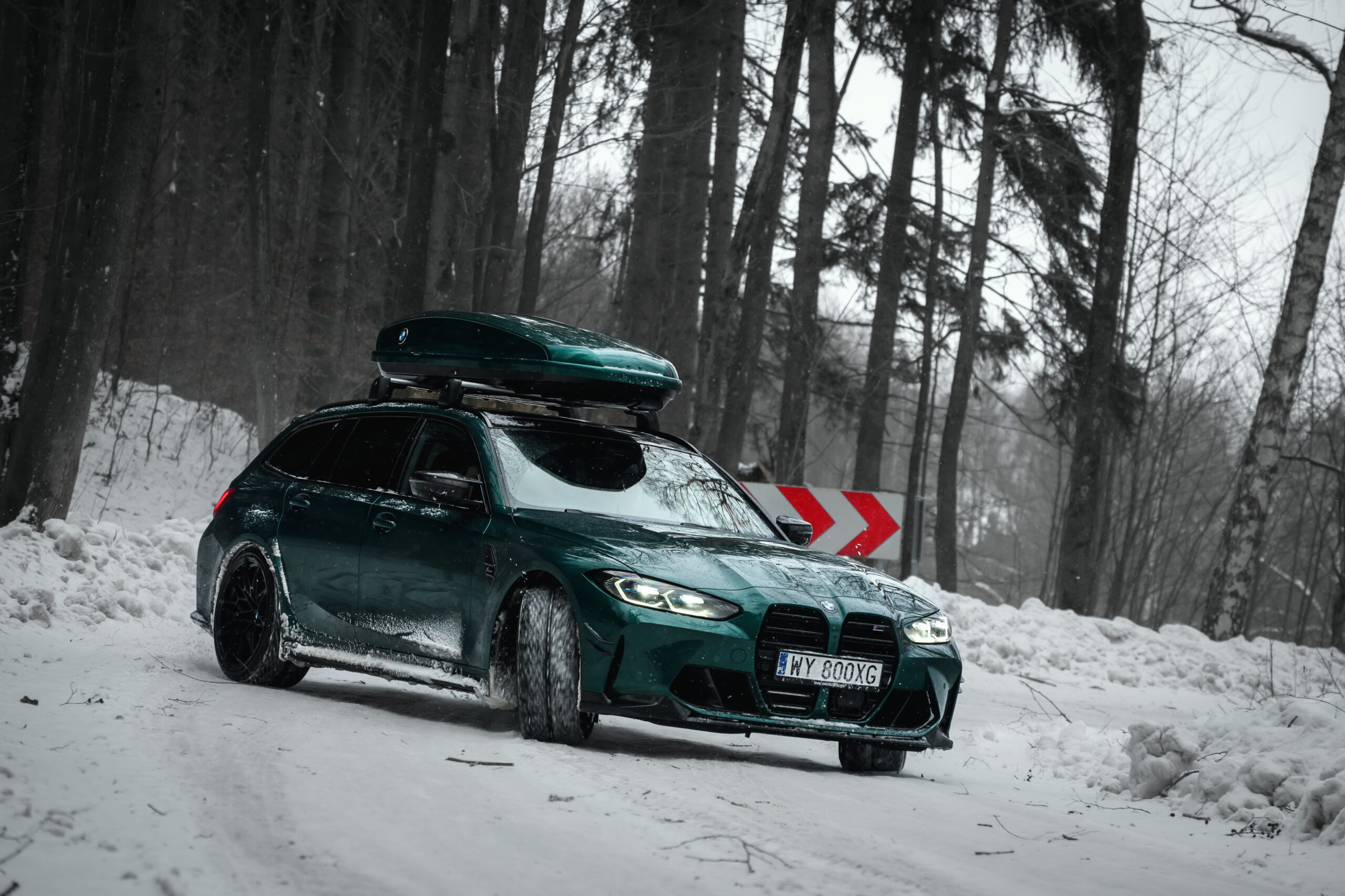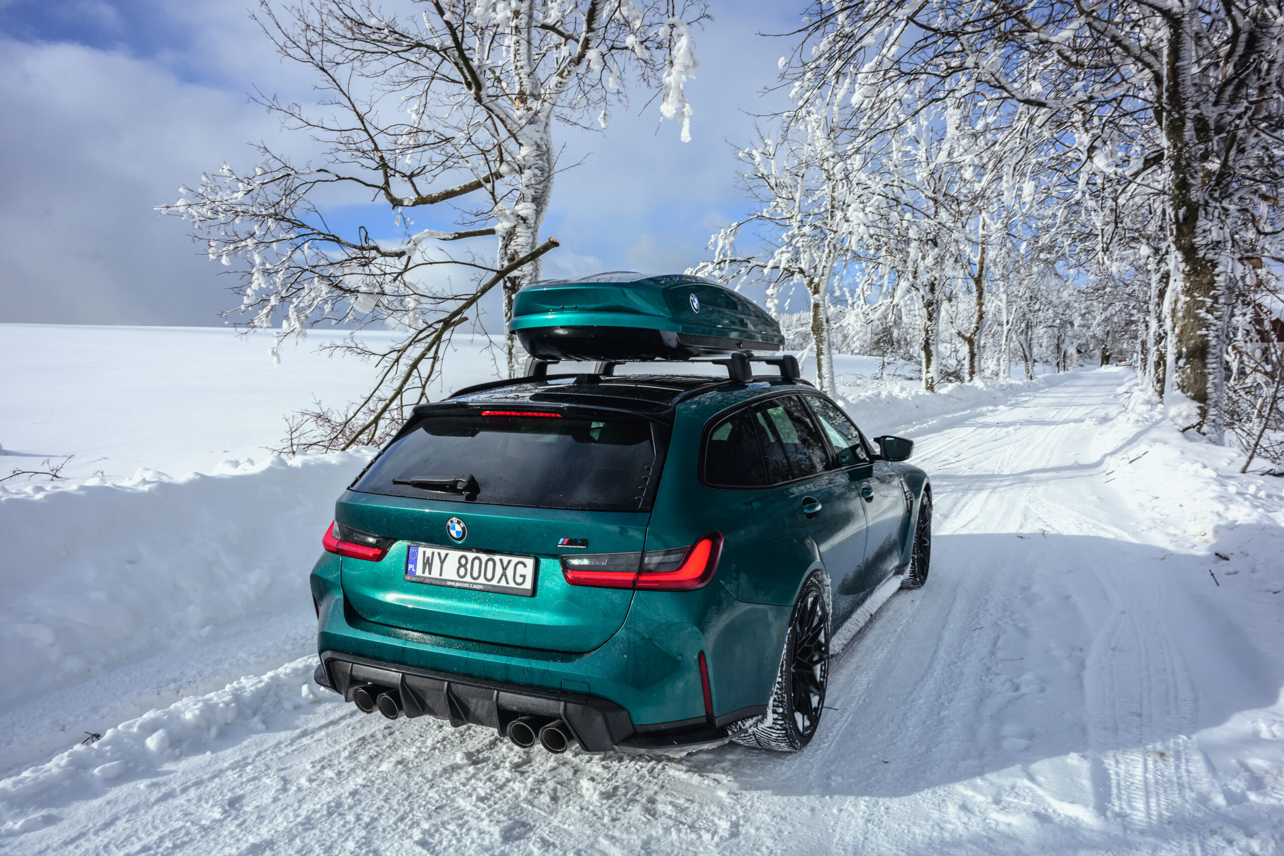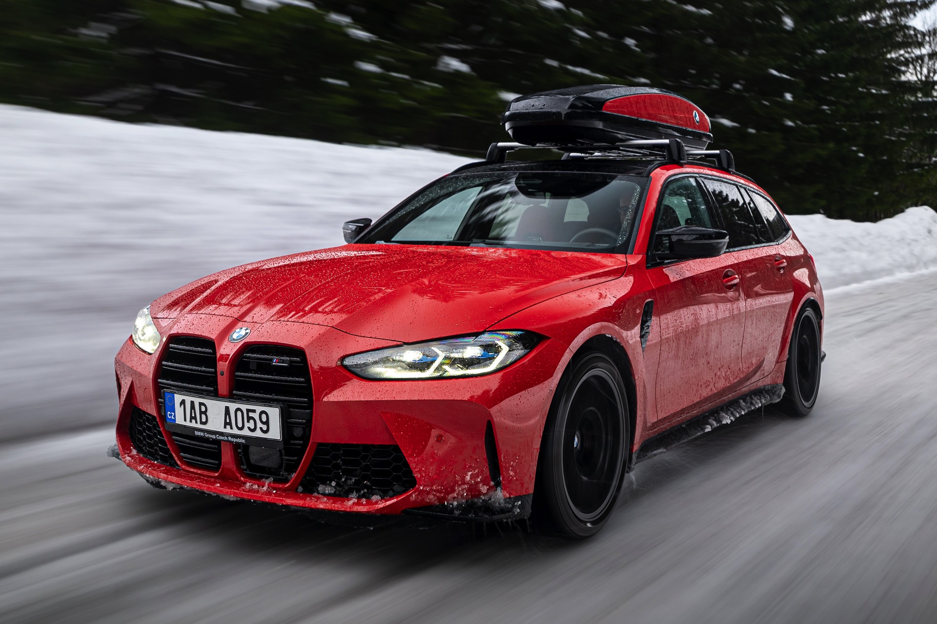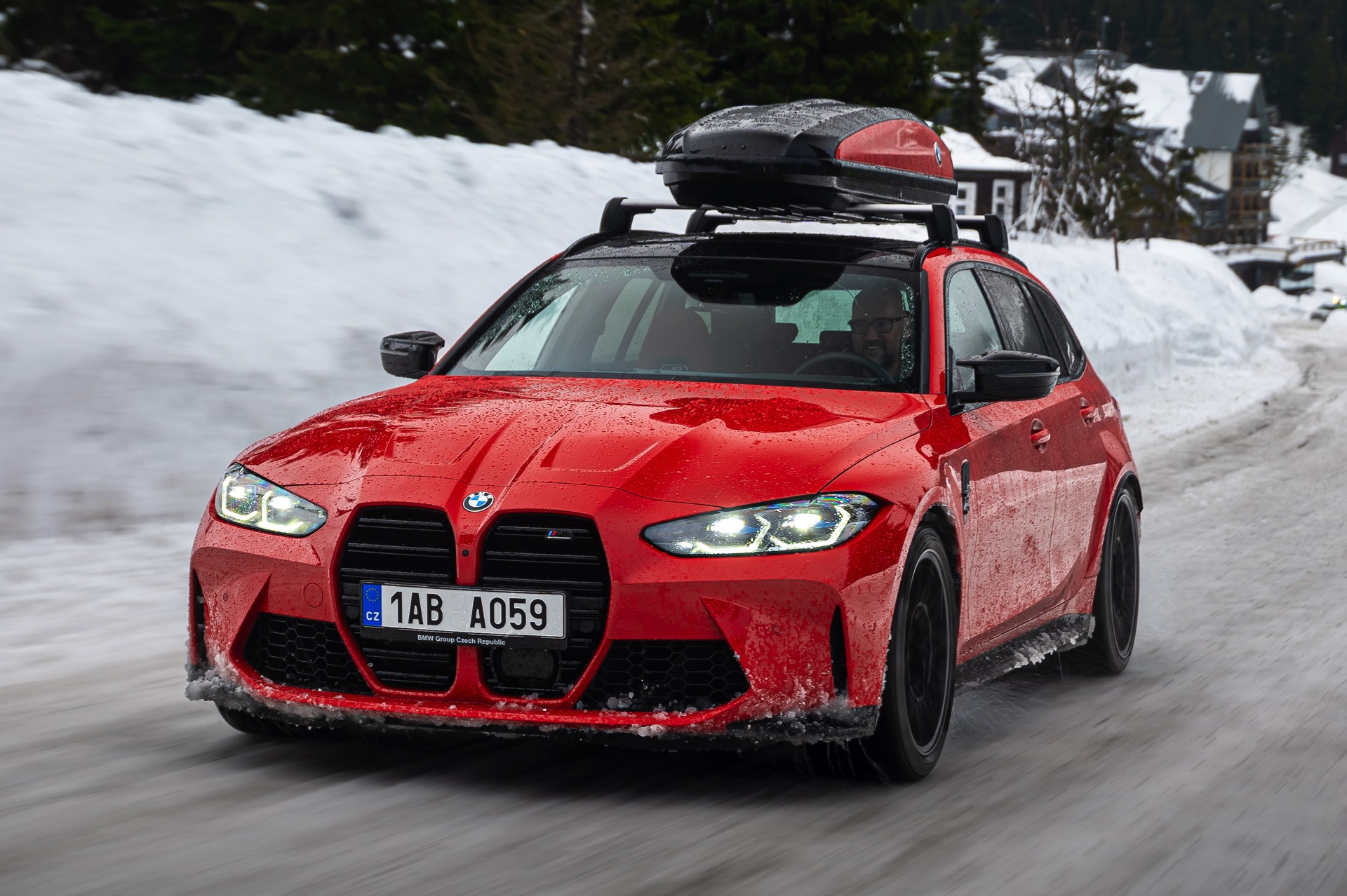 Wer auch nach dem langen Winter-Drift-Video von Matthias Malmedie noch nicht genug vom BMW M3 Touring (G81) im Schnee hat oder auf den bisherigen Aufnahmen eine praktische Dachbox vermisst hat, erhält nun Foto-Nachschub aus der Tschechischen Republik. Eine neue Foto-Serie zeigt uns den M3 Touring in Toronto Rot Metallic inmitten einer verschneiten Landschaft – und das bei durchaus engagierter Gangart mit ansehnlichem Driftwinkel. Ein besonderer Hingucker findet sich auf dem Dach des Power-Kombis, denn der gezeigte M3 trägt eine Dachbox aus dem BMW Zubehör-Programm.