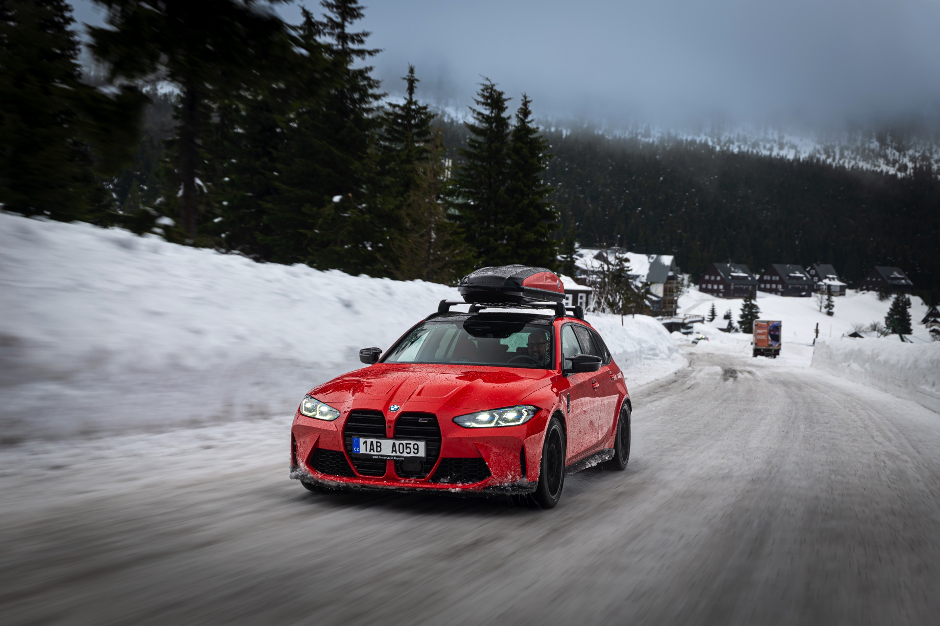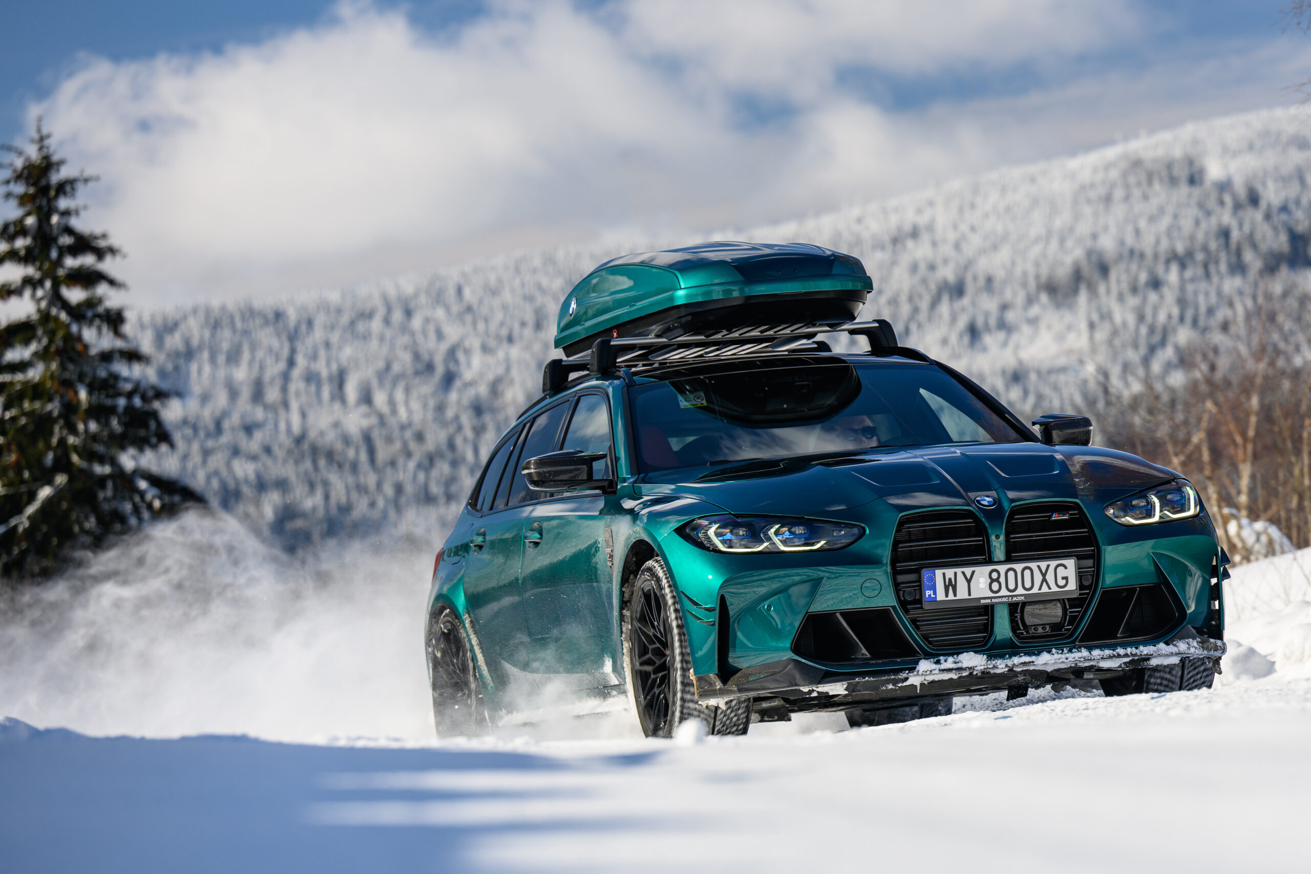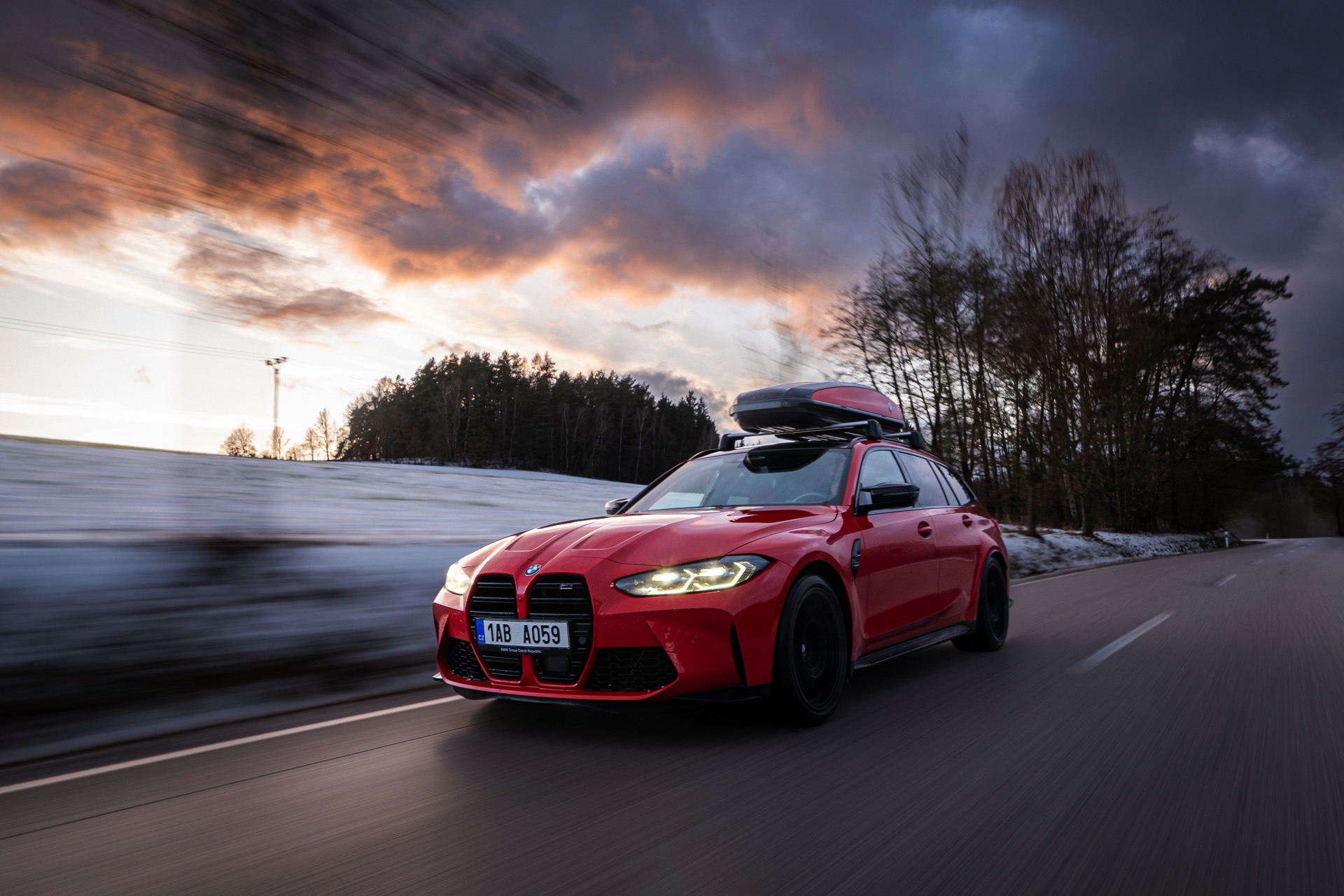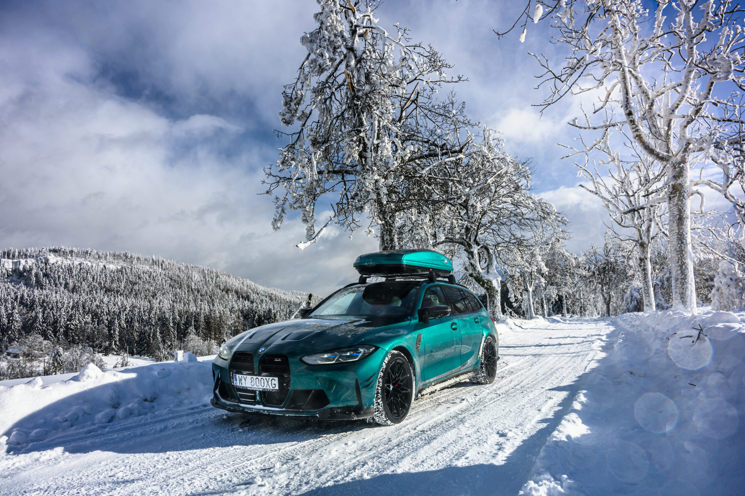 Wer auch nach dem langen Winter-Drift-Video von Matthias Malmedie noch nicht genug vom BMW M3 Touring (G81) im Schnee hat oder auf den bisherigen Aufnahmen eine praktische Dachbox vermisst hat, erhält nun Foto-Nachschub aus der Tschechischen Republik. Eine neue Foto-Serie zeigt uns den M3 Touring in Toronto Rot Metallic inmitten einer verschneiten Landschaft – und das bei durchaus engagierter Gangart mit ansehnlichem Driftwinkel. Ein besonderer Hingucker findet sich auf dem Dach des Power-Kombis, denn der gezeigte M3 trägt eine Dachbox aus dem BMW Zubehör-Programm.
