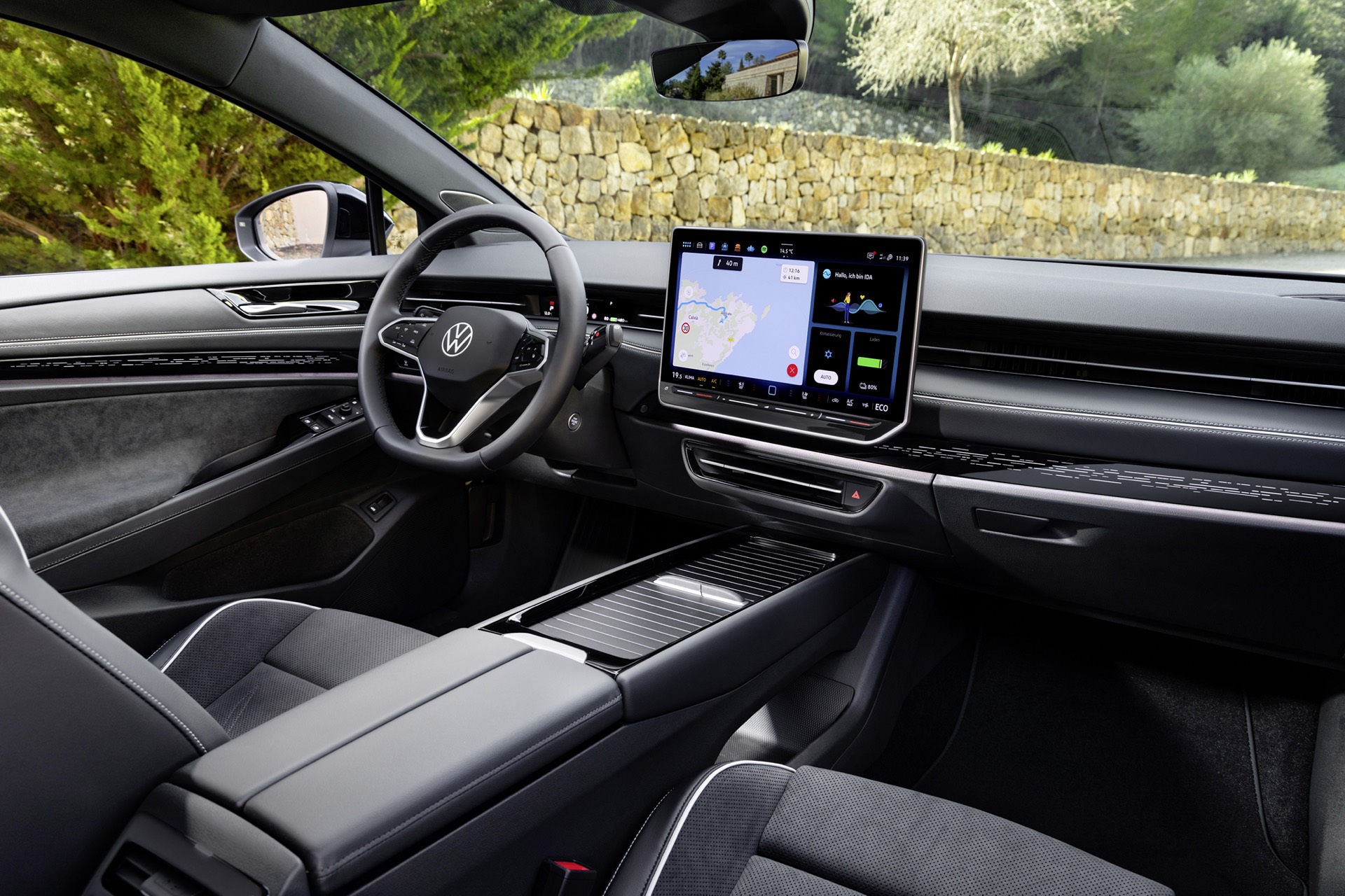 Das Cockpit des VW ID.7 Tourer wird von einem großen Zentraldisplay geprägt, hinter dem Lenkrad kommt auf den ersten Blick nur noch ein kleines Display für den Fahrer zum Einsatz. Doch dieser Eindruck täuscht, denn genau wie der BMW i5 Touring bietet auch der ID.7 ein Head-up-Display, das alle wesentlichen Informationen ins direkte Blickfeld des Fahrers projiziert.