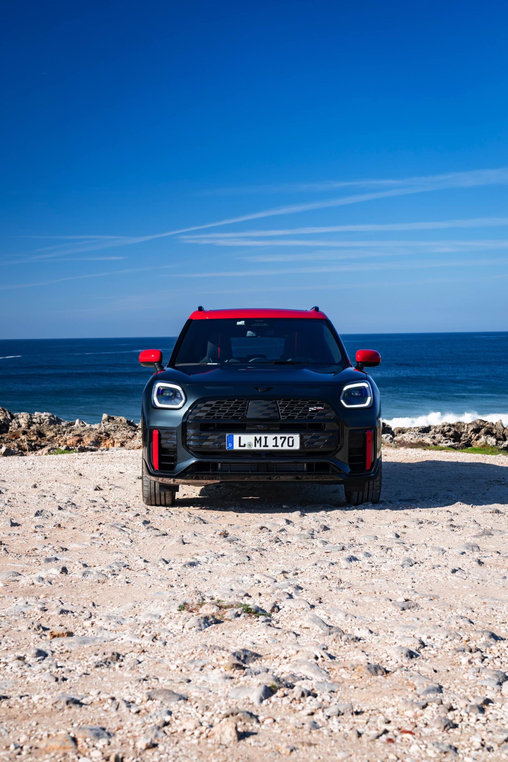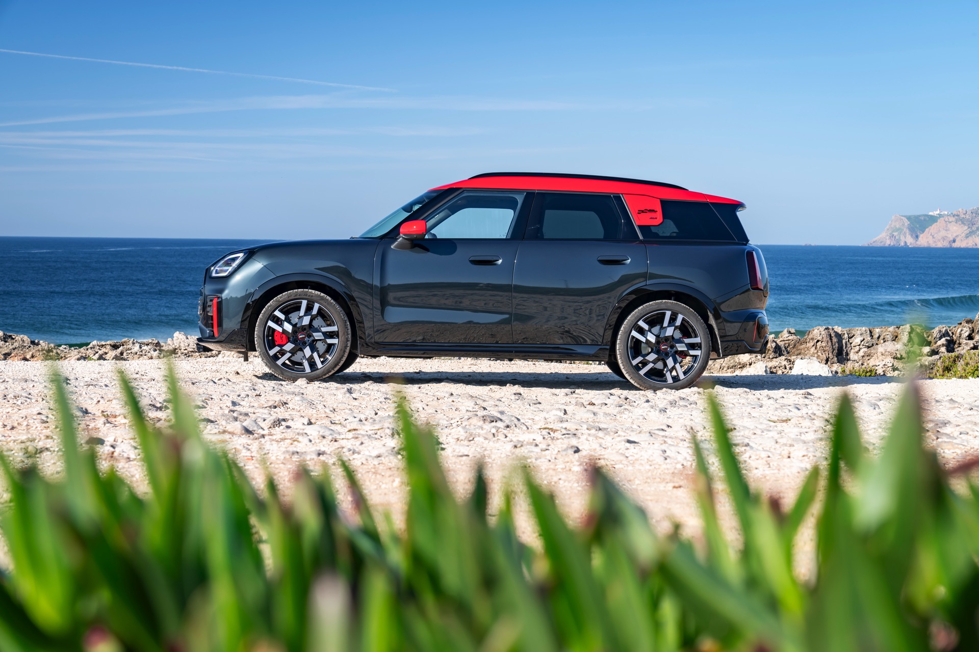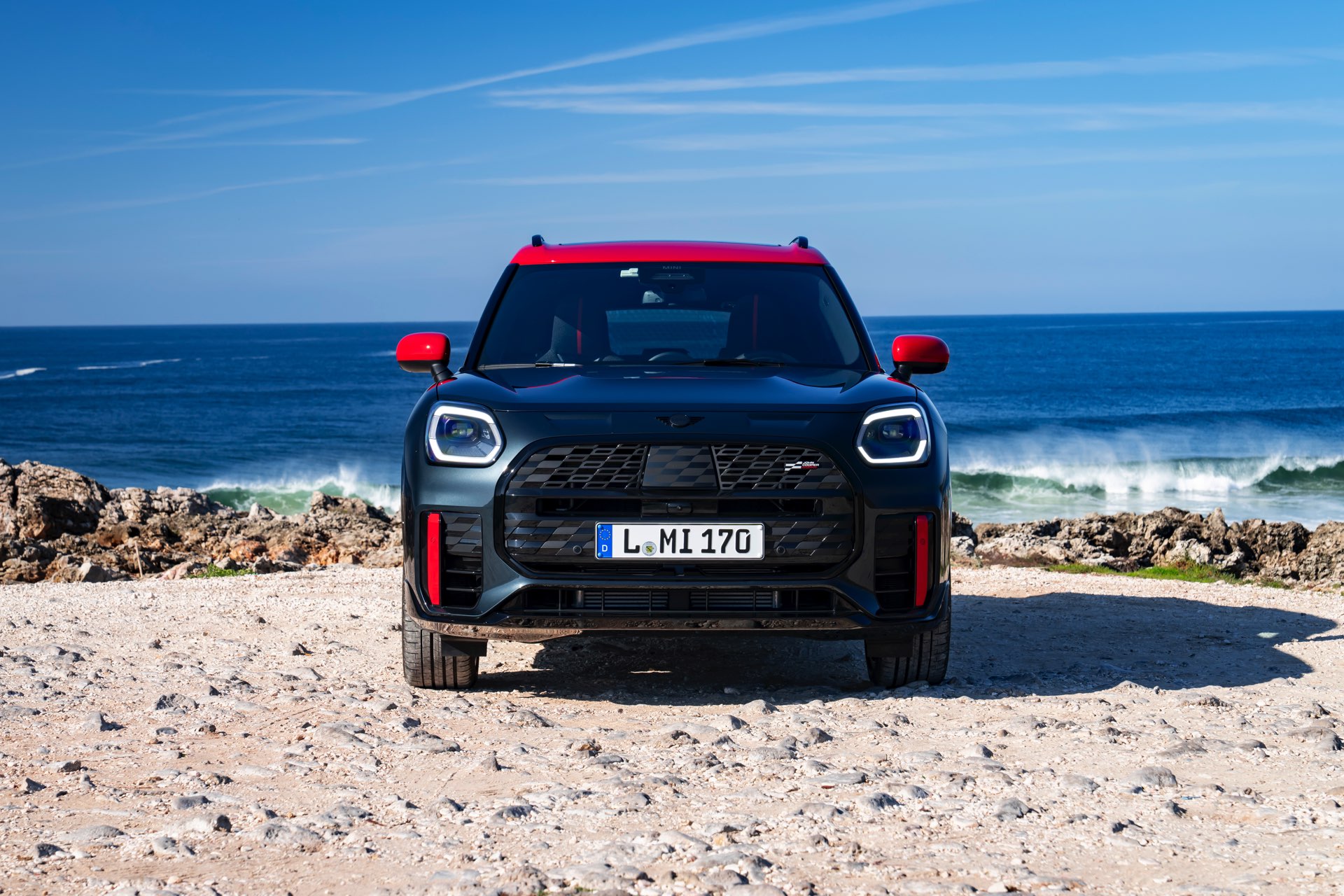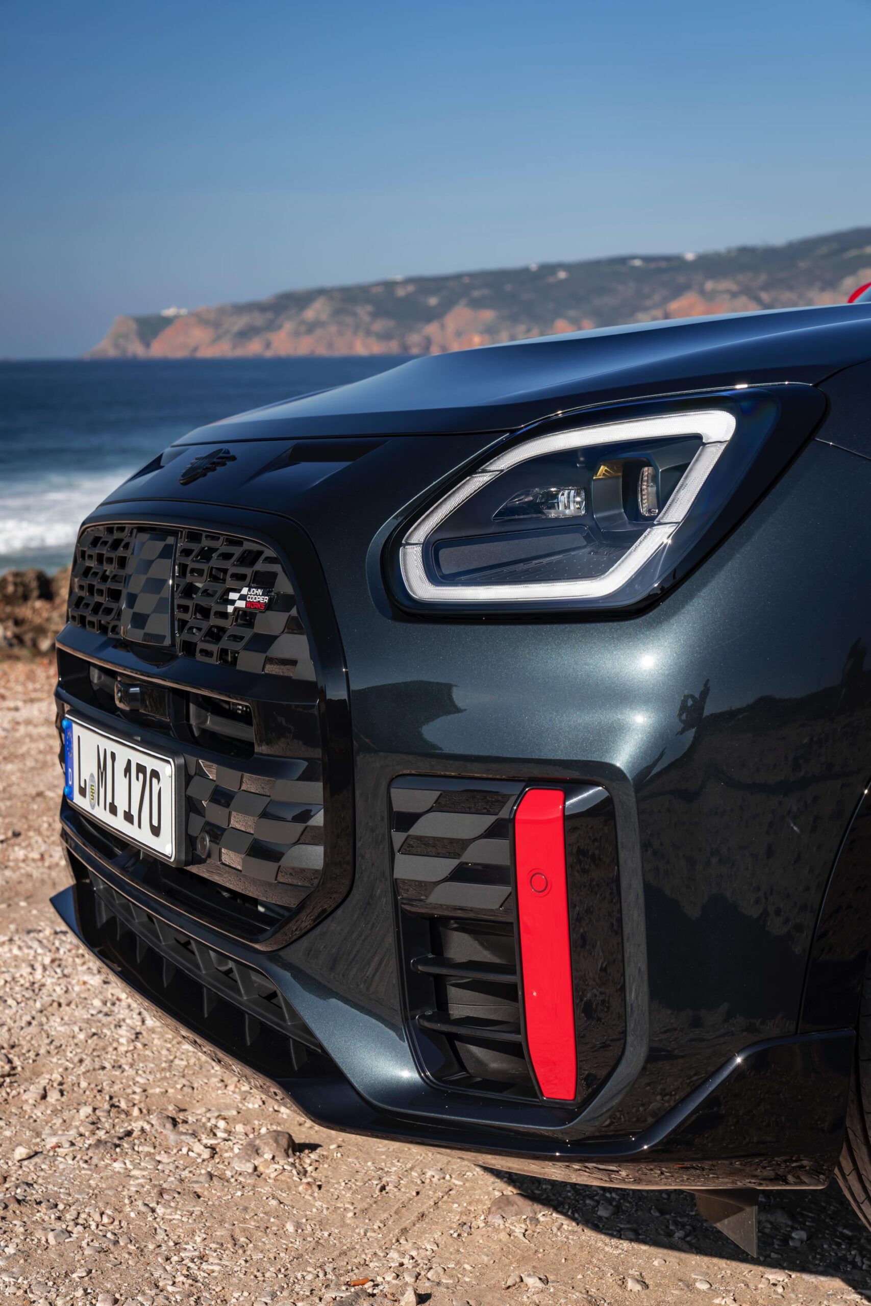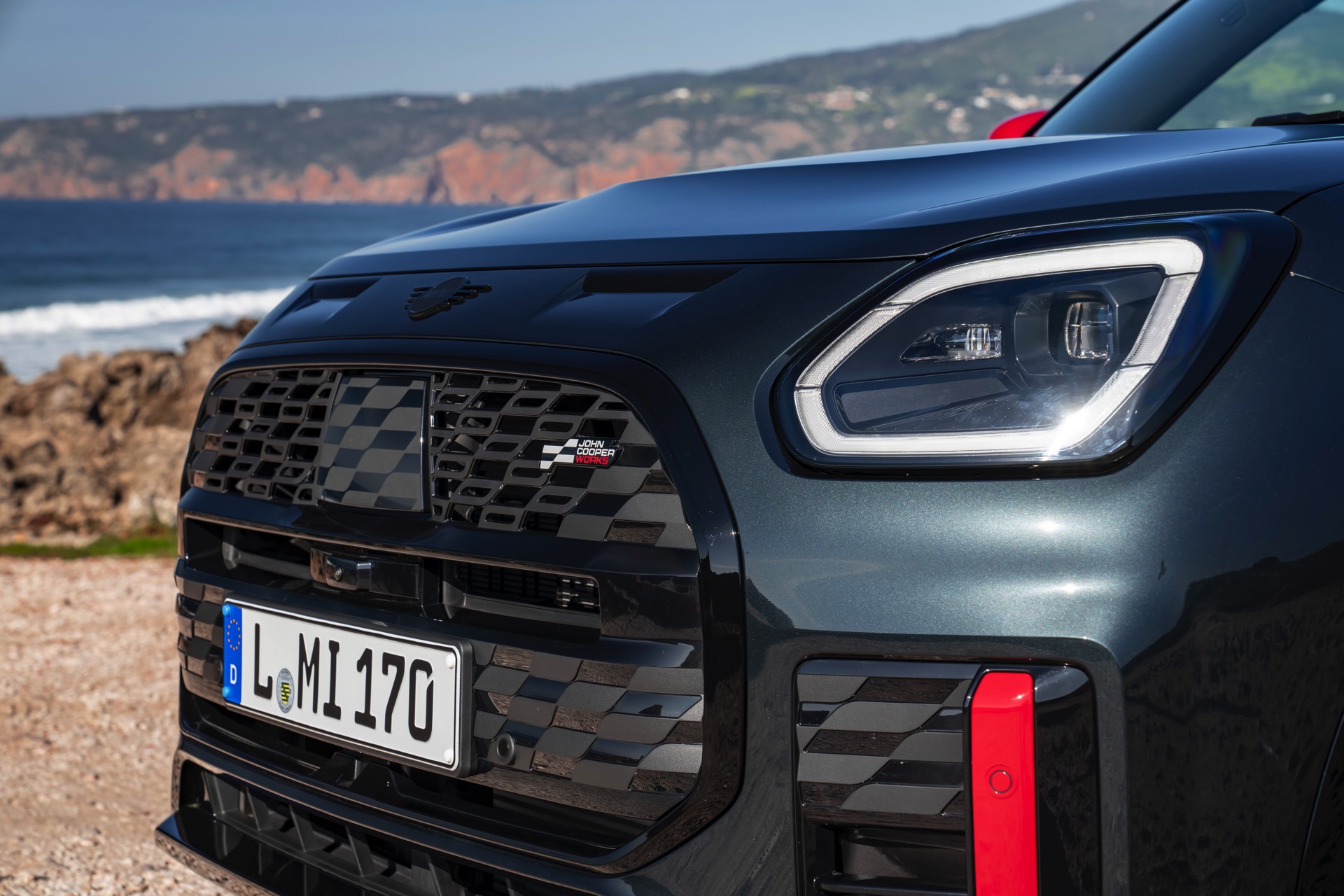 Gleich bei unserem ersten fahraktiven Kontakt mit dem neuen MINI Countryman (U25) durften wir uns dem sportlichen Topmodell widmen und ans Steuer des John Cooper Works. Die 300 PS starke Fahrspaß-Variante ist genau wie die schwächeren Versionen ein echter XXL-MINI geworden, fast viereinhalb Meter lang und deutlich über 1,60 Meter hoch – aber optisch kommen dennoch keine Zweifel daran auf, wo dieses SUV seine Wurzeln hat: In der von uns gefahrenen Konfiguration mit Lackierung in Legend Grey sowie Dach, Spiegelkappen und einigen Details in Chili Red präsentiert sich der Countryman schon auf den ersten Blick im typischen JCW-Style.