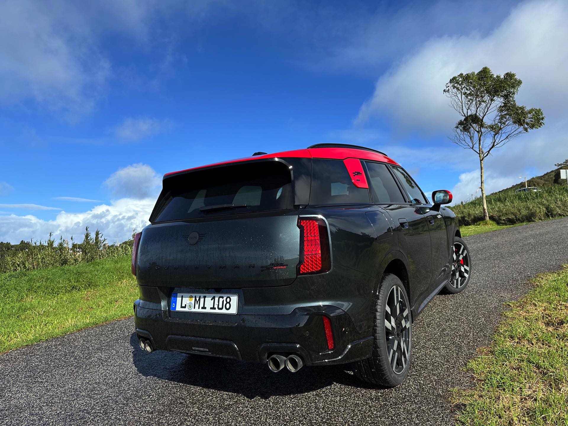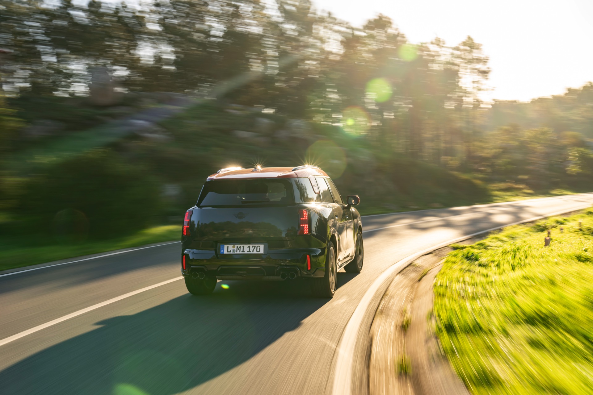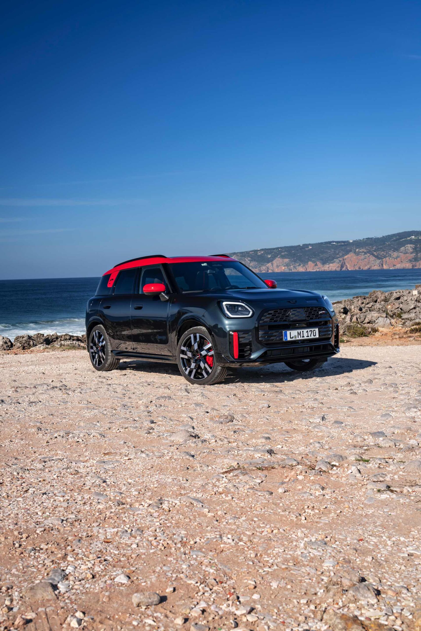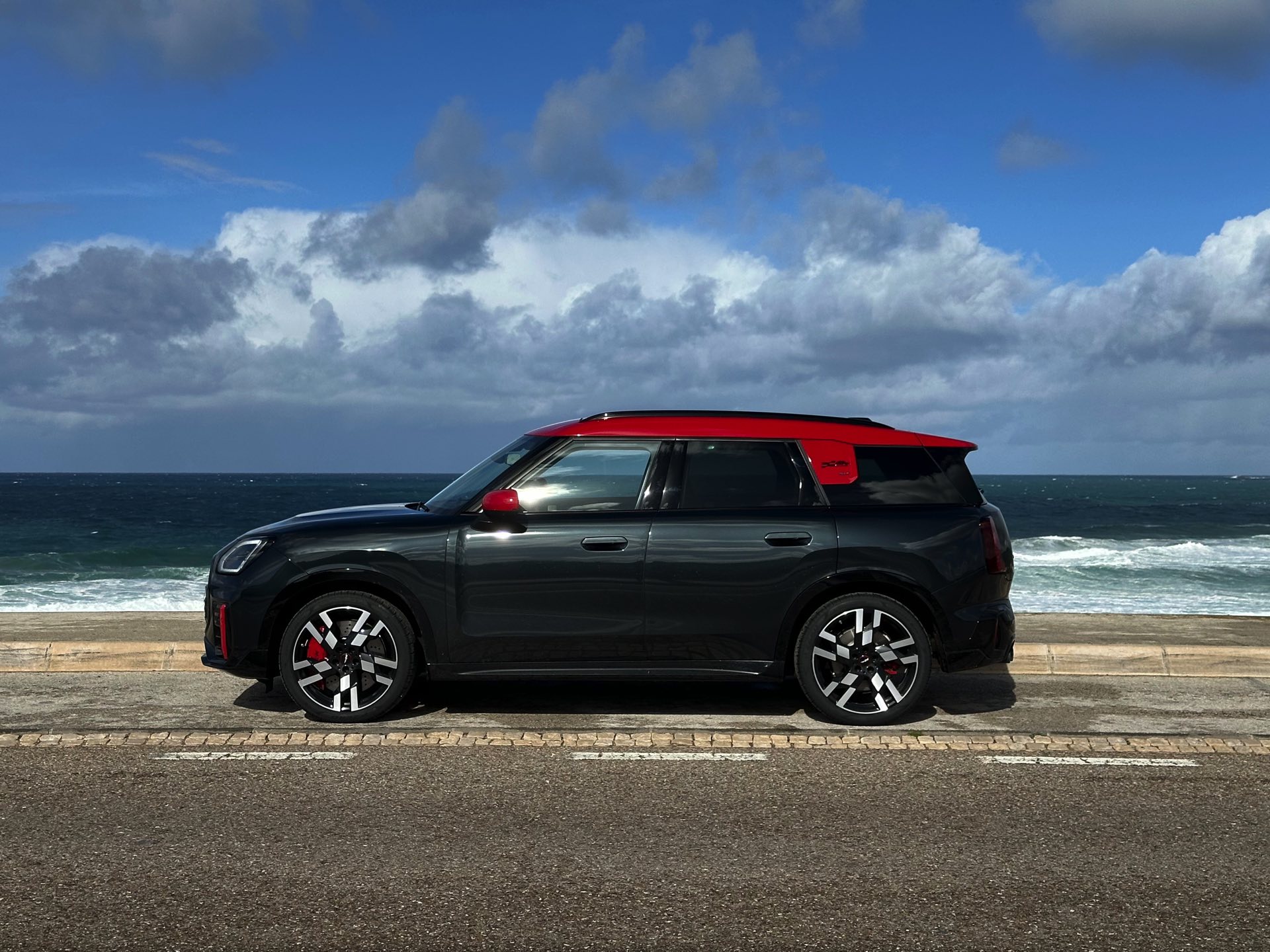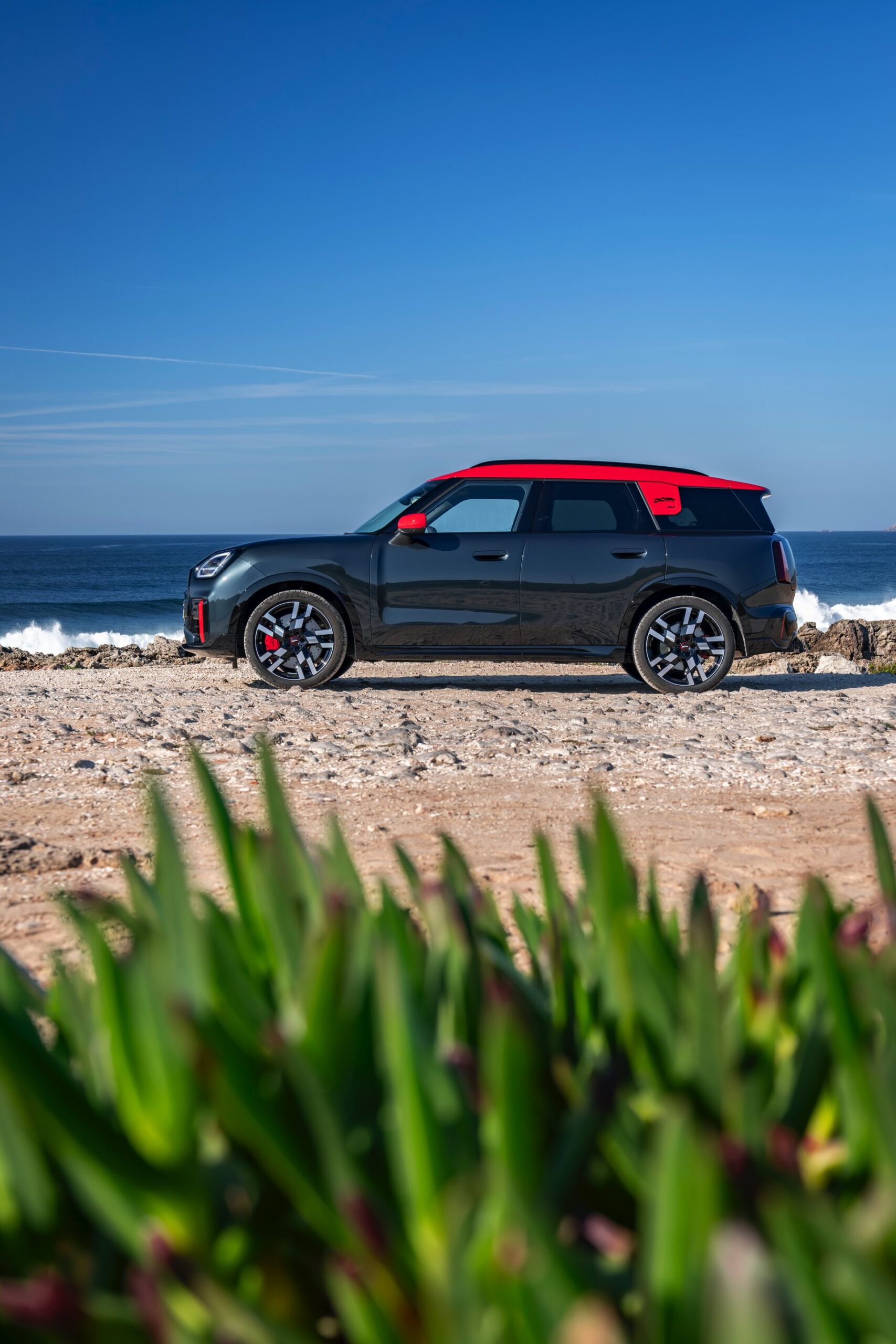 Gleich bei unserem ersten fahraktiven Kontakt mit dem neuen MINI Countryman (U25) durften wir uns dem sportlichen Topmodell widmen und ans Steuer des John Cooper Works. Die 300 PS starke Fahrspaß-Variante ist genau wie die schwächeren Versionen ein echter XXL-MINI geworden, fast viereinhalb Meter lang und deutlich über 1,60 Meter hoch – aber optisch kommen dennoch keine Zweifel daran auf, wo dieses SUV seine Wurzeln hat: In der von uns gefahrenen Konfiguration mit Lackierung in Legend Grey sowie Dach, Spiegelkappen und einigen Details in Chili Red präsentiert sich der Countryman schon auf den ersten Blick im typischen JCW-Style.