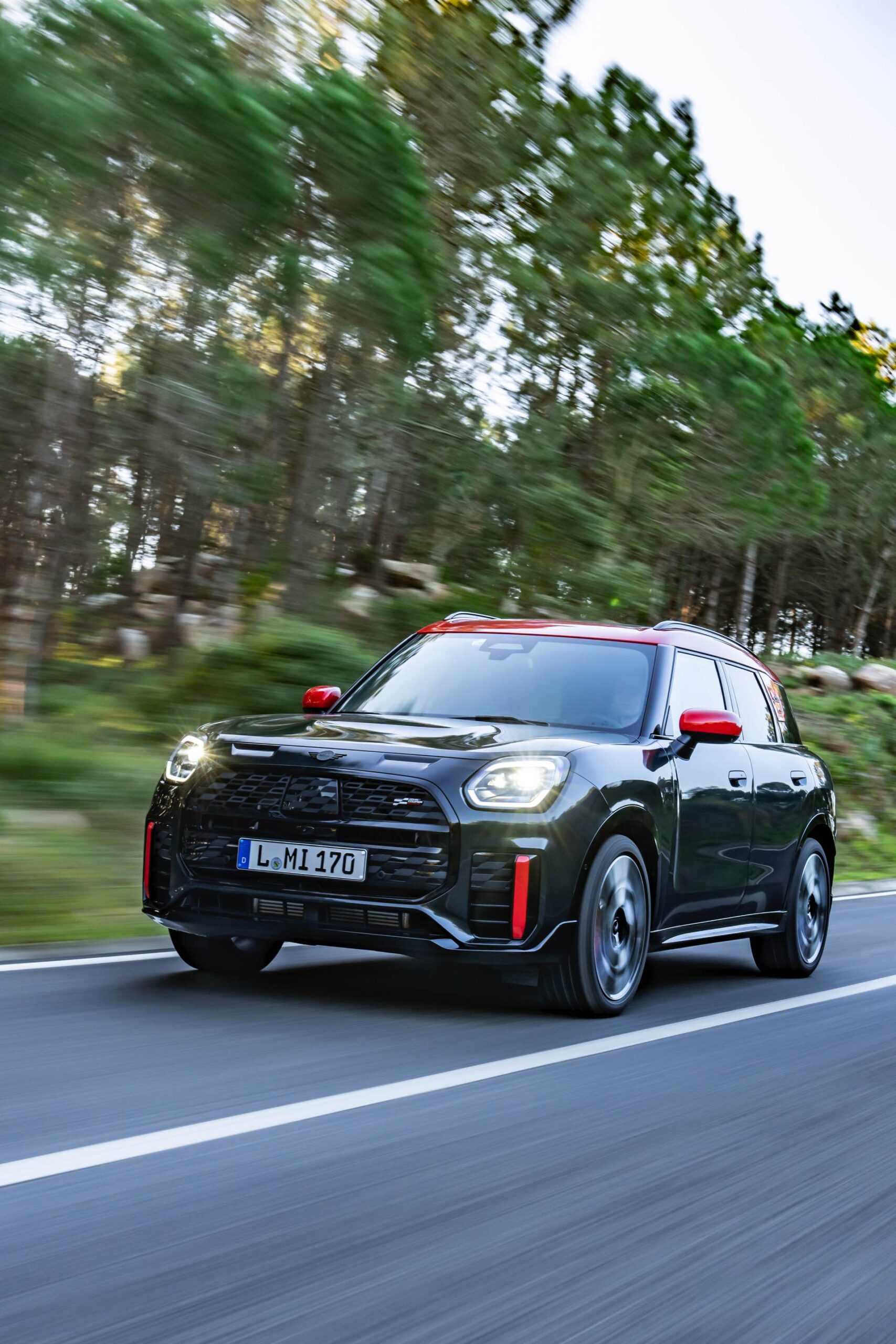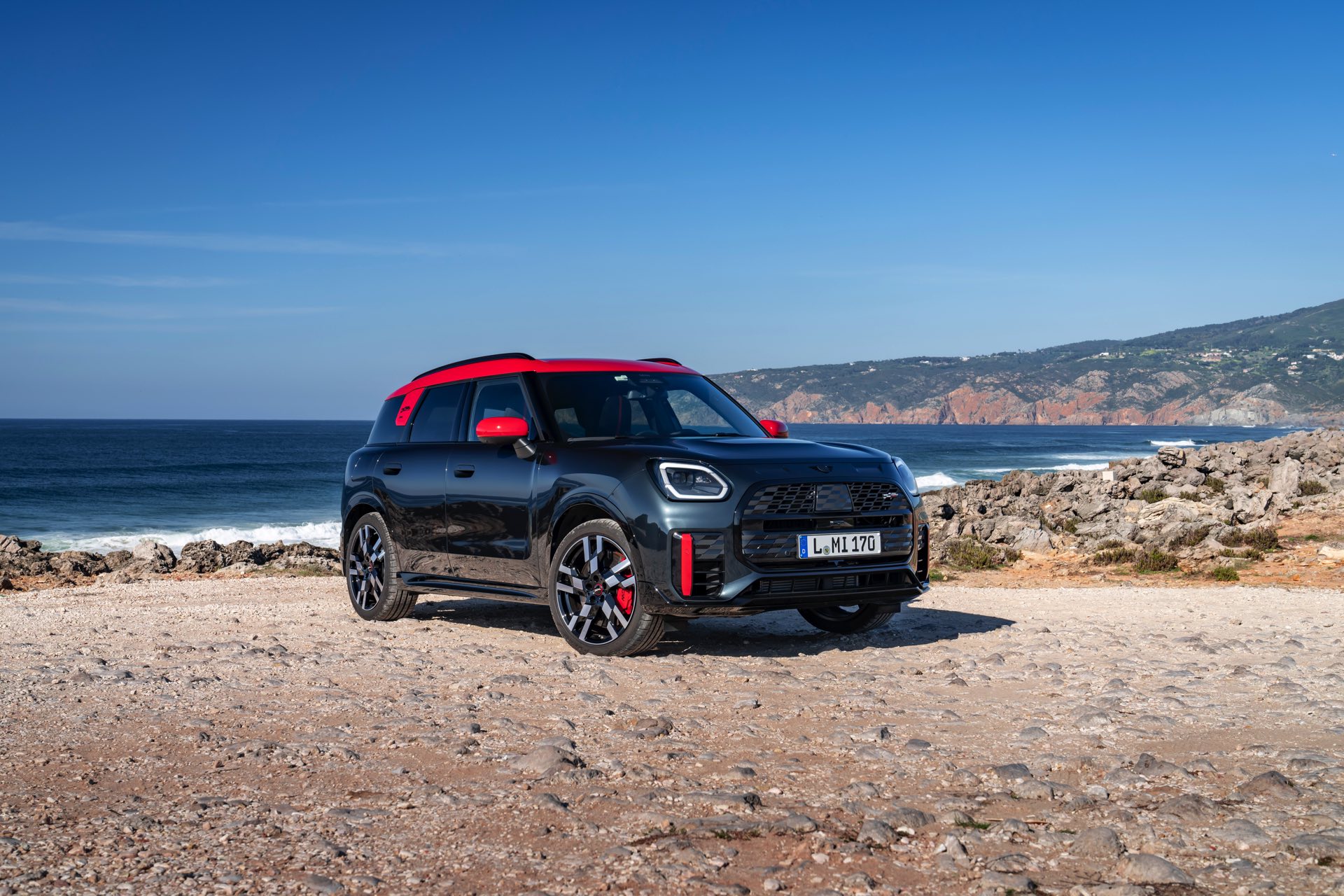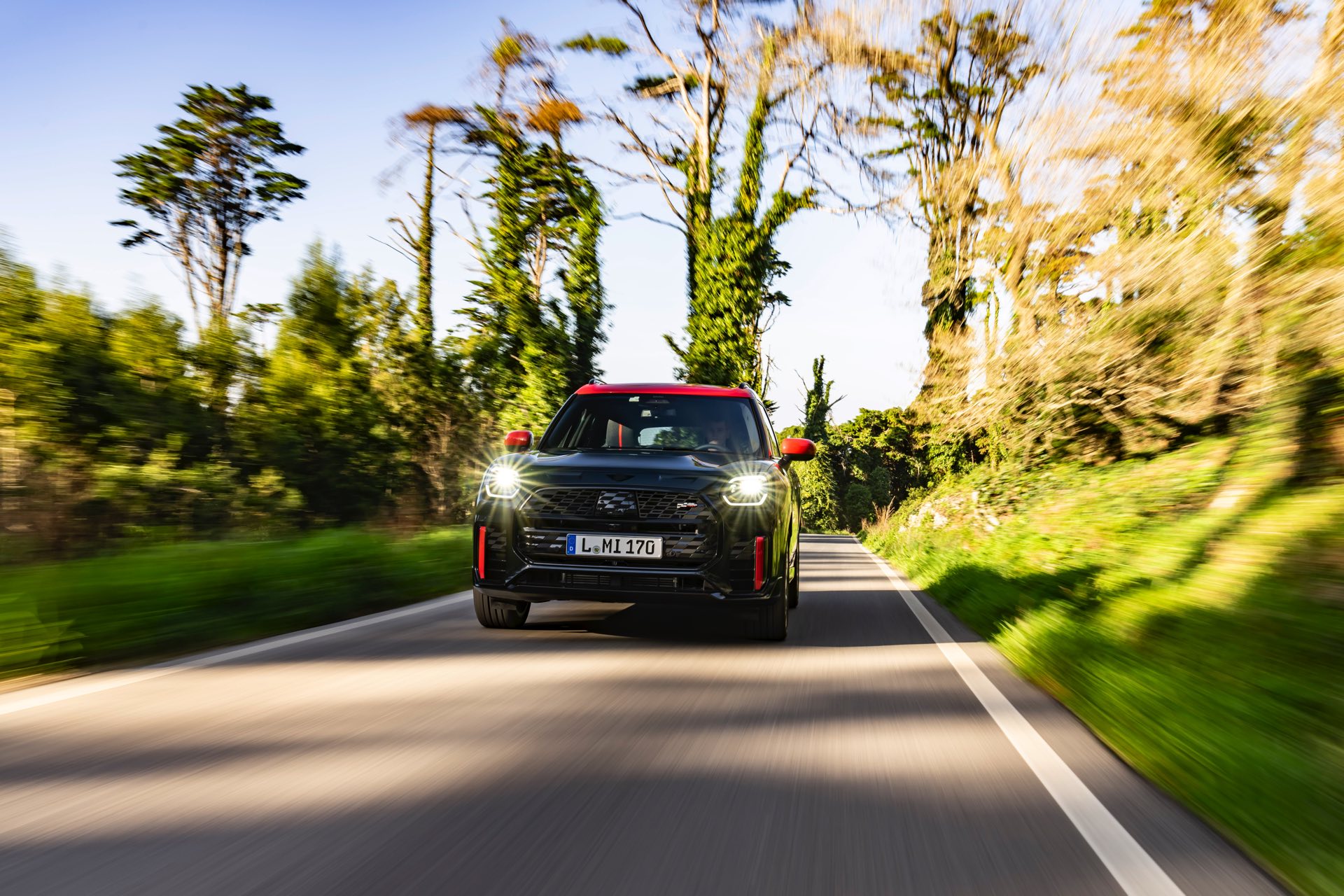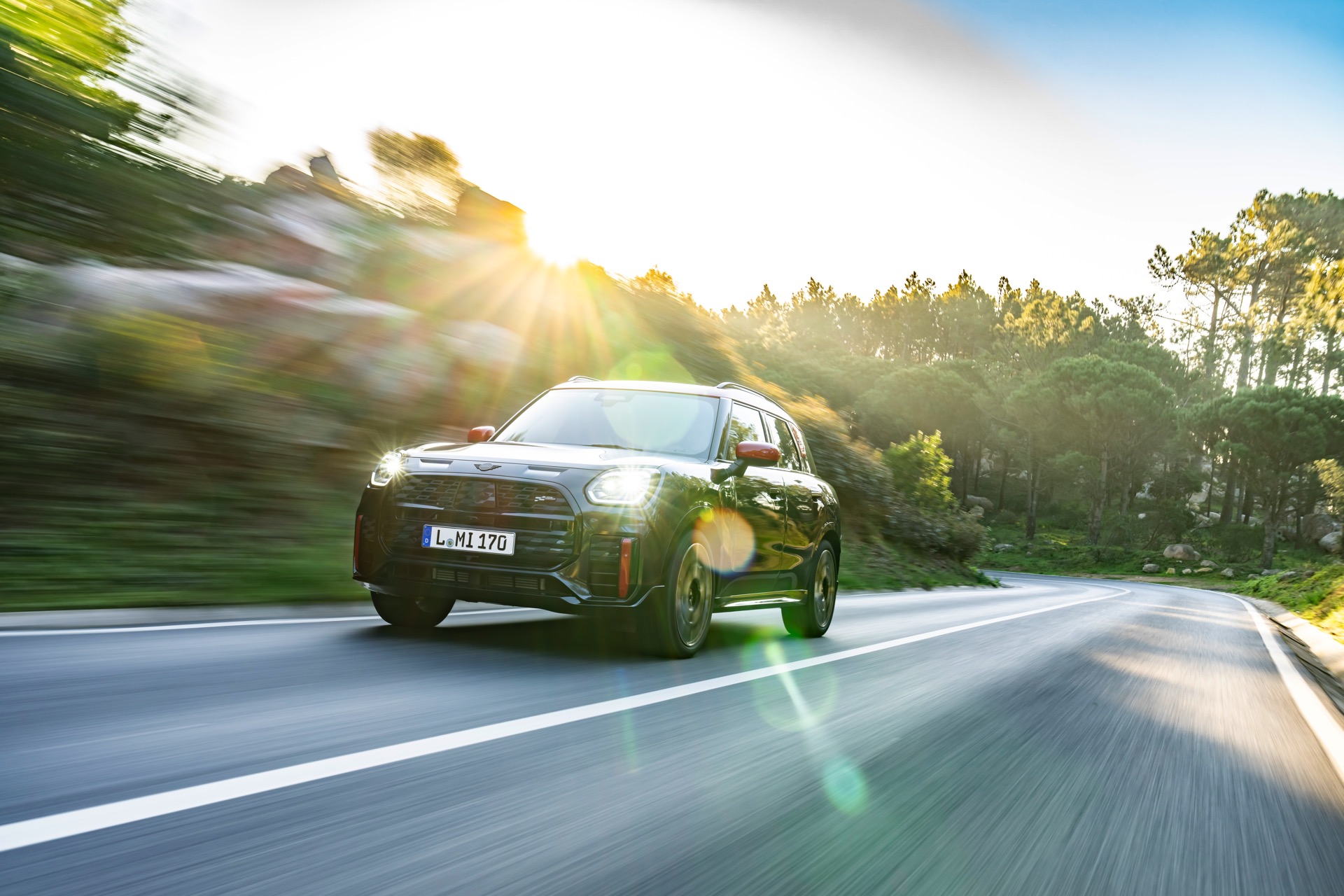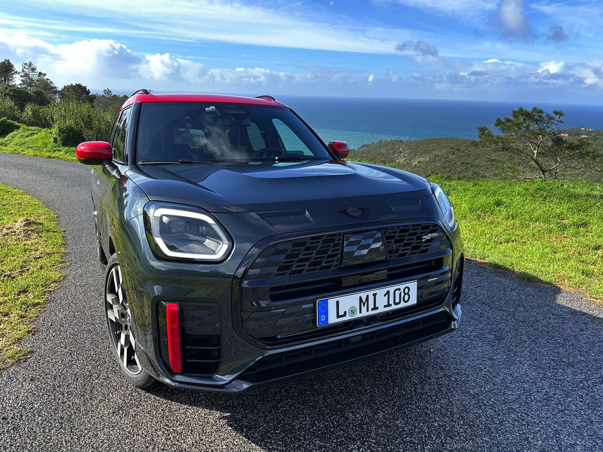 Gleich bei unserem ersten fahraktiven Kontakt mit dem neuen MINI Countryman (U25) durften wir uns dem sportlichen Topmodell widmen und ans Steuer des John Cooper Works. Die 300 PS starke Fahrspaß-Variante ist genau wie die schwächeren Versionen ein echter XXL-MINI geworden, fast viereinhalb Meter lang und deutlich über 1,60 Meter hoch – aber optisch kommen dennoch keine Zweifel daran auf, wo dieses SUV seine Wurzeln hat: In der von uns gefahrenen Konfiguration mit Lackierung in Legend Grey sowie Dach, Spiegelkappen und einigen Details in Chili Red präsentiert sich der Countryman schon auf den ersten Blick im typischen JCW-Style.