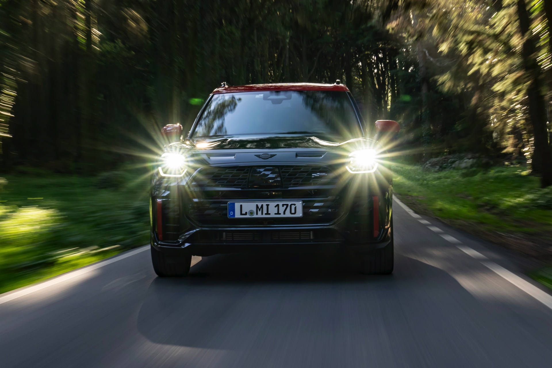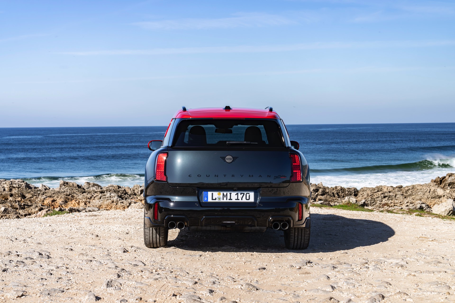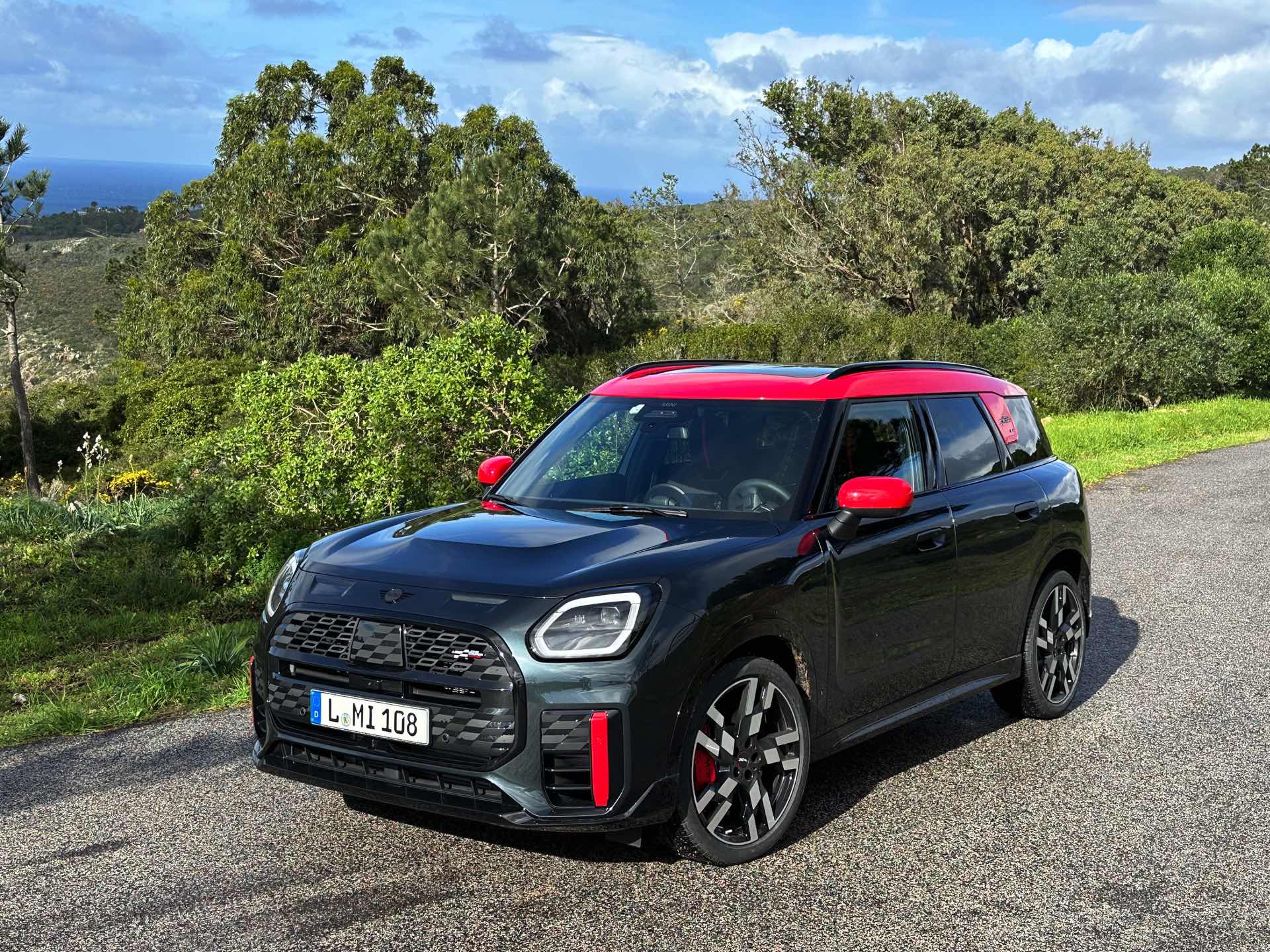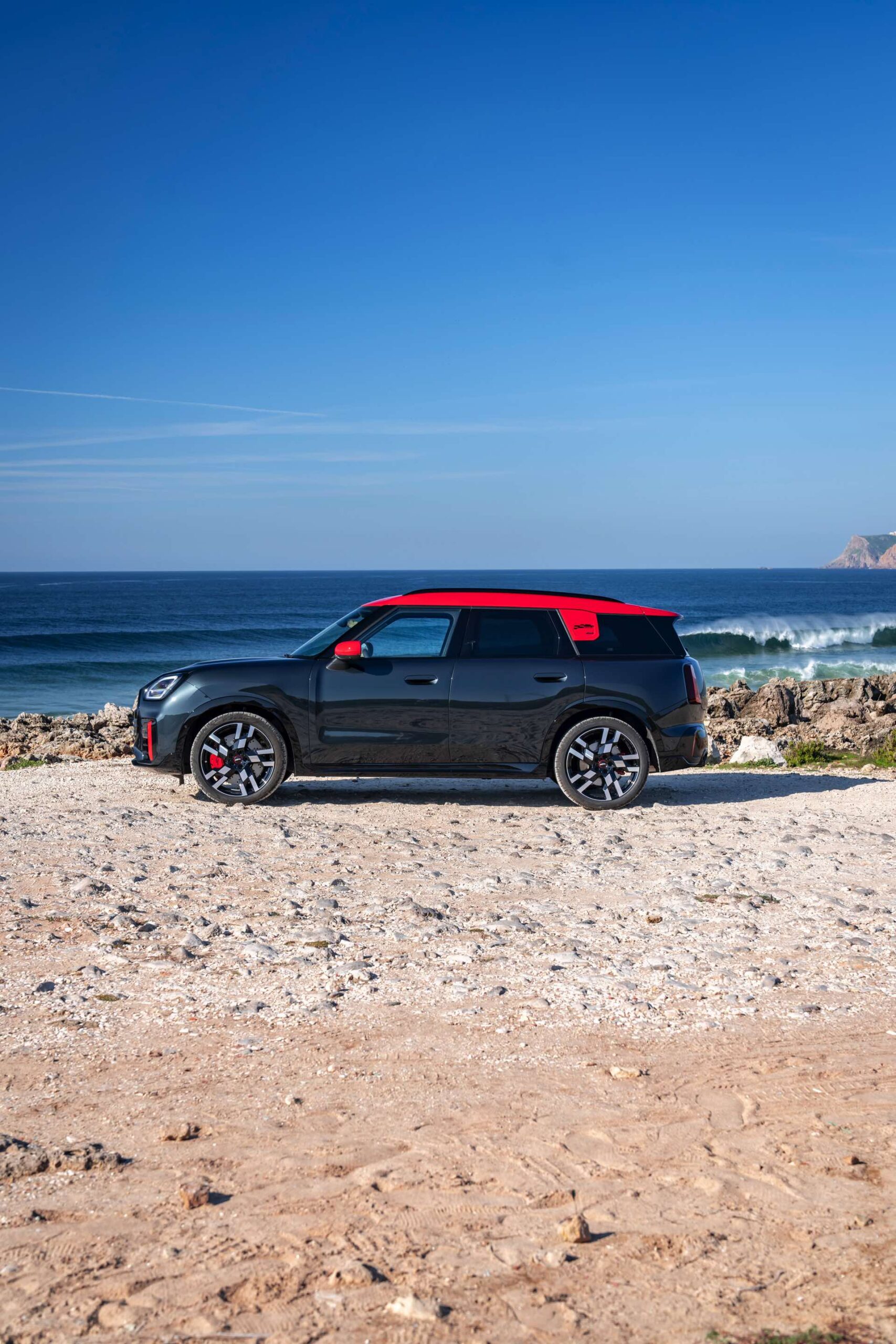 Gleich bei unserem ersten fahraktiven Kontakt mit dem neuen MINI Countryman (U25) durften wir uns dem sportlichen Topmodell widmen und ans Steuer des John Cooper Works. Die 300 PS starke Fahrspaß-Variante ist genau wie die schwächeren Versionen ein echter XXL-MINI geworden, fast viereinhalb Meter lang und deutlich über 1,60 Meter hoch – aber optisch kommen dennoch keine Zweifel daran auf, wo dieses SUV seine Wurzeln hat: In der von uns gefahrenen Konfiguration mit Lackierung in Legend Grey sowie Dach, Spiegelkappen und einigen Details in Chili Red präsentiert sich der Countryman schon auf den ersten Blick im typischen JCW-Style.