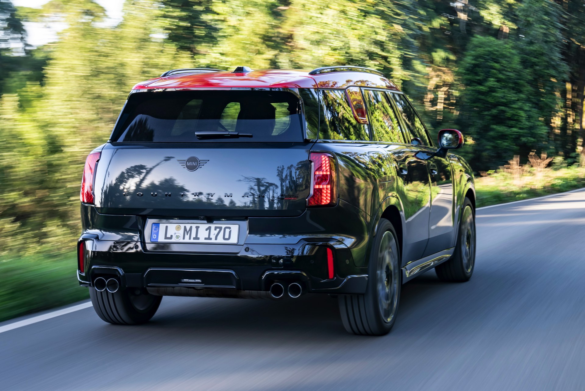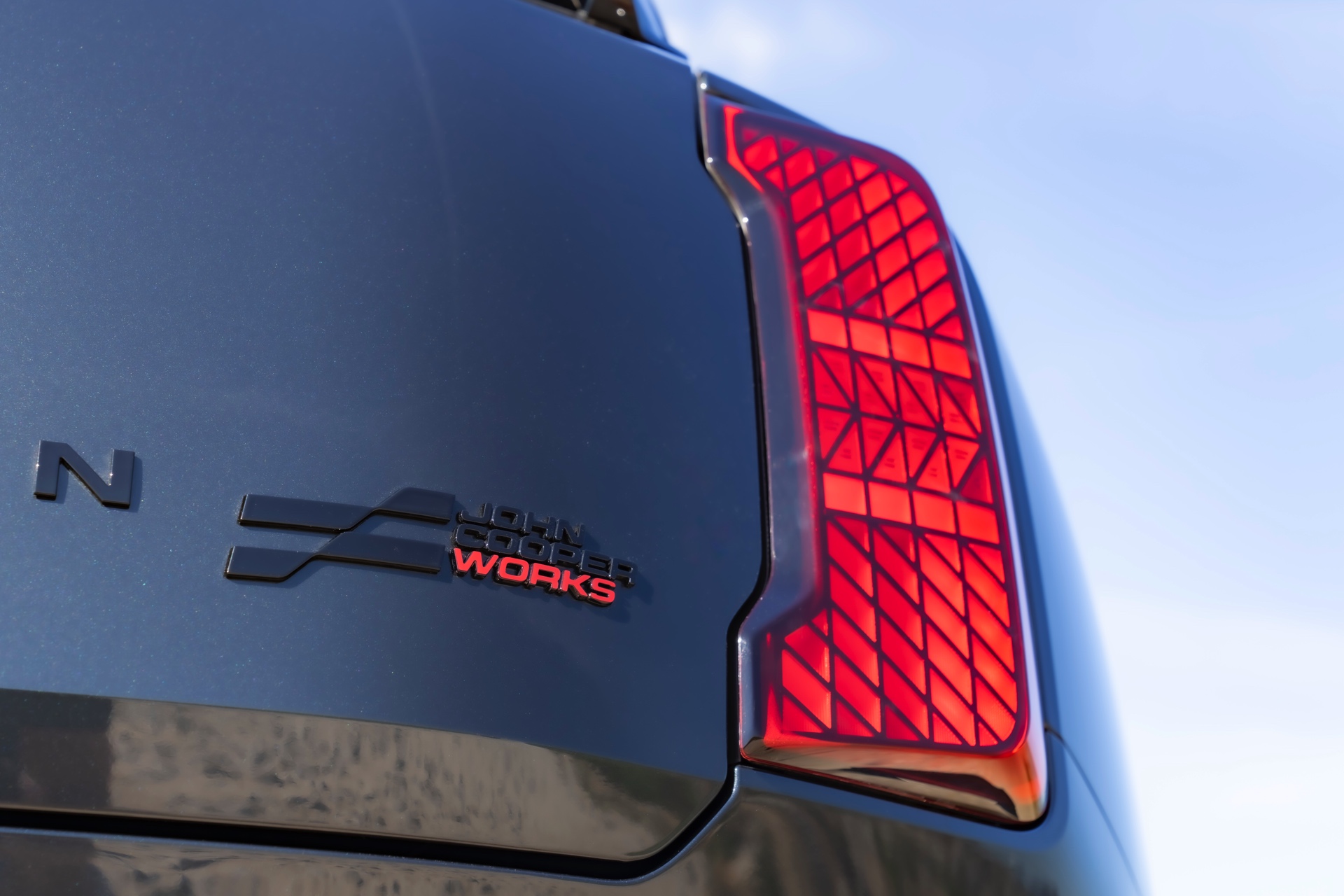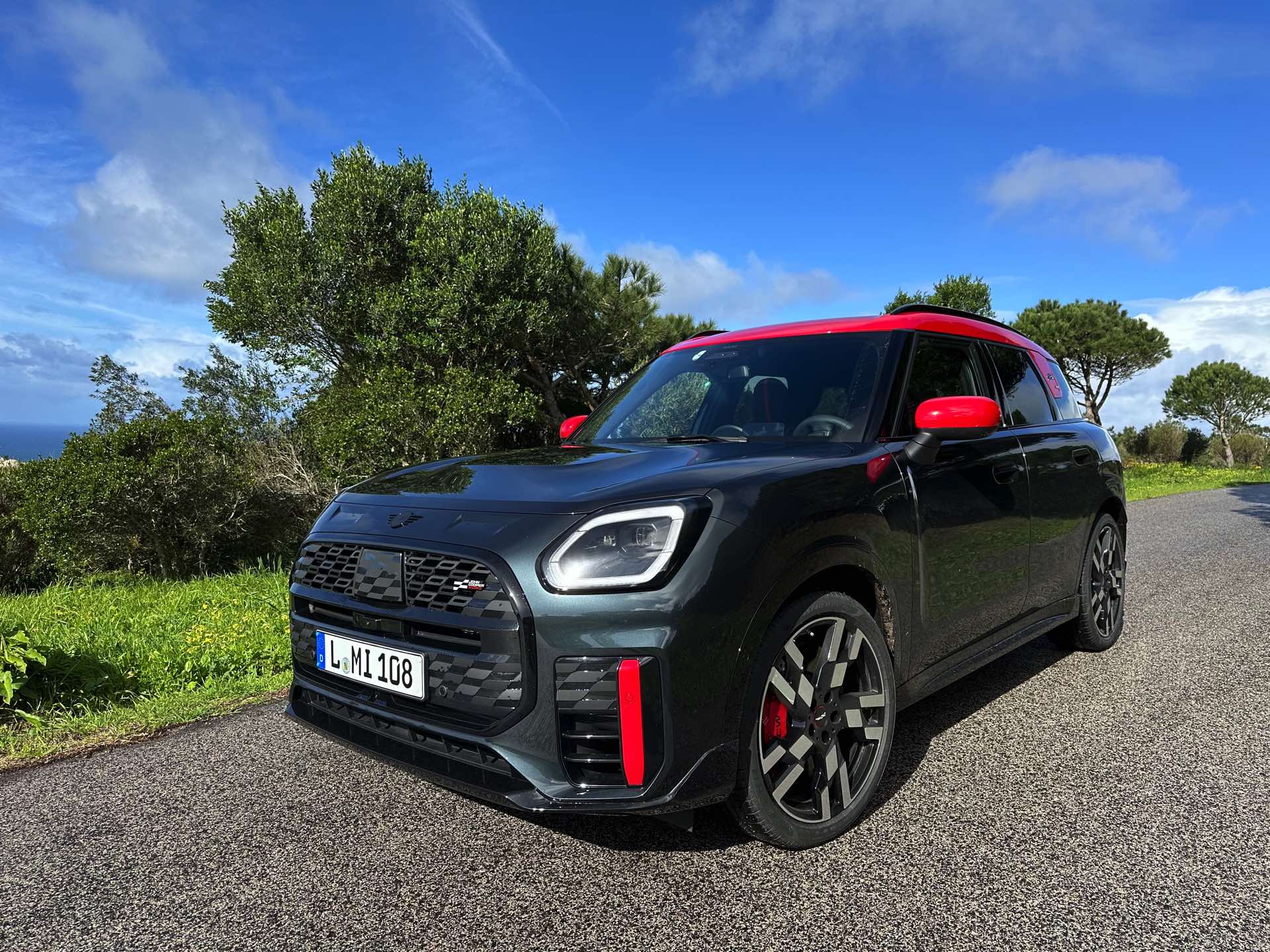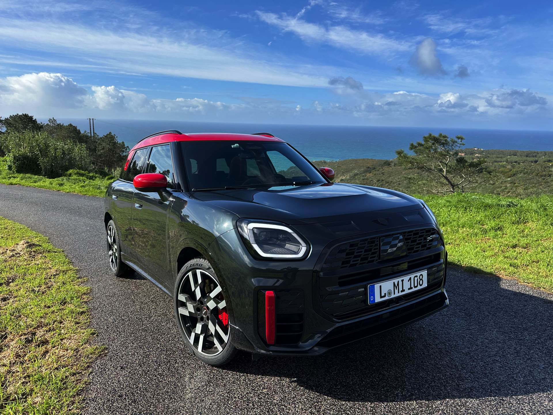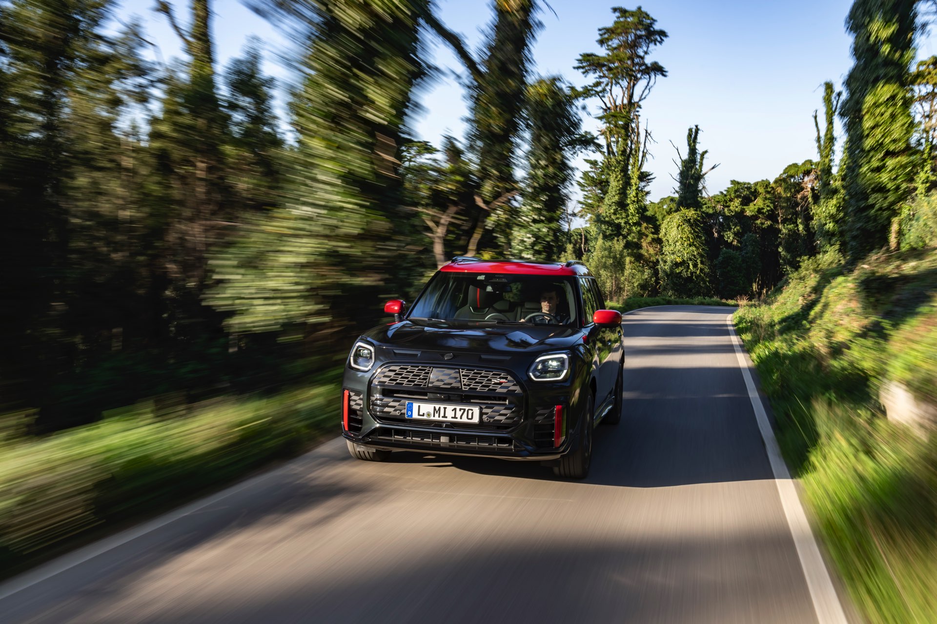 Gleich bei unserem ersten fahraktiven Kontakt mit dem neuen MINI Countryman (U25) durften wir uns dem sportlichen Topmodell widmen und ans Steuer des John Cooper Works. Die 300 PS starke Fahrspaß-Variante ist genau wie die schwächeren Versionen ein echter XXL-MINI geworden, fast viereinhalb Meter lang und deutlich über 1,60 Meter hoch – aber optisch kommen dennoch keine Zweifel daran auf, wo dieses SUV seine Wurzeln hat: In der von uns gefahrenen Konfiguration mit Lackierung in Legend Grey sowie Dach, Spiegelkappen und einigen Details in Chili Red präsentiert sich der Countryman schon auf den ersten Blick im typischen JCW-Style.