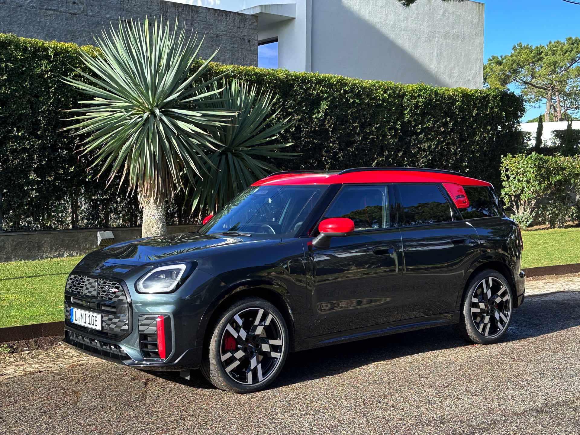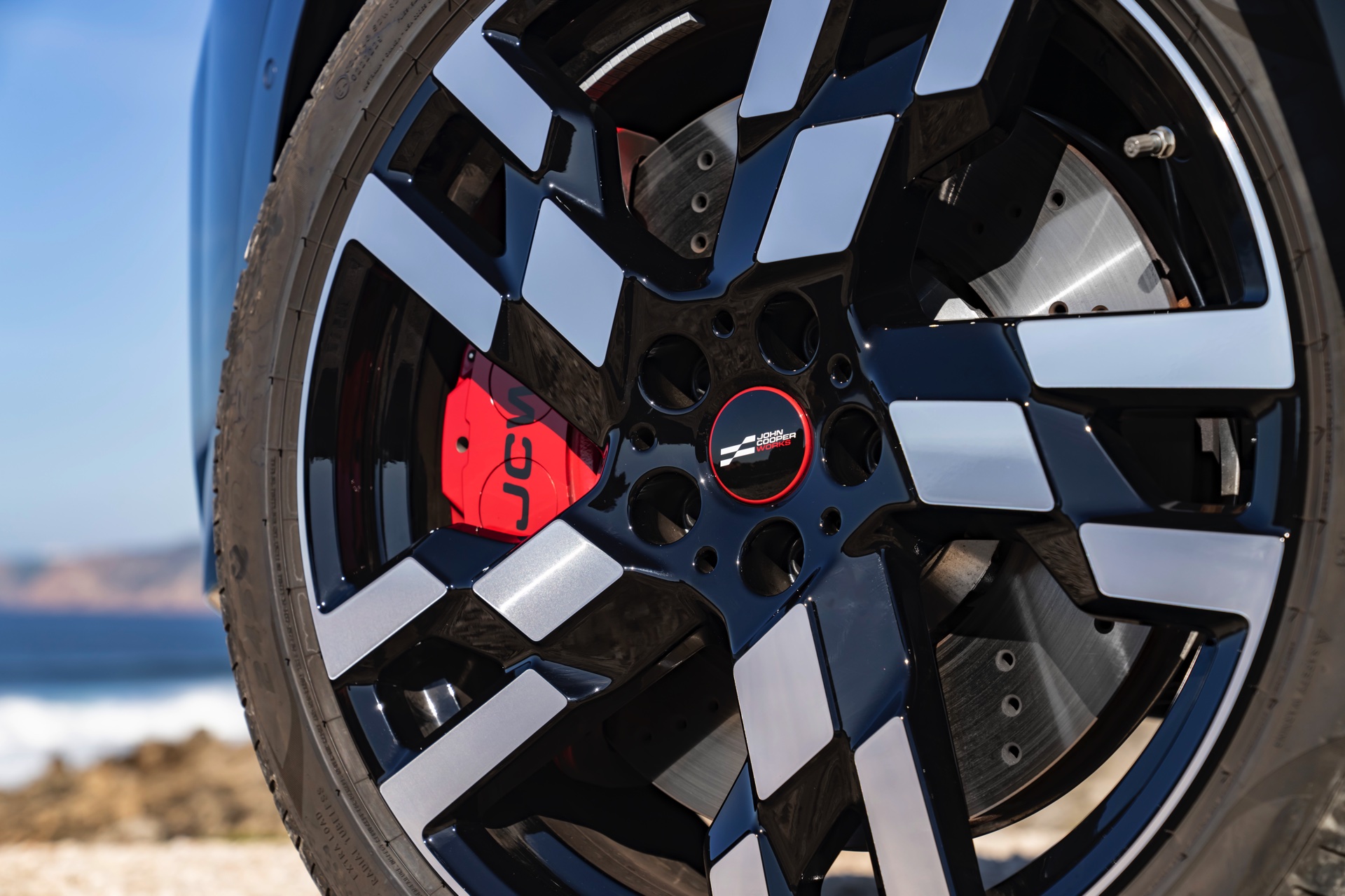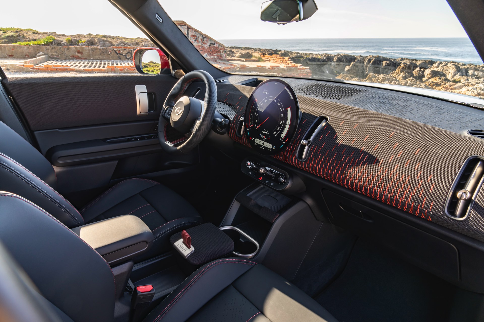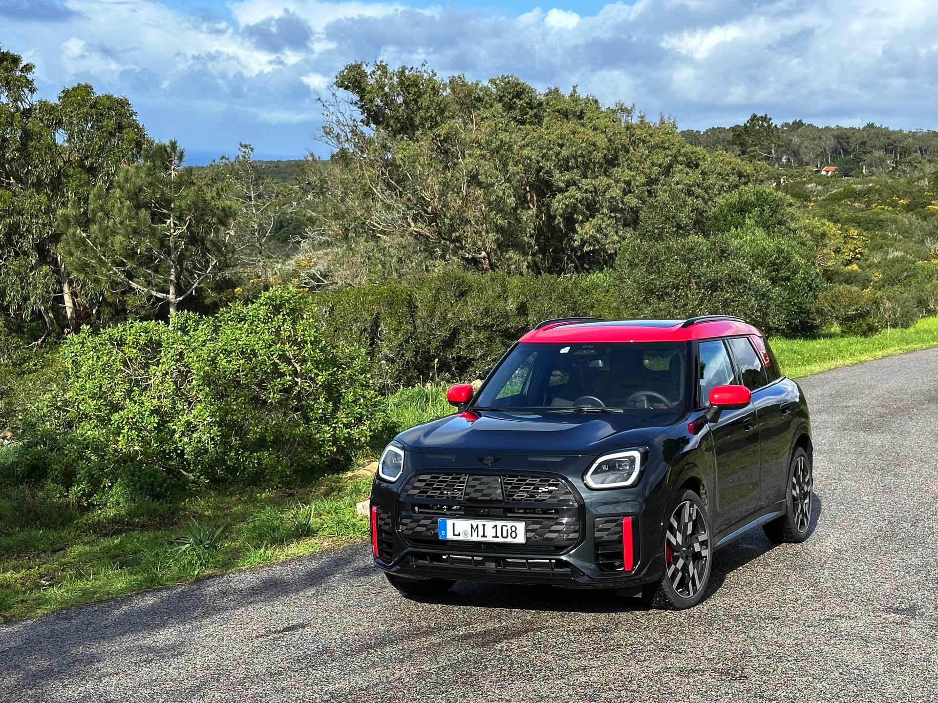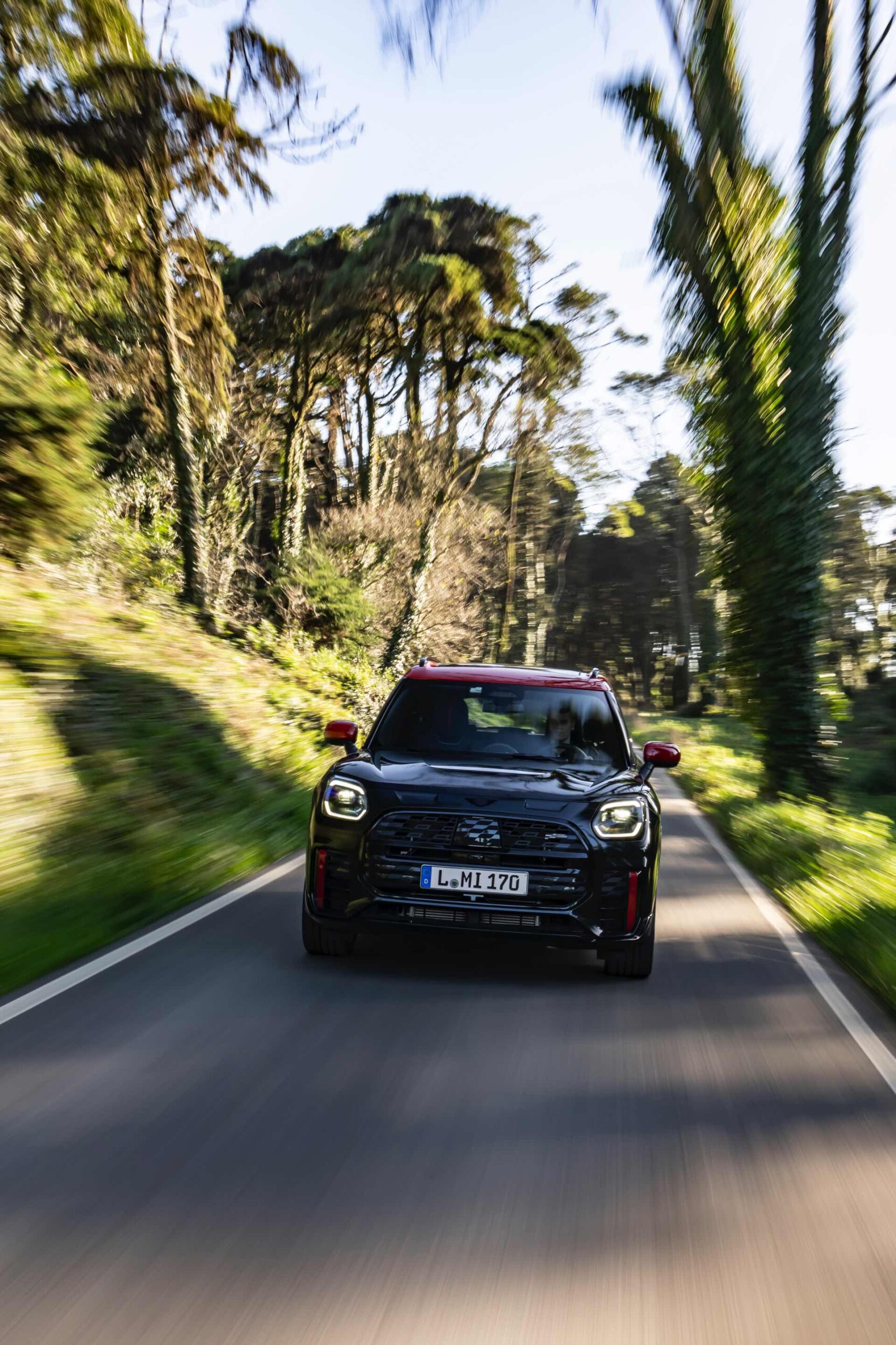 Gleich bei unserem ersten fahraktiven Kontakt mit dem neuen MINI Countryman (U25) durften wir uns dem sportlichen Topmodell widmen und ans Steuer des John Cooper Works. Die 300 PS starke Fahrspaß-Variante ist genau wie die schwächeren Versionen ein echter XXL-MINI geworden, fast viereinhalb Meter lang und deutlich über 1,60 Meter hoch – aber optisch kommen dennoch keine Zweifel daran auf, wo dieses SUV seine Wurzeln hat: In der von uns gefahrenen Konfiguration mit Lackierung in Legend Grey sowie Dach, Spiegelkappen und einigen Details in Chili Red präsentiert sich der Countryman schon auf den ersten Blick im typischen JCW-Style.