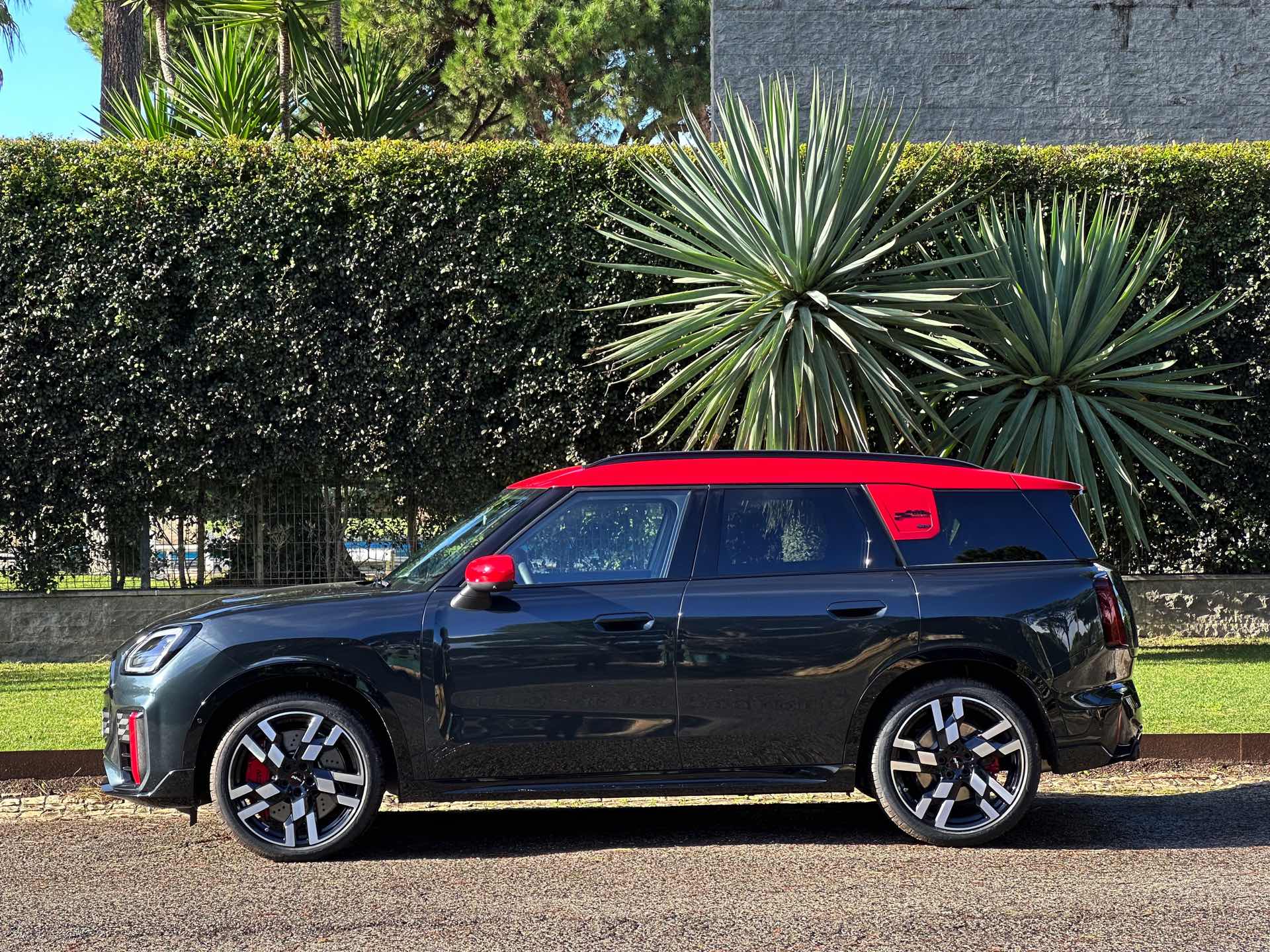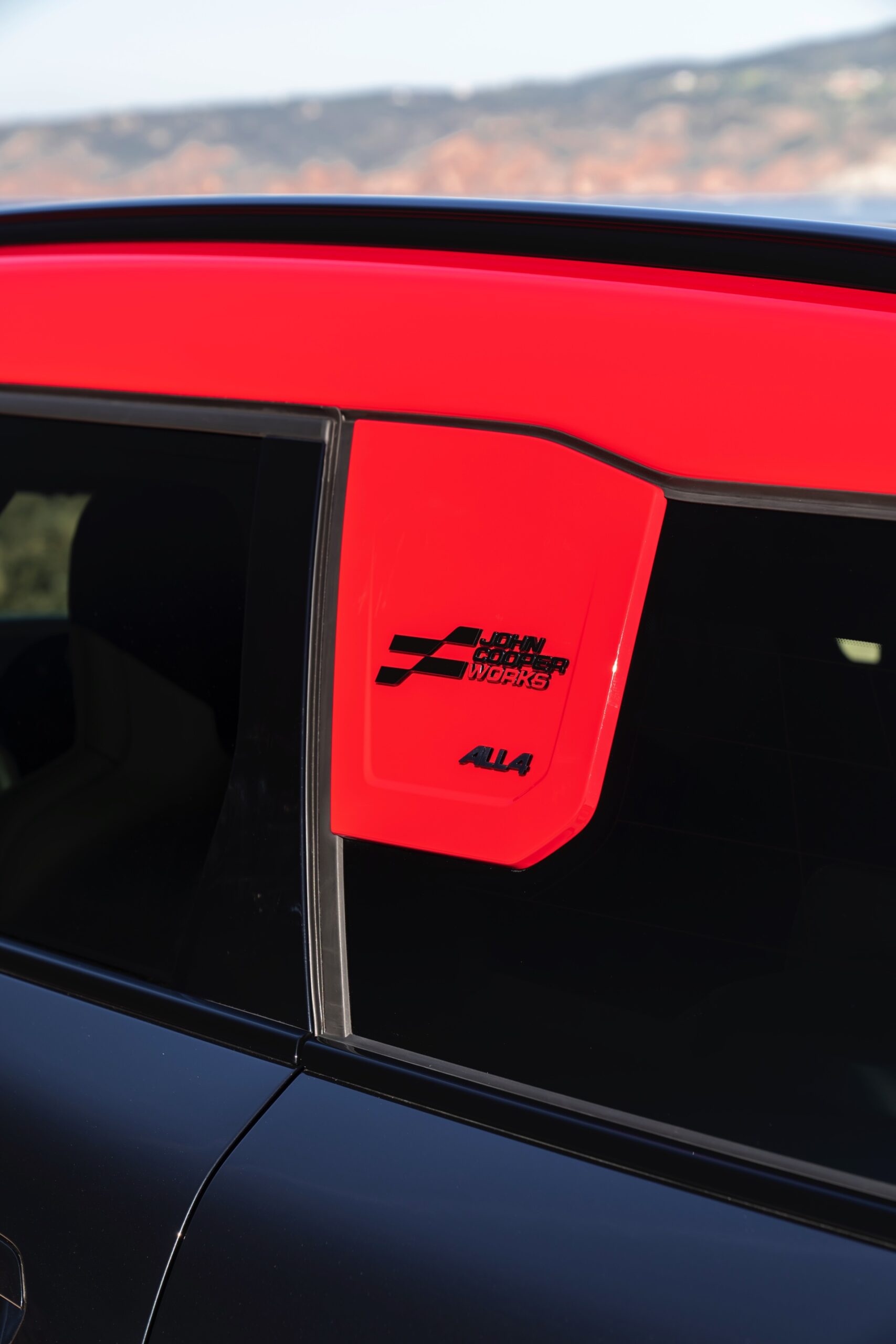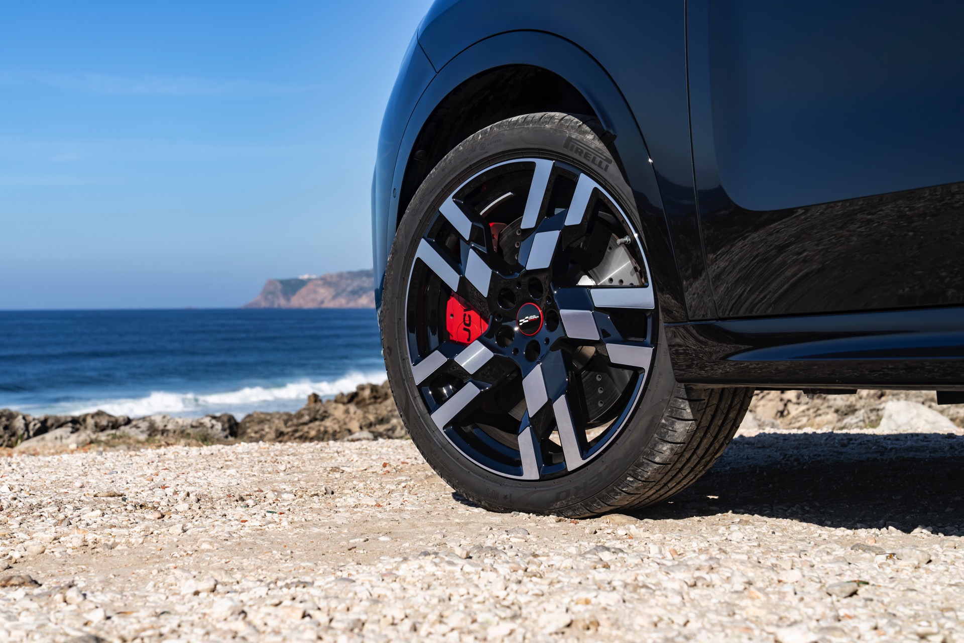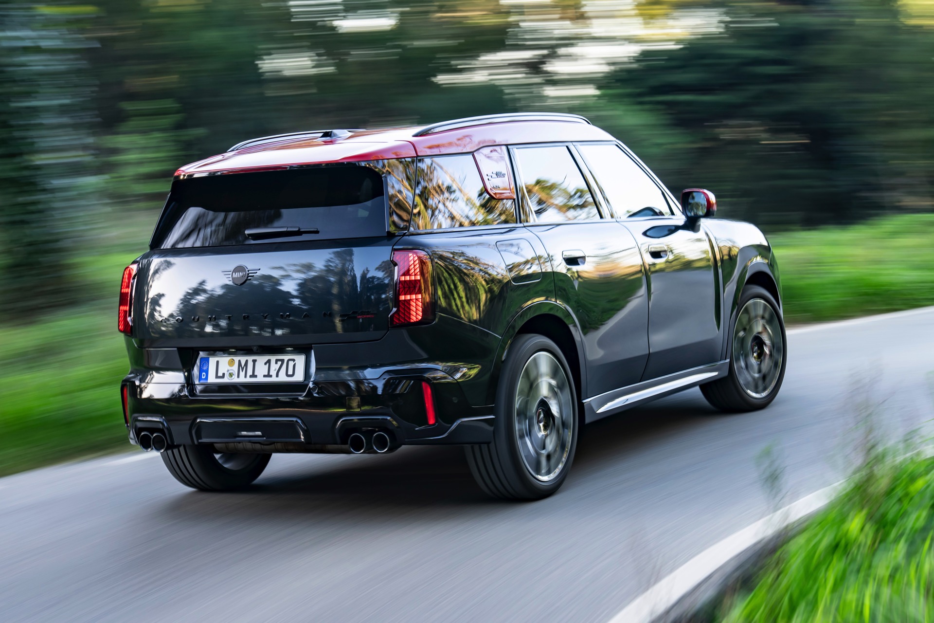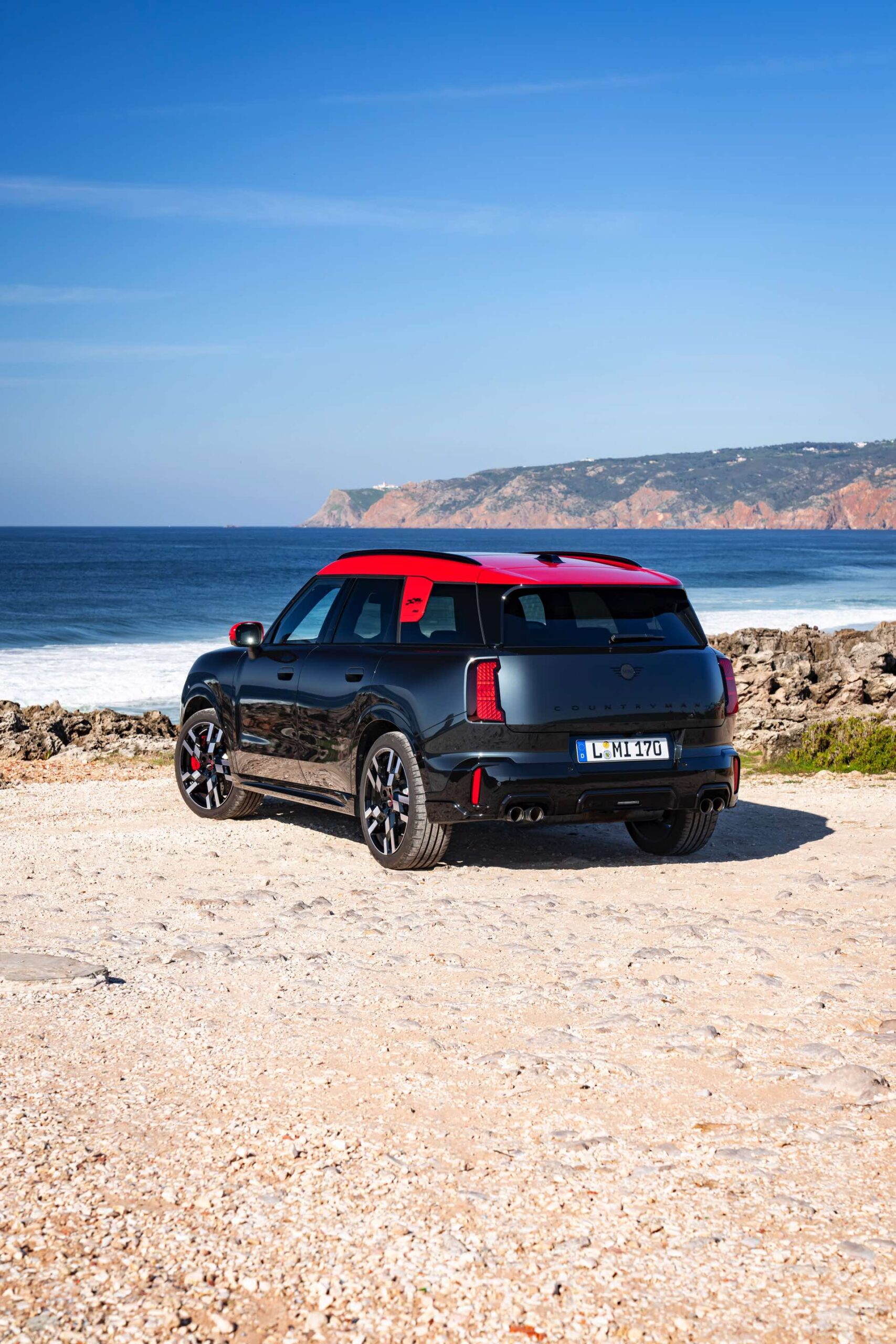 Gleich bei unserem ersten fahraktiven Kontakt mit dem neuen MINI Countryman (U25) durften wir uns dem sportlichen Topmodell widmen und ans Steuer des John Cooper Works. Die 300 PS starke Fahrspaß-Variante ist genau wie die schwächeren Versionen ein echter XXL-MINI geworden, fast viereinhalb Meter lang und deutlich über 1,60 Meter hoch – aber optisch kommen dennoch keine Zweifel daran auf, wo dieses SUV seine Wurzeln hat: In der von uns gefahrenen Konfiguration mit Lackierung in Legend Grey sowie Dach, Spiegelkappen und einigen Details in Chili Red präsentiert sich der Countryman schon auf den ersten Blick im typischen JCW-Style.