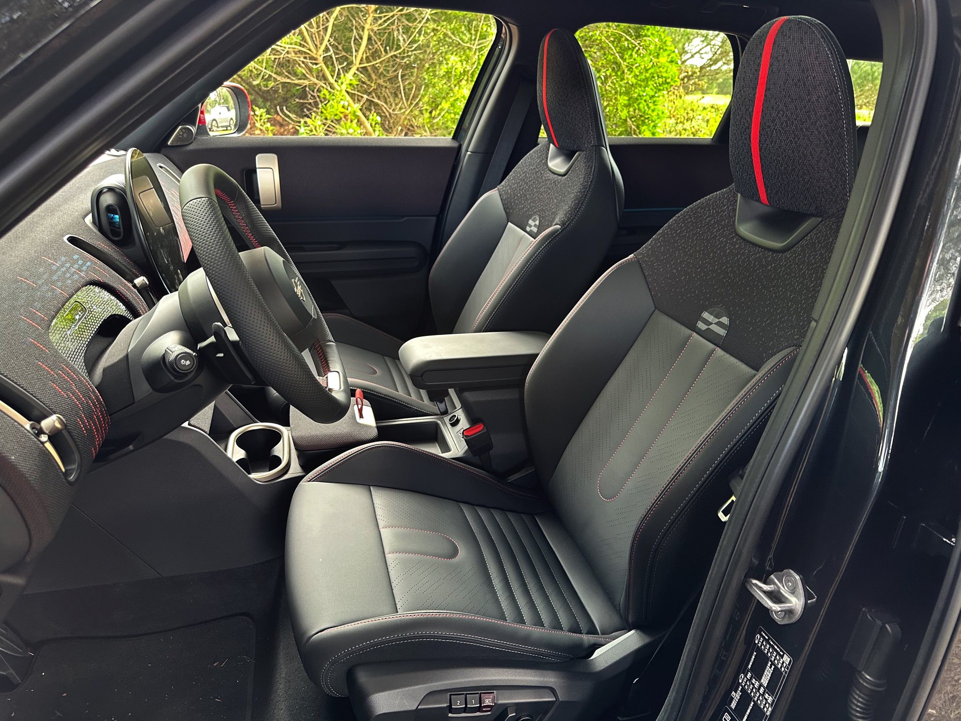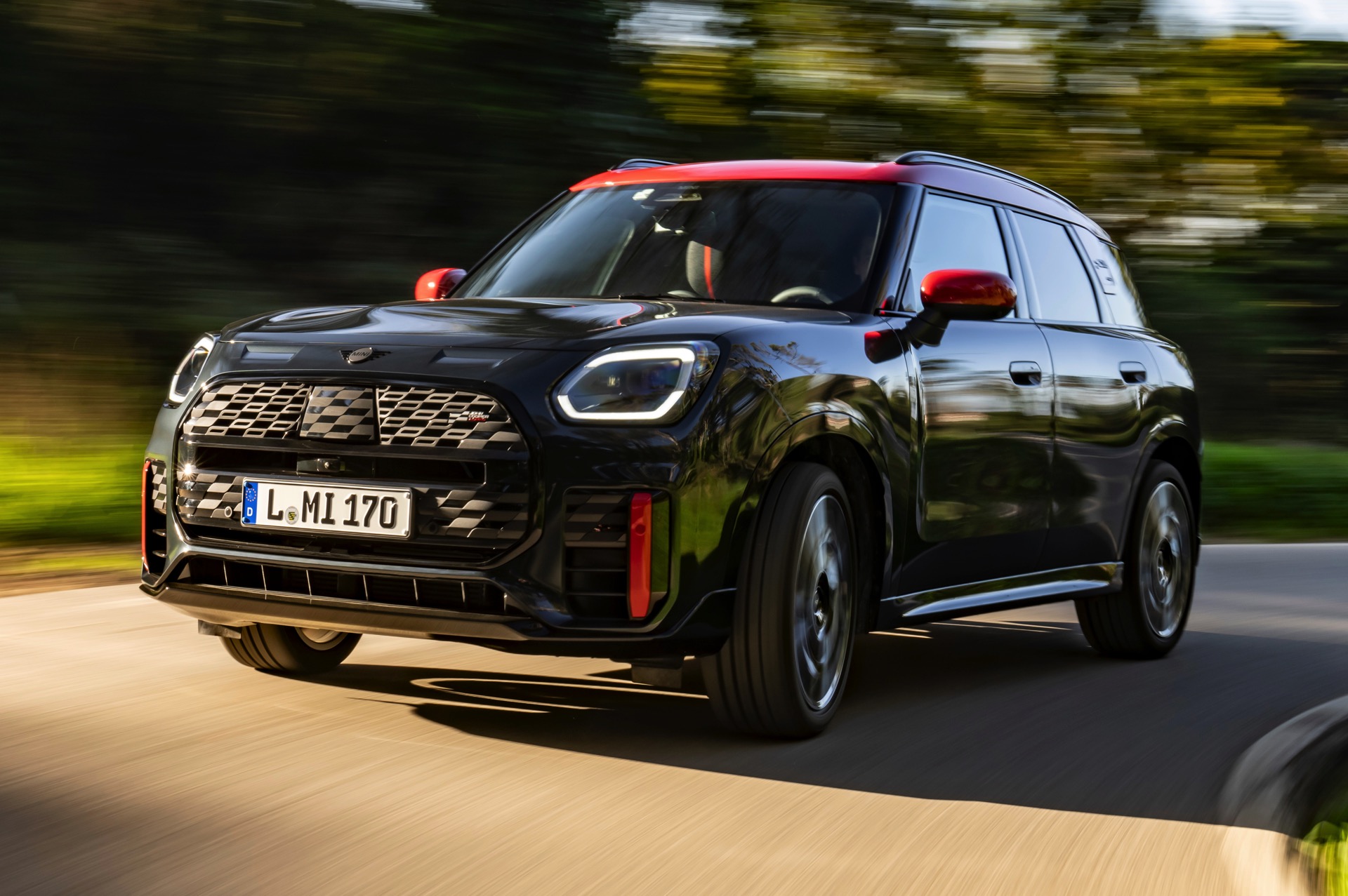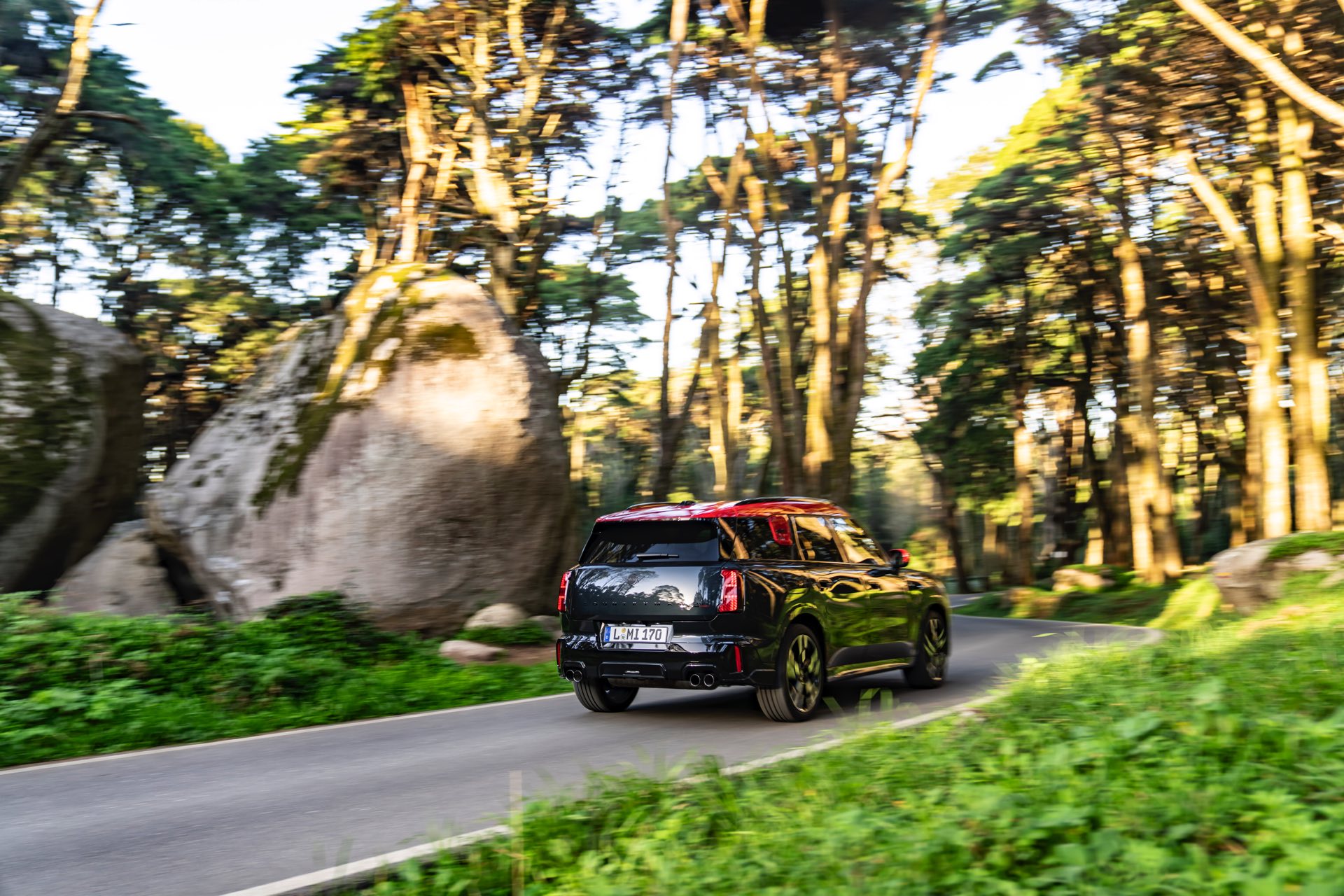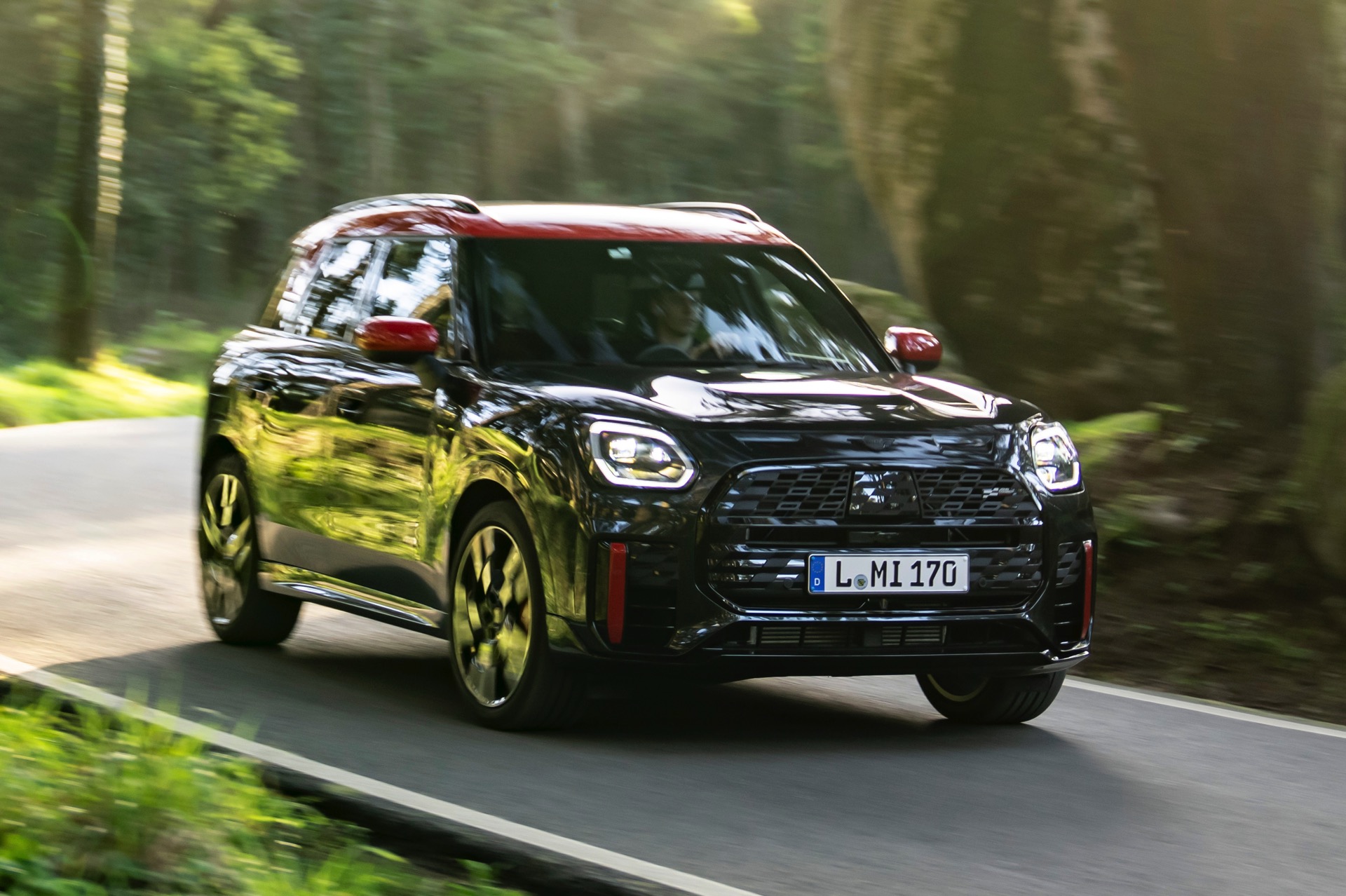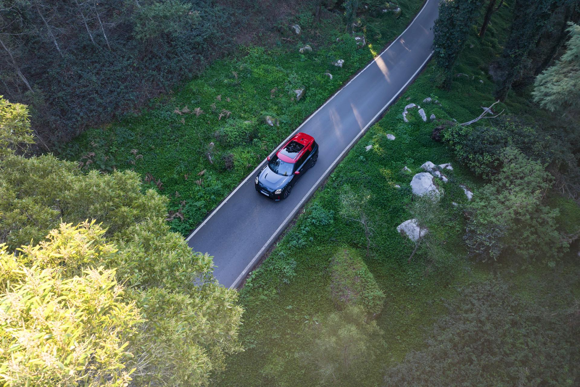 Gleich bei unserem ersten fahraktiven Kontakt mit dem neuen MINI Countryman (U25) durften wir uns dem sportlichen Topmodell widmen und ans Steuer des John Cooper Works. Die 300 PS starke Fahrspaß-Variante ist genau wie die schwächeren Versionen ein echter XXL-MINI geworden, fast viereinhalb Meter lang und deutlich über 1,60 Meter hoch – aber optisch kommen dennoch keine Zweifel daran auf, wo dieses SUV seine Wurzeln hat: In der von uns gefahrenen Konfiguration mit Lackierung in Legend Grey sowie Dach, Spiegelkappen und einigen Details in Chili Red präsentiert sich der Countryman schon auf den ersten Blick im typischen JCW-Style.
