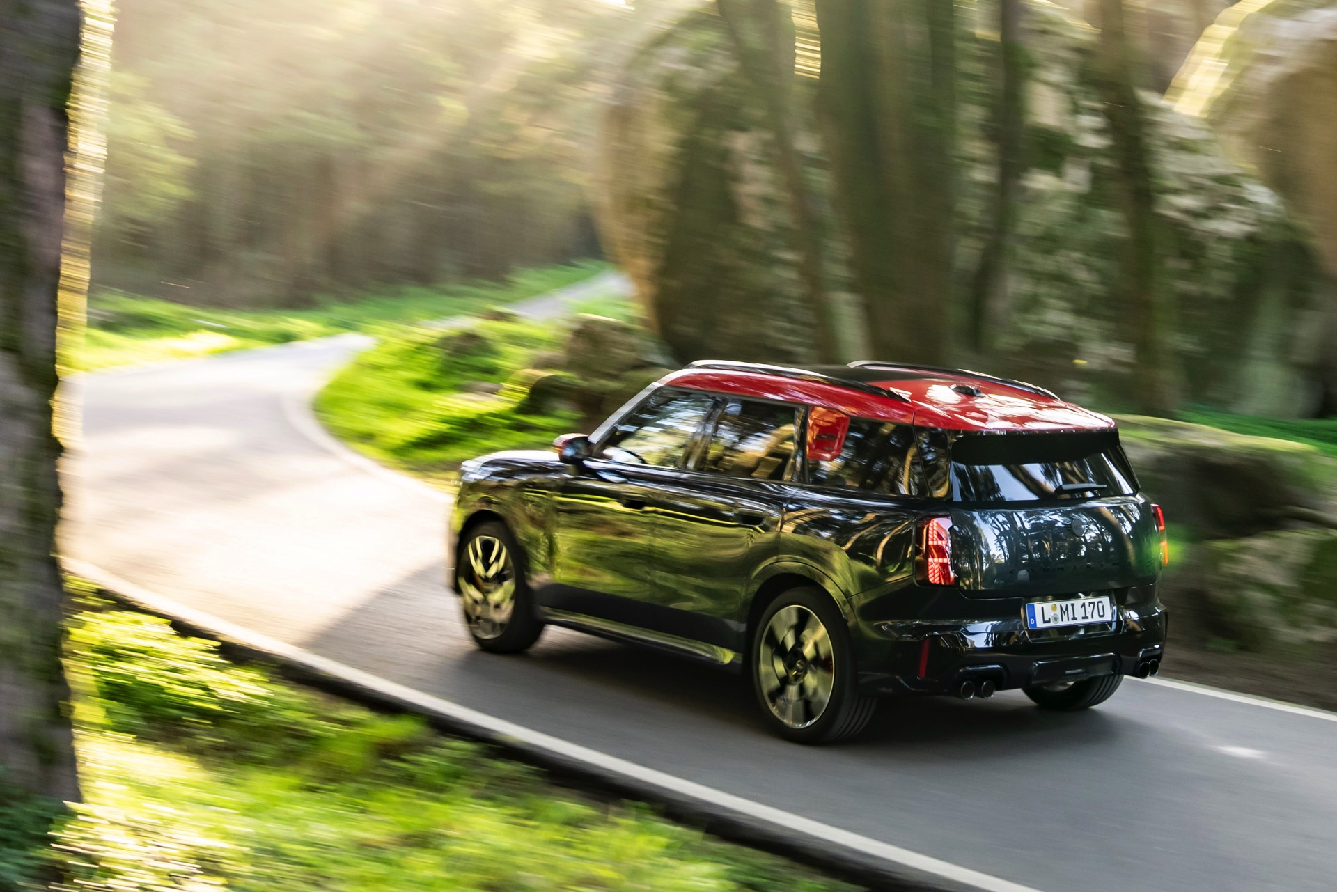 Für den Blick aufs Lenkrad bleibt auf kurvigen Strecken allerdings wenig Zeit, denn dank 300 PS und 400 Newtonmeter Drehmoment ist die Erkundung des Grenzbereichs wesentlich verlockender als alles andere. Dass der Countryman nicht ganz so agil wie ein Gokart um die Kurven wetzt, liegt auf der Hand – aber in seinem Segment zählt er ohne Frage zu den größten Spaßmachern überhaupt. Dank des ALL4 genannten Allradantriebs sind dem JCW Traktionsprobleme fremd, stattdessen powert er souverän aus jeder Ecke heraus und bleibt auch bei hohem Tempo ausgesprochen neutral. Keine Frage: Um hier Fahrspaß zu erleben, muss man nicht auf die AirConsole ausweichen.