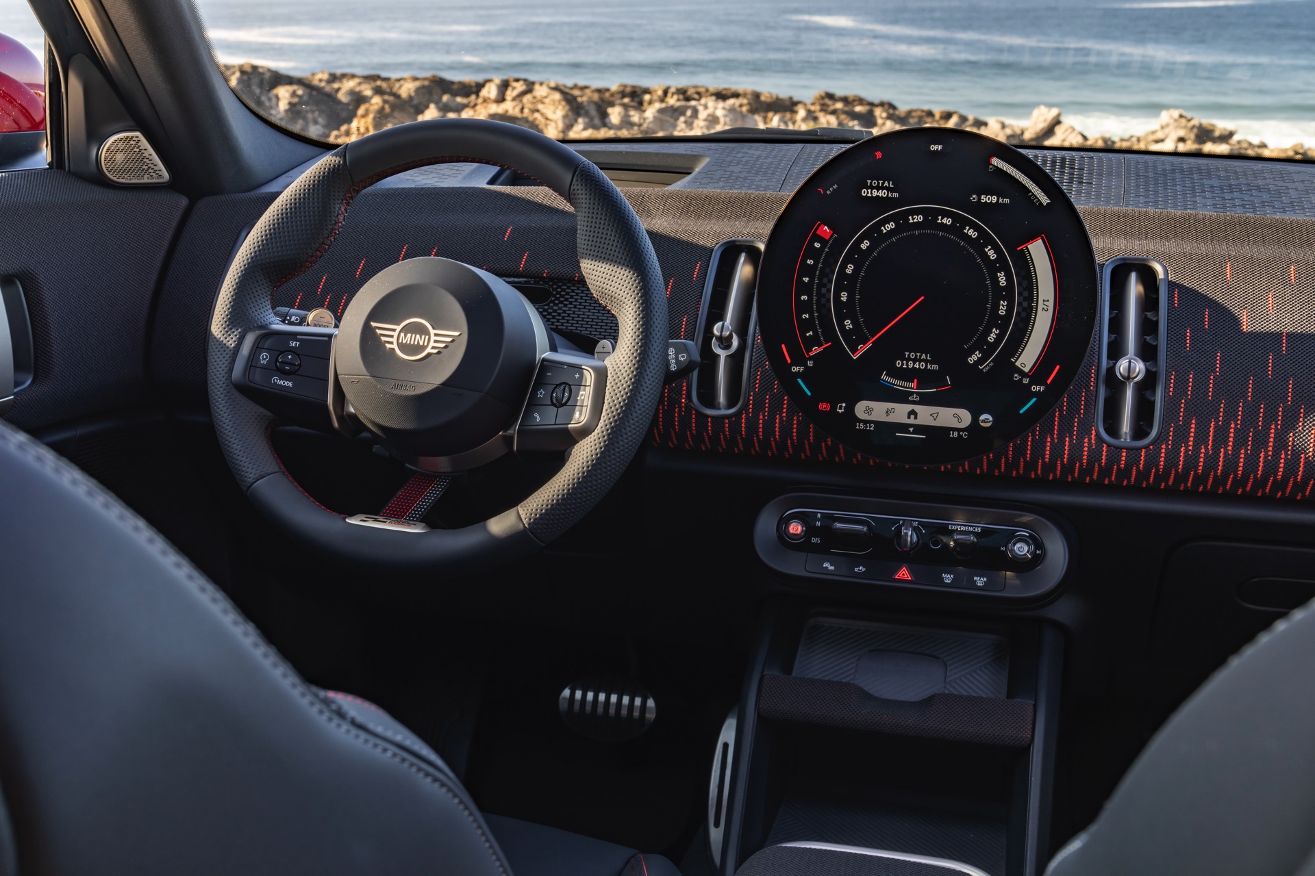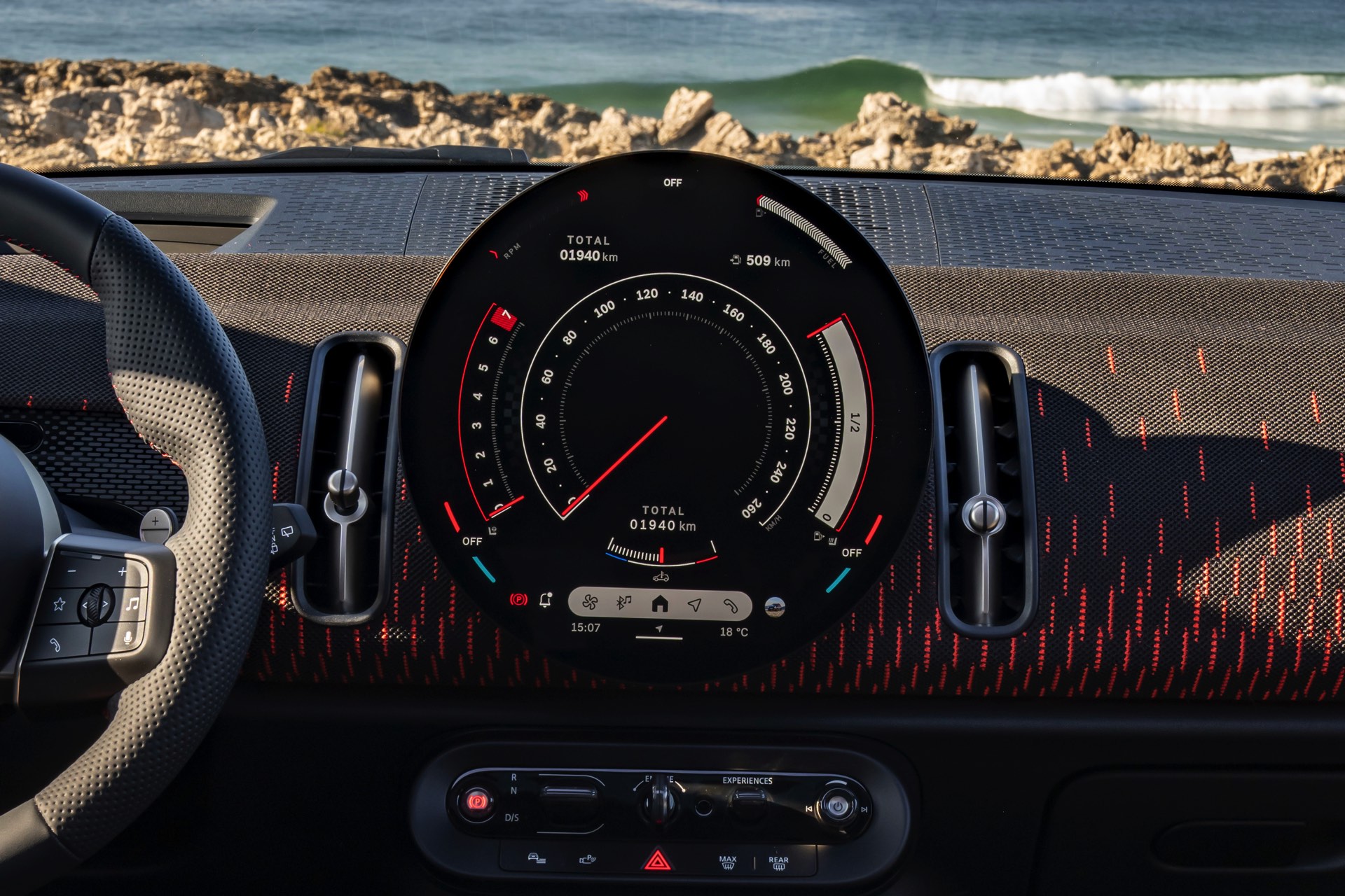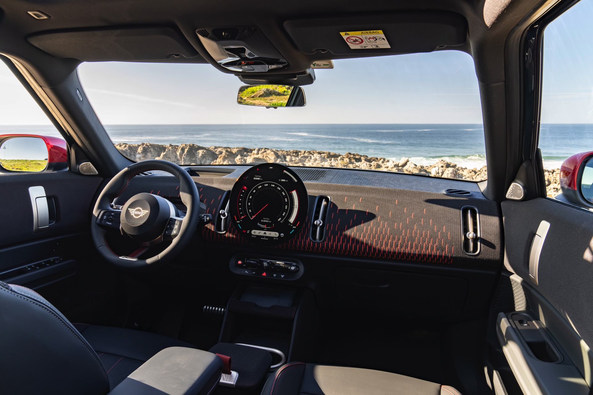 Die wichtigere Frage ist allerdings, ob ein SUV in diesem Format auch den markentypischen Fahrspaß vermitteln und das traditionsreiche Kürzel mit Recht tragen kann. Die Antwort gibt der neue Countryman John Cooper Works Schritt für Schritt, wobei Eines schnell klar wird: Bei diesem Auto durften die Entwickler ihrer Kreativität freien Lauf lassen, ausgetretene Pfade verlassen und sich ganz bewusst den einen oder anderen Spaß erlauben. Das zeigt sich nicht nur, wenn beim Einsteigen das riesige runde OLED-Display zum Leben erwacht, sondern auch bei eigentlich unverdächtigen Handgriffen wie dem Drücken des Startknopfs – denn statt einem langweiligen Knopfdruck trägt der Countryman einen Schalter im klassischen Toggle-Switch-Design, der zum Motorstart wie ein Zündschlüssel nach rechts gedreht werden muss. Schon an dieser Stelle legt sich ein erstes Grinsen aufs Gesicht, das vom kernigen Begrüßungsbrüller des Vierzylinders noch verstärkt wird. "