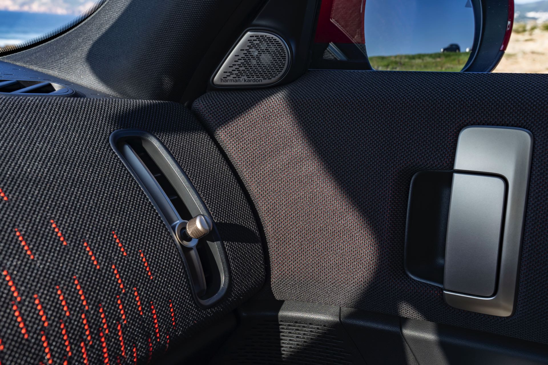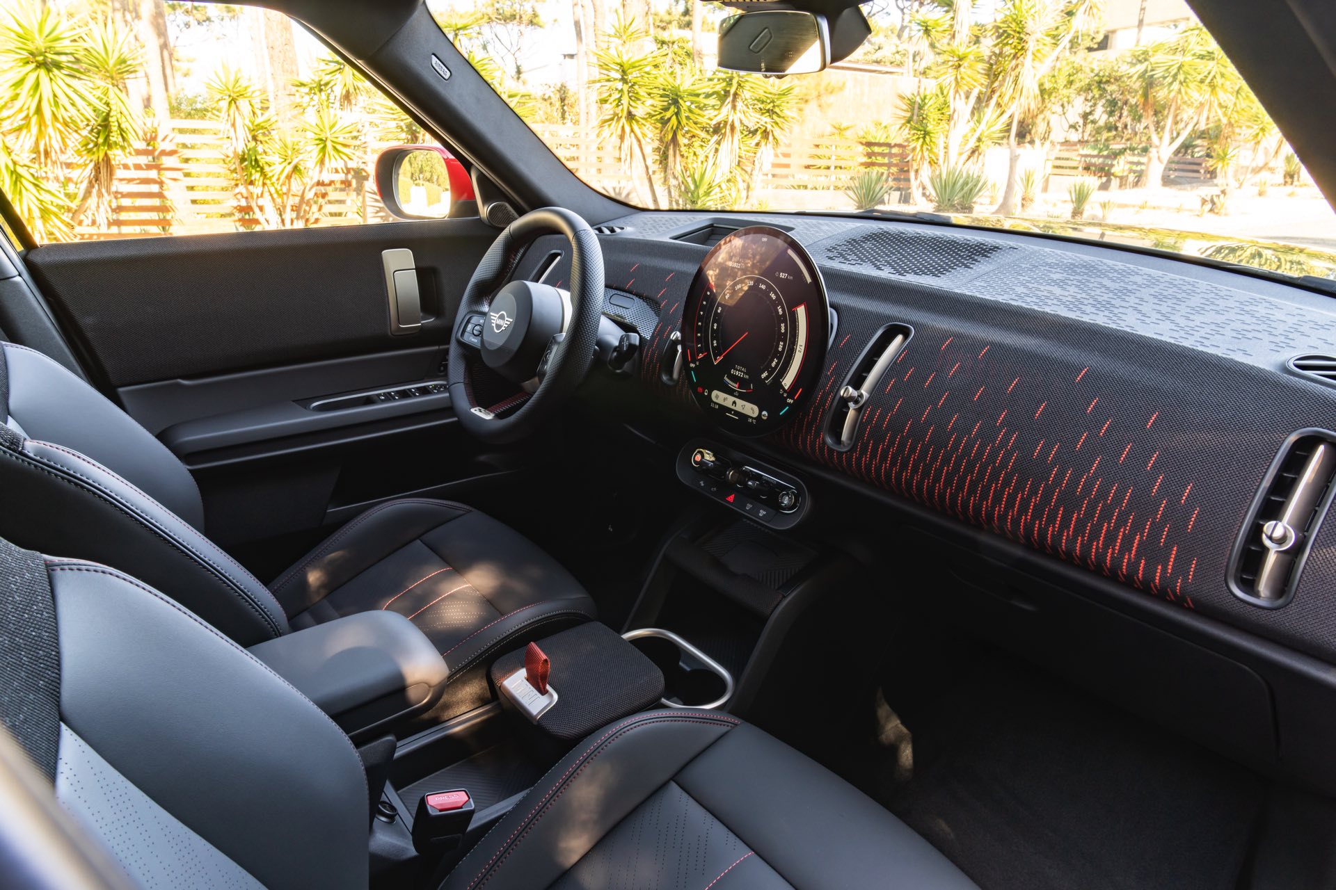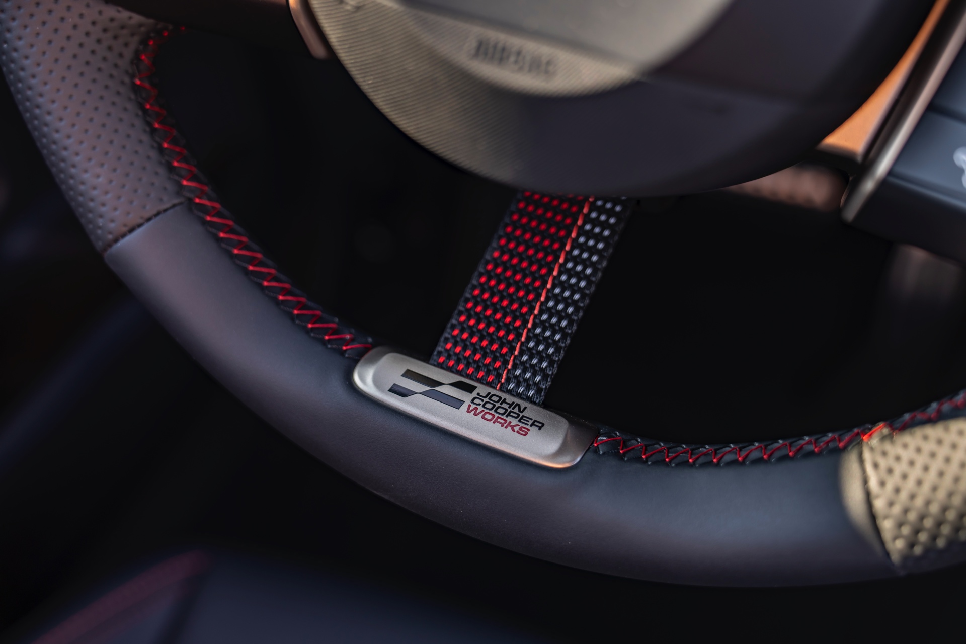 Die wichtigere Frage ist allerdings, ob ein SUV in diesem Format auch den markentypischen Fahrspaß vermitteln und das traditionsreiche Kürzel mit Recht tragen kann. Die Antwort gibt der neue Countryman John Cooper Works Schritt für Schritt, wobei Eines schnell klar wird: Bei diesem Auto durften die Entwickler ihrer Kreativität freien Lauf lassen, ausgetretene Pfade verlassen und sich ganz bewusst den einen oder anderen Spaß erlauben. Das zeigt sich nicht nur, wenn beim Einsteigen das riesige runde OLED-Display zum Leben erwacht, sondern auch bei eigentlich unverdächtigen Handgriffen wie dem Drücken des Startknopfs – denn statt einem langweiligen Knopfdruck trägt der Countryman einen Schalter im klassischen Toggle-Switch-Design, der zum Motorstart wie ein Zündschlüssel nach rechts gedreht werden muss. Schon an dieser Stelle legt sich ein erstes Grinsen aufs Gesicht, das vom kernigen Begrüßungsbrüller des Vierzylinders noch verstärkt wird. "