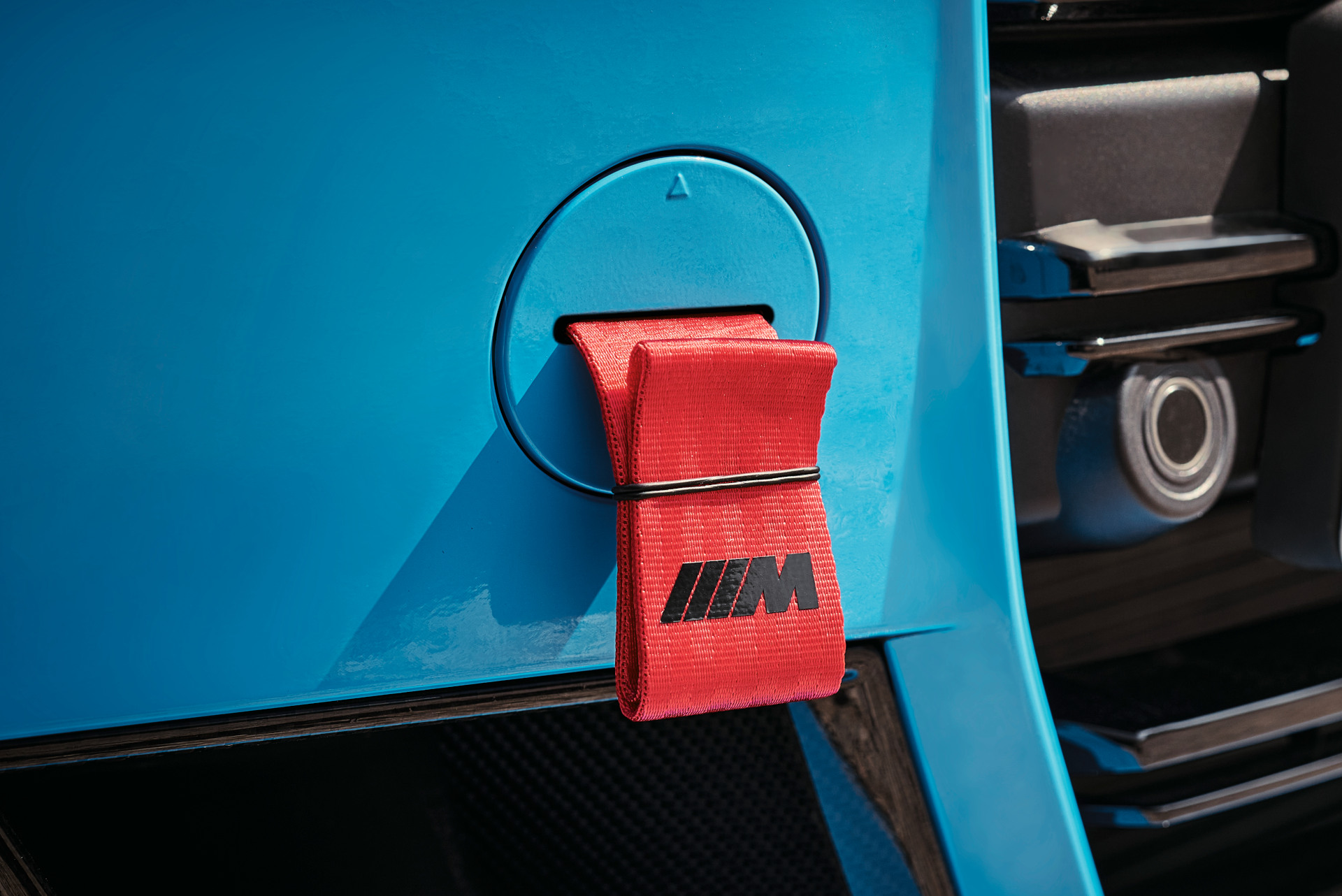 In einem aktuellen Video sehen wir das rote Abschleppband mit seinem schwarzen M-Logo nicht nur in seiner verbauten Variante, sondern auch in einsatzbereiter Form: Wird das Gummiband entfernt, kann die Lasche schnell und einfach zum Einhaken eines Abschleppseils per Karabinerhaken genutzt werden. Für diesen “Ernstfall” sollte aber auch die auf Wunsch mit einem Schlitz versehene Kunststoff-Abdeckung entfernt werden, durch die das Band im Regelfall geführt wird.