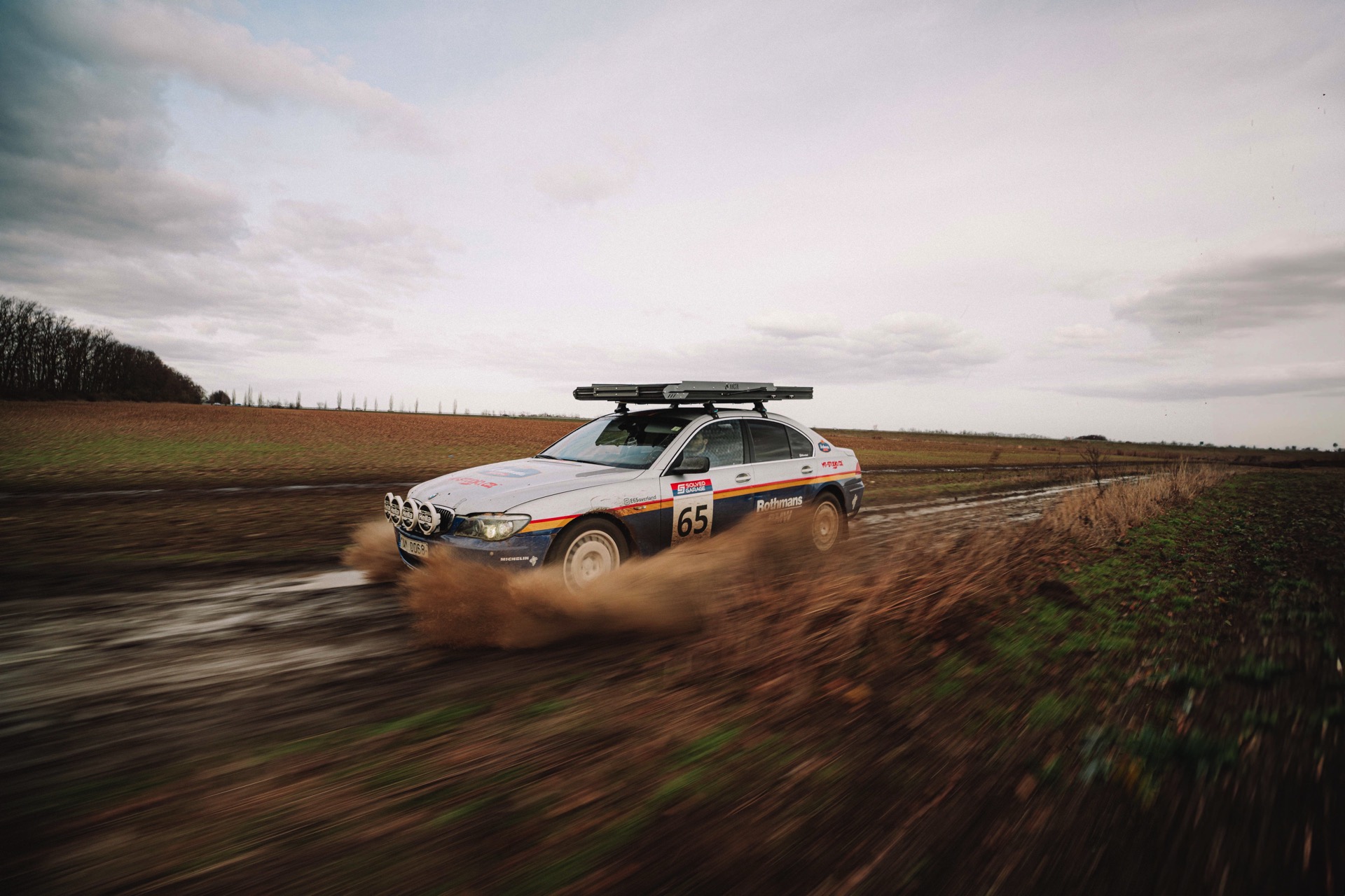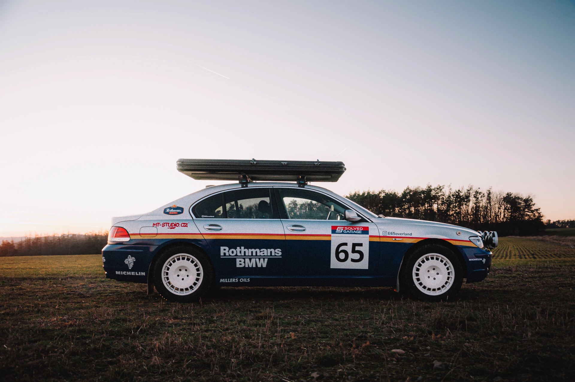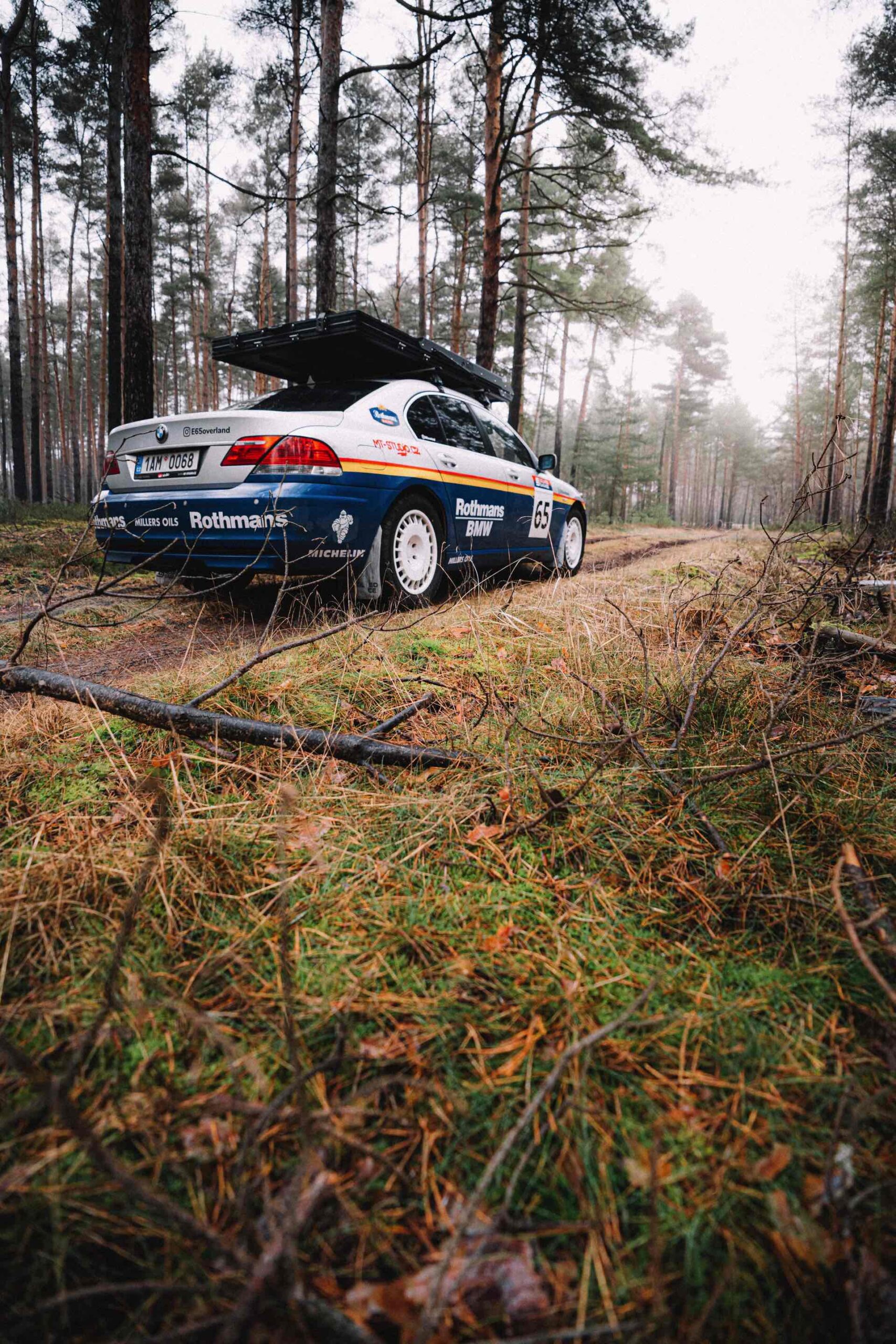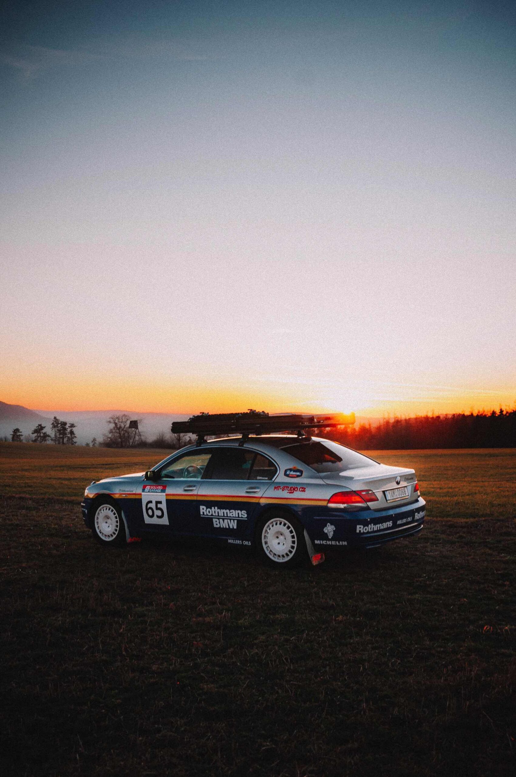 Der einst als 730d geborene Diesel-7er trägt nun nicht nur eine markante Folierung im Look diverser Rallye-Sportler mit Rothmans-Sponsoring, sondern auch 18 Zoll große Rota-Räder und ein gründlich überarbeitetes Fahrwerk. In Summe sorgen die Änderungen für zwei Inch oder rund fünf Zentimeter Höherlegung, womit der 7er deutlich besser für Offroad-Fahrten ausgerüstet ist. Aller Abenteuerlust zum Trotz verfügt die Limousine (noch) nicht über einen Allradantrieb, nur ein Sperrdifferenzial sorgt für mehr Traktion an der Hinterachse. Für ernsthafte Rallye-Einsätze ist die Limousine also noch nicht qualifiziert, aber spektakuläre Fotos und Videos sind auch heute schon möglich: