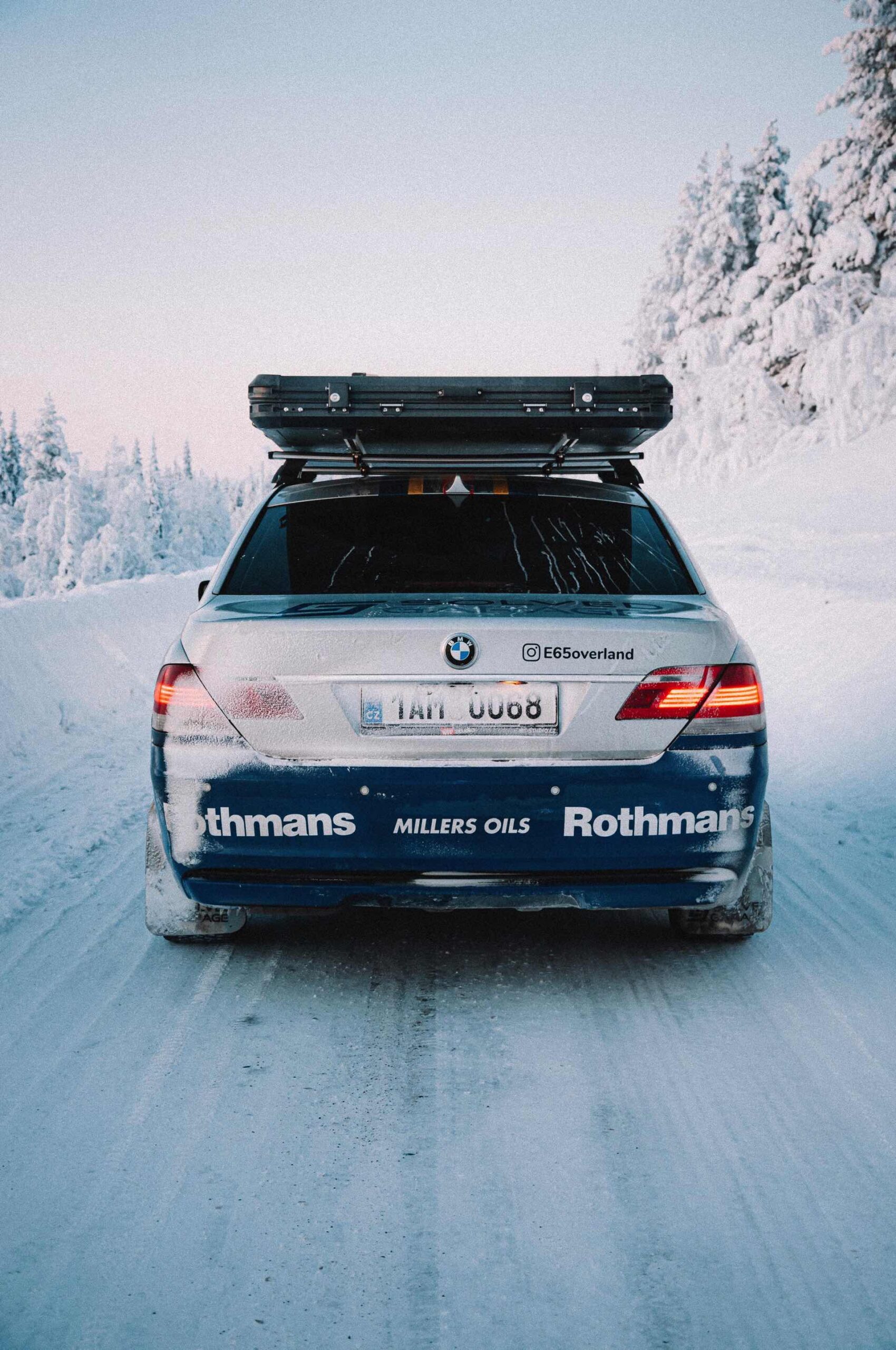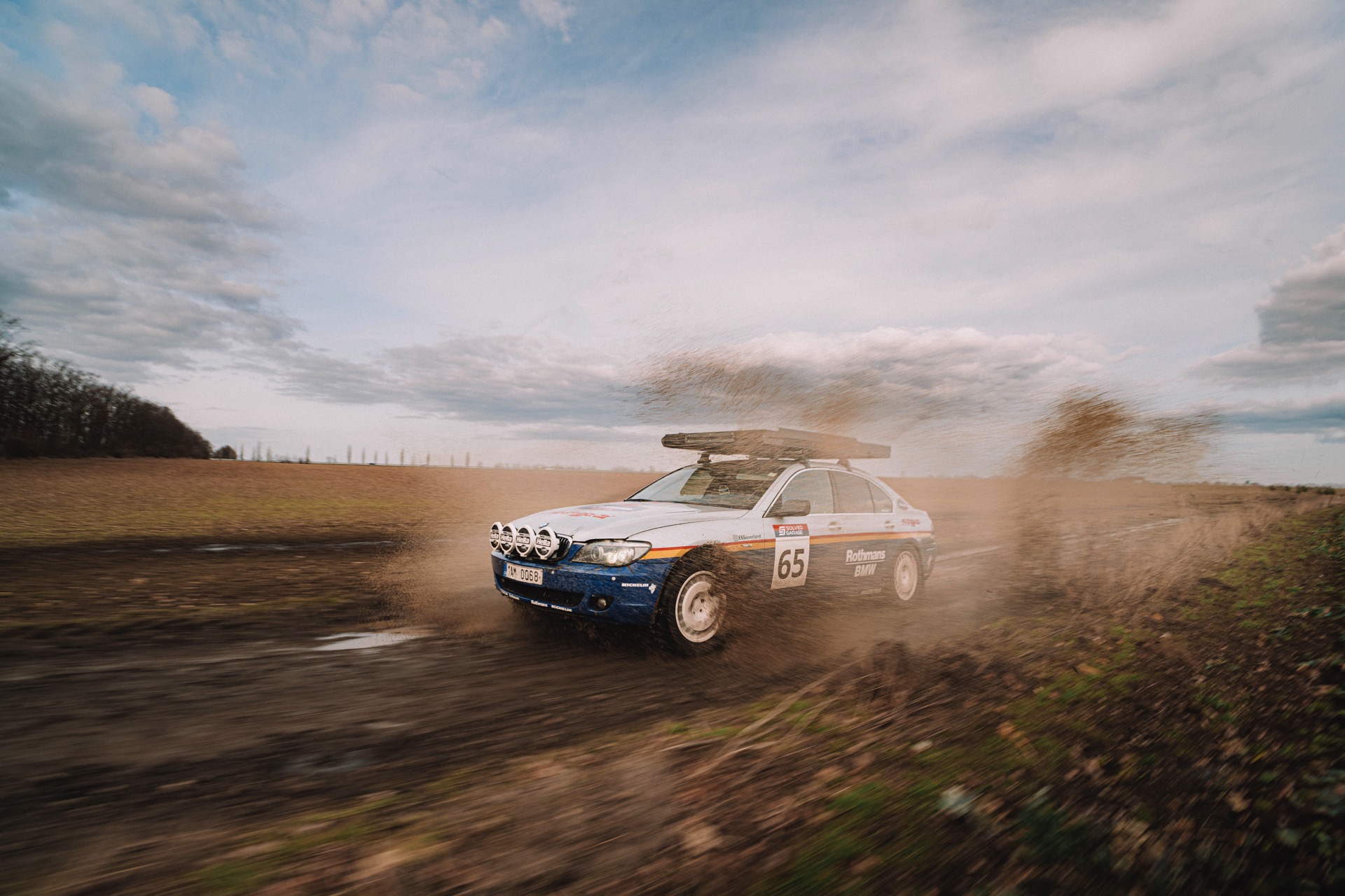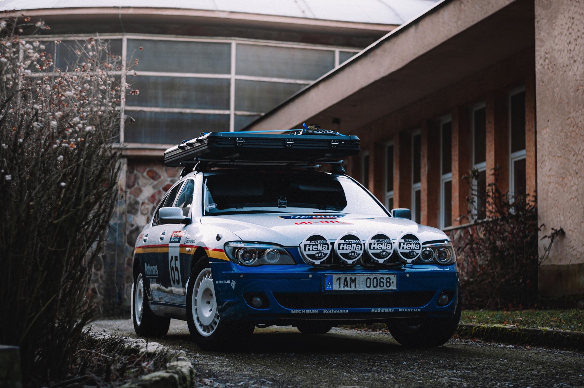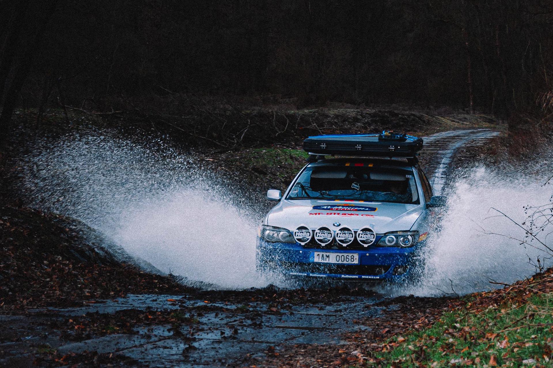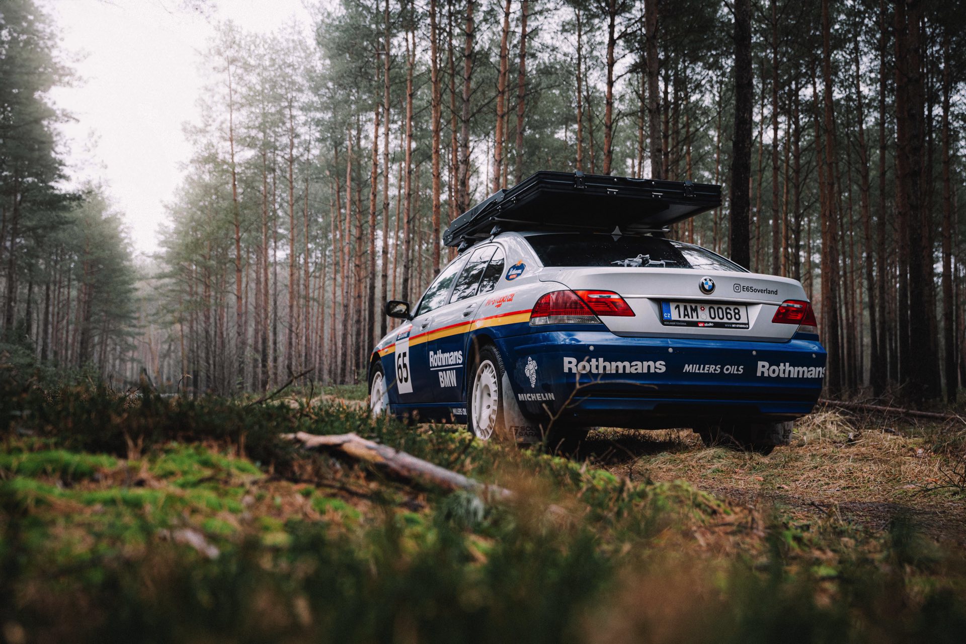 Der einst als 730d geborene Diesel-7er trägt nun nicht nur eine markante Folierung im Look diverser Rallye-Sportler mit Rothmans-Sponsoring, sondern auch 18 Zoll große Rota-Räder und ein gründlich überarbeitetes Fahrwerk. In Summe sorgen die Änderungen für zwei Inch oder rund fünf Zentimeter Höherlegung, womit der 7er deutlich besser für Offroad-Fahrten ausgerüstet ist. Aller Abenteuerlust zum Trotz verfügt die Limousine (noch) nicht über einen Allradantrieb, nur ein Sperrdifferenzial sorgt für mehr Traktion an der Hinterachse. Für ernsthafte Rallye-Einsätze ist die Limousine also noch nicht qualifiziert, aber spektakuläre Fotos und Videos sind auch heute schon möglich:
