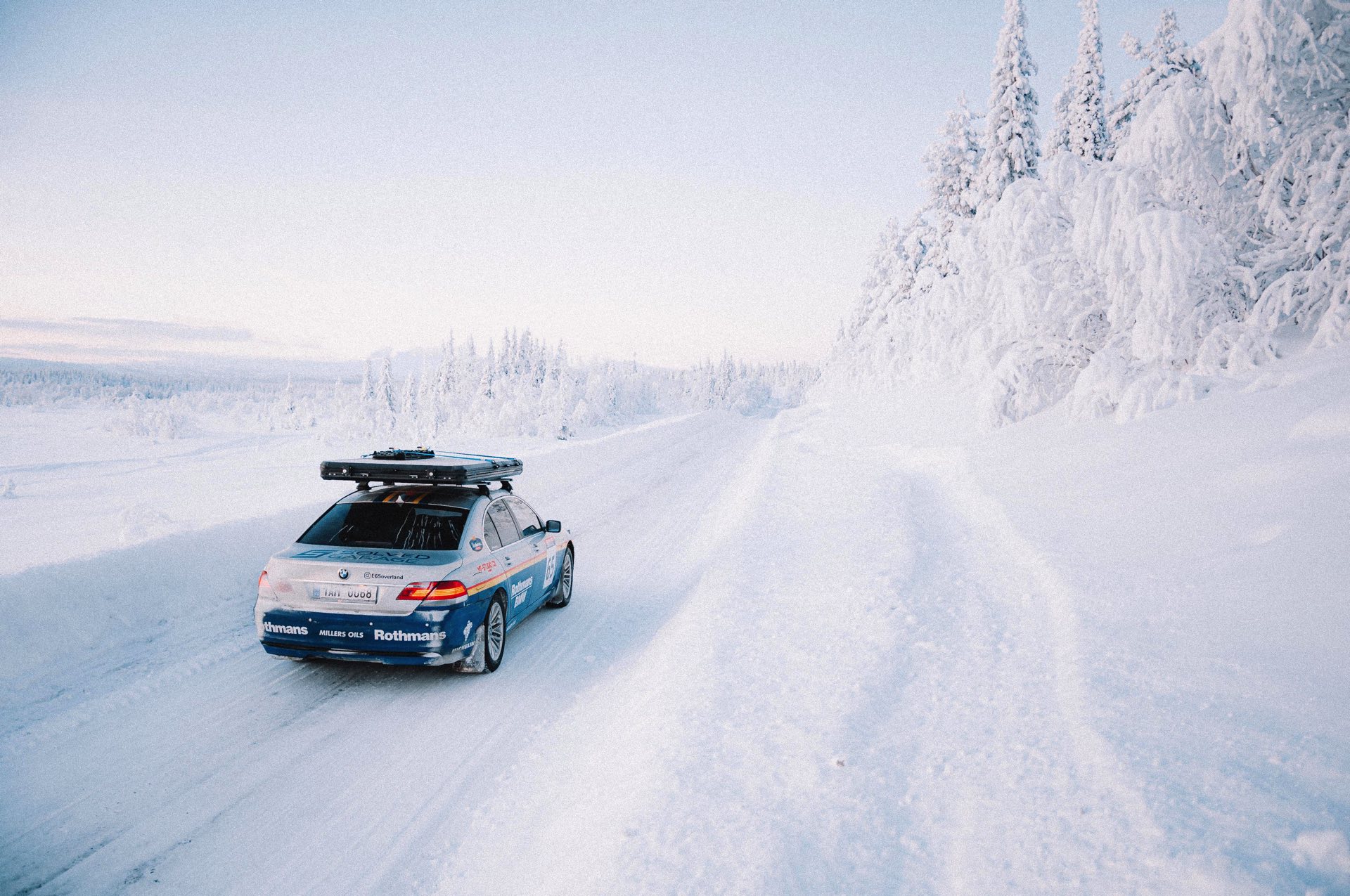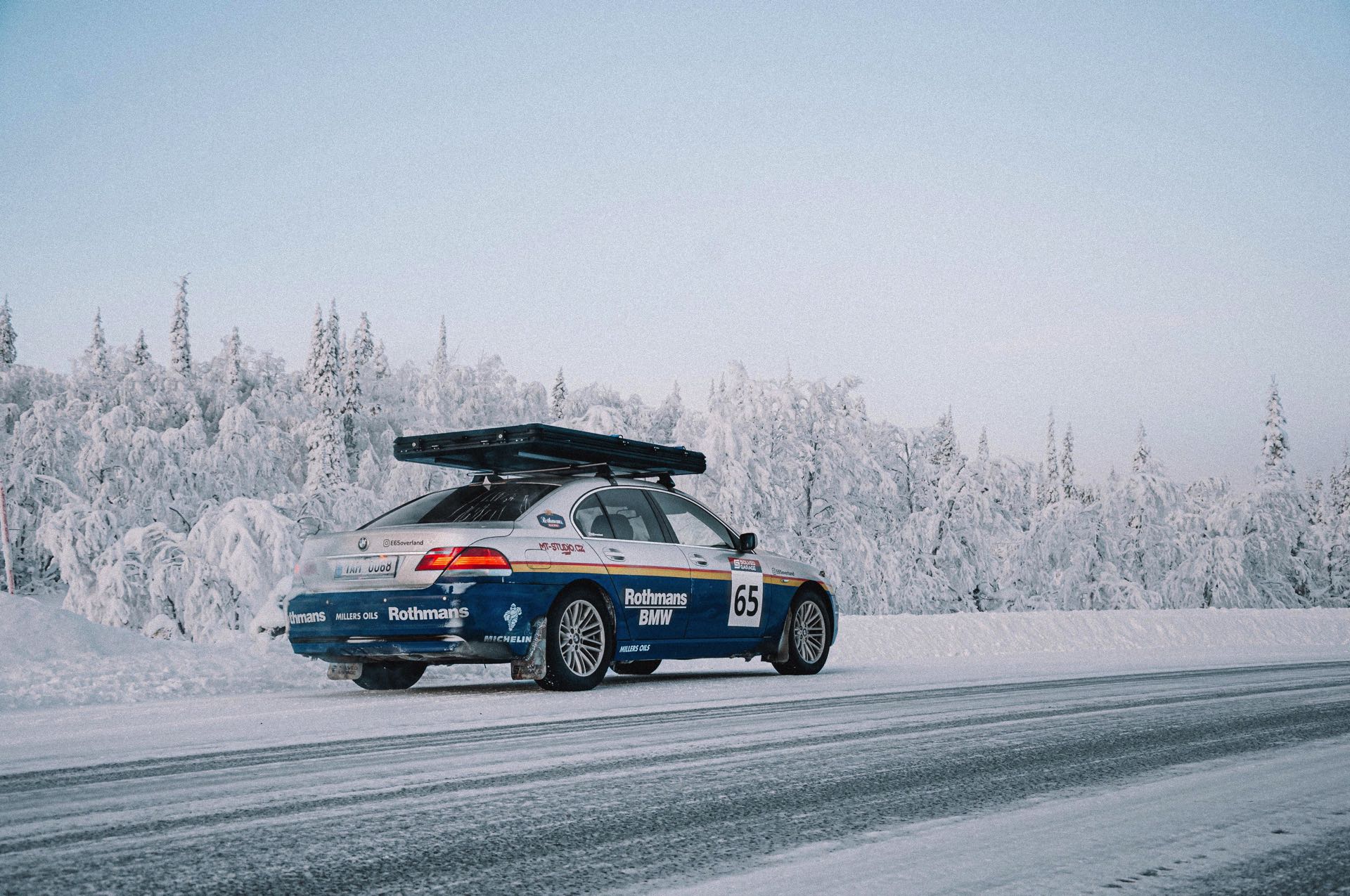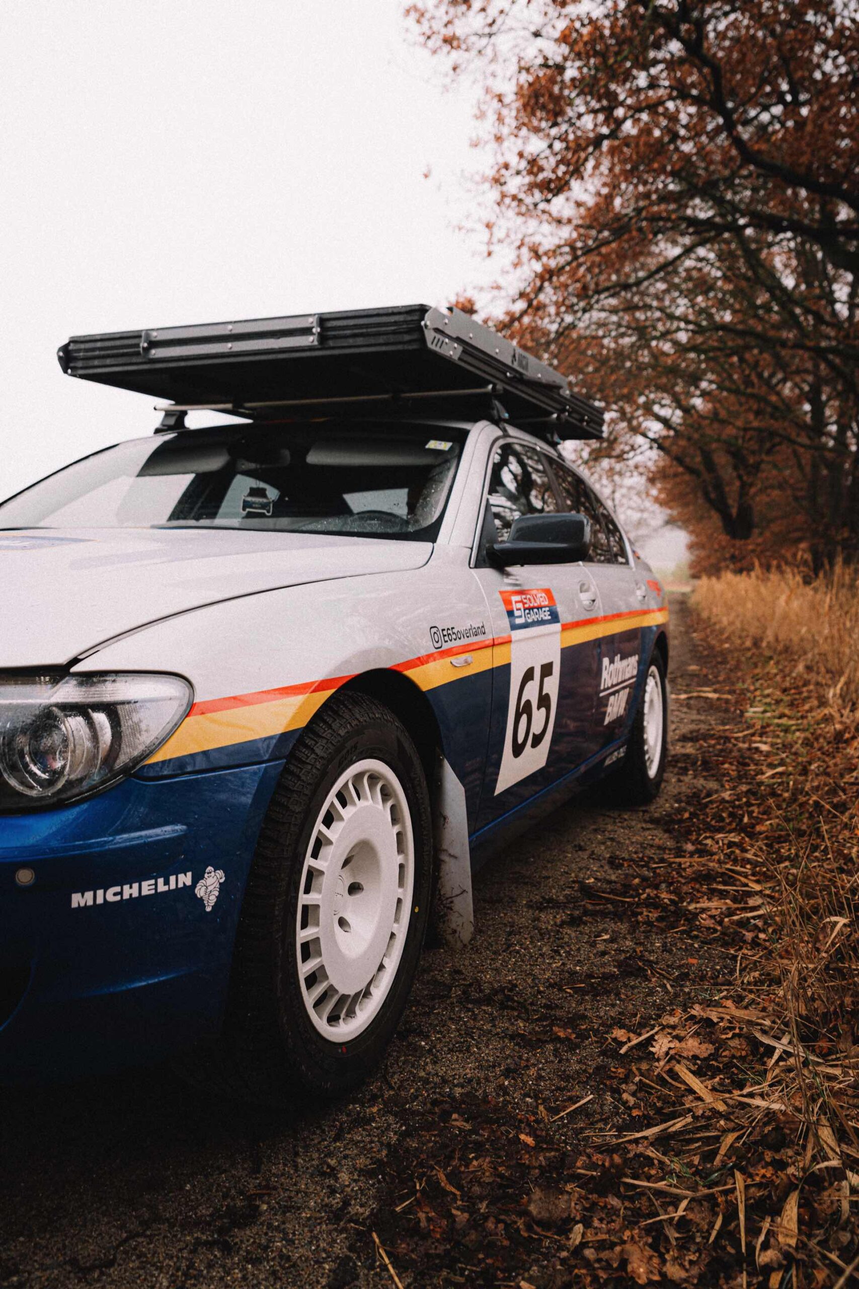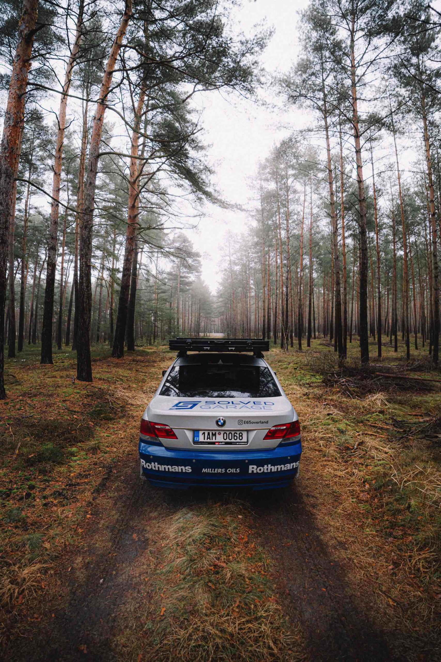 Der einst als 730d geborene Diesel-7er trägt nun nicht nur eine markante Folierung im Look diverser Rallye-Sportler mit Rothmans-Sponsoring, sondern auch 18 Zoll große Rota-Räder und ein gründlich überarbeitetes Fahrwerk. In Summe sorgen die Änderungen für zwei Inch oder rund fünf Zentimeter Höherlegung, womit der 7er deutlich besser für Offroad-Fahrten ausgerüstet ist. Aller Abenteuerlust zum Trotz verfügt die Limousine (noch) nicht über einen Allradantrieb, nur ein Sperrdifferenzial sorgt für mehr Traktion an der Hinterachse. Für ernsthafte Rallye-Einsätze ist die Limousine also noch nicht qualifiziert, aber spektakuläre Fotos und Videos sind auch heute schon möglich: