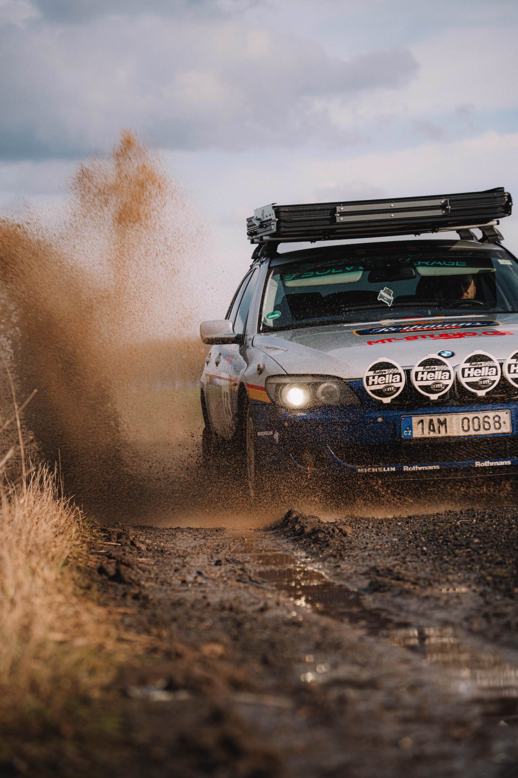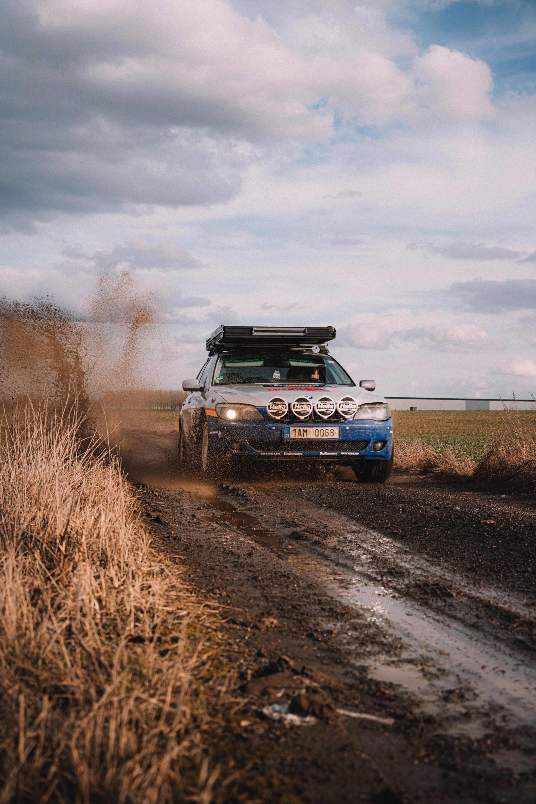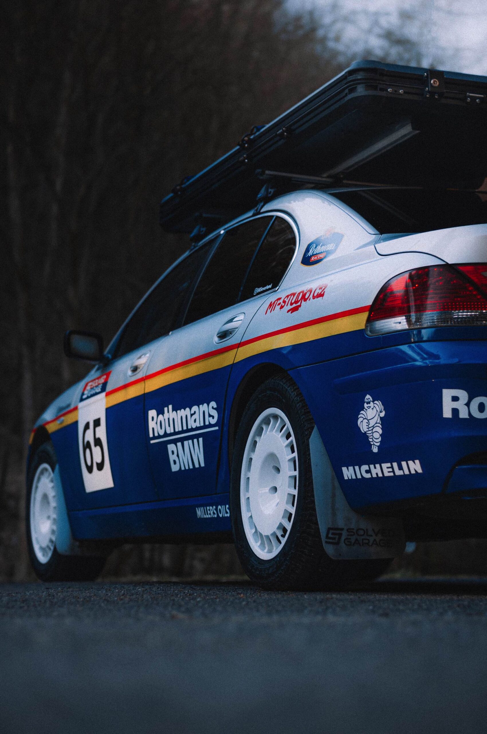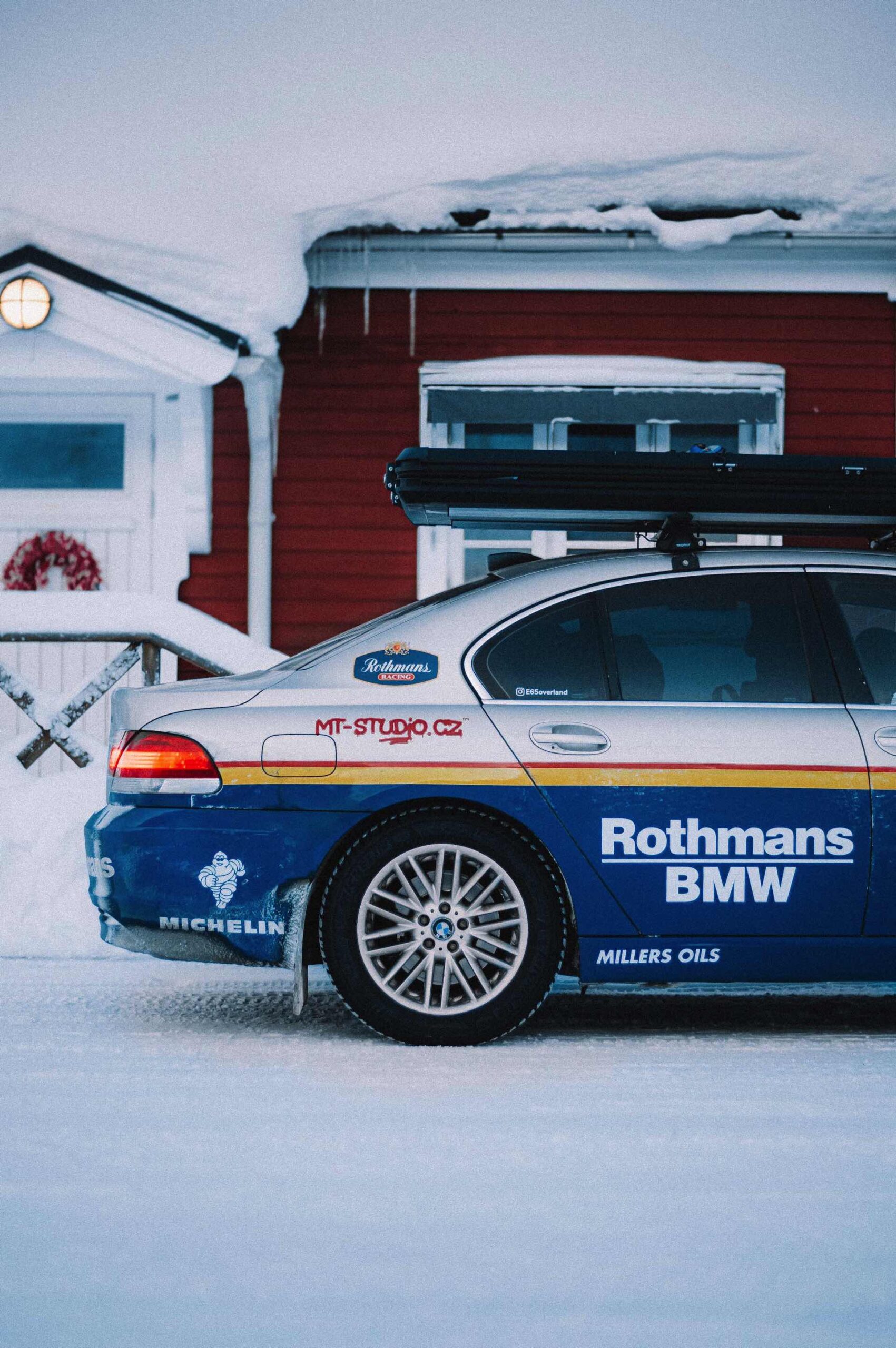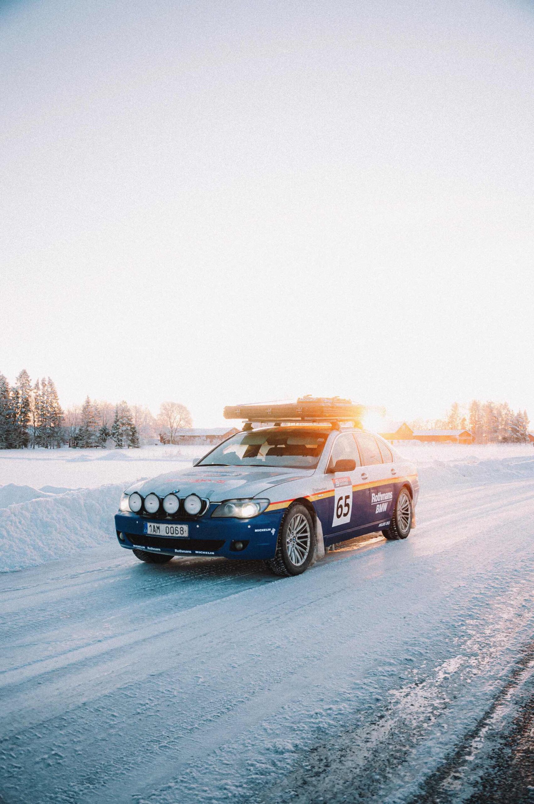 Der einst als 730d geborene Diesel-7er trägt nun nicht nur eine markante Folierung im Look diverser Rallye-Sportler mit Rothmans-Sponsoring, sondern auch 18 Zoll große Rota-Räder und ein gründlich überarbeitetes Fahrwerk. In Summe sorgen die Änderungen für zwei Inch oder rund fünf Zentimeter Höherlegung, womit der 7er deutlich besser für Offroad-Fahrten ausgerüstet ist. Aller Abenteuerlust zum Trotz verfügt die Limousine (noch) nicht über einen Allradantrieb, nur ein Sperrdifferenzial sorgt für mehr Traktion an der Hinterachse. Für ernsthafte Rallye-Einsätze ist die Limousine also noch nicht qualifiziert, aber spektakuläre Fotos und Videos sind auch heute schon möglich: