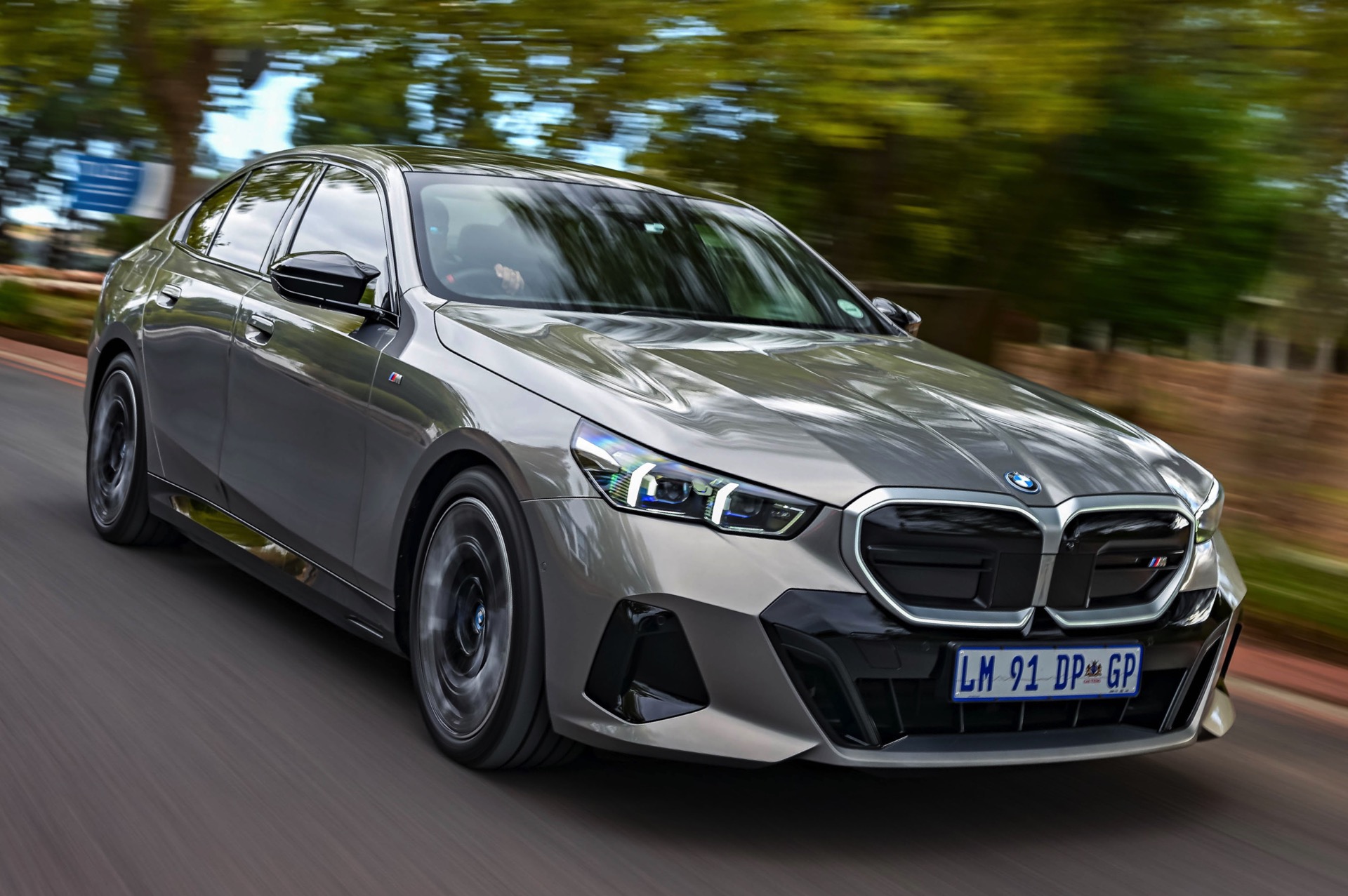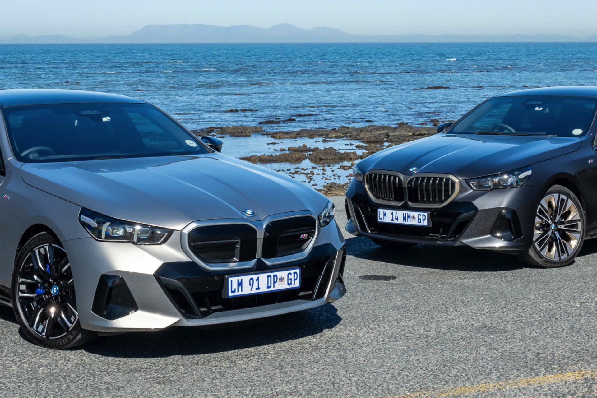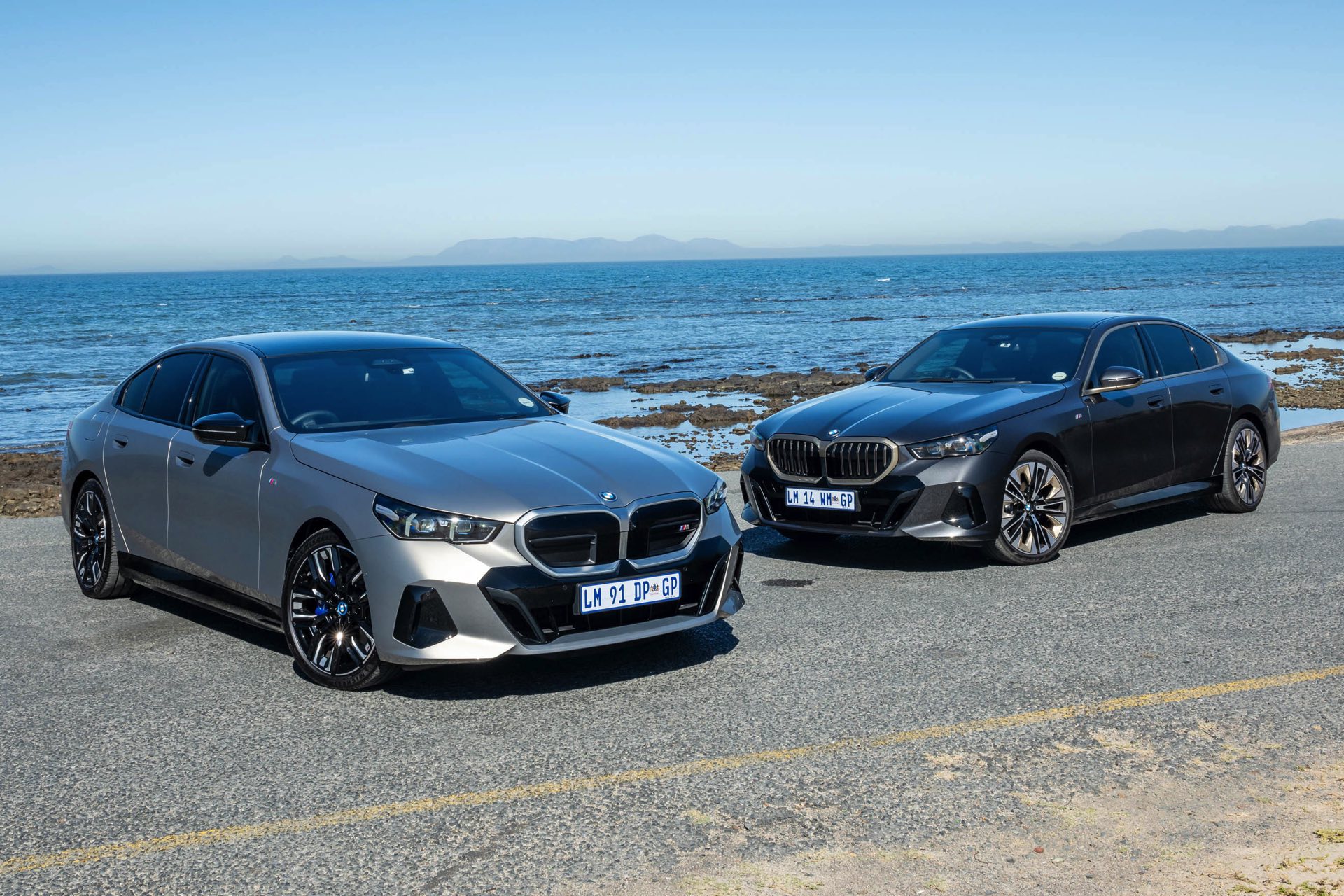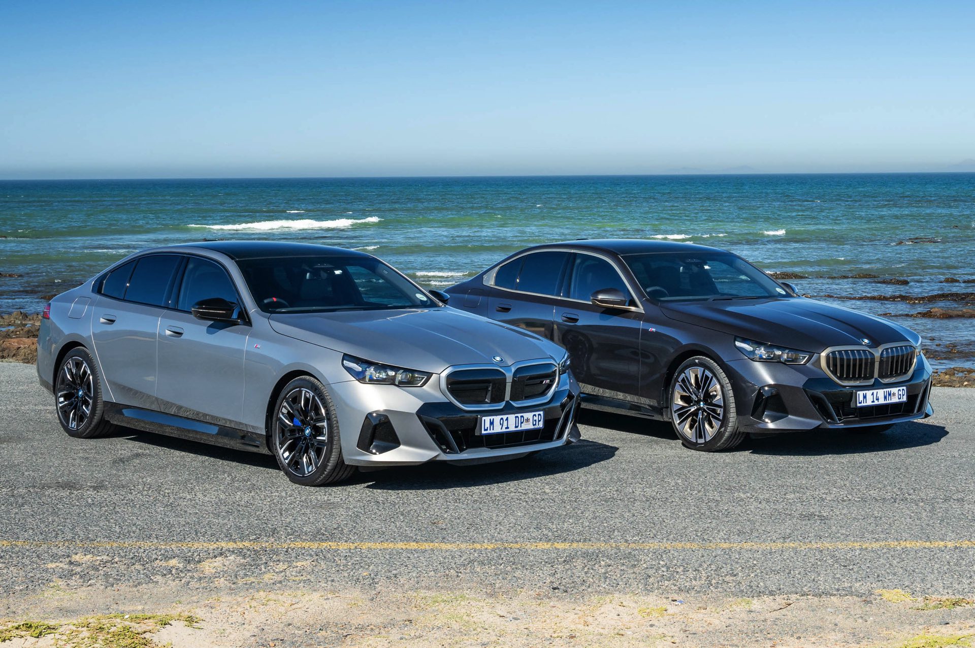 Beide Fahrzeuge tragen das M Sport-Paket beziehungsweise das im Fall des i5 M60 serienmäßige M Aerodynamik-Paket, beide sind mit der beleuchteten Iconic Glow Niere ausgerüstet und beide stehen auf 20 Zoll großen Felgen. Eine weitere Gemeinsamkeit ist der Verzicht auf das M Sport Pro-Paket und die Shadow Line mit erweiterten Umfängen, stattdessen dürfen einige Exterieur-Umfänge weiterhin silbern glänzen. Der BMW i5 M60 im helleren Oxidgrau verfügt dennoch über zahlreiche schwarze Details: Die Lufteinlässe der Frontschürze werden ebenso von großen schwarz lackierten Flächen betont wie das mächtige Diffusor-Element am Heck, dazu kommen schwarze M Außenspiegel, schwarze Seitenschweller, die Sonnenschutzverglasung und die überwiegend in Schwarz gehaltenen 20 Zoll-Aerodynamikräder 940 M Bicolor Jetblack.