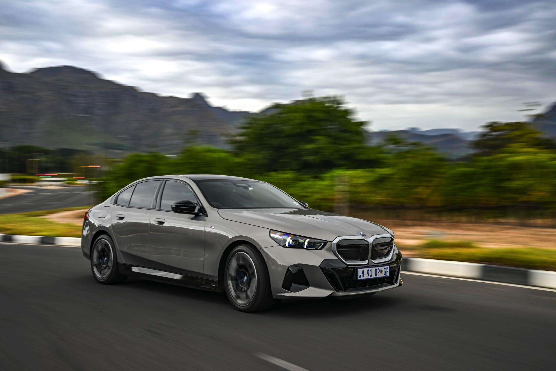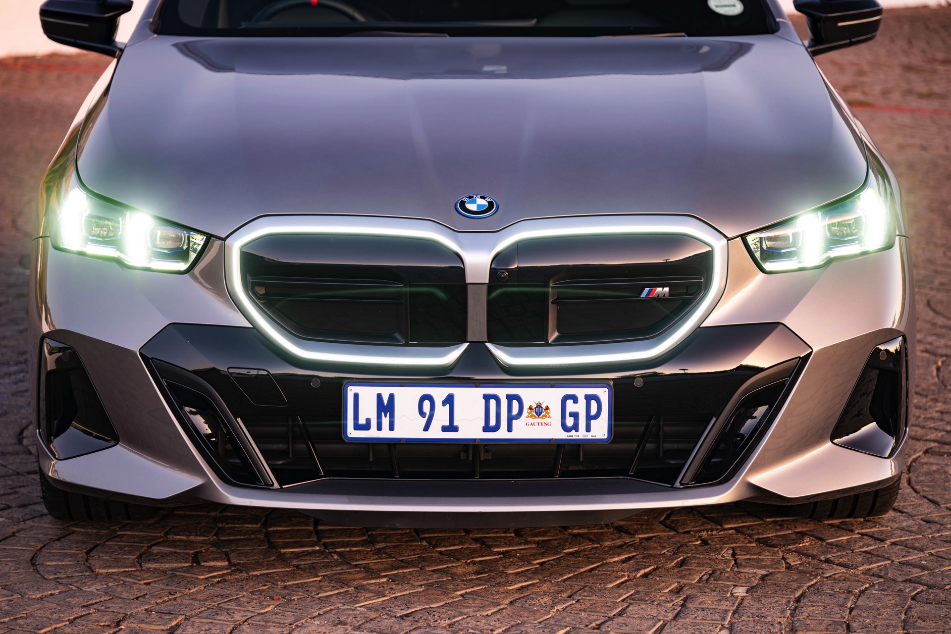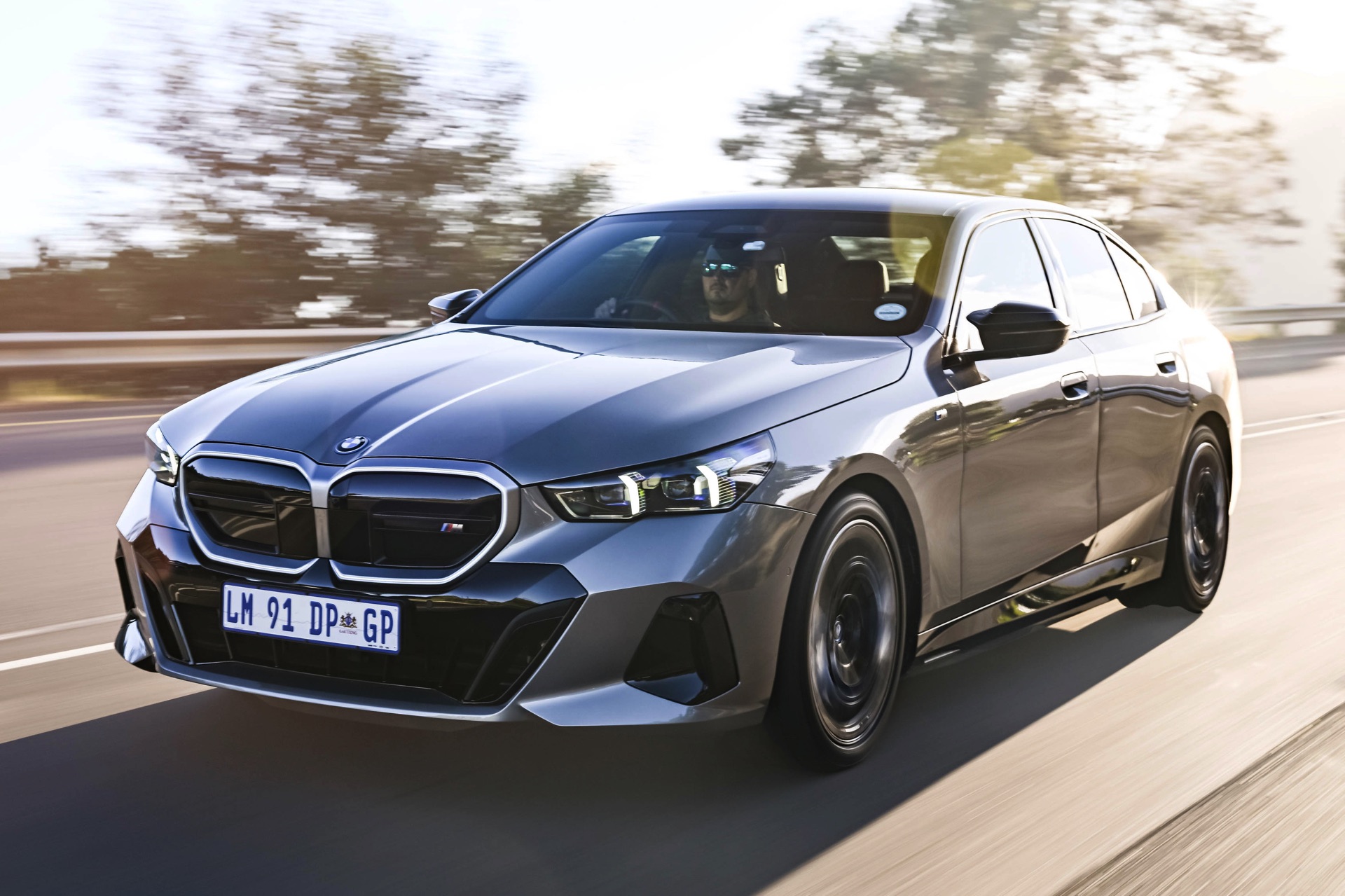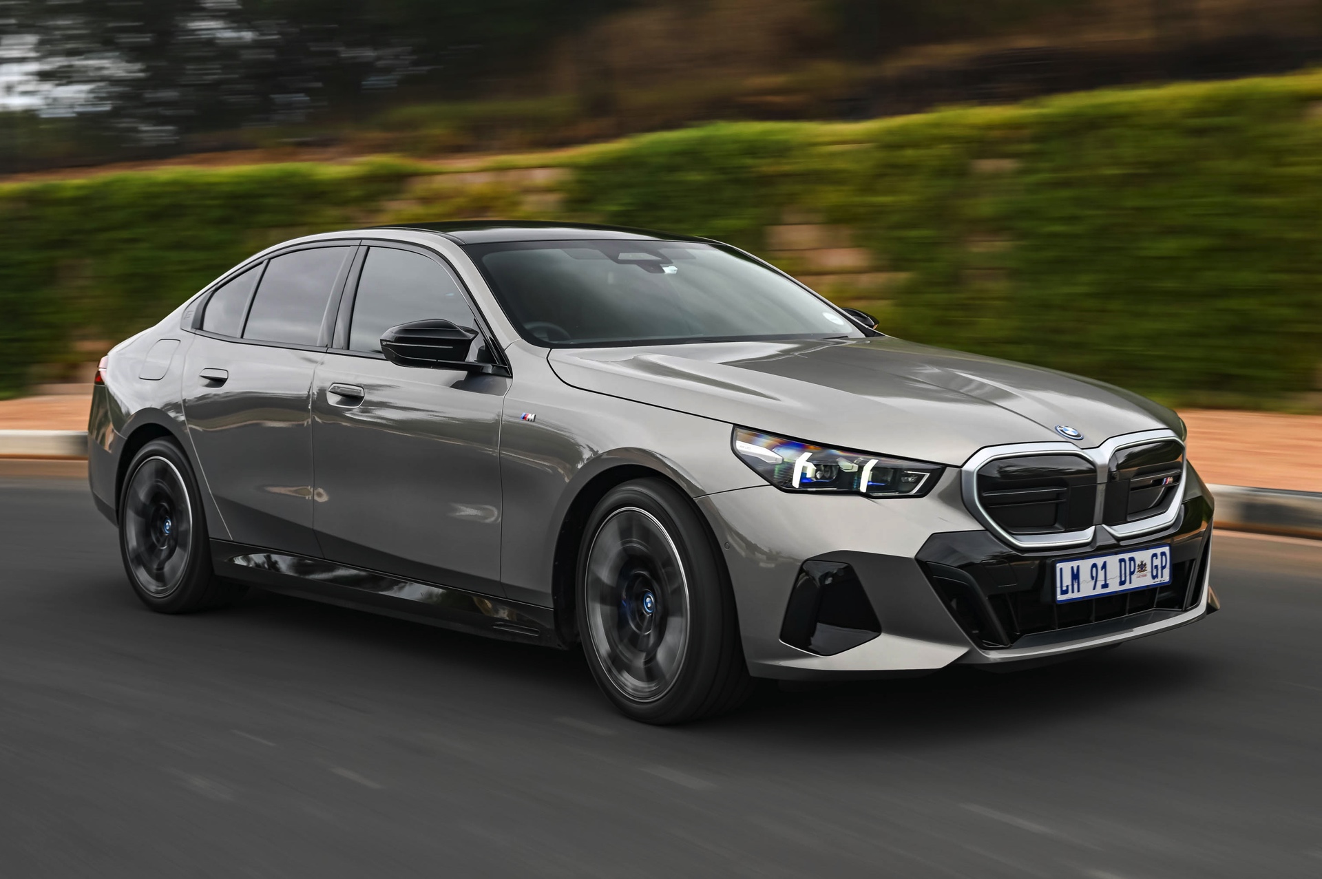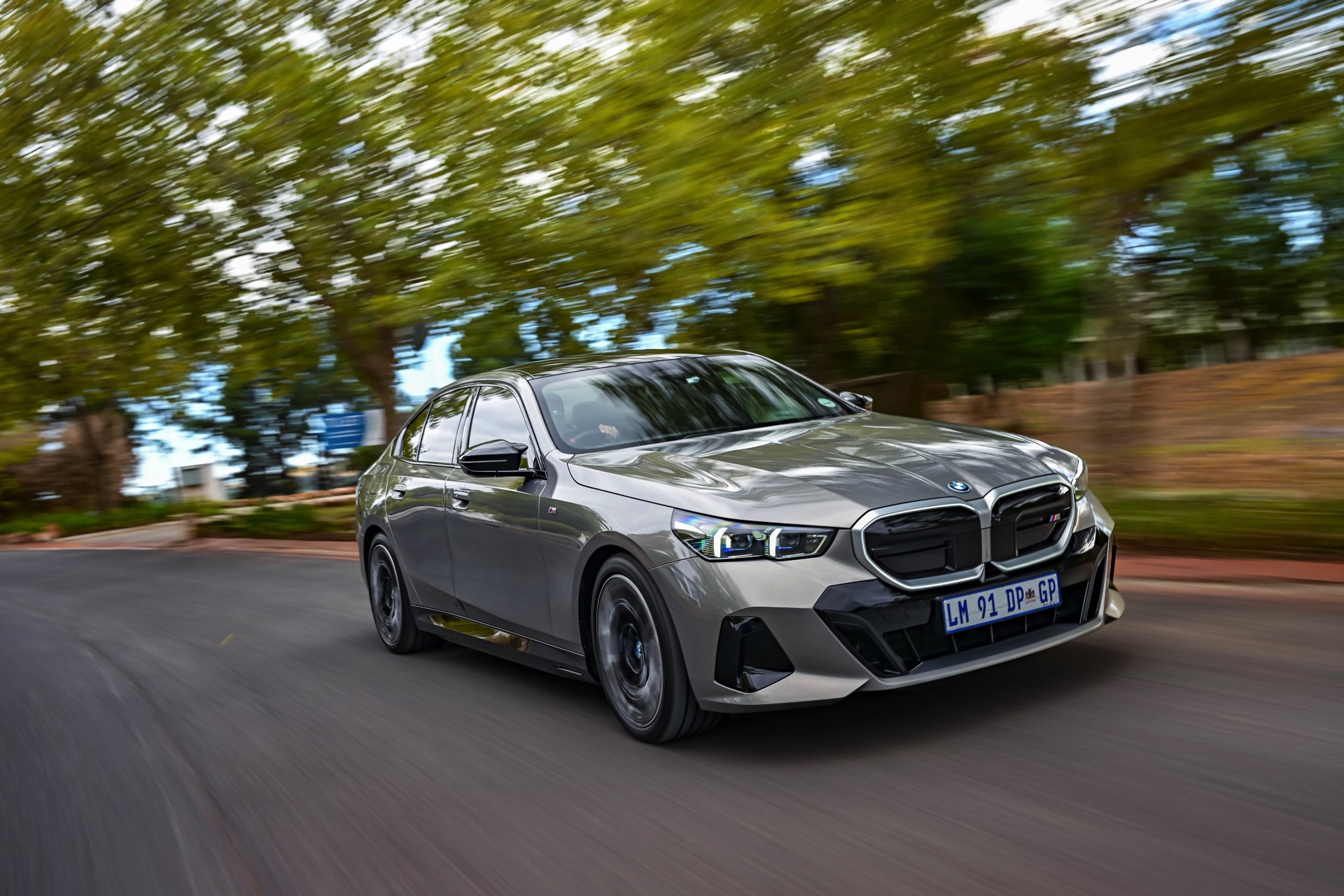 Beide Fahrzeuge tragen das M Sport-Paket beziehungsweise das im Fall des i5 M60 serienmäßige M Aerodynamik-Paket, beide sind mit der beleuchteten Iconic Glow Niere ausgerüstet und beide stehen auf 20 Zoll großen Felgen. Eine weitere Gemeinsamkeit ist der Verzicht auf das M Sport Pro-Paket und die Shadow Line mit erweiterten Umfängen, stattdessen dürfen einige Exterieur-Umfänge weiterhin silbern glänzen. Der BMW i5 M60 im helleren Oxidgrau verfügt dennoch über zahlreiche schwarze Details: Die Lufteinlässe der Frontschürze werden ebenso von großen schwarz lackierten Flächen betont wie das mächtige Diffusor-Element am Heck, dazu kommen schwarze M Außenspiegel, schwarze Seitenschweller, die Sonnenschutzverglasung und die überwiegend in Schwarz gehaltenen 20 Zoll-Aerodynamikräder 940 M Bicolor Jetblack.